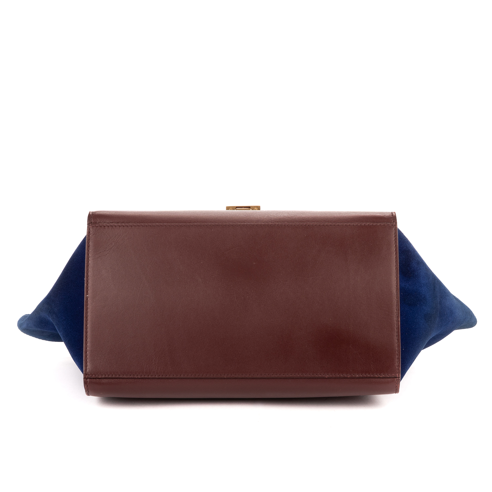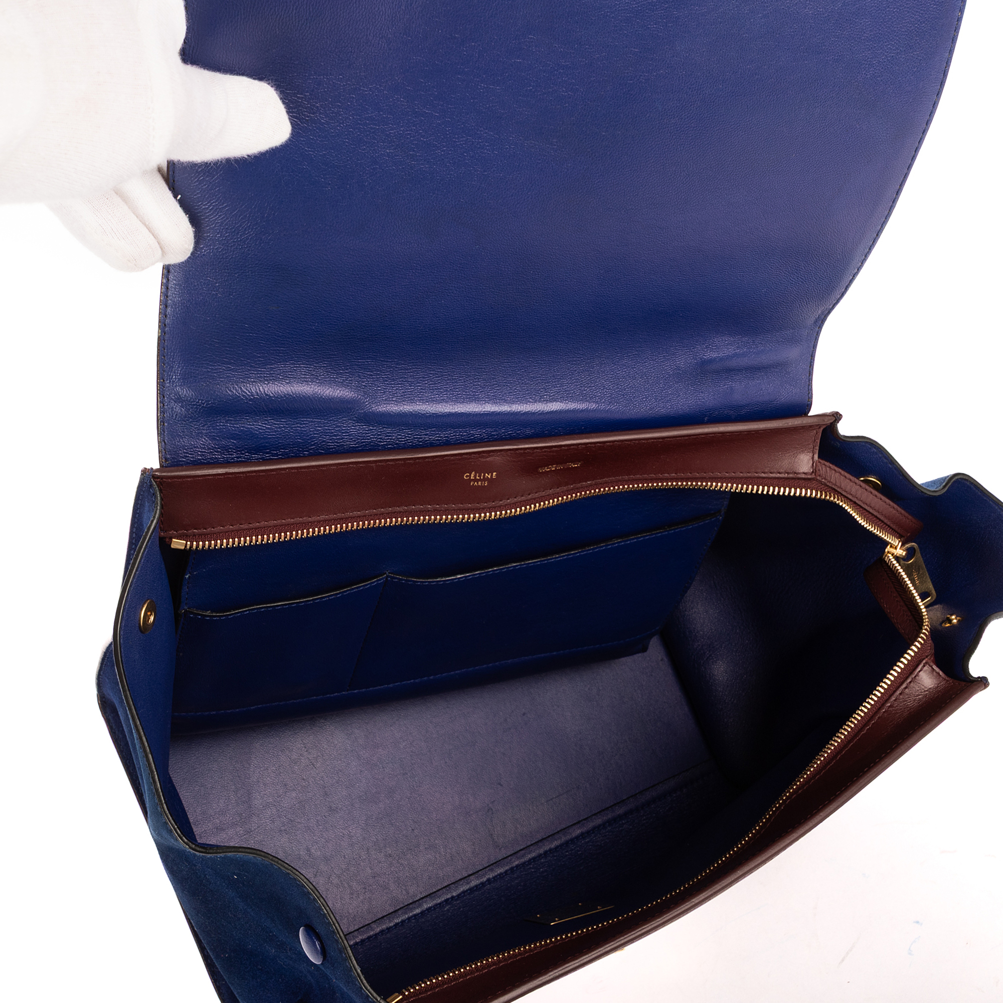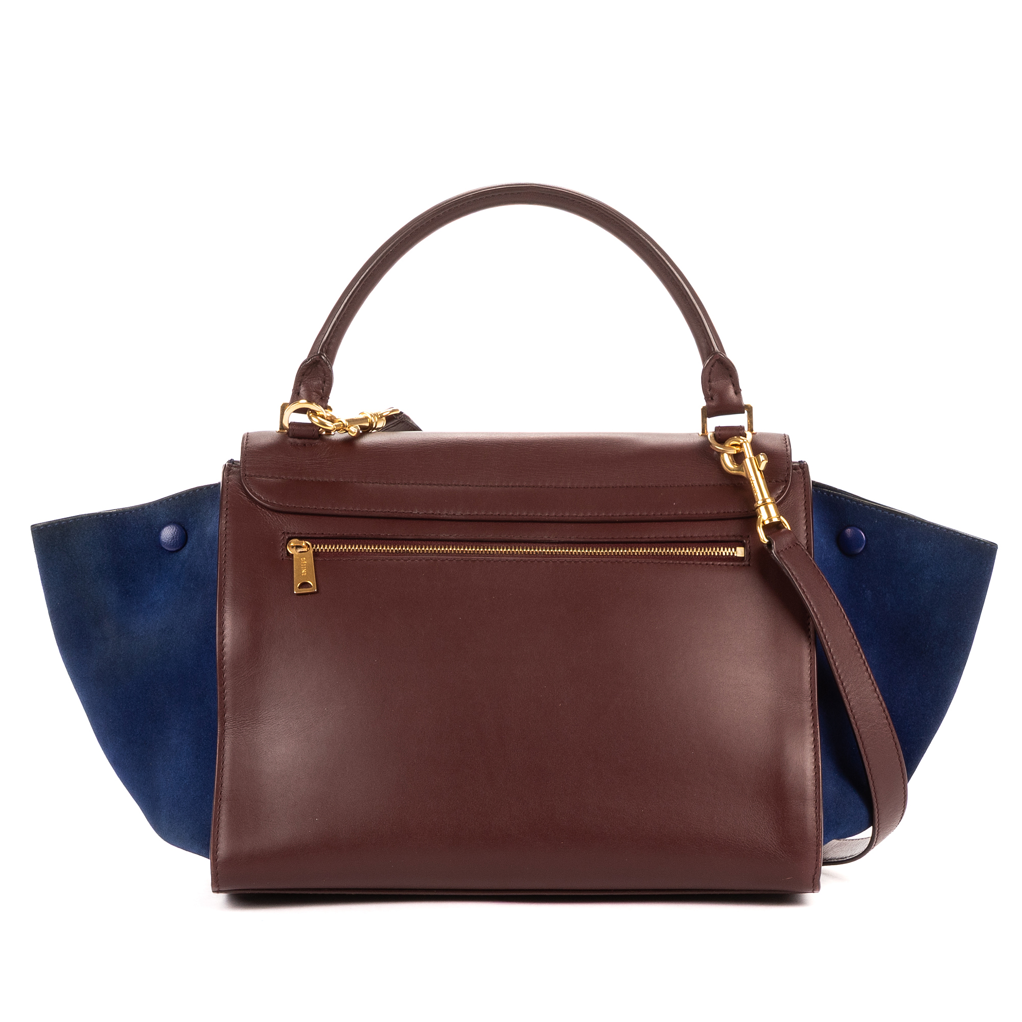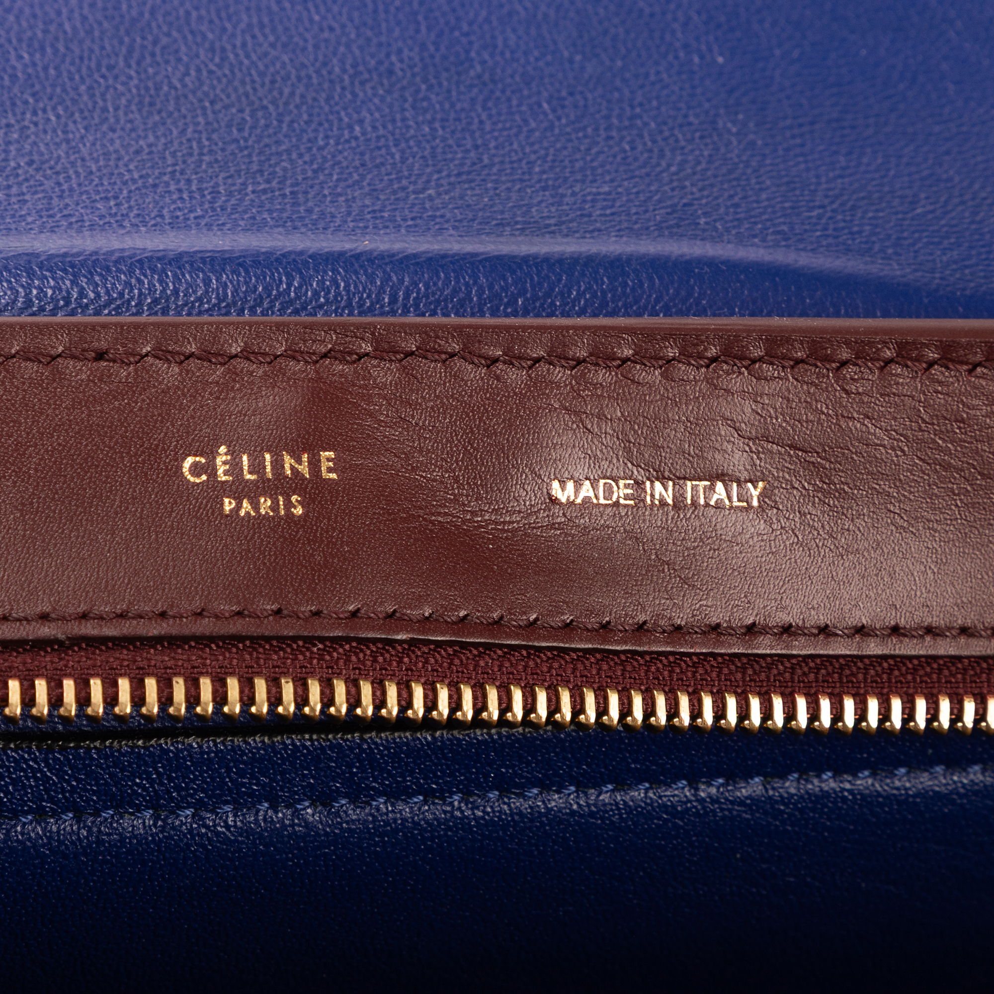 Celine Shoulder Bag Medium Bicolor Trapeze in Burgundy/Royal Blue Calfskin Leather and Gold hardware. The product is in Very Good Condition (AB).