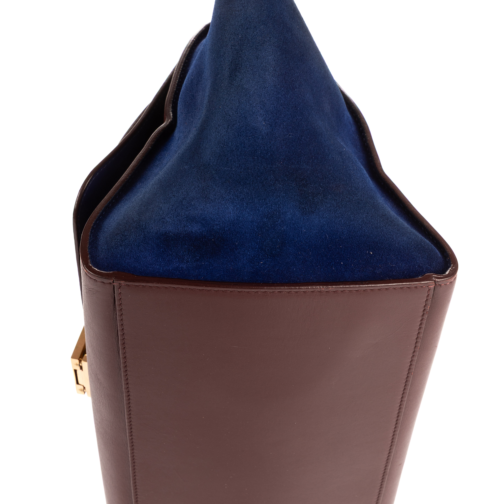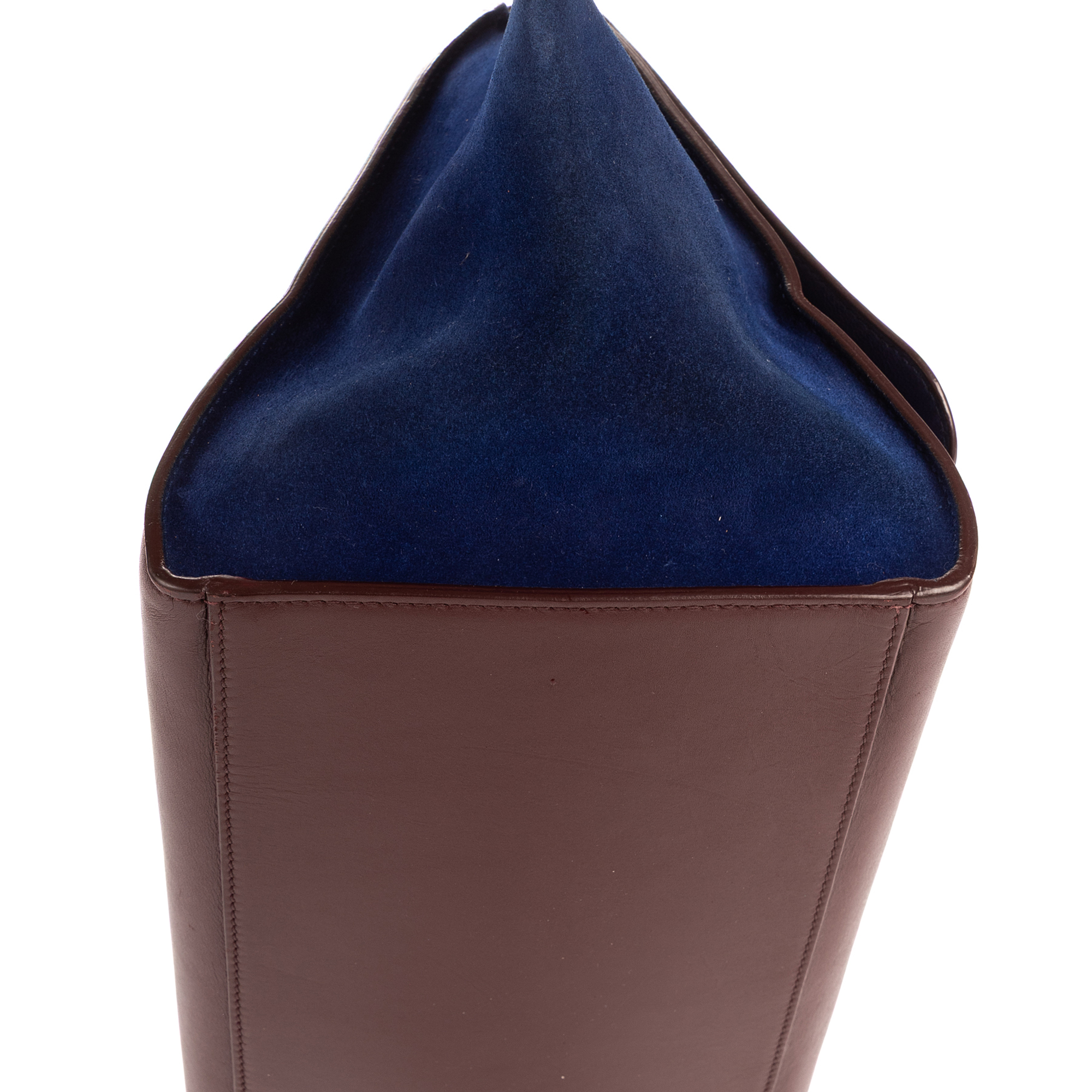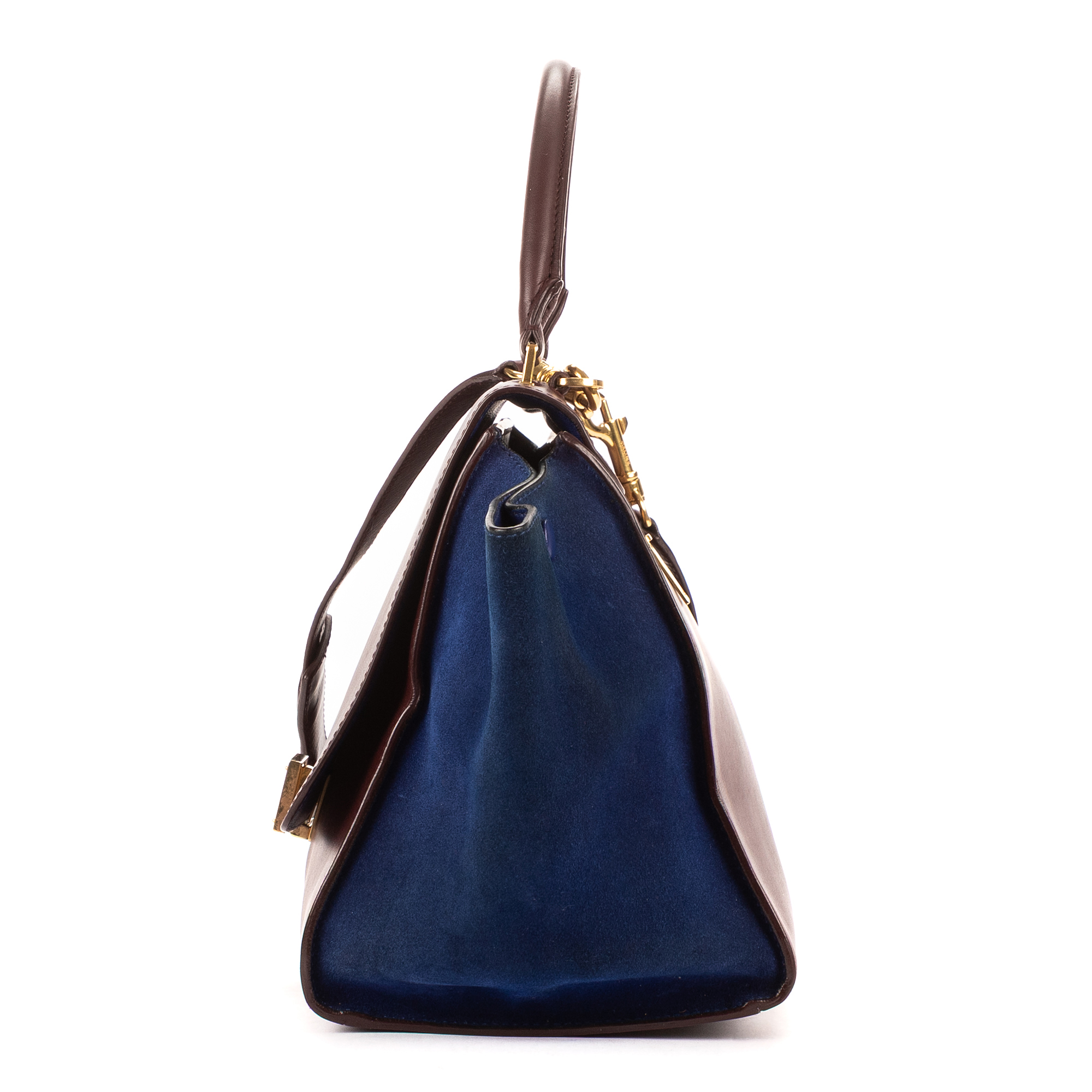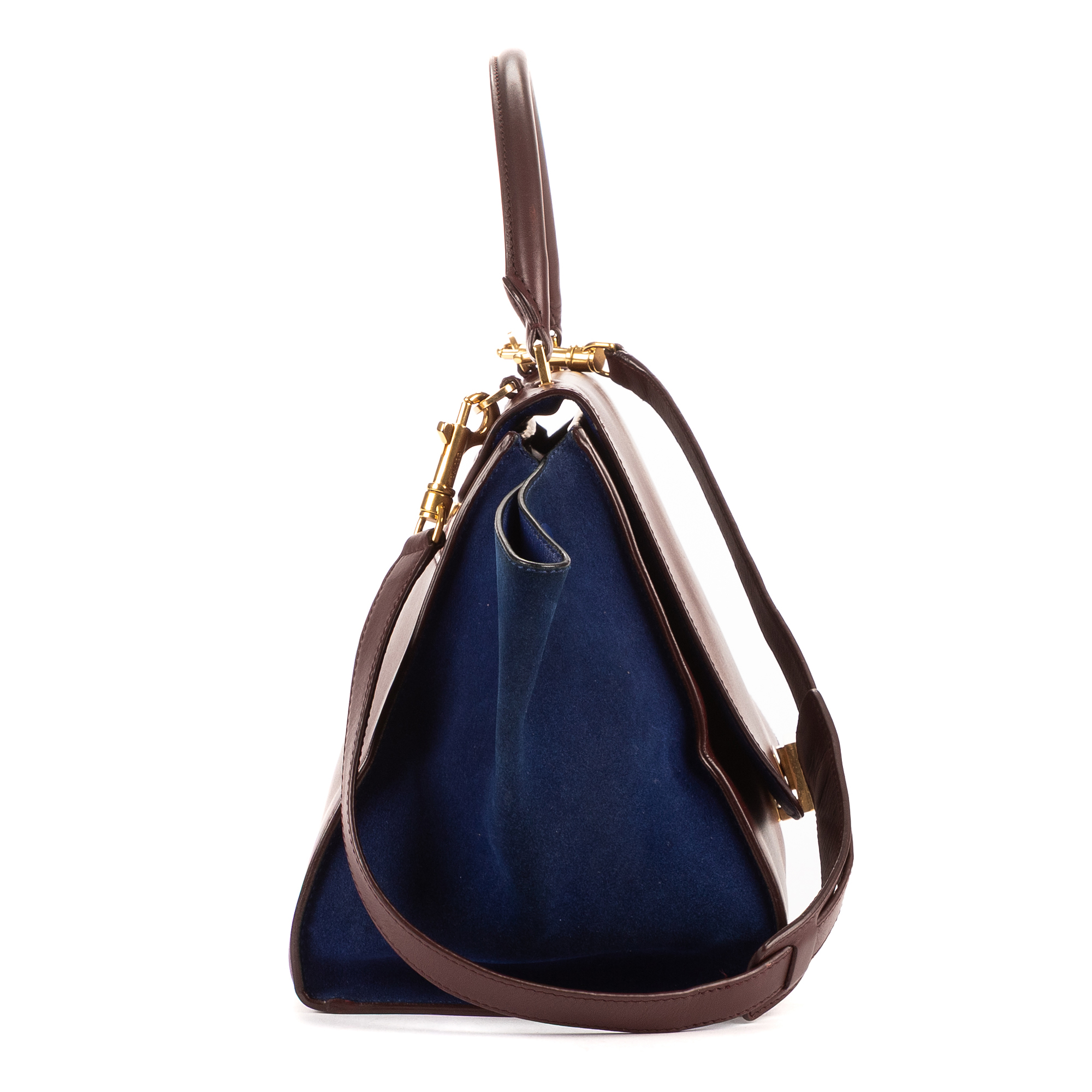 Celine Shoulder Bag Medium Bicolor Trapeze in Burgundy/Royal Blue Calfskin Leather and Gold hardware. The product is in Very Good Condition (AB).