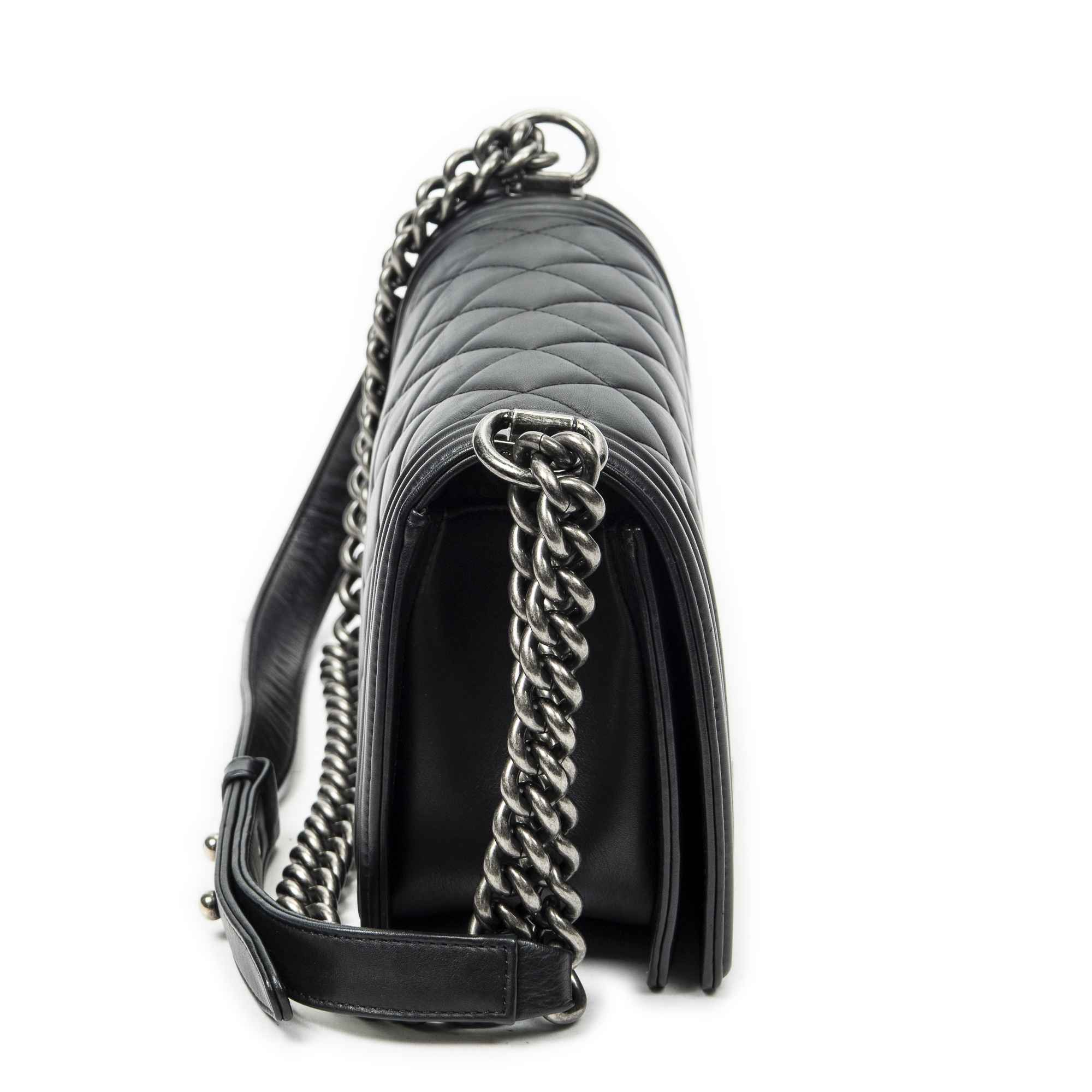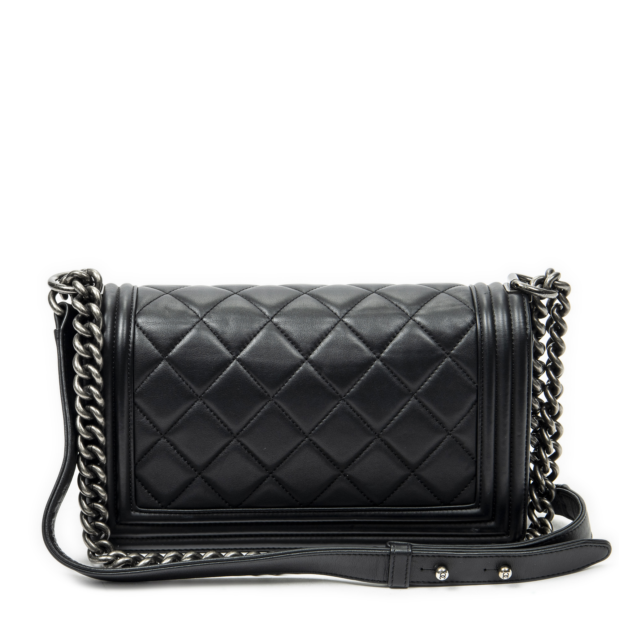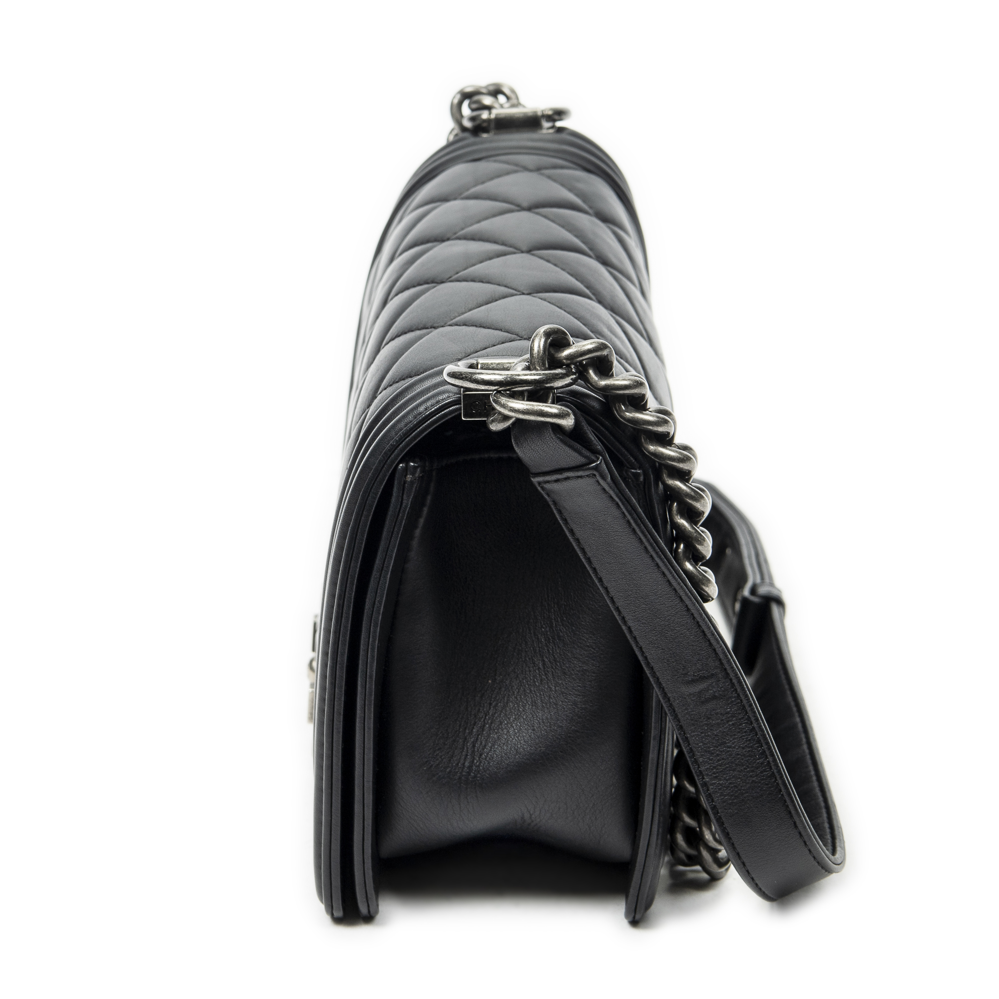 Chanel Shoulder Bag Medium Boy in Black Quilted Lambskin Leather and Silver hardware. The product is in Excellent Condition (A).