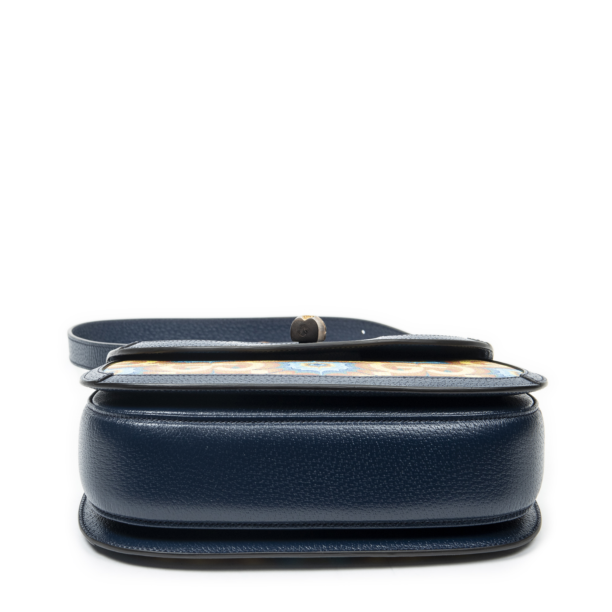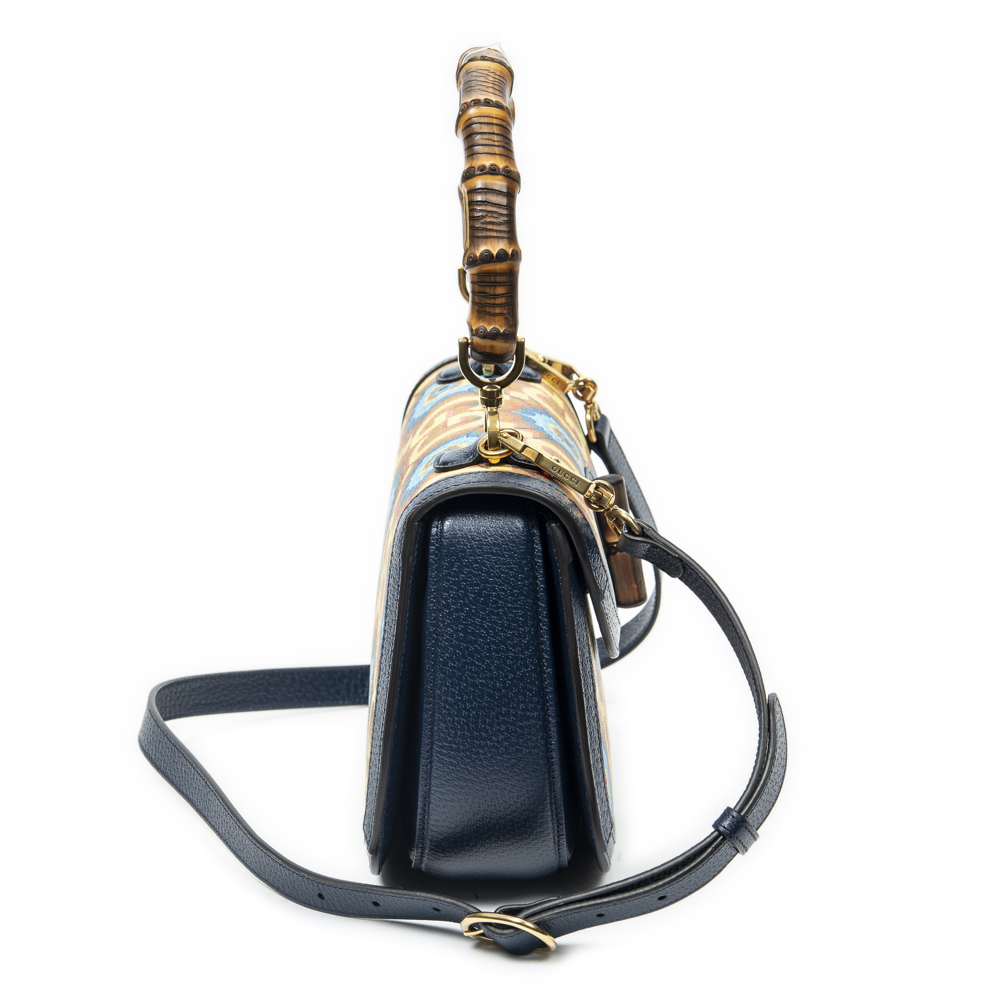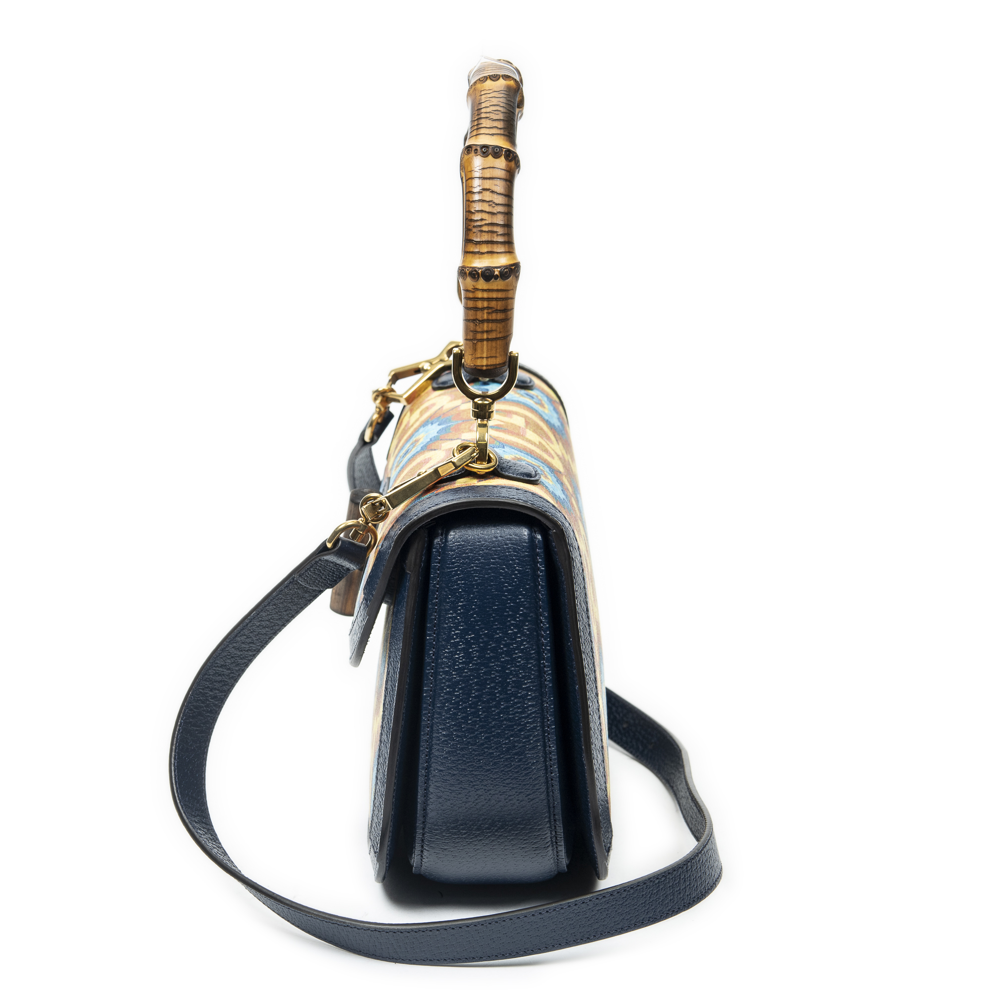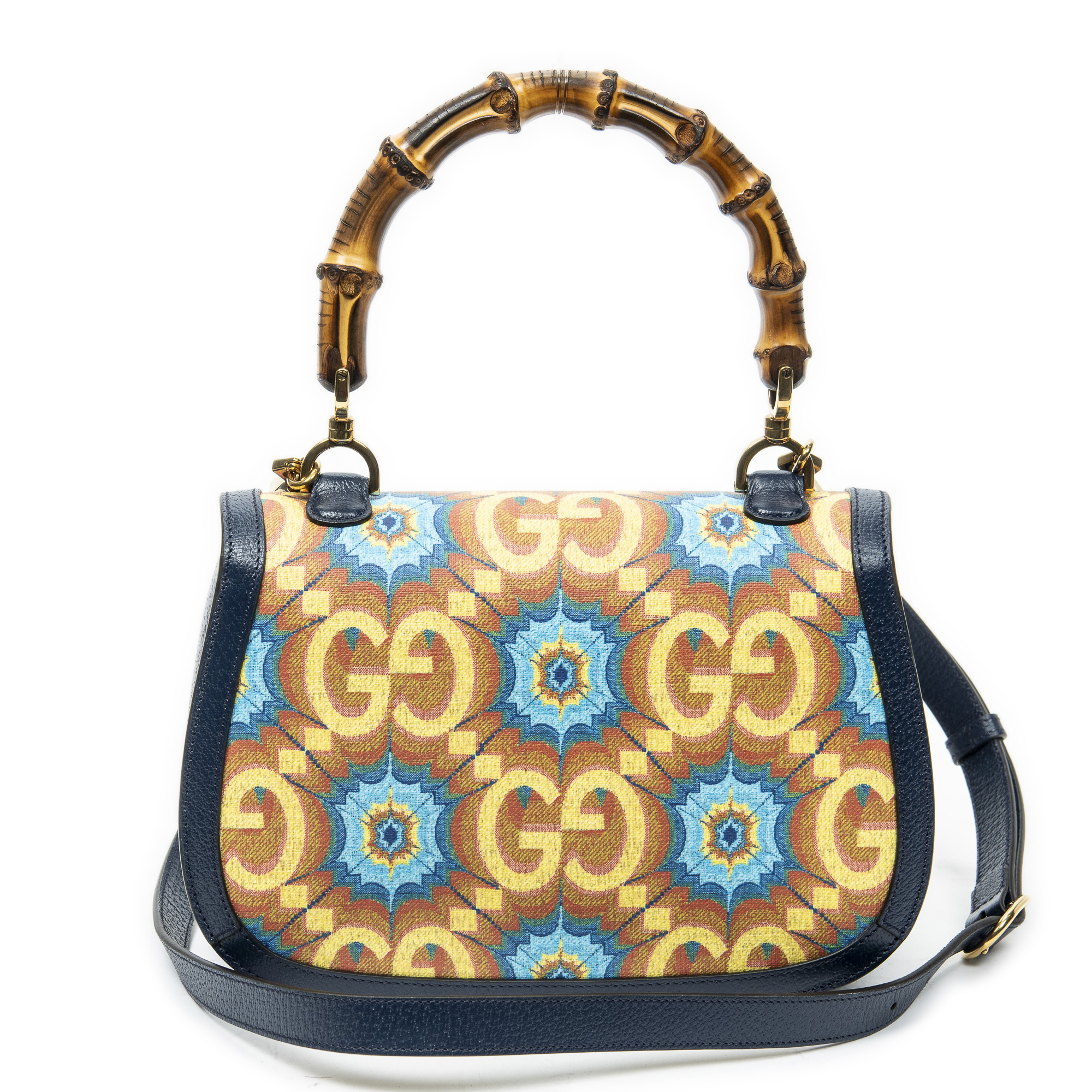 Gucci Shoulder Bag Medium Centennial Bamboo Top Handle in Navy/Yellow Kaleidoscope Print Coated Canvas and Gold hardware. The product is in Perfect Condition (AA).