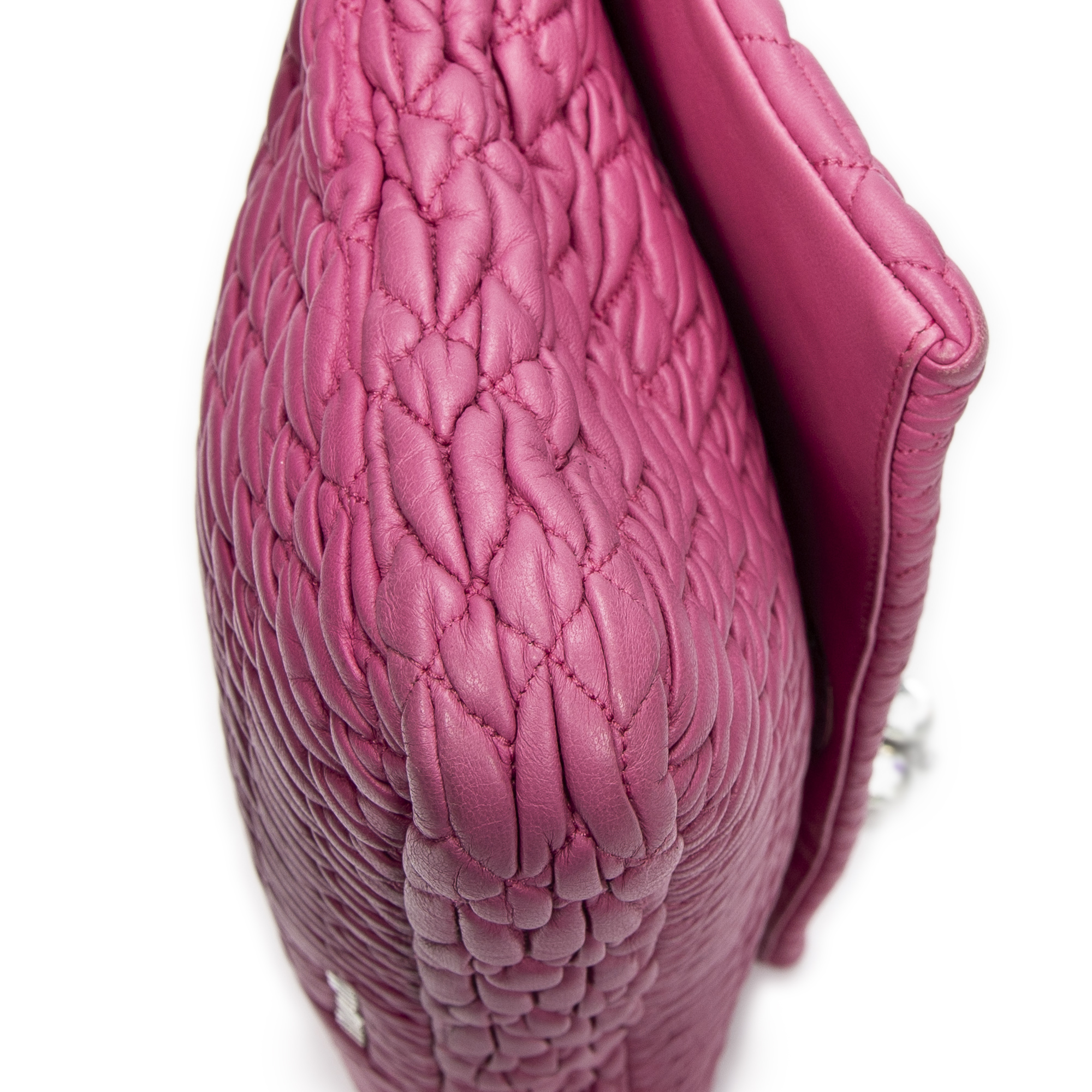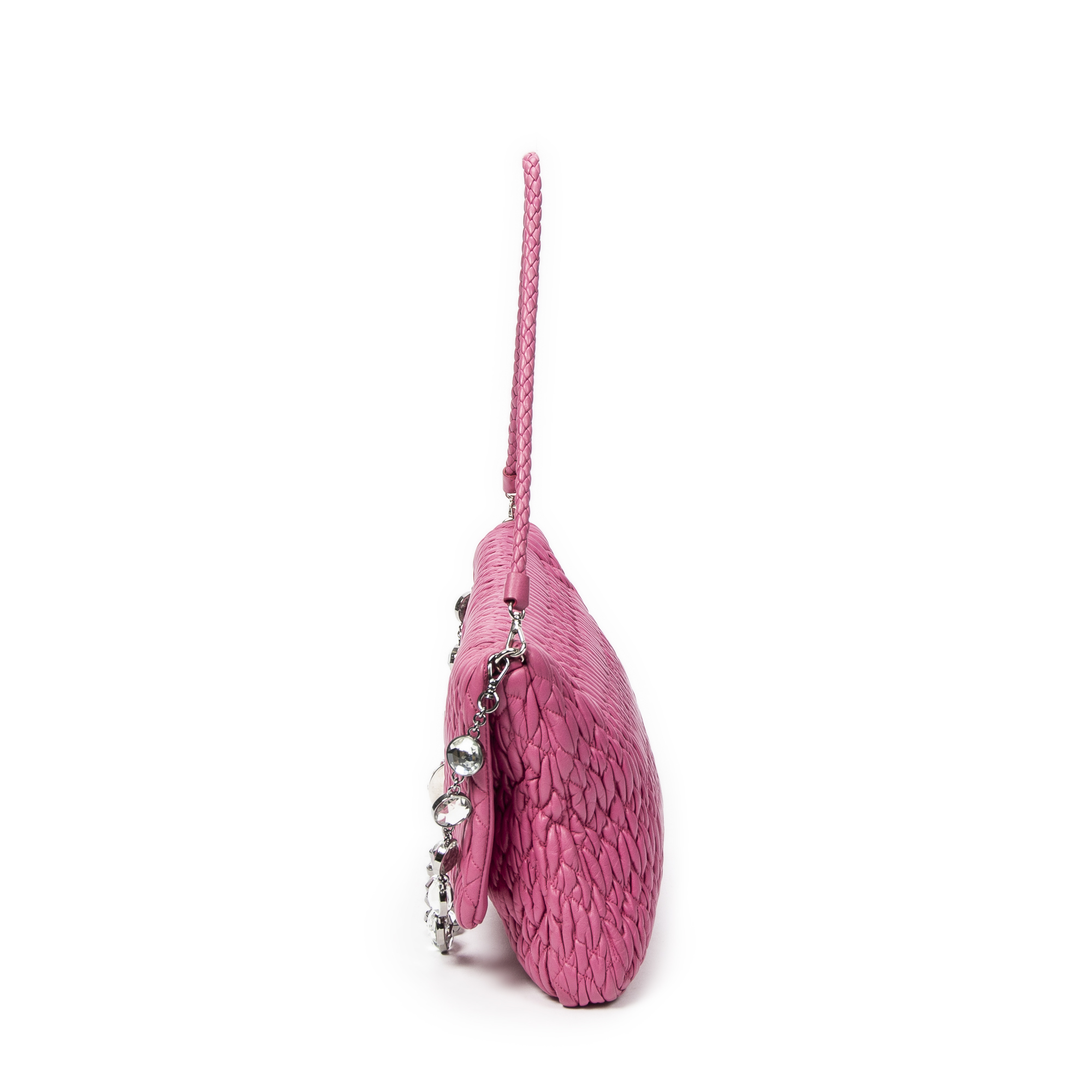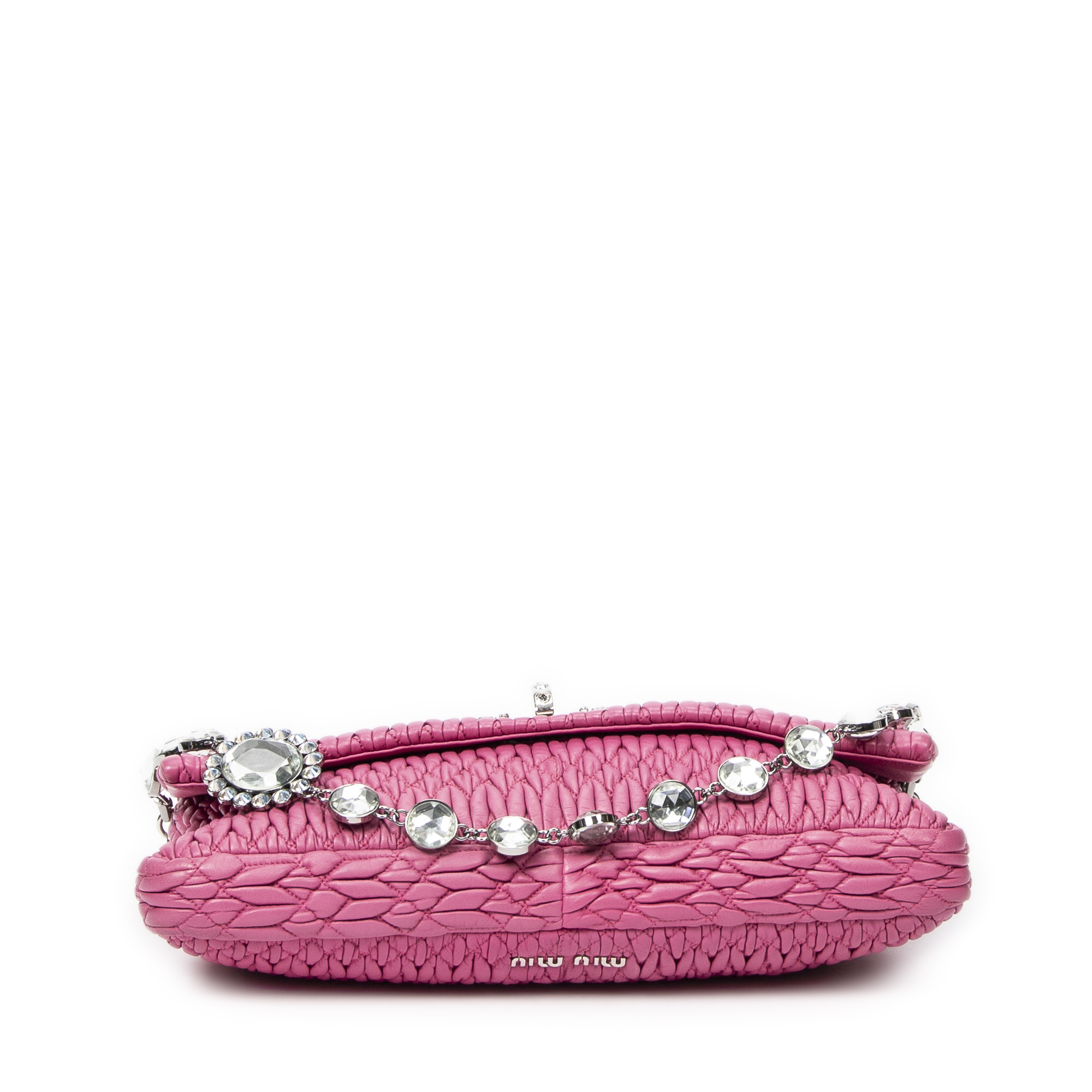 Miu Miu Shoulder Bag Medium Crystal Flap Clutch in Pink Nappa Matelasse Leather and Silver hardware. The product is in Excellent Condition (A).