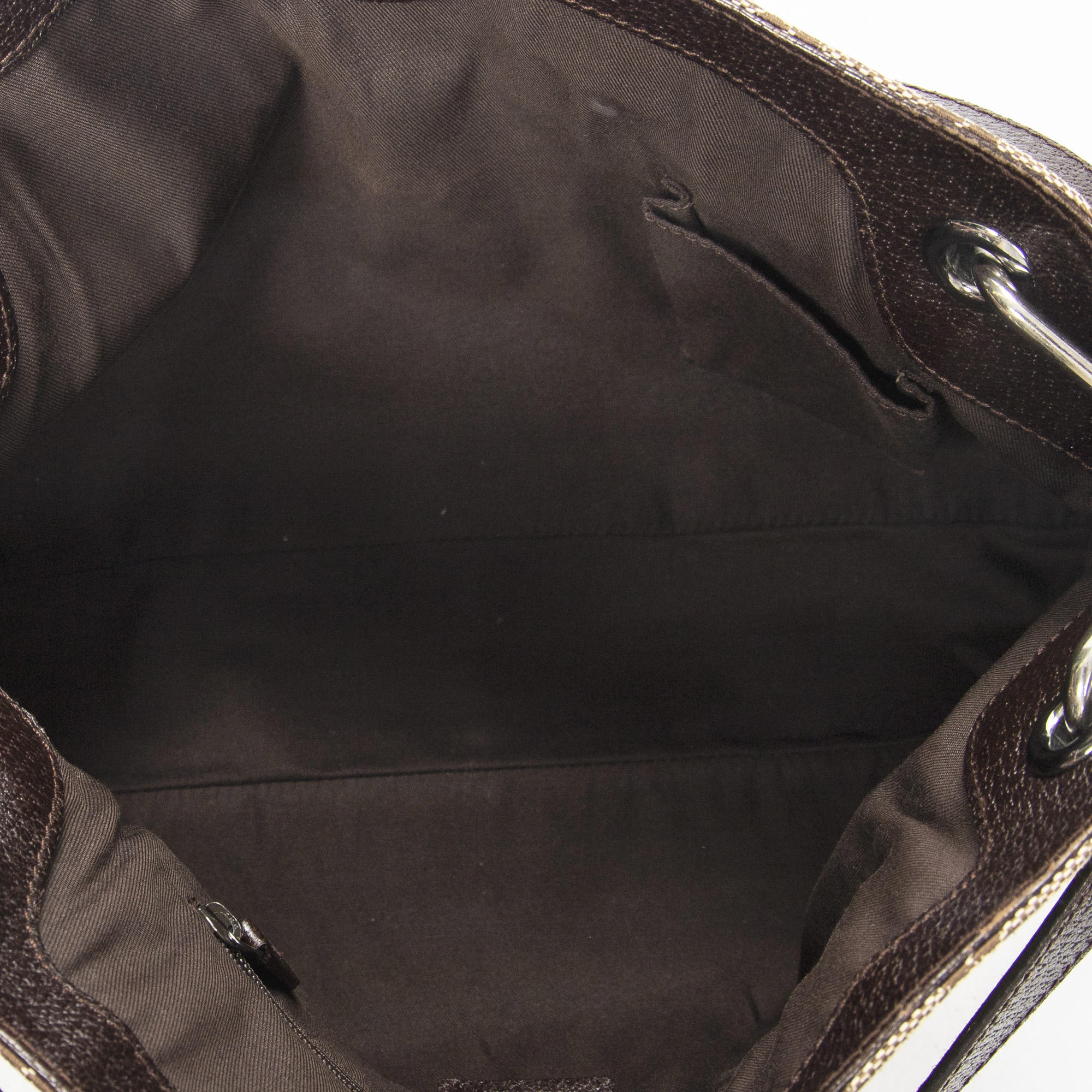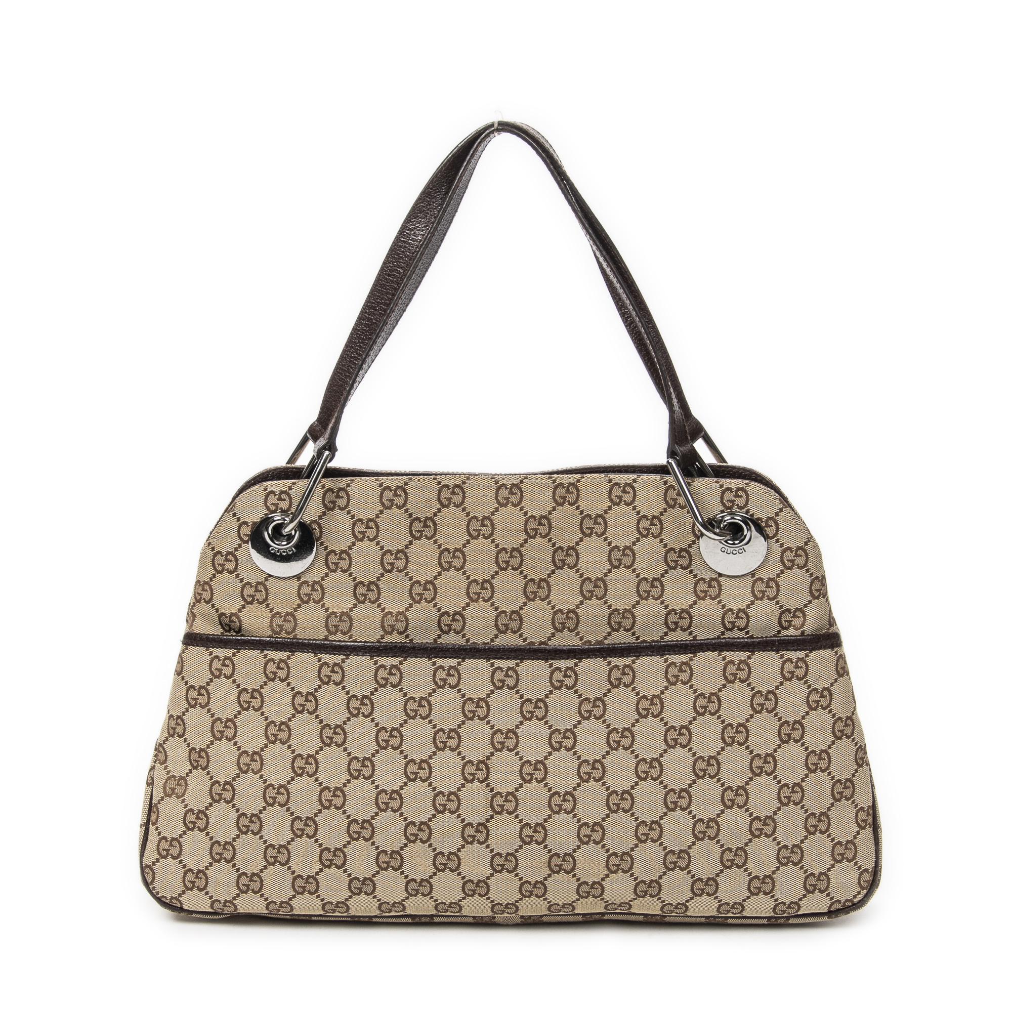Gucci Shoulder Bag Medium Eclipse Tote in Beige/Dark Brown Monogrammed Canvas and Silver hardware. The product is in Excellent Condition (A).
