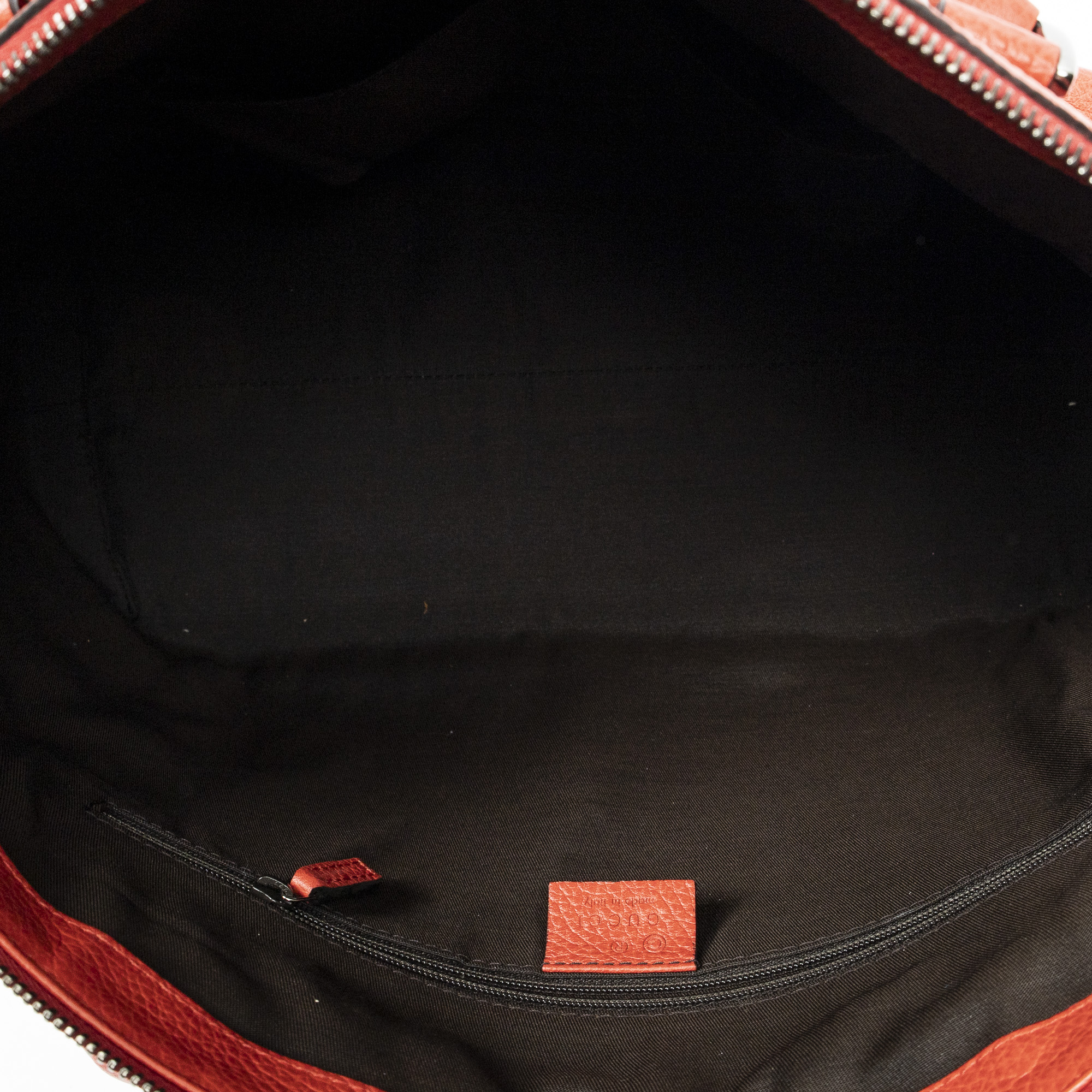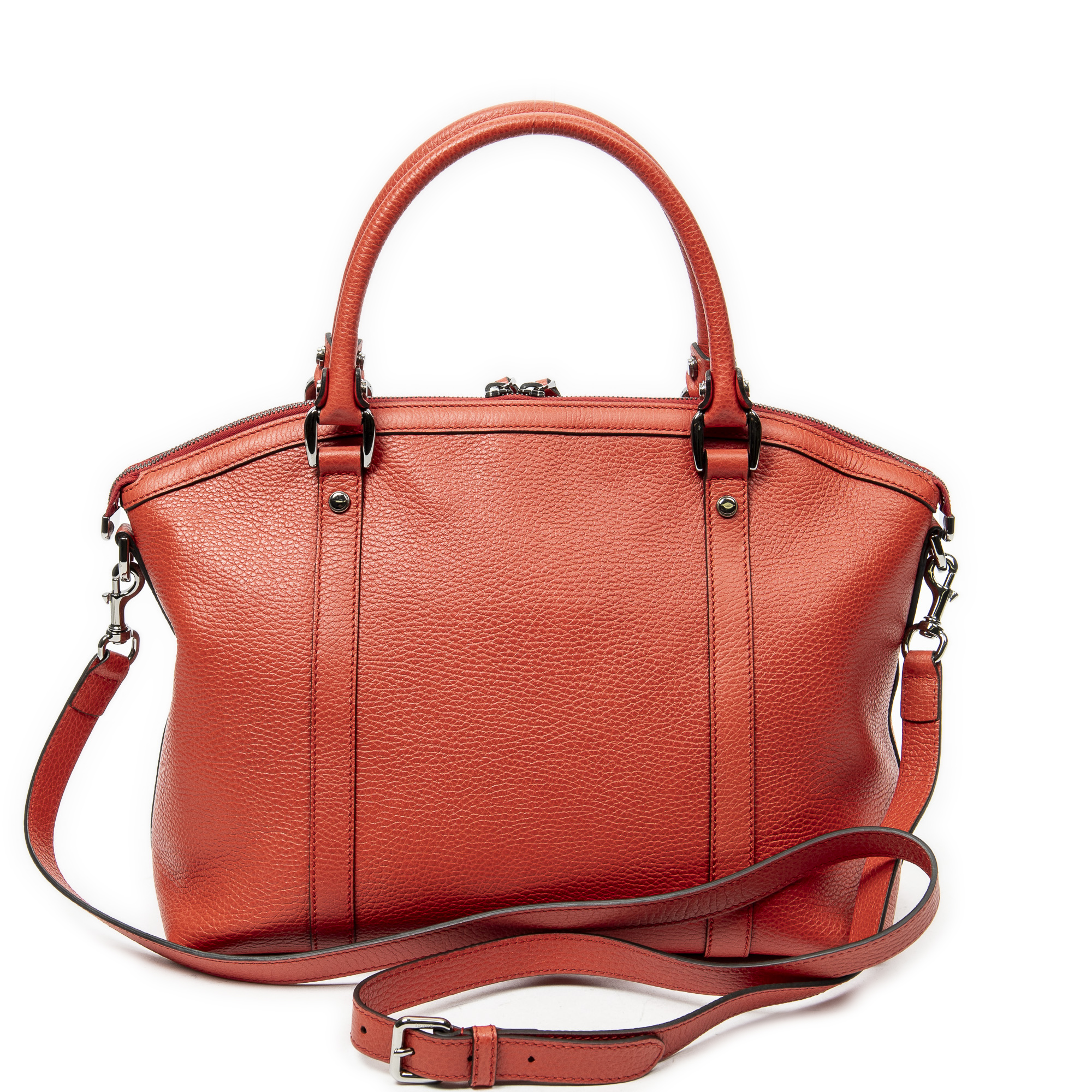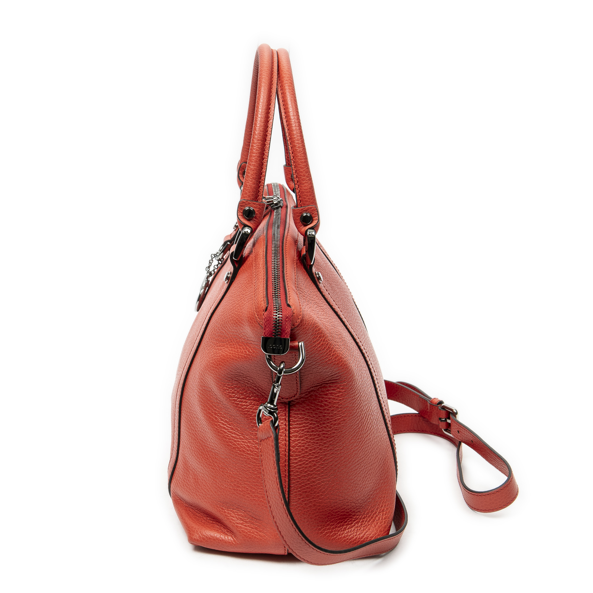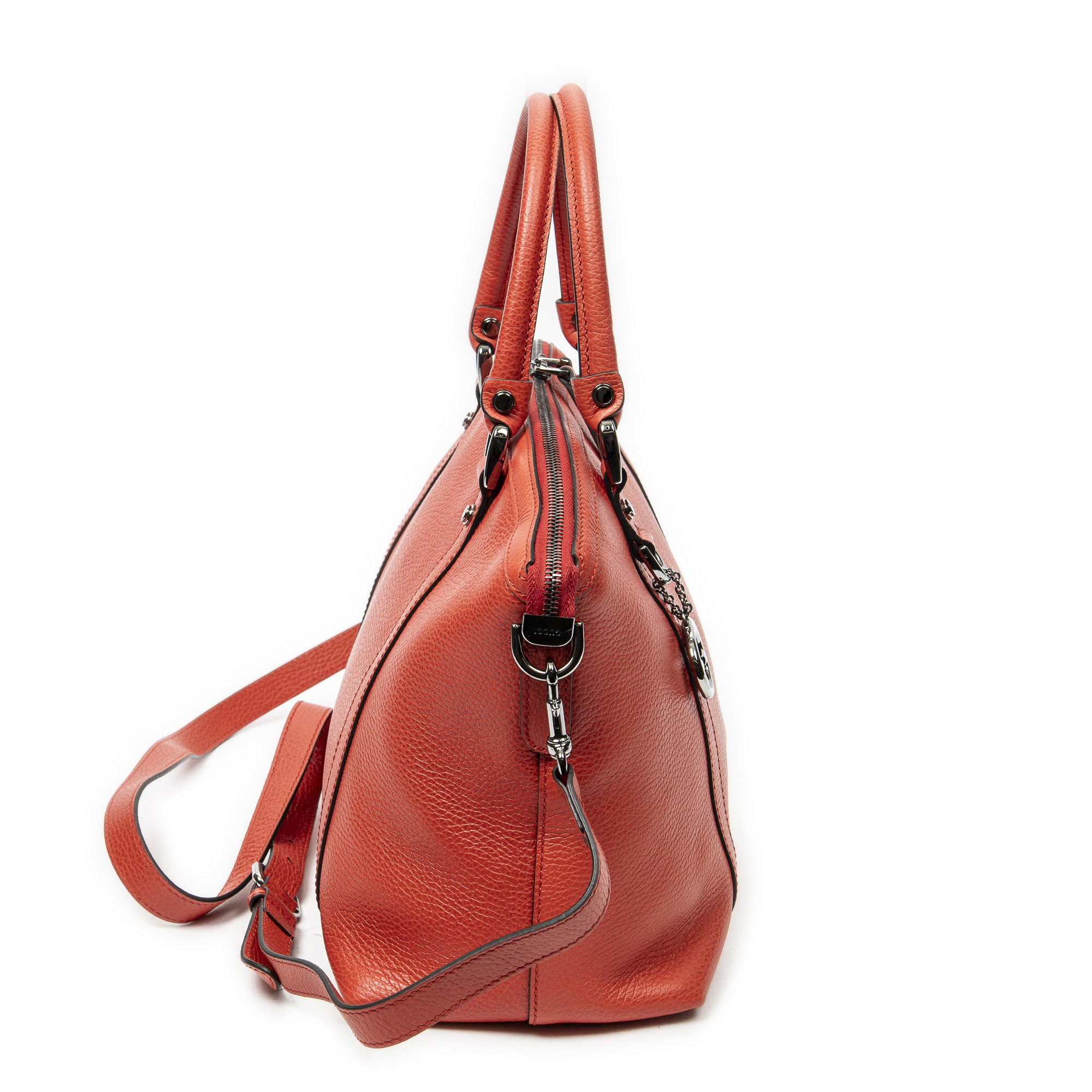 Gucci Shoulder Bag Medium GG Charm Top Handle in Red Grained Calfskin Leather and Ruthenium hardware. The product is in Perfect Condition (AA).