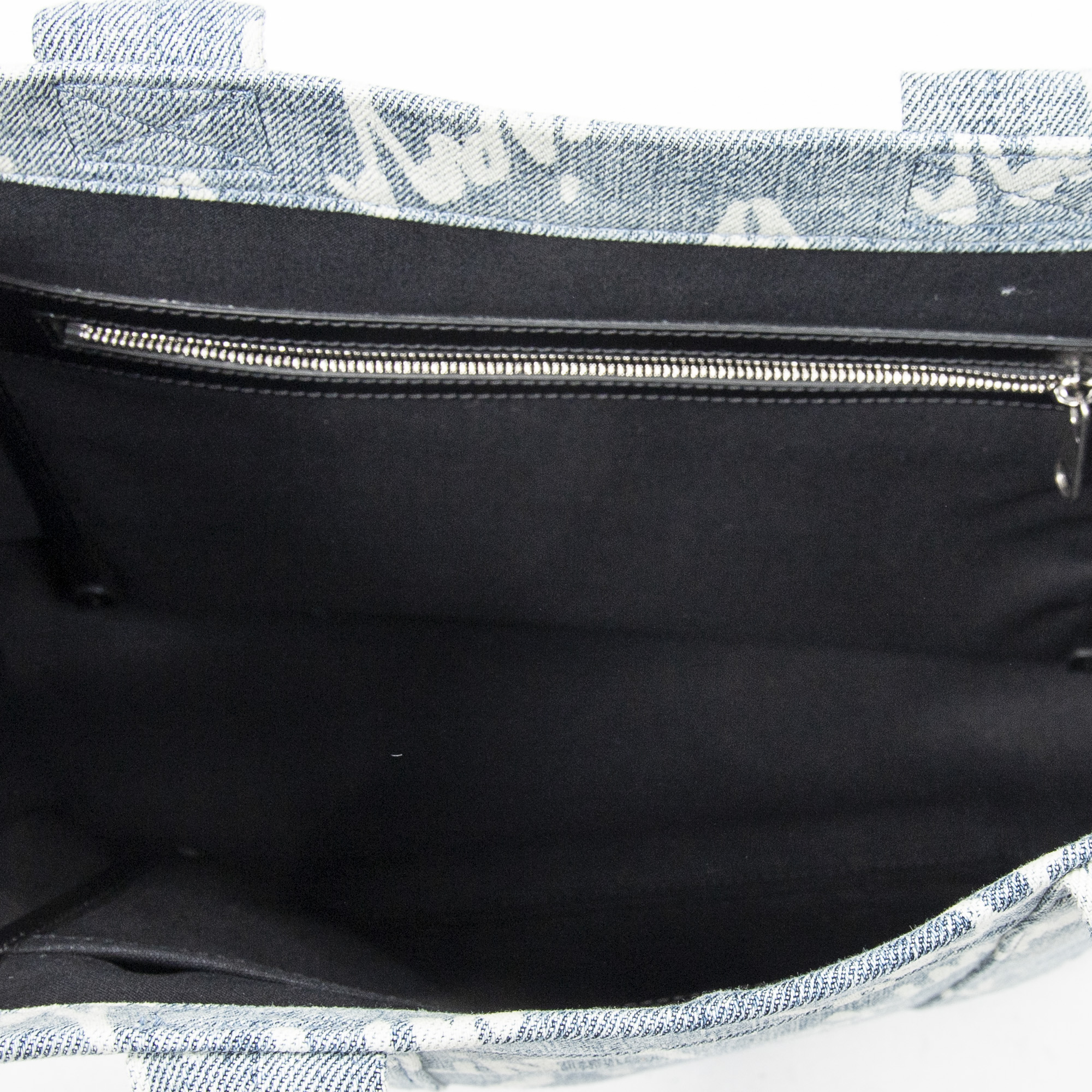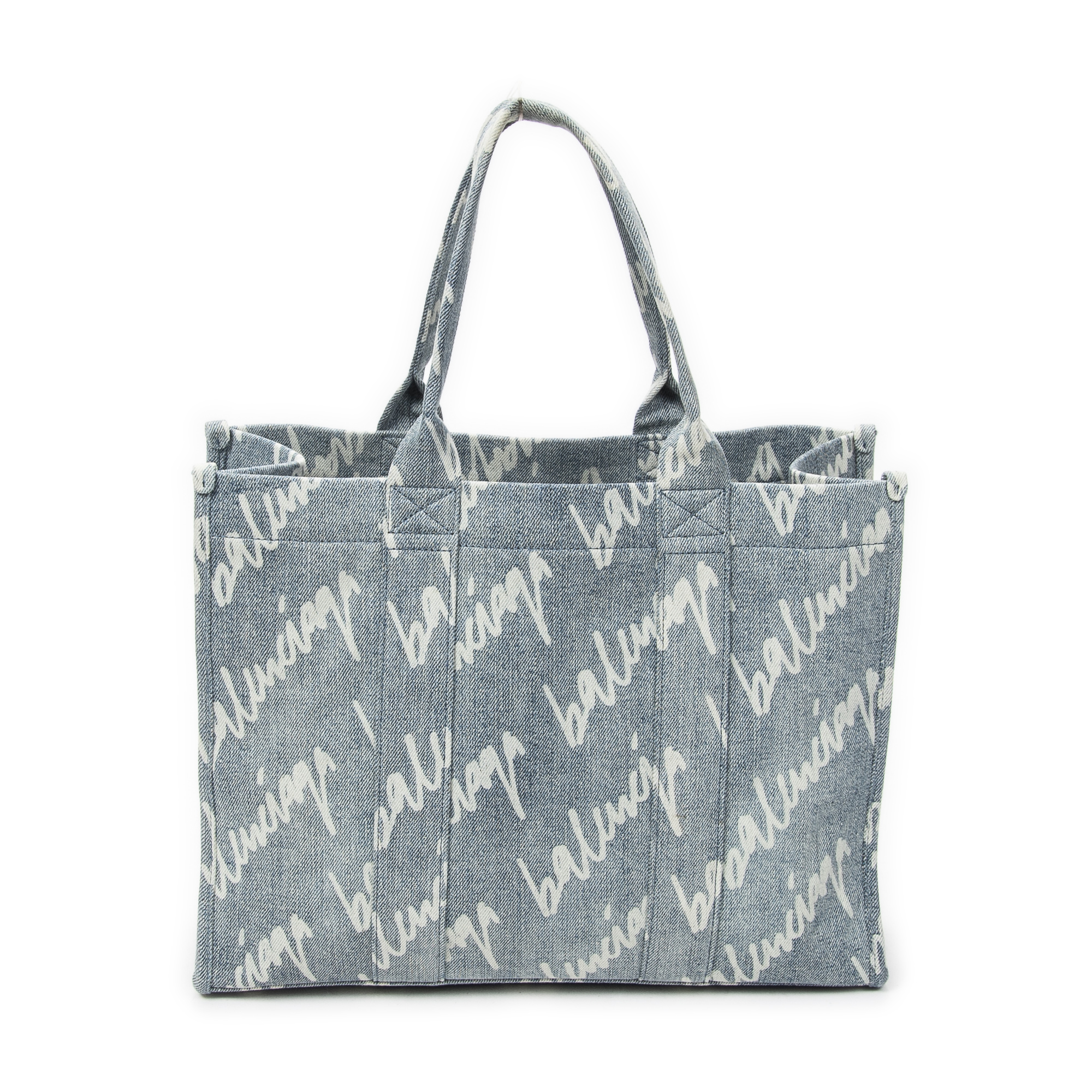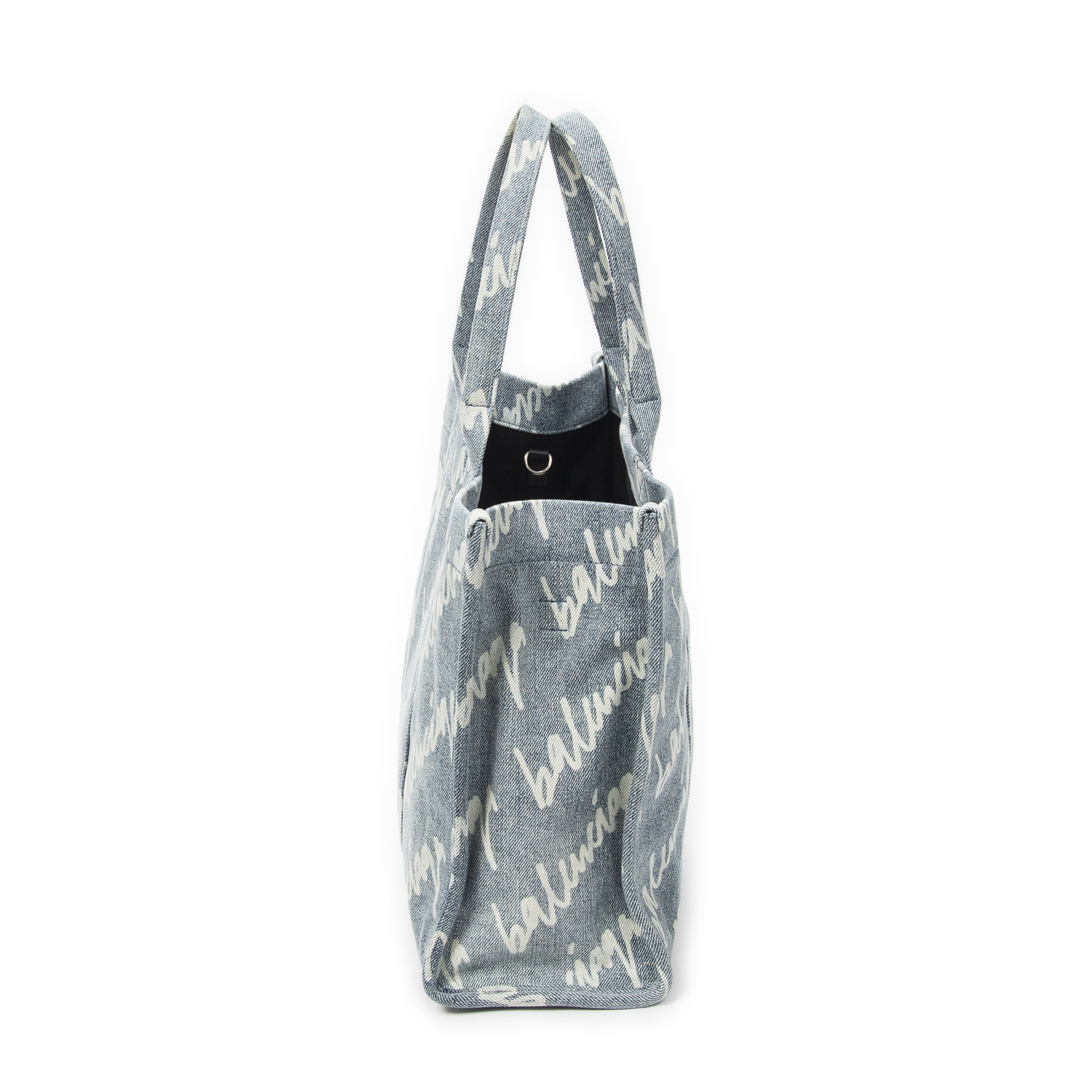 Balenciaga Shoulder Bag Medium Hardware Tote in Light Blue Scribble Print Denim Canvas and Silver hardware. The product is in Excellent Condition (A).