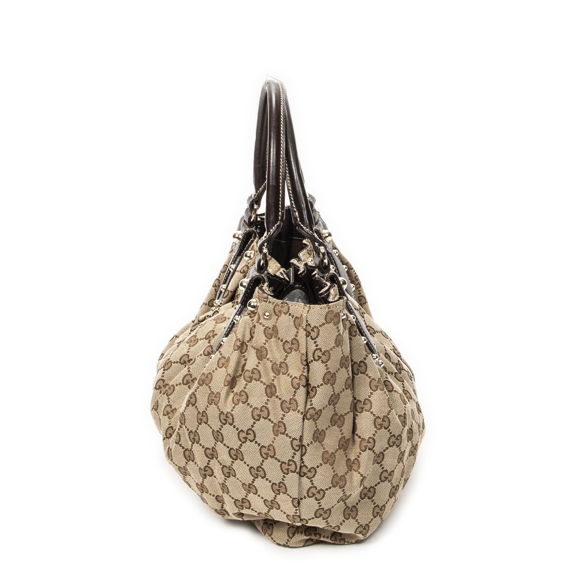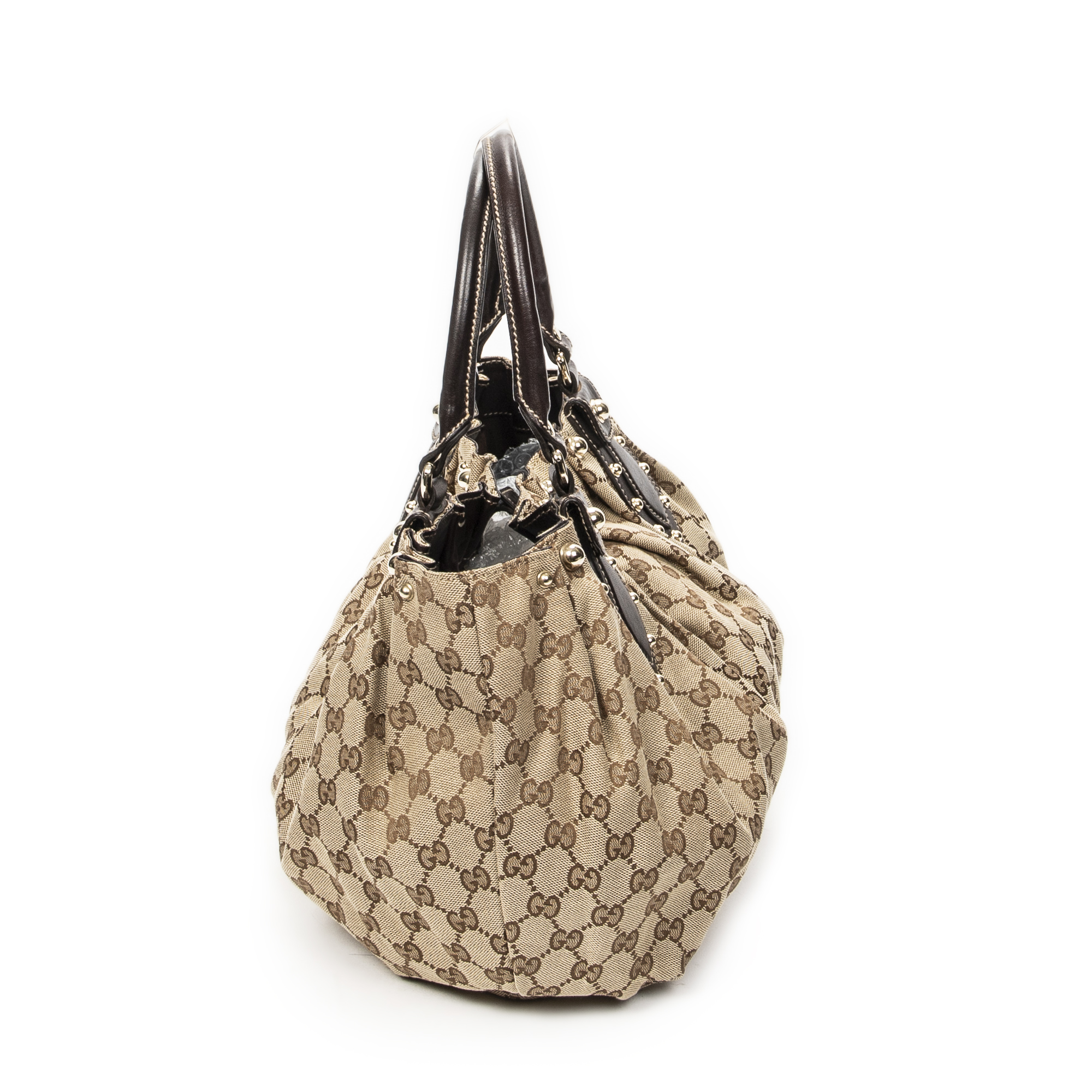 Gucci Shoulder Bag Medium Studded Pelham Tote in Beige/Dark Brown Monogrammed Canvas and Gold hardware. The product is in Excellent Condition (A).