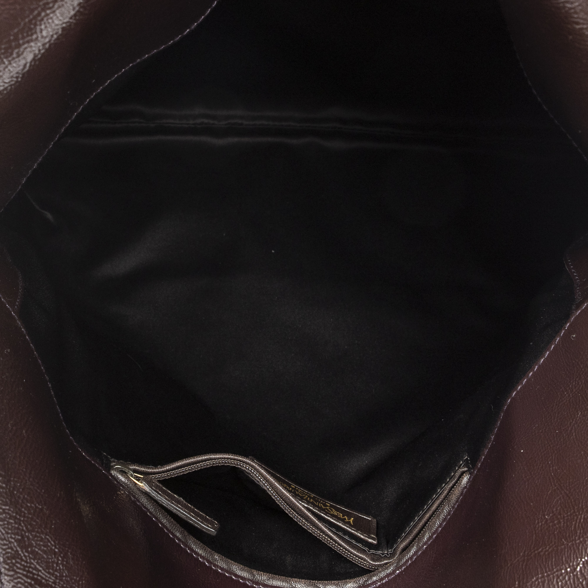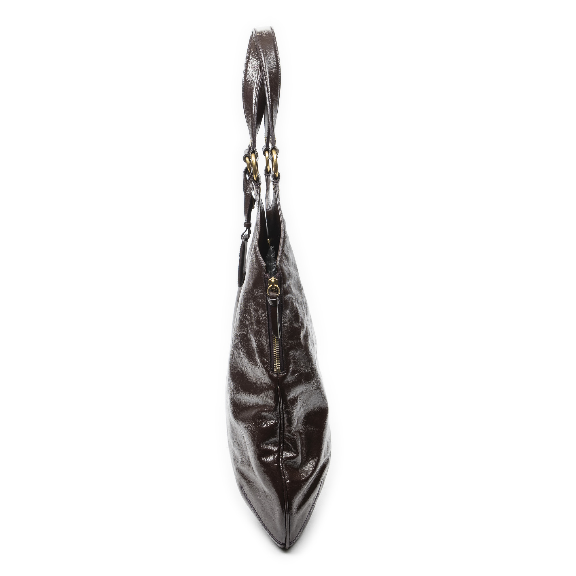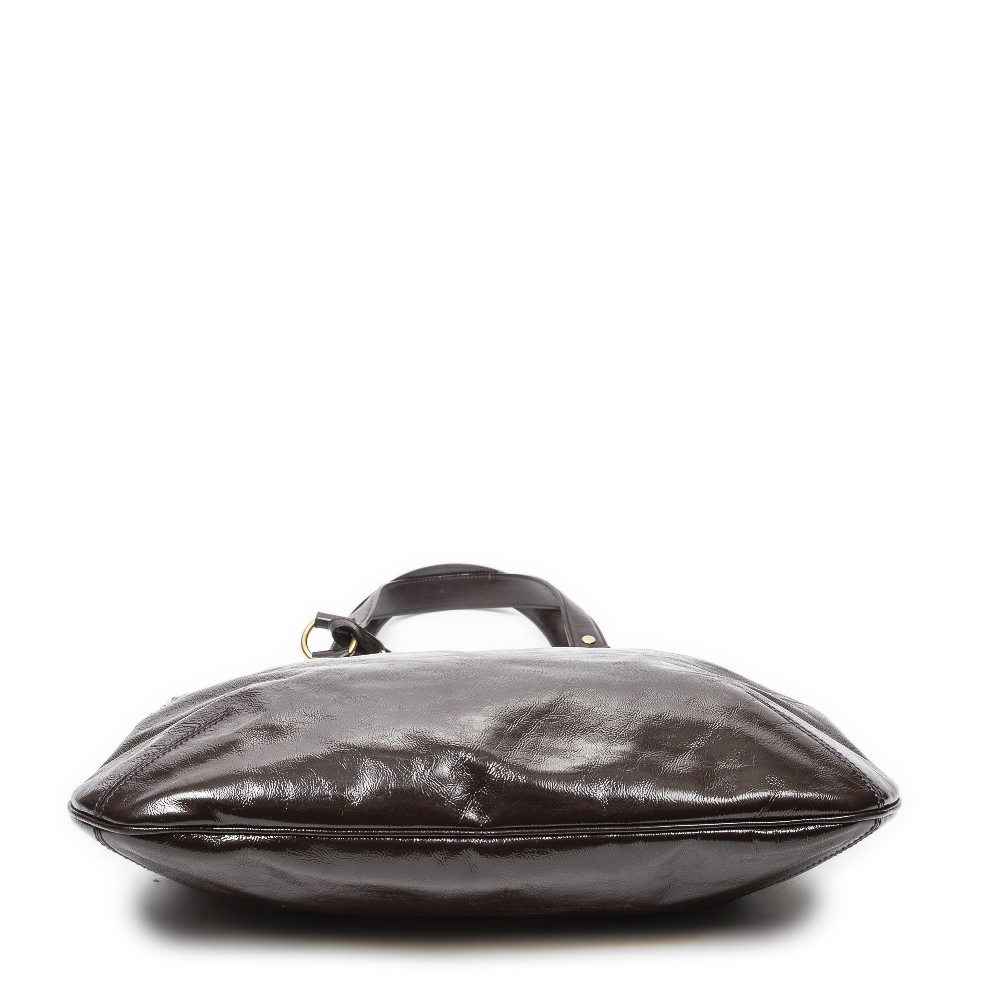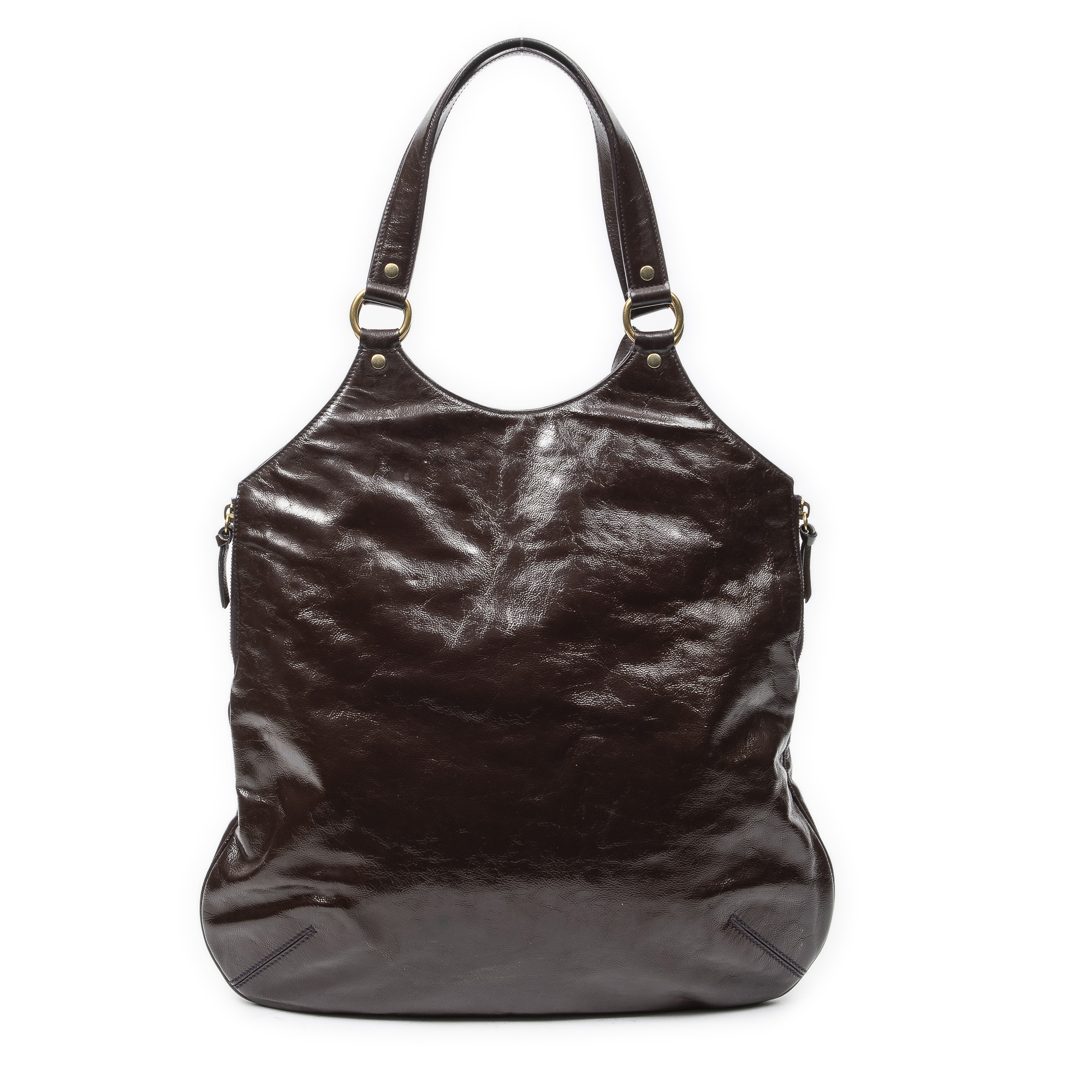 Yves Saint Laurent Shoulder Bag Metropolis Tribute Tote in Burgundy Patent Leather and Gold hardware. The product is in Very Good Condition (AB).
