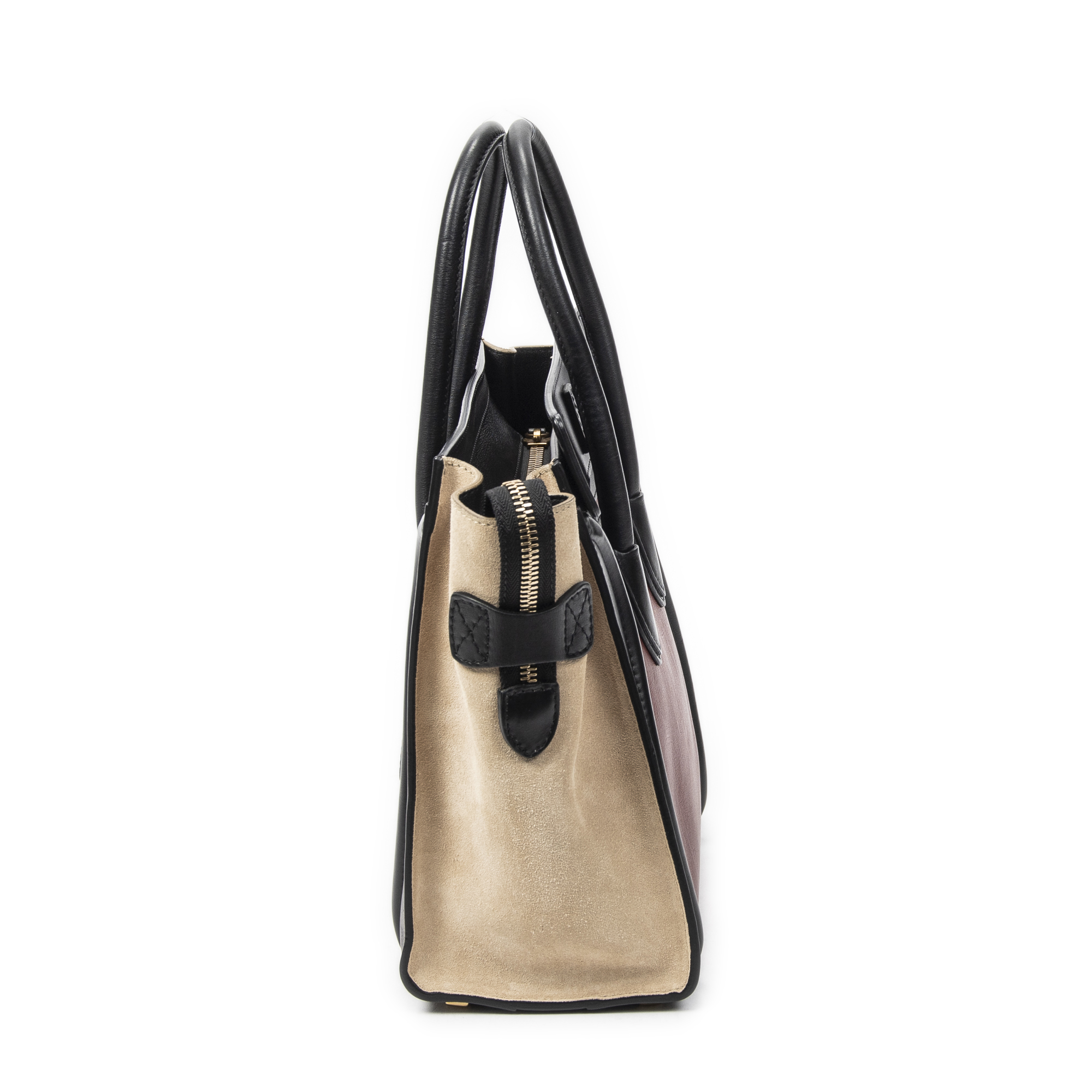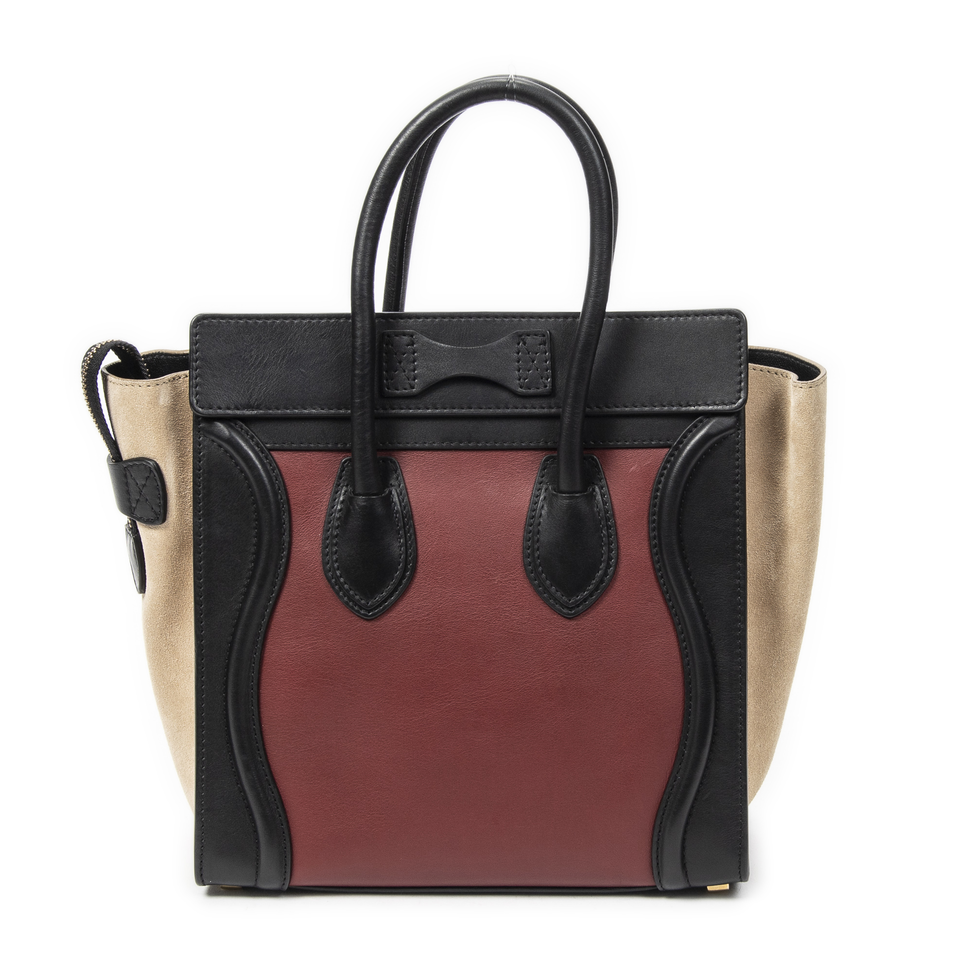 Celine Shoulder Bag Micro Tricolor Luggage in Black/Maroon/Beige Calfskin Leather and Gold hardware. The product is in Perfect Condition (AA).