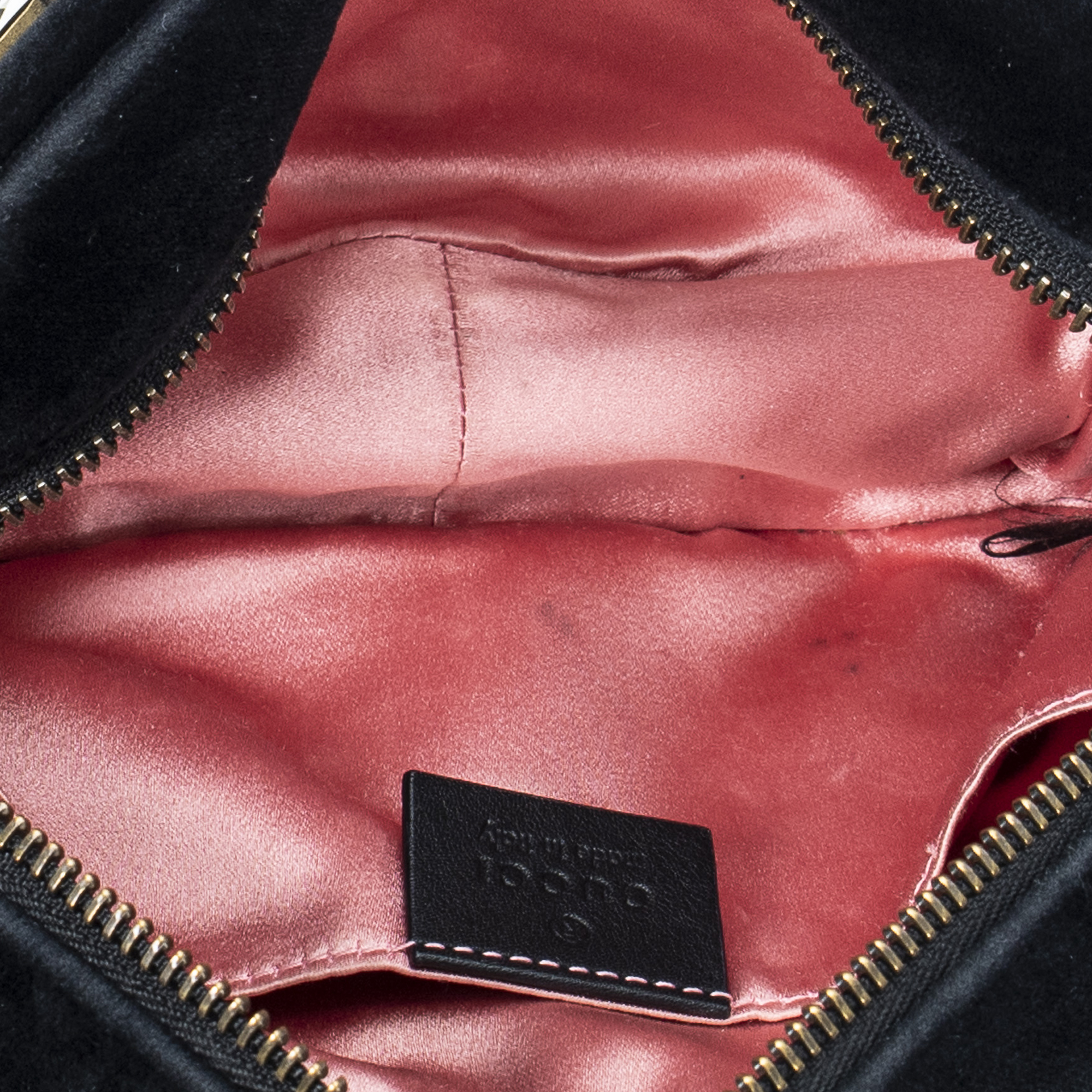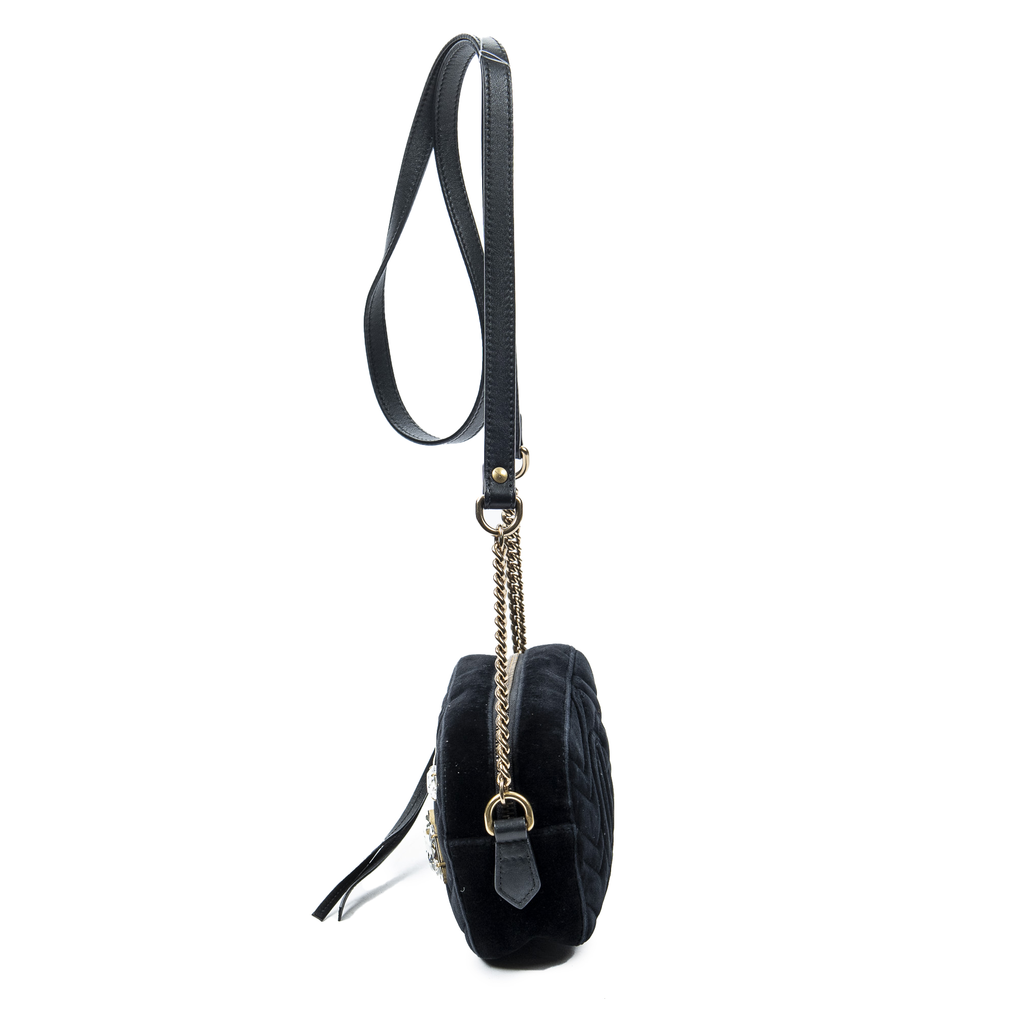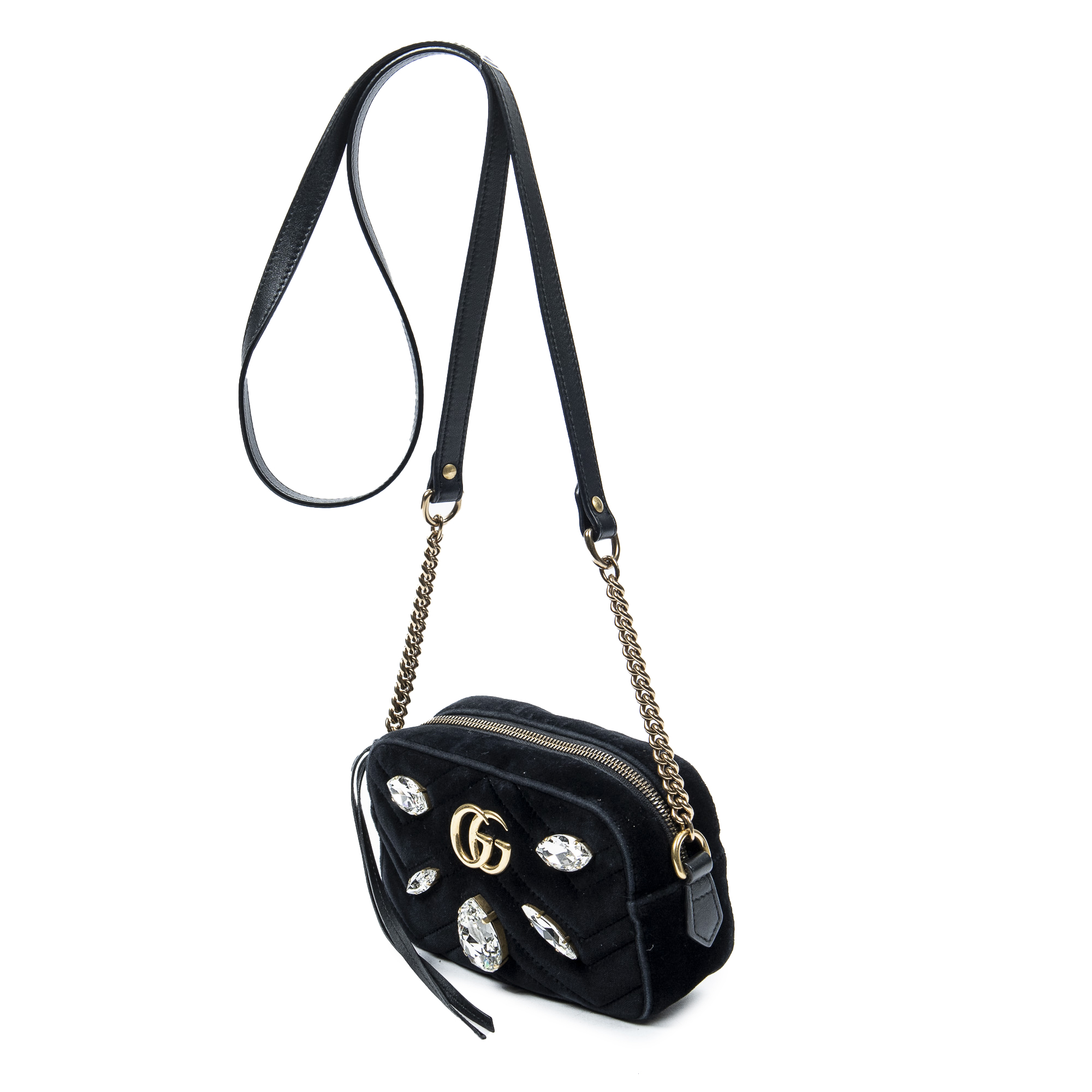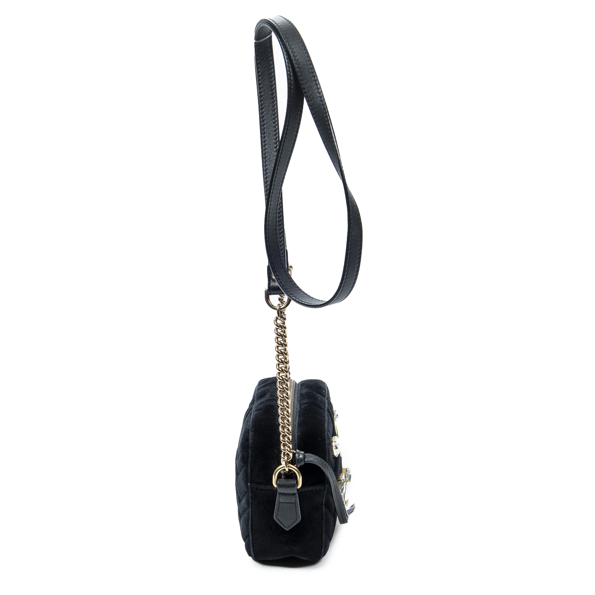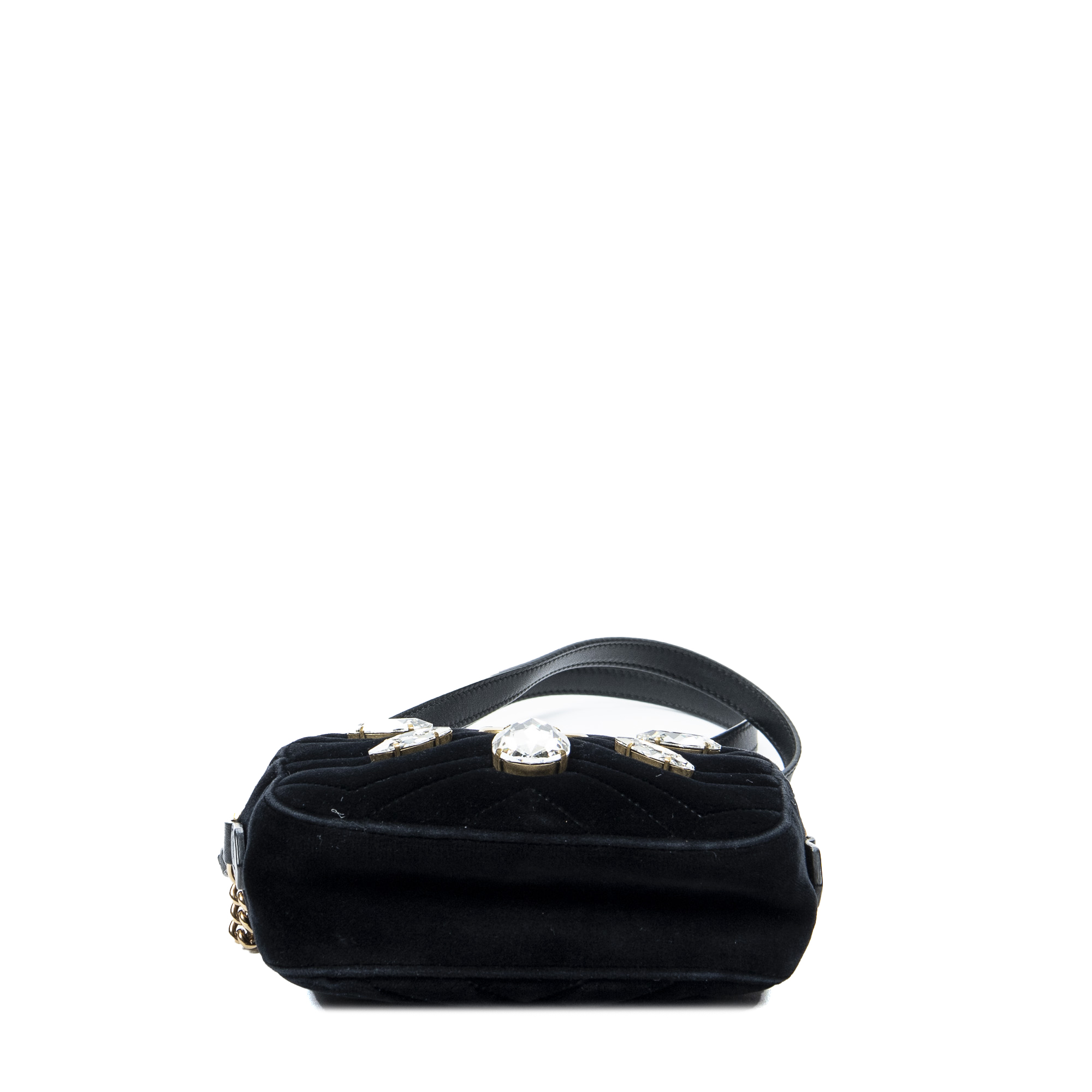 Gucci Shoulder Bag Mini Crystal Marmont Crossbody in Black Velvet Canvas and Gold hardware. The product is in Excellent Condition (A).