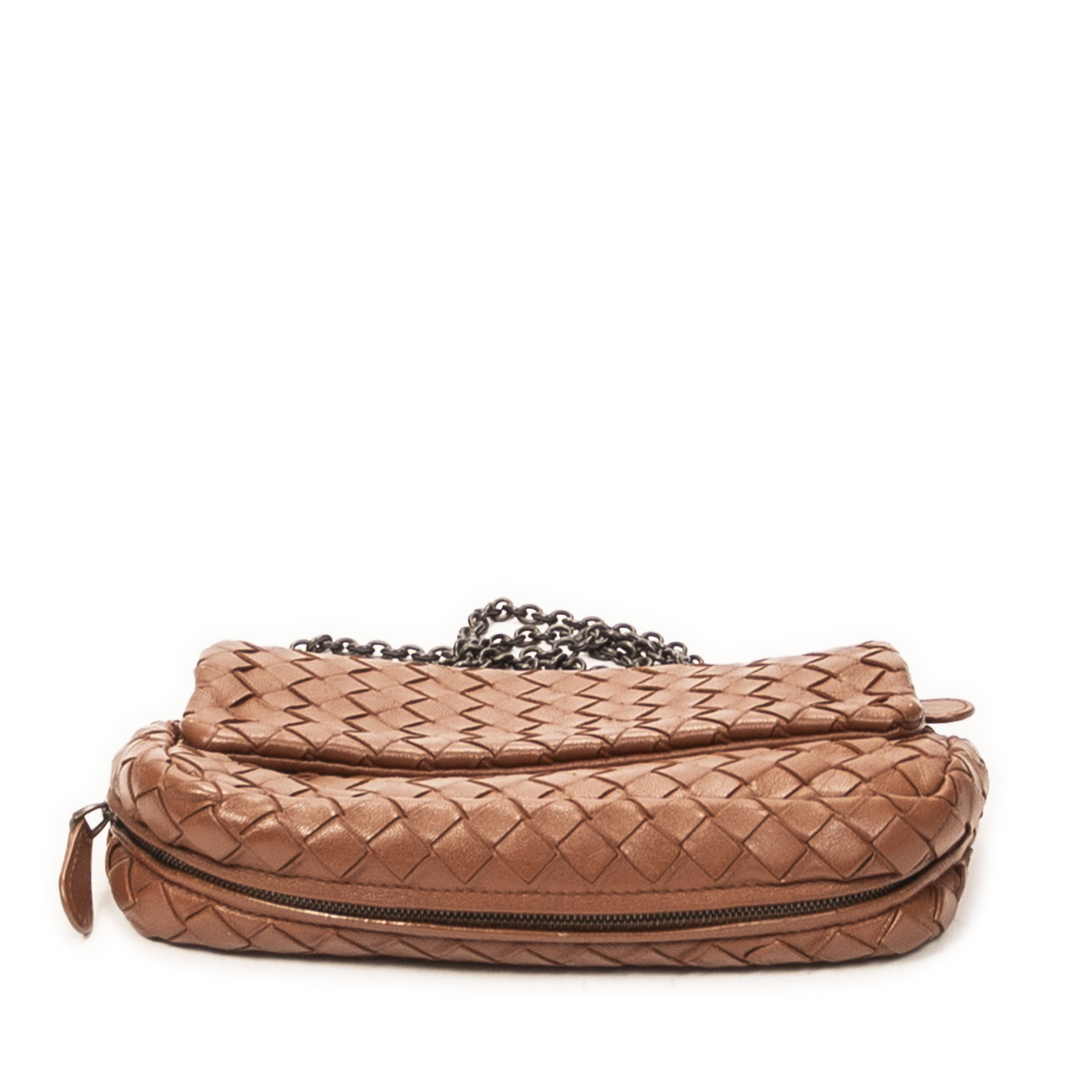 Bottega Veneta Shoulder Bag Mini Expandable Chain Flap Crossbody in Brown Intrecciato Leather and Aged Brass hardware. The product is in Very Good Condition (AB).
