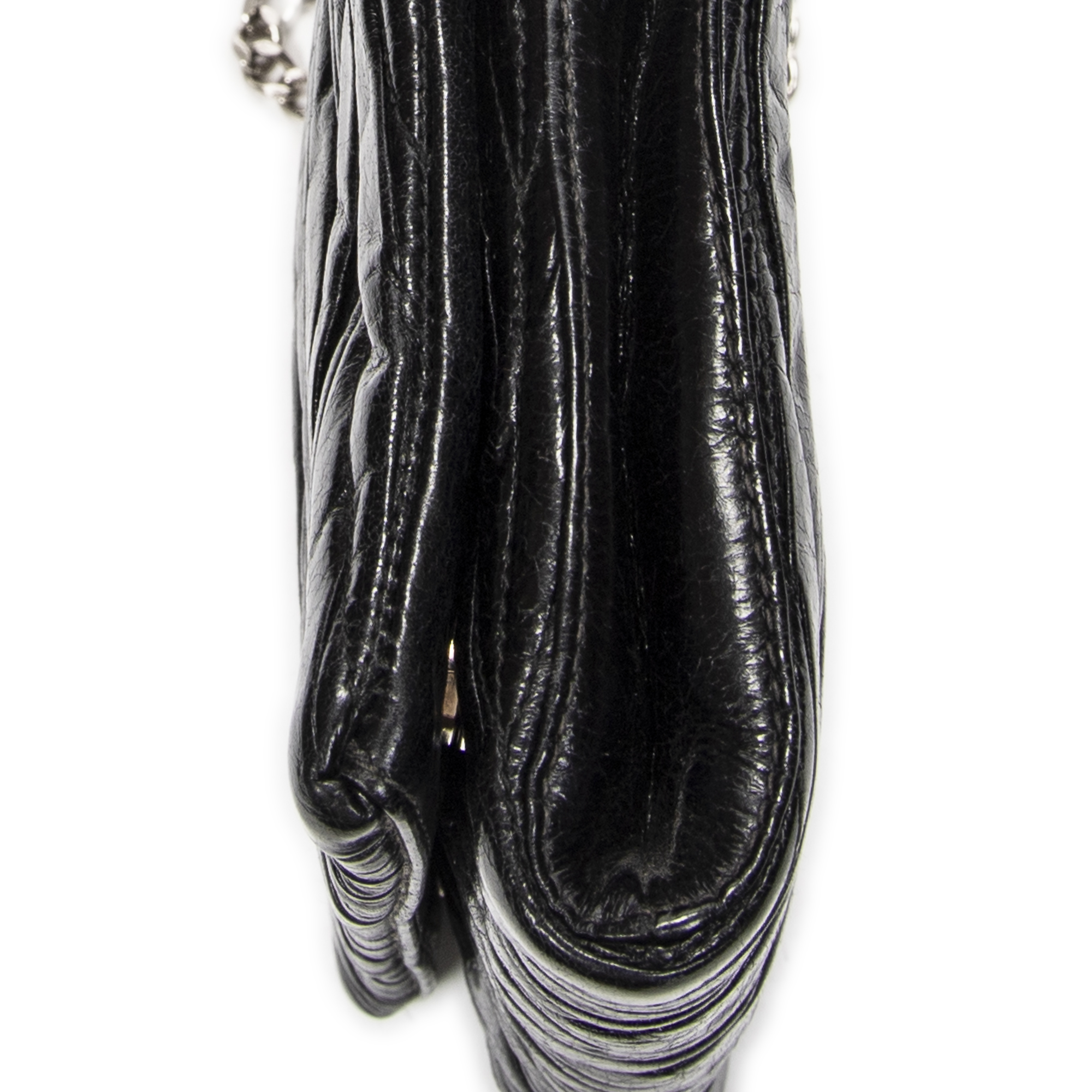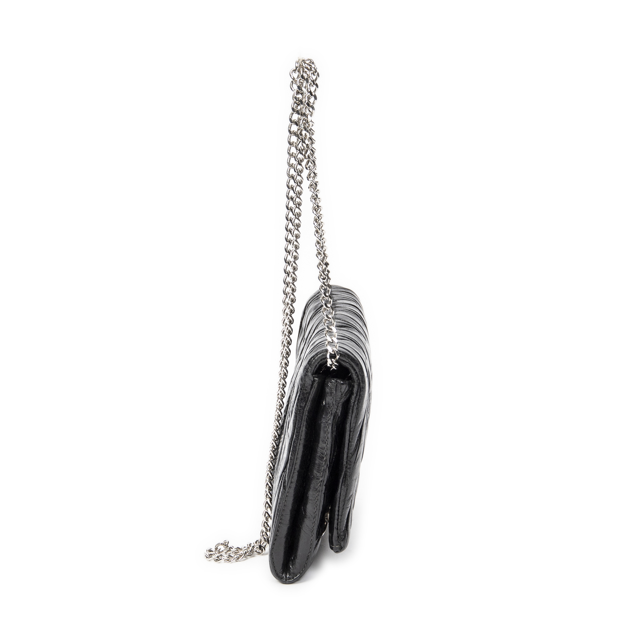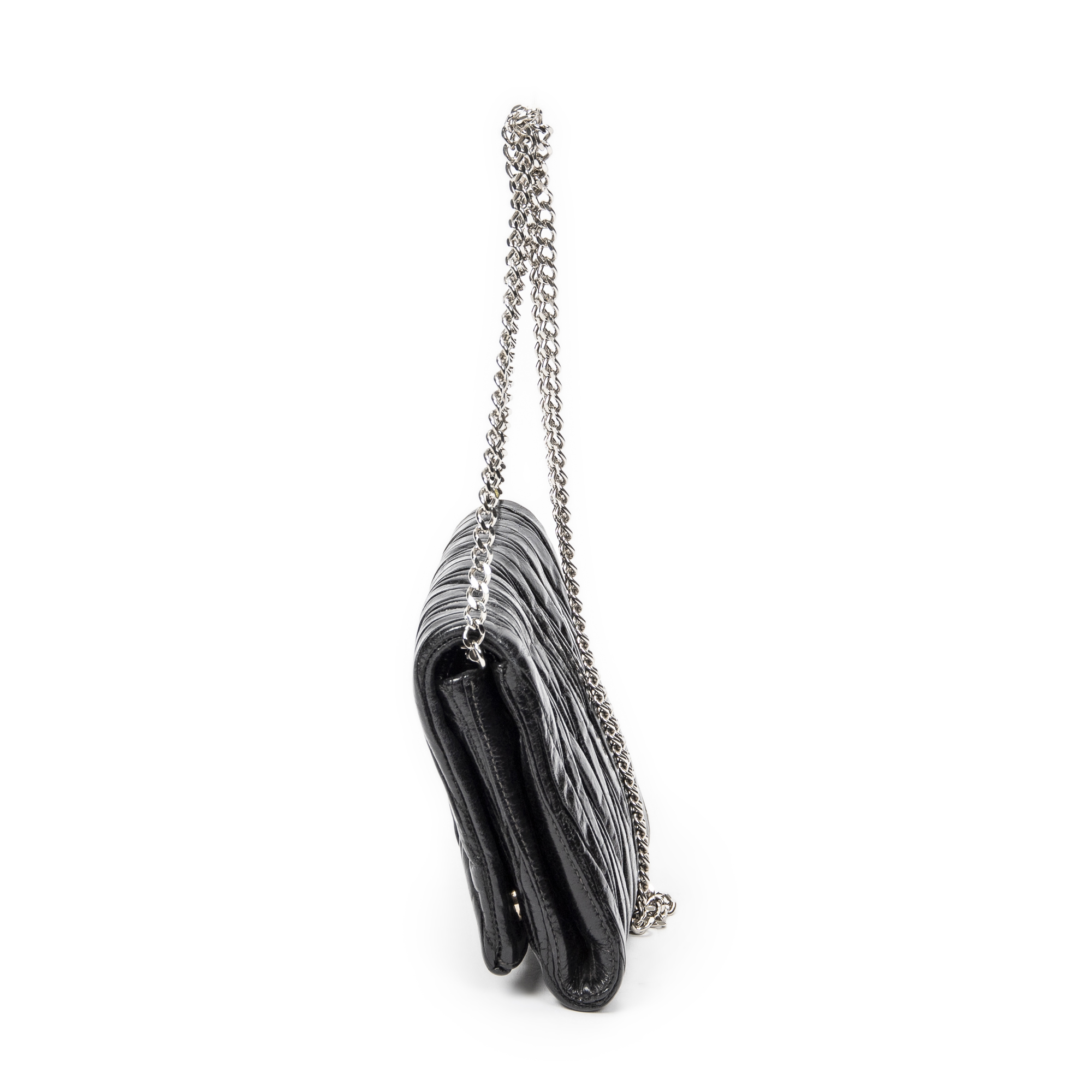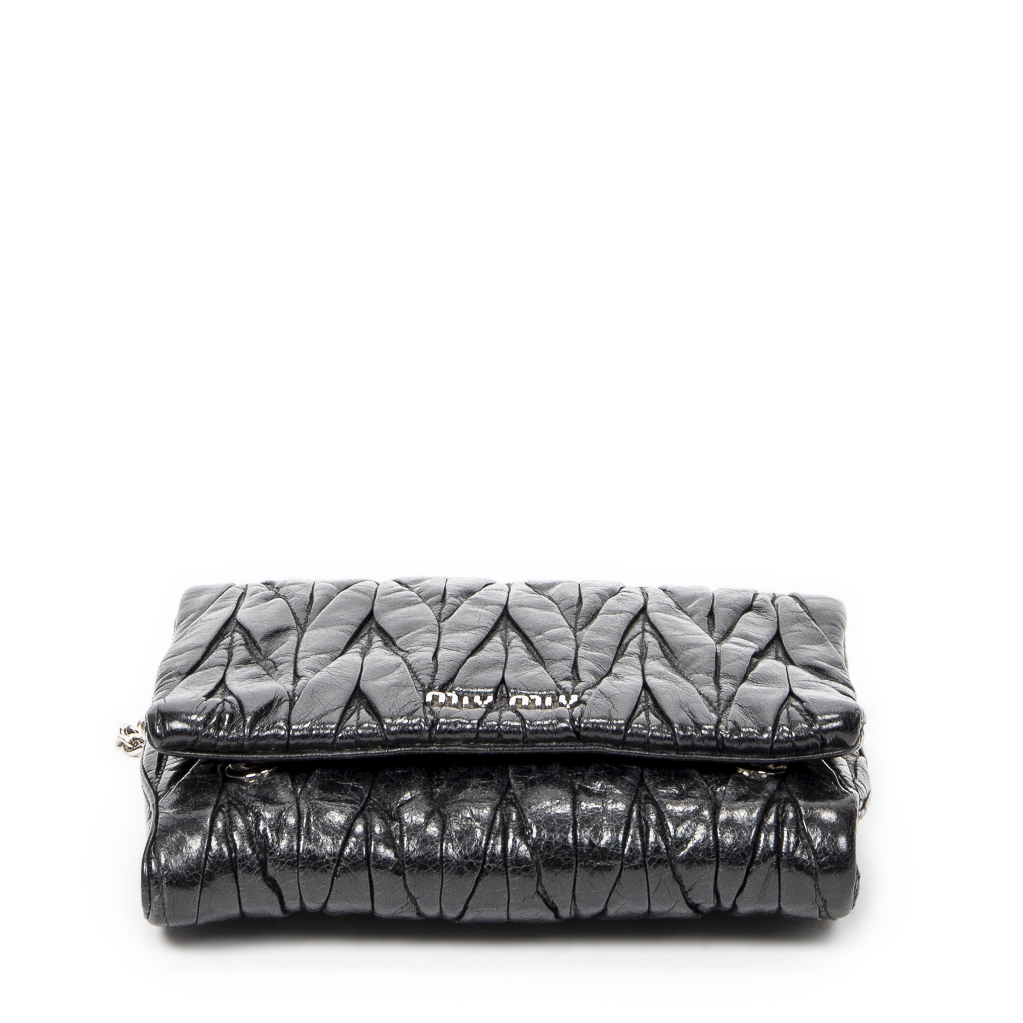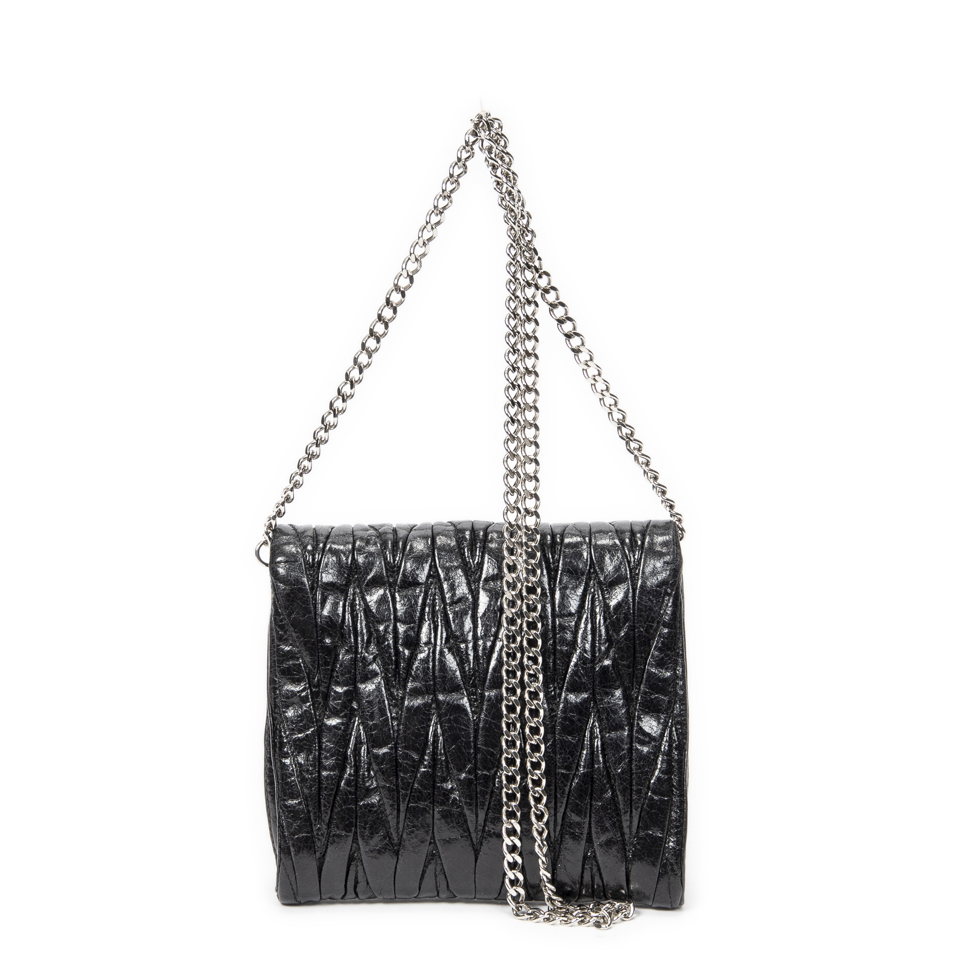 Miu Miu Shoulder Bag Mini Flap Chain Crossbody in Black Matelasse Lux Leather and Silver hardware. The product is in Excellent Condition (A).