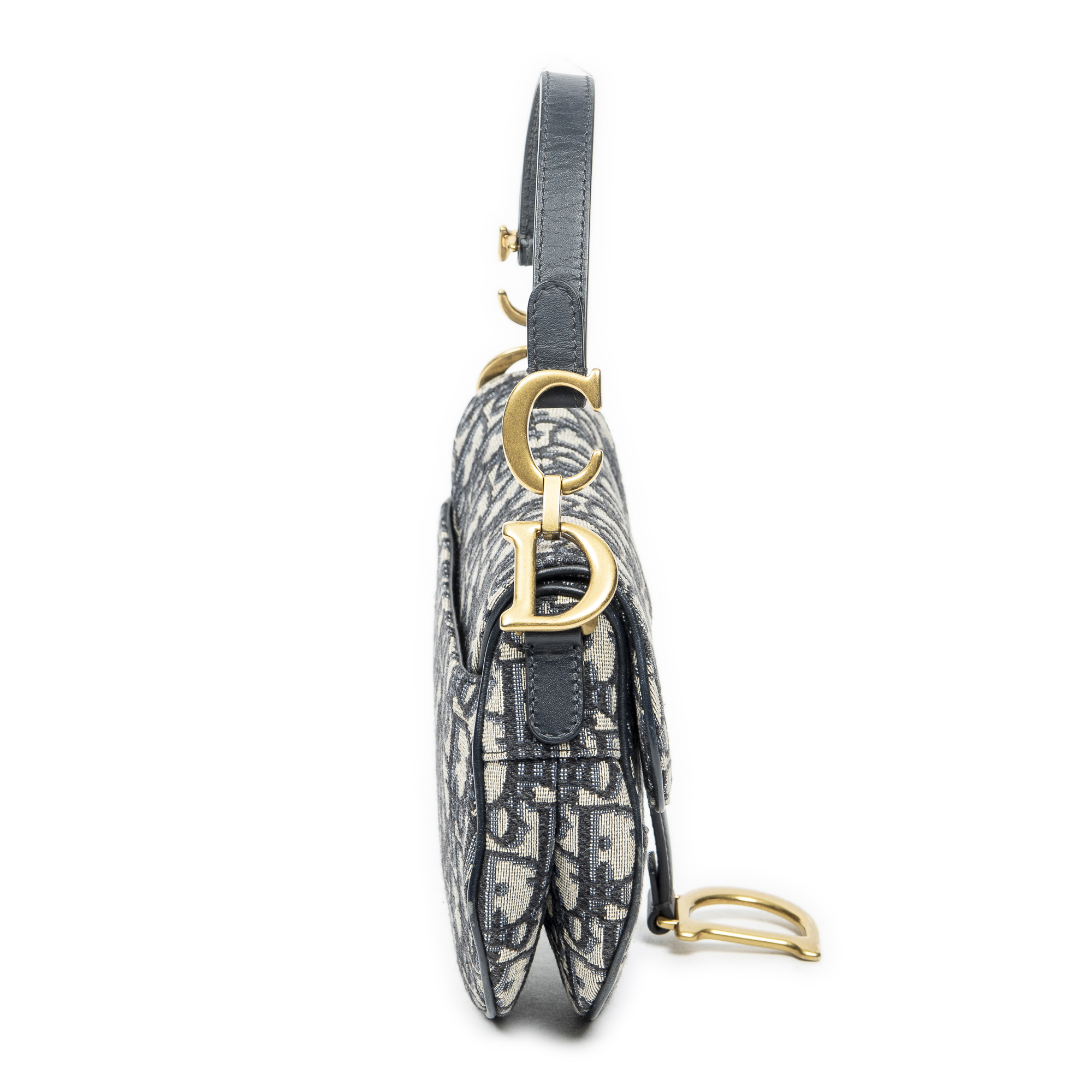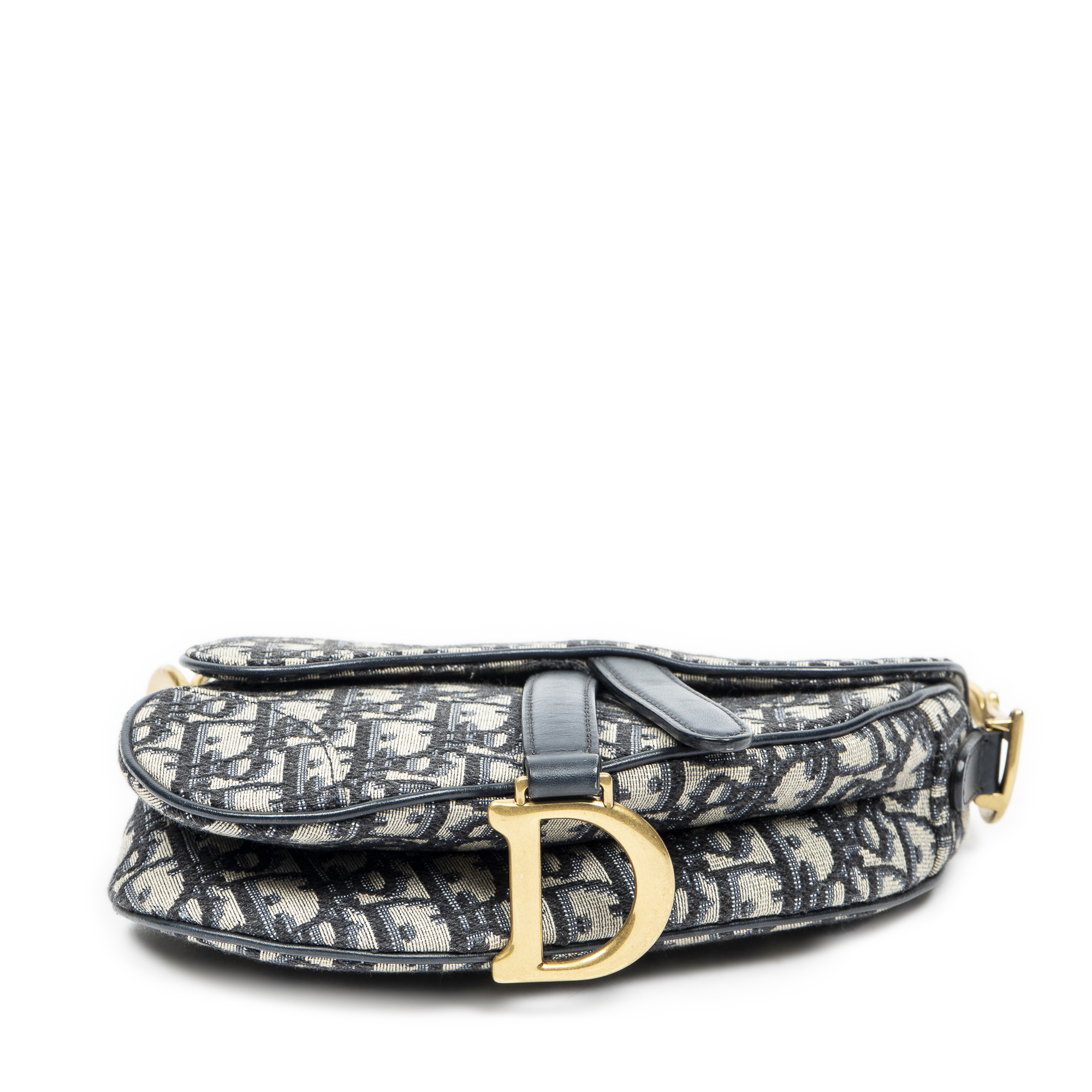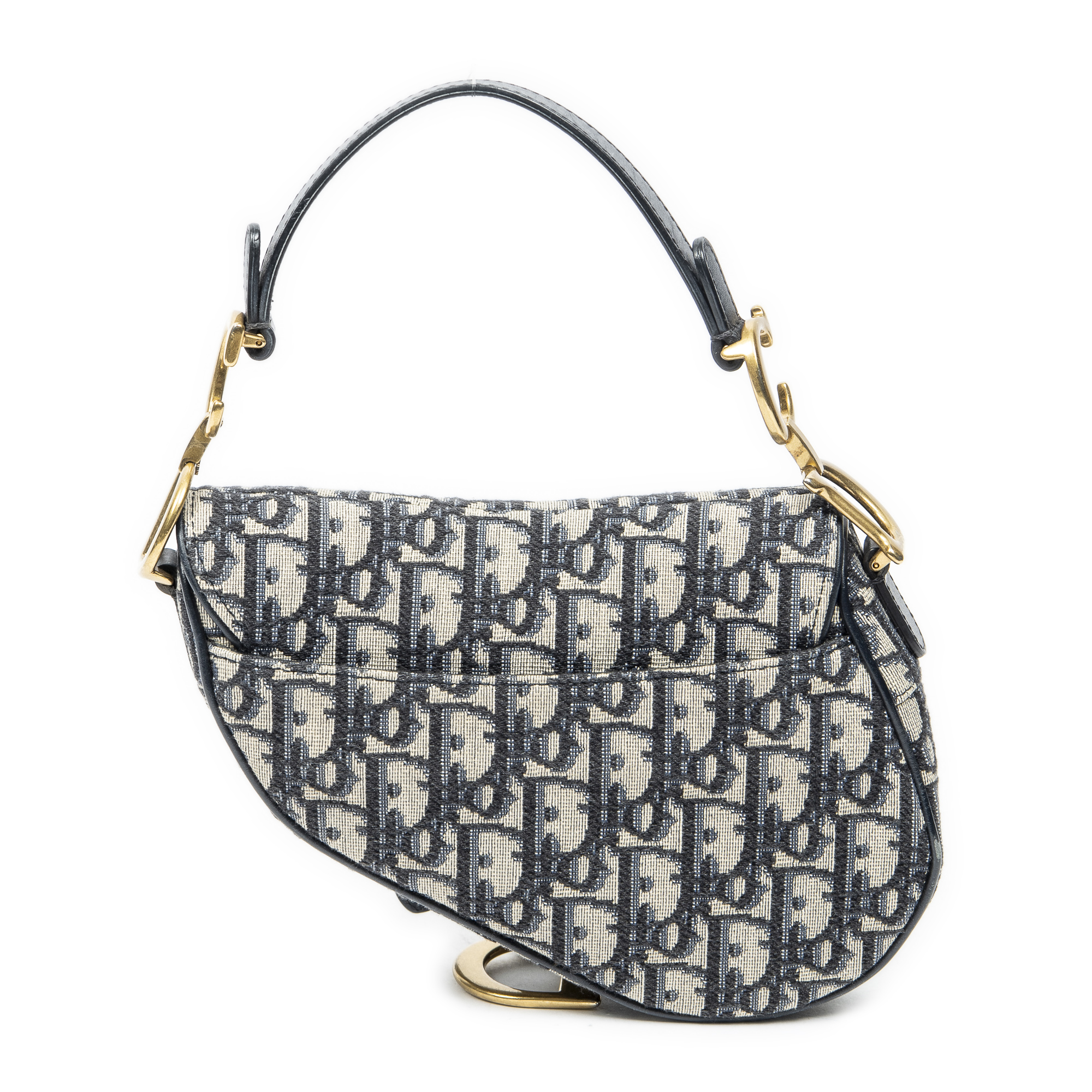 Dior Shoulder Bag Mini Saddle Bag in Navy/Beige Oblique Jacquard Canvas and Gold hardware. The product is in Very Good Condition (AB).