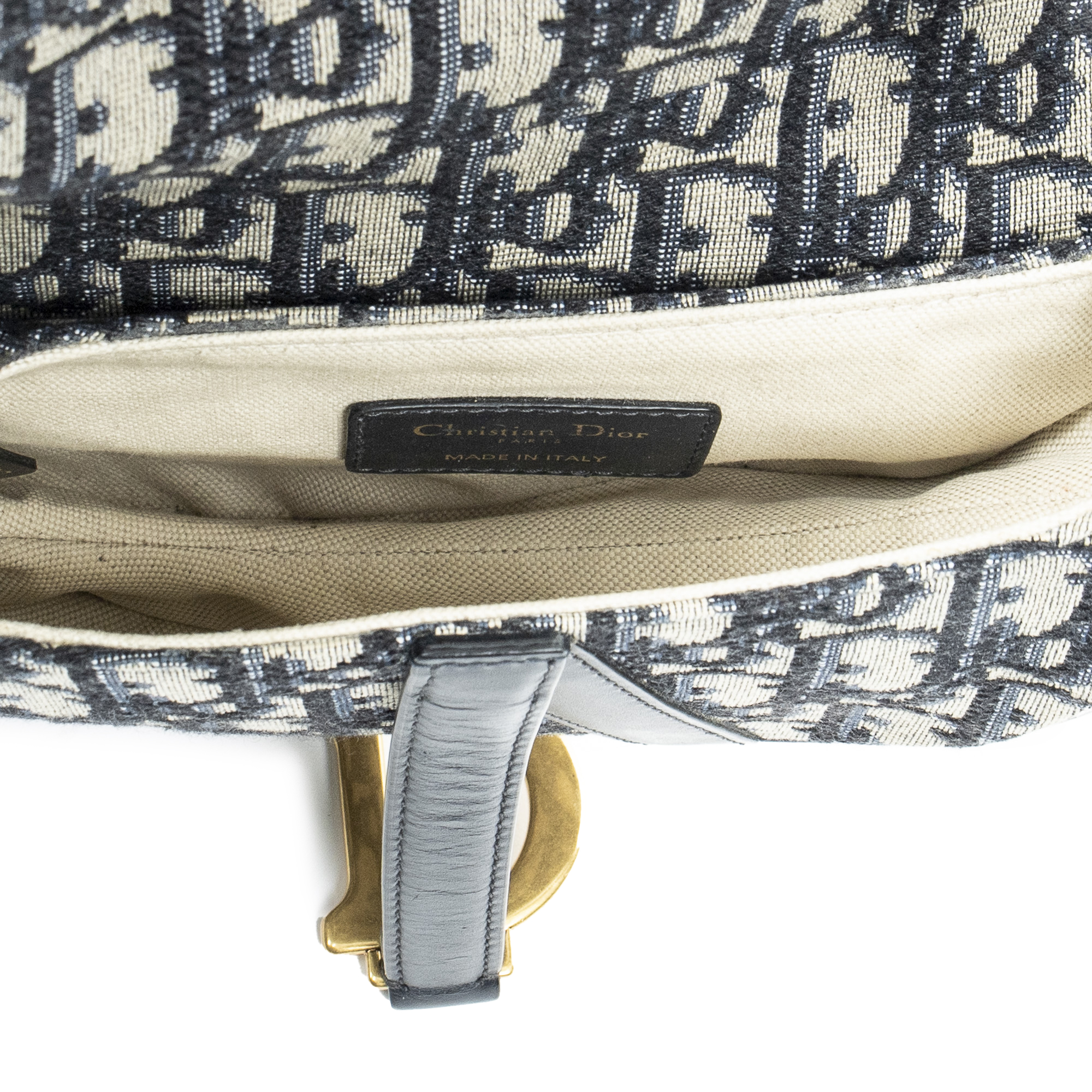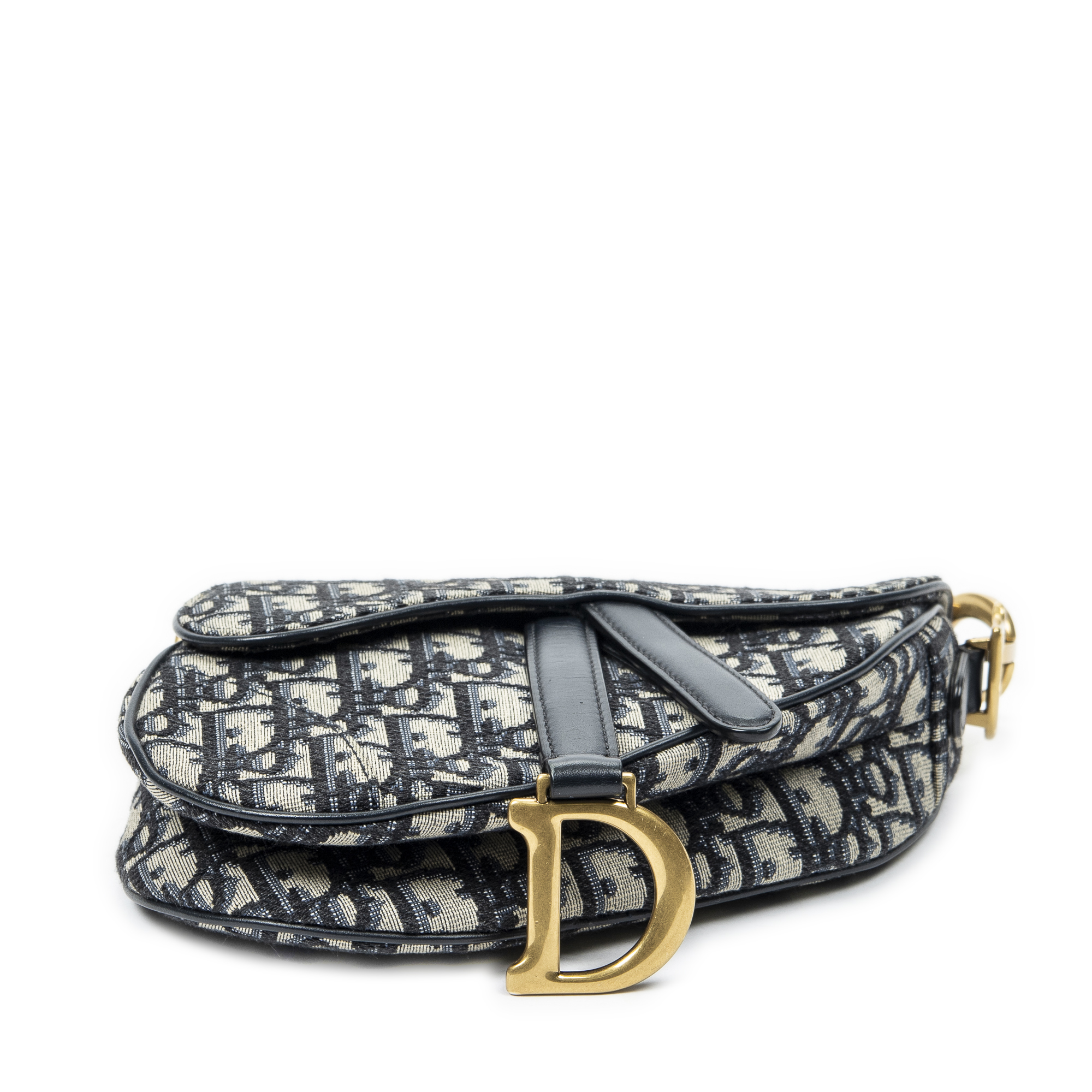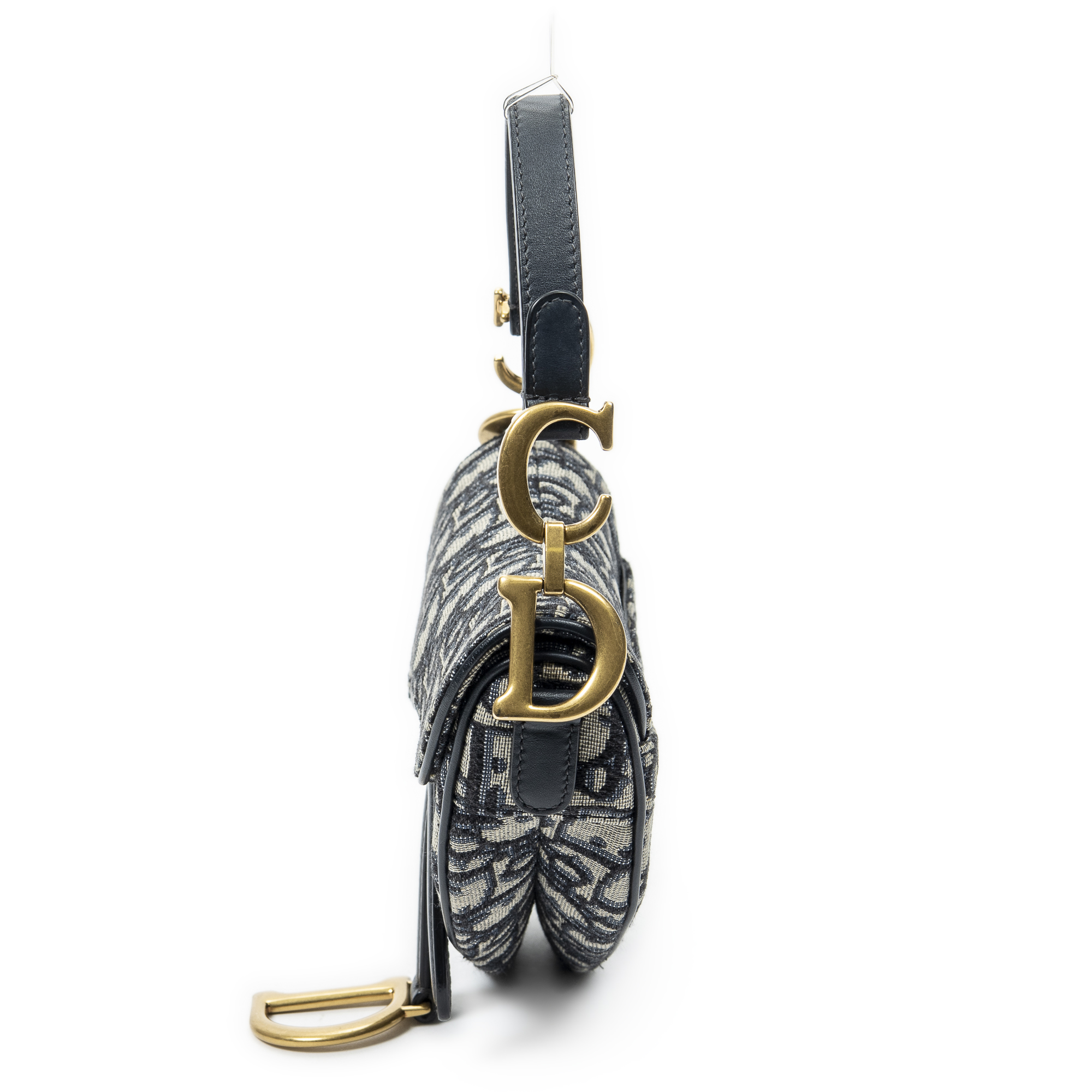 Dior Shoulder Bag Mini Saddle Bag in Navy/Beige Oblique Jacquard Canvas and Gold hardware. The product is in Excellent Condition (A).