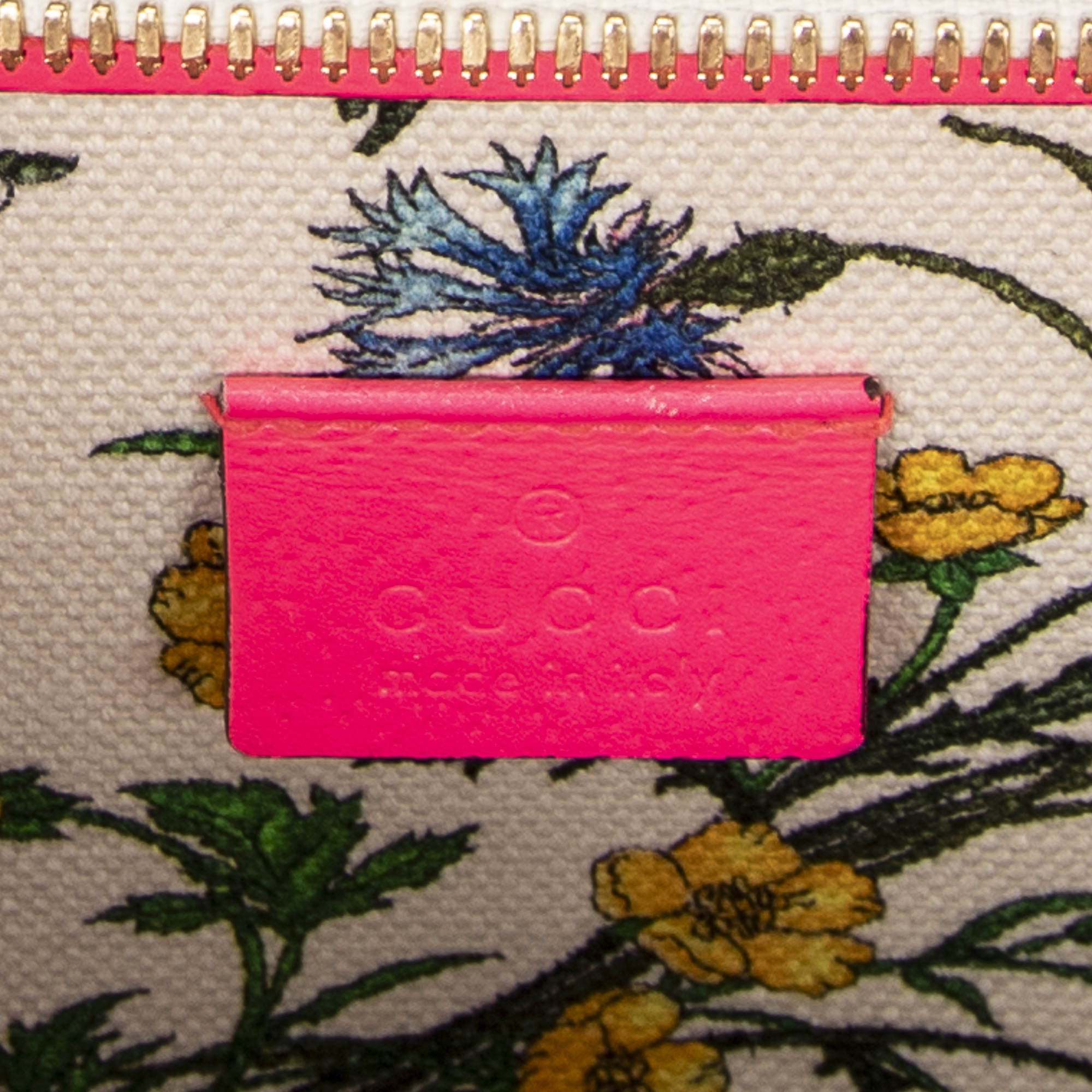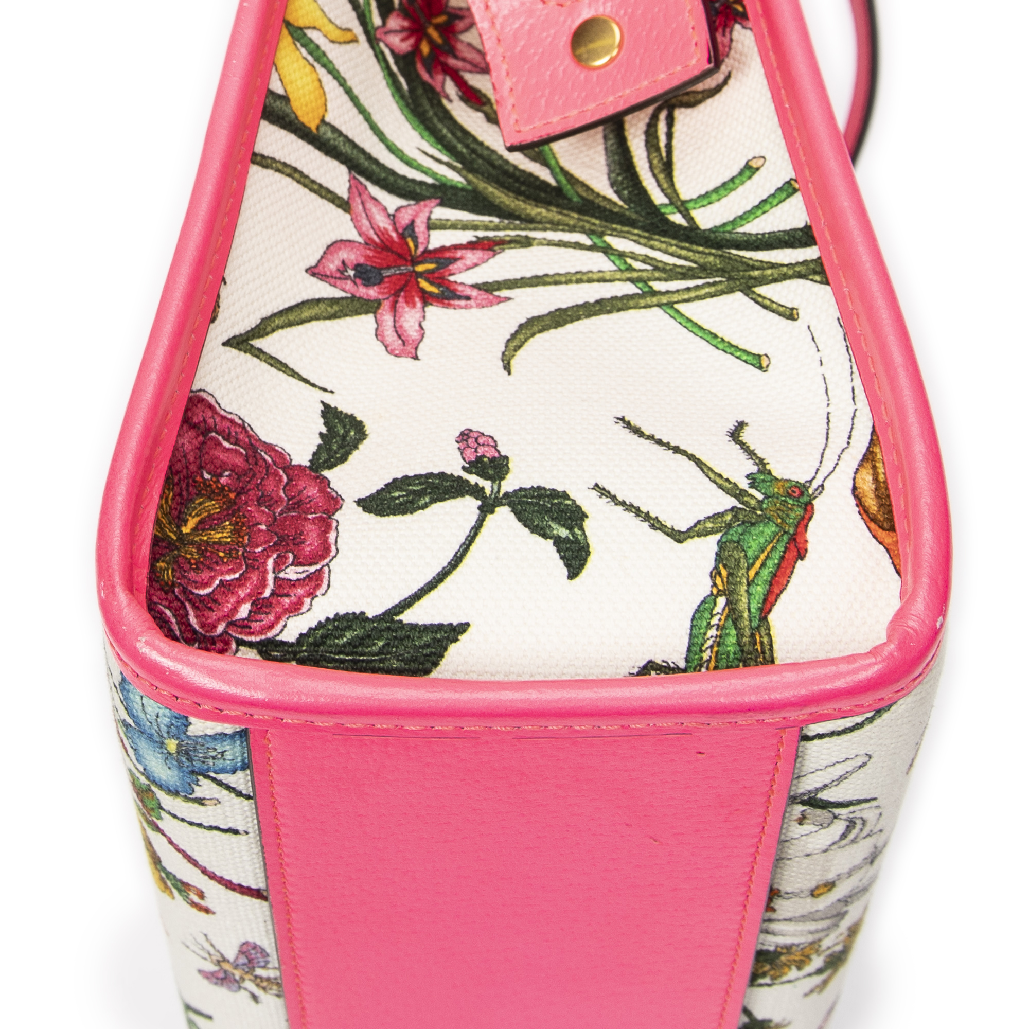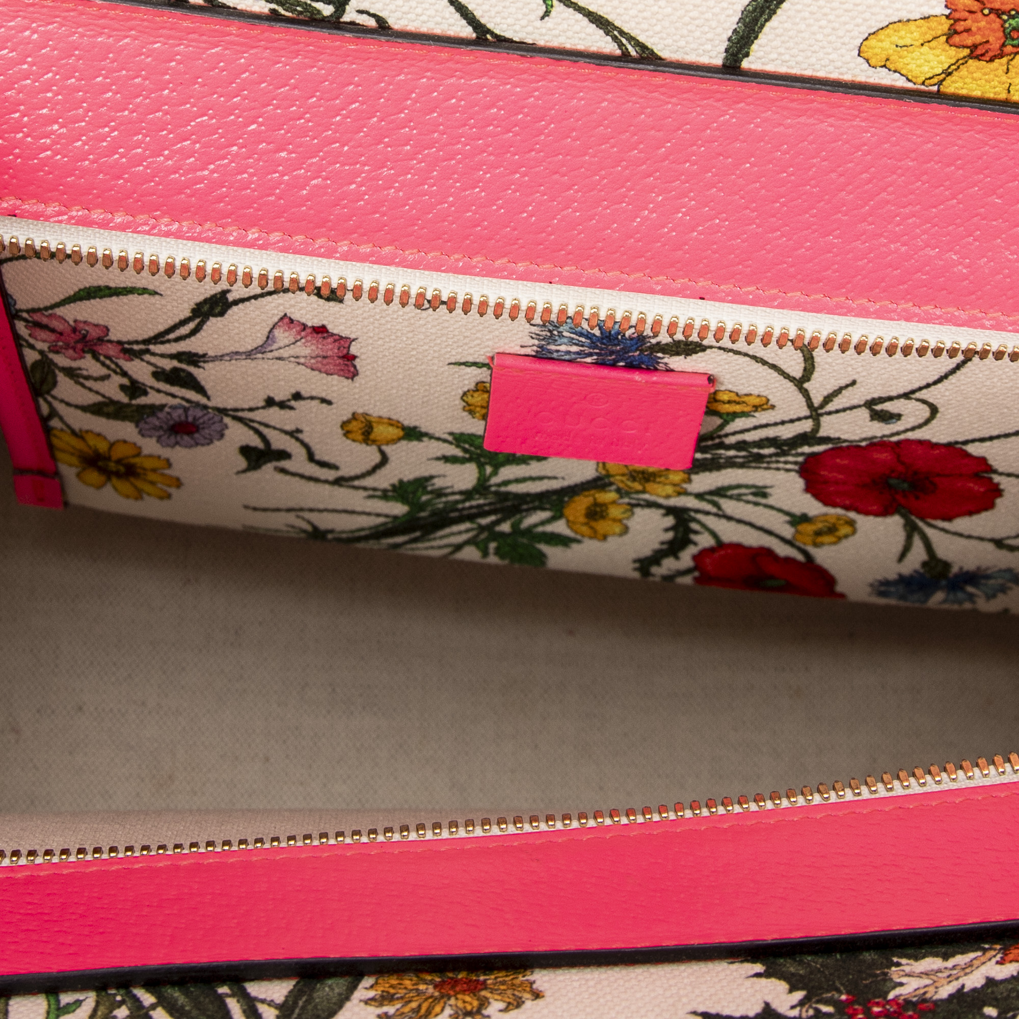 Gucci Shoulder bag Multicolor Flora Tote in Ivory/Neon Pink Floral Printed Canvas and Gold hardware. The product is in Excellent Condition (A).