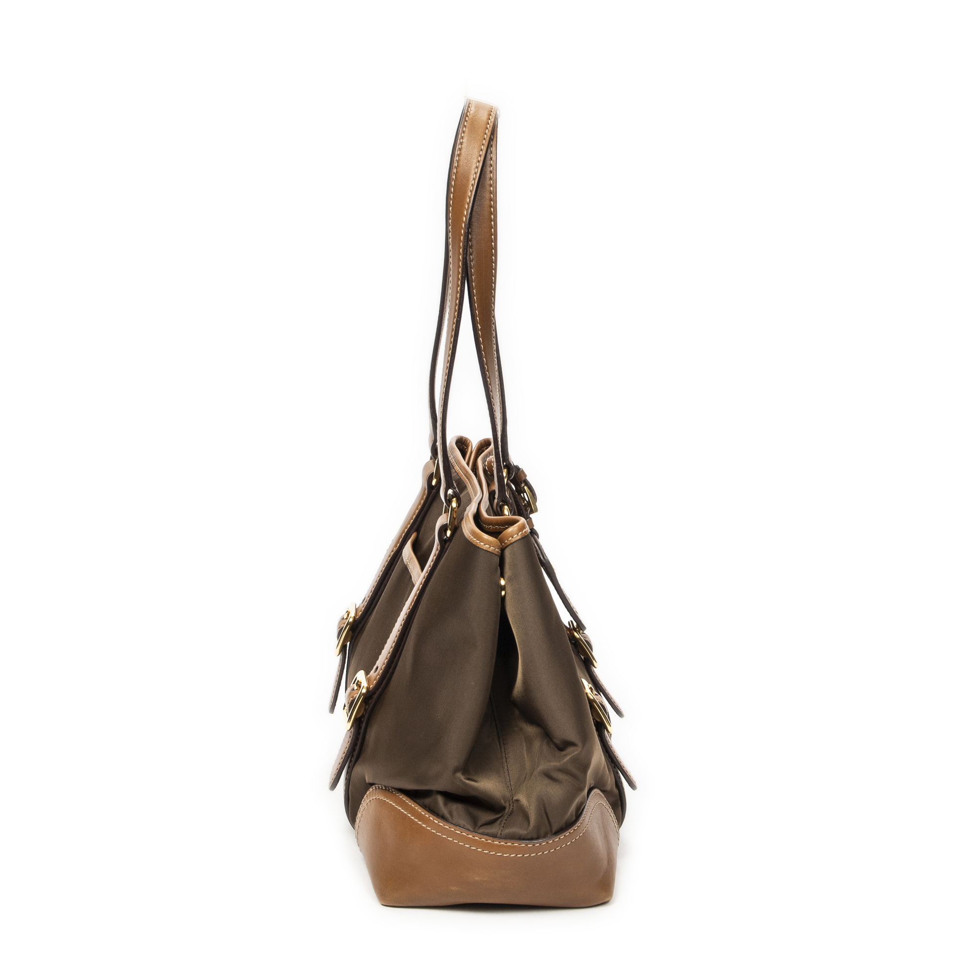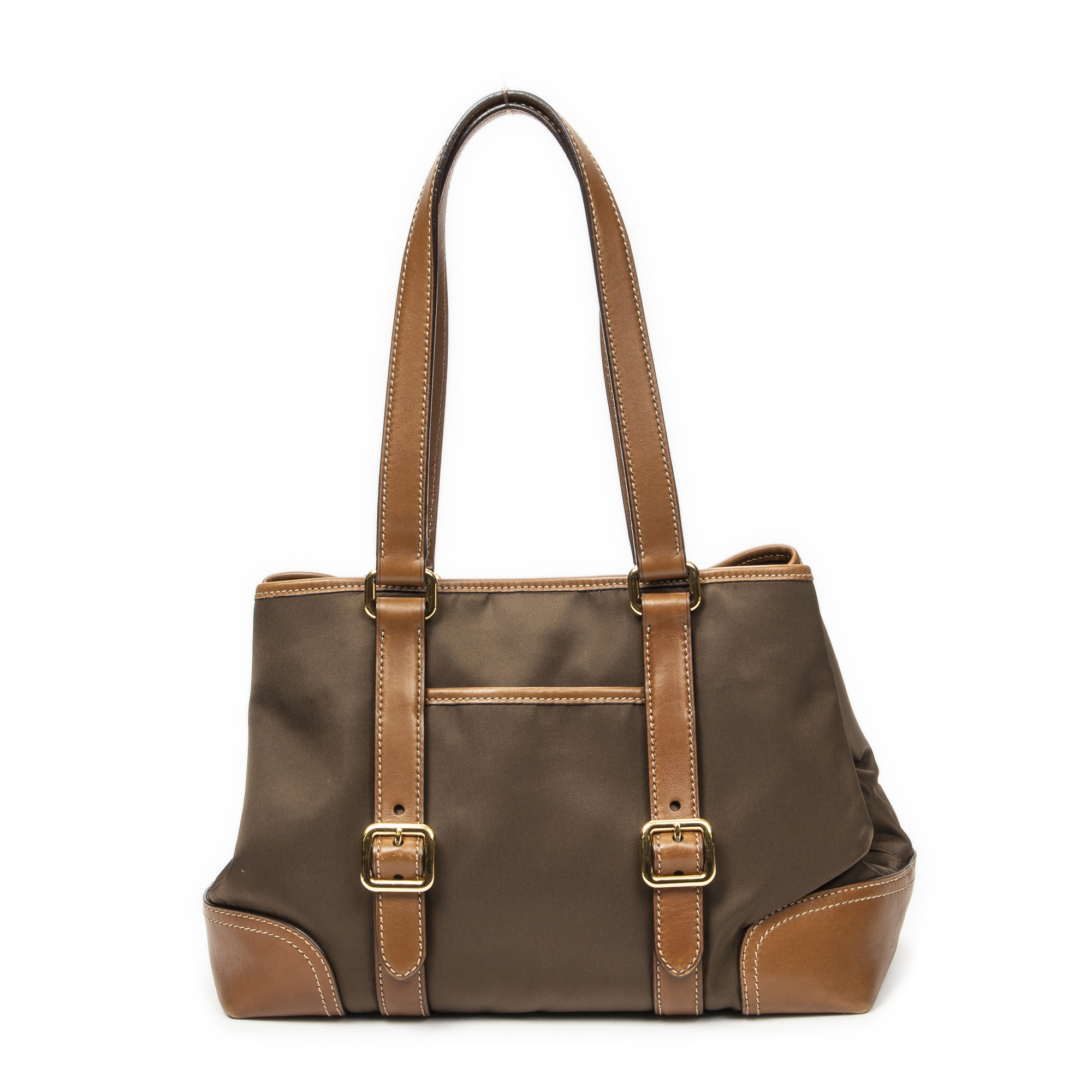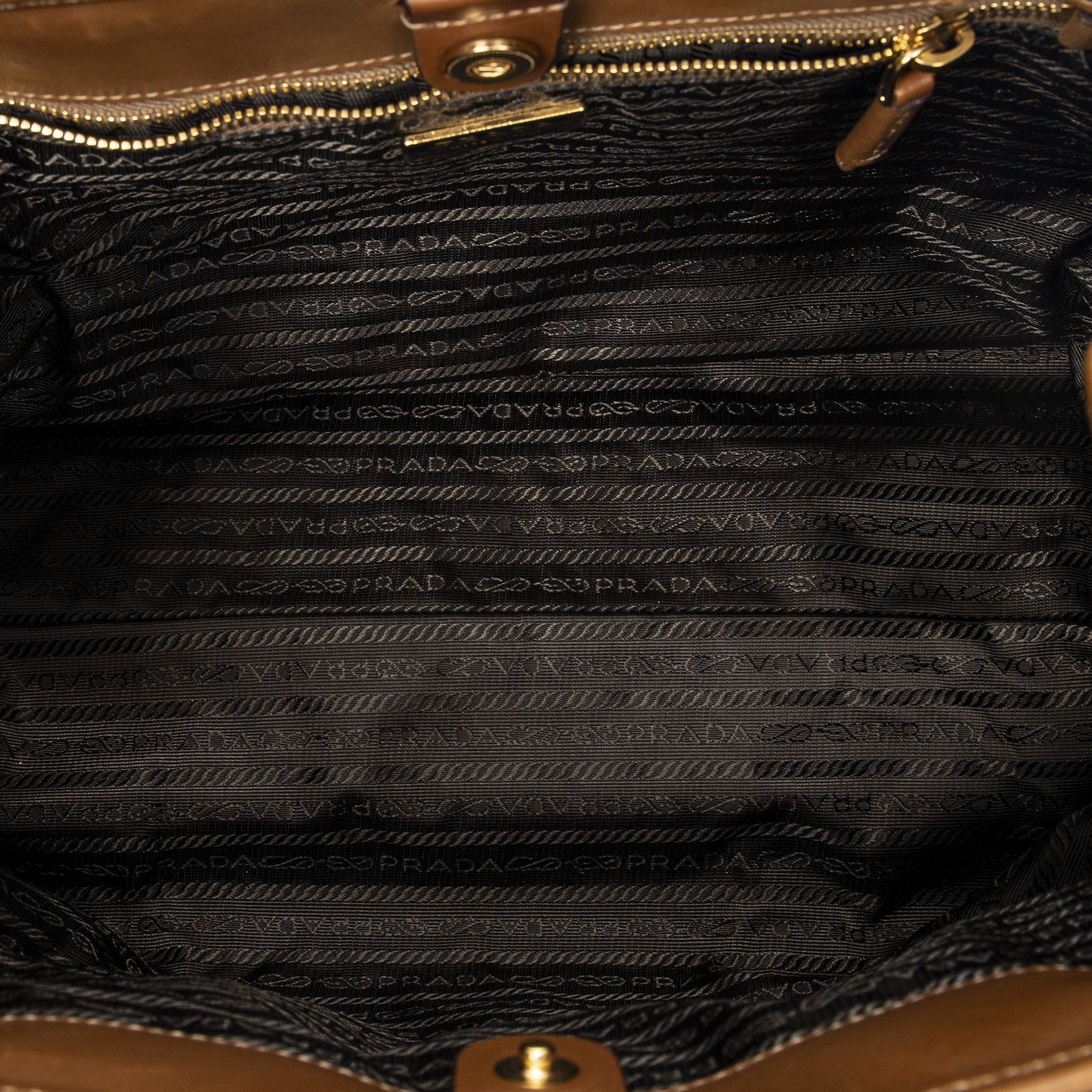 Prada Shoulder Bag Open Tote in Brown Nylon Canvas and Gold hardware. The product is in Excellent Condition (A).