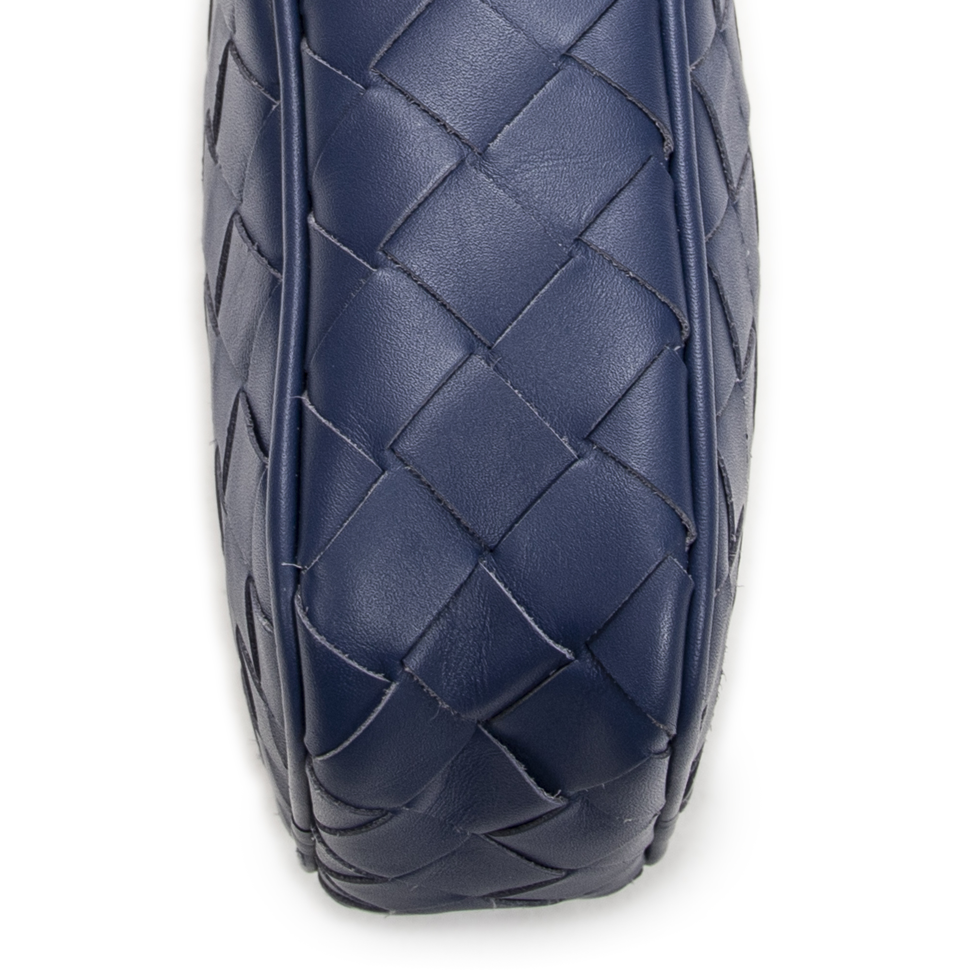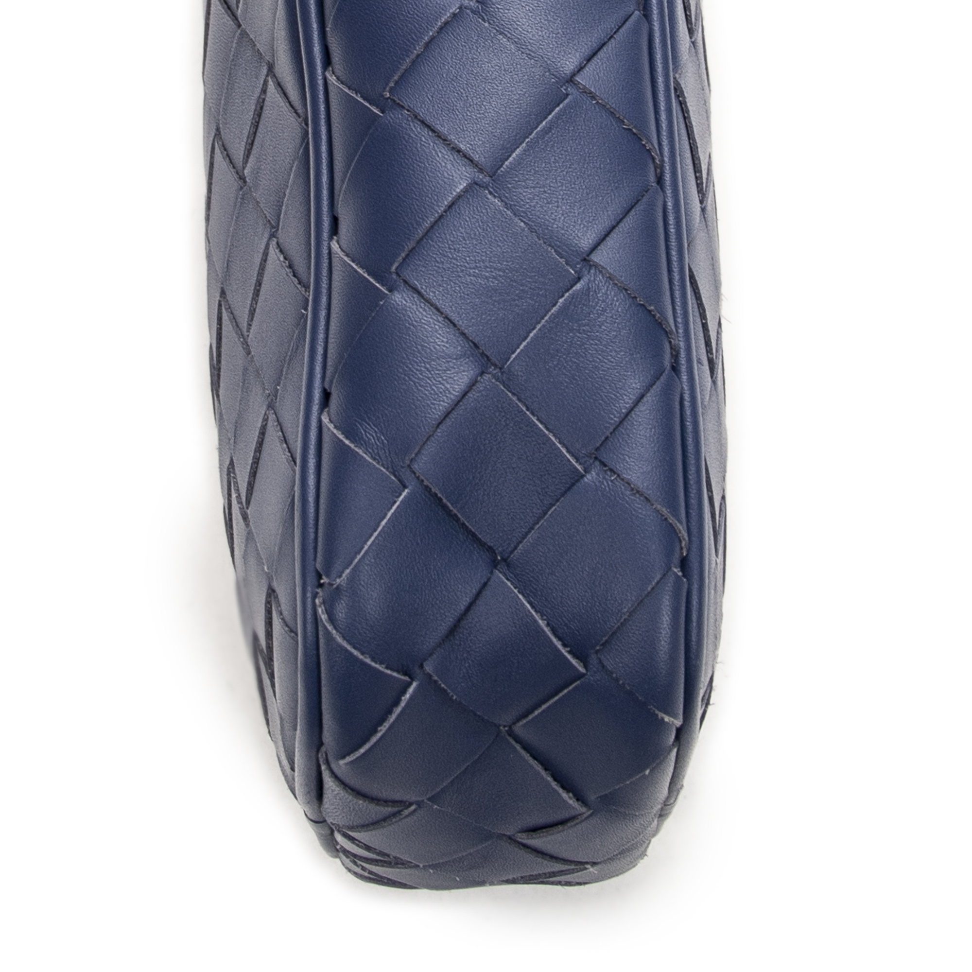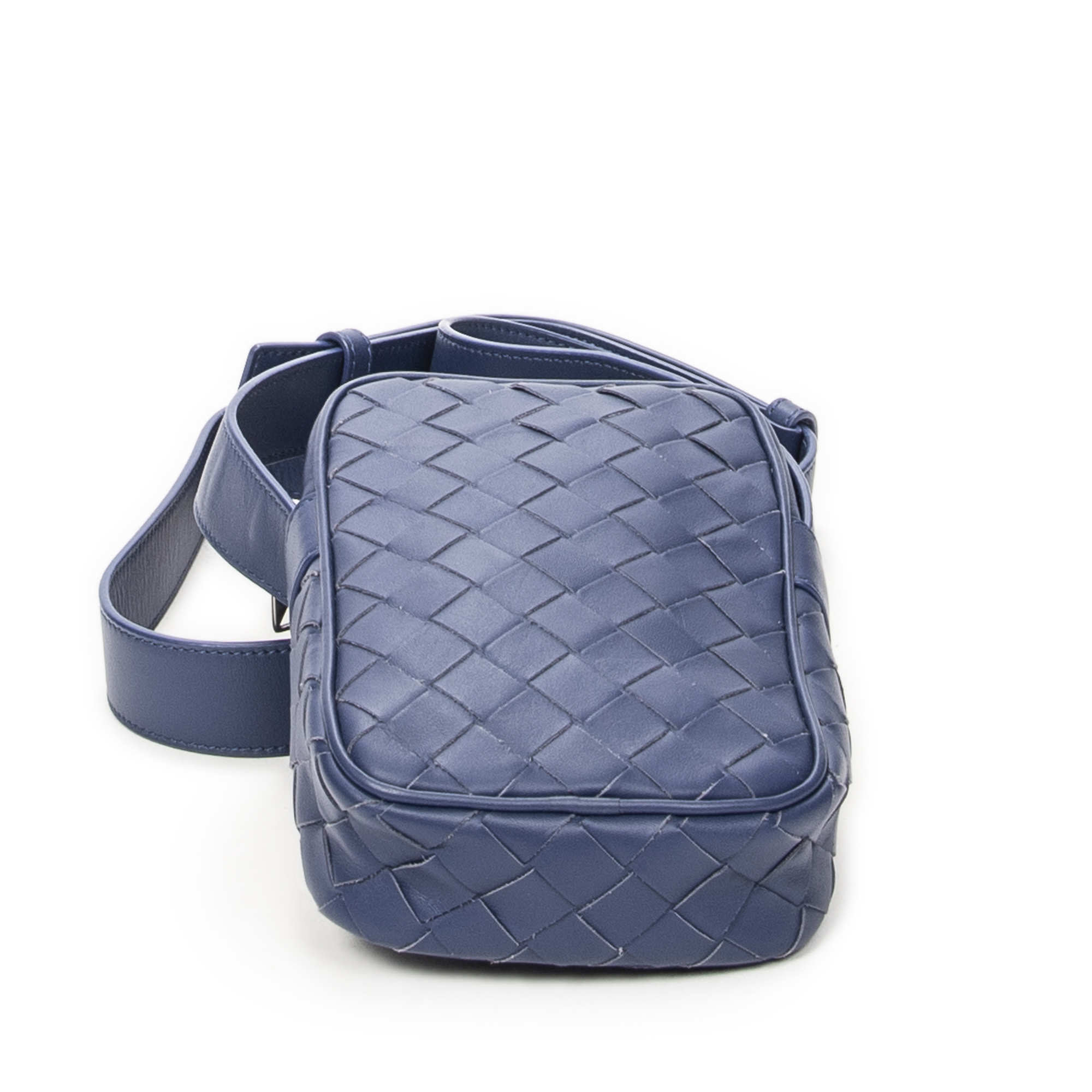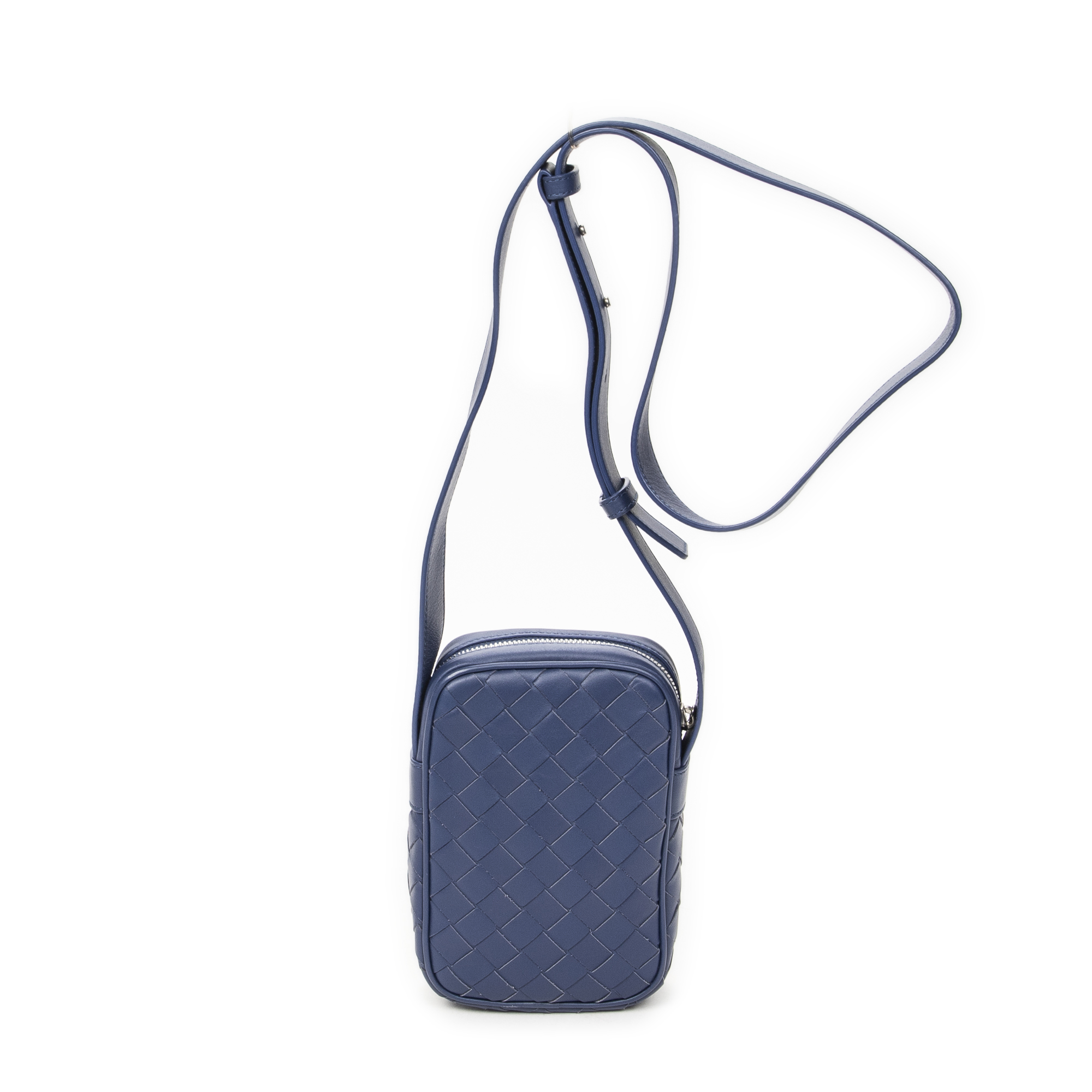 Bottega Veneta Shoulder Bag Phone Pouch Crossbody in Blue Intrecciato Leather and Silver hardware. The product is in Excellent Condition (A).