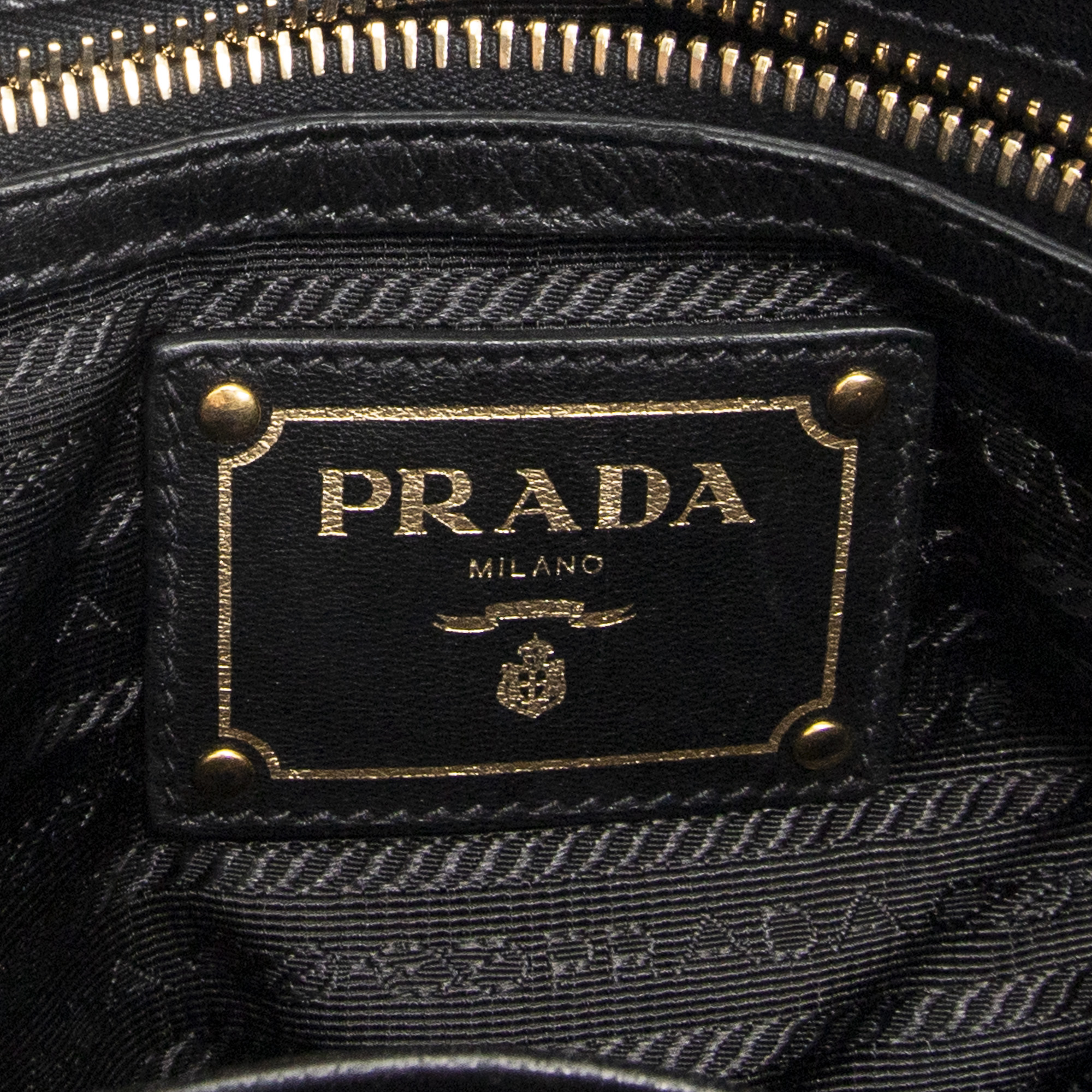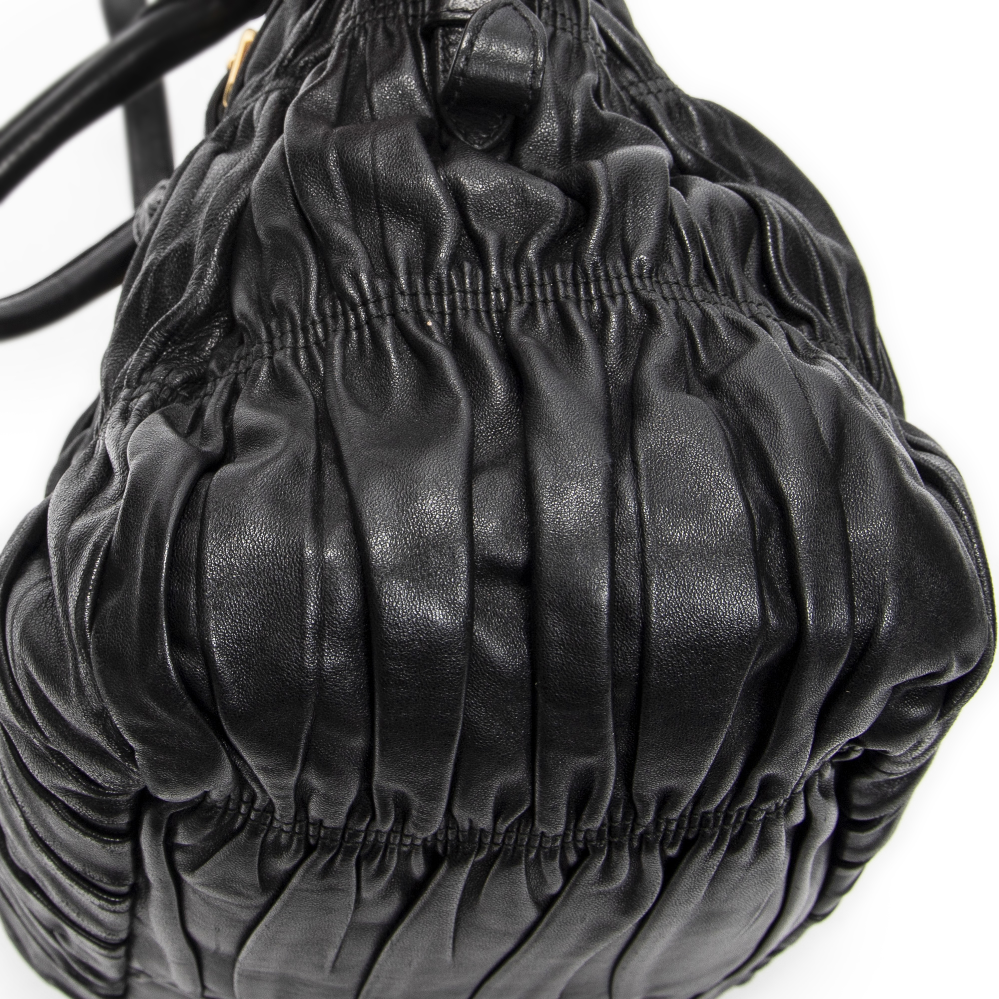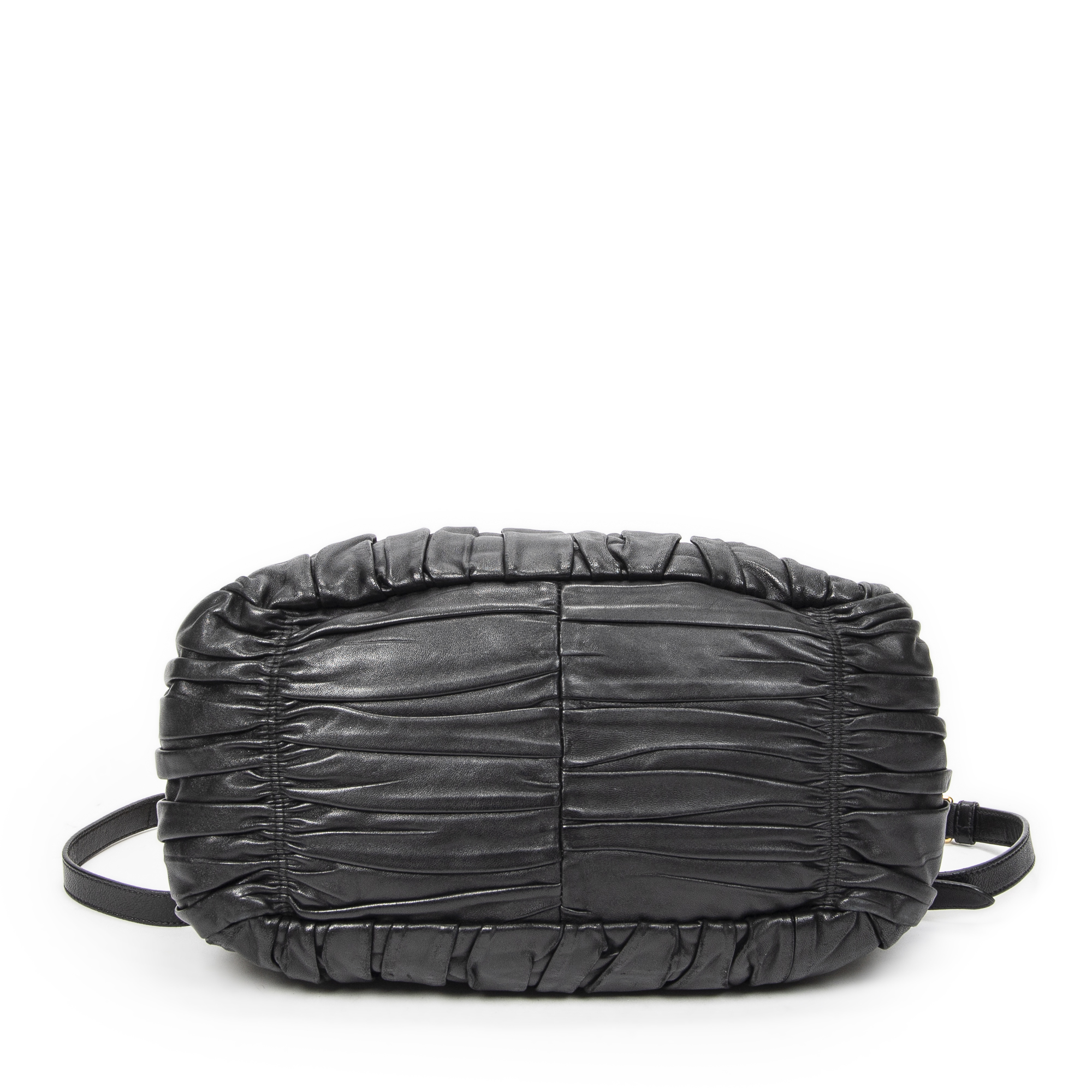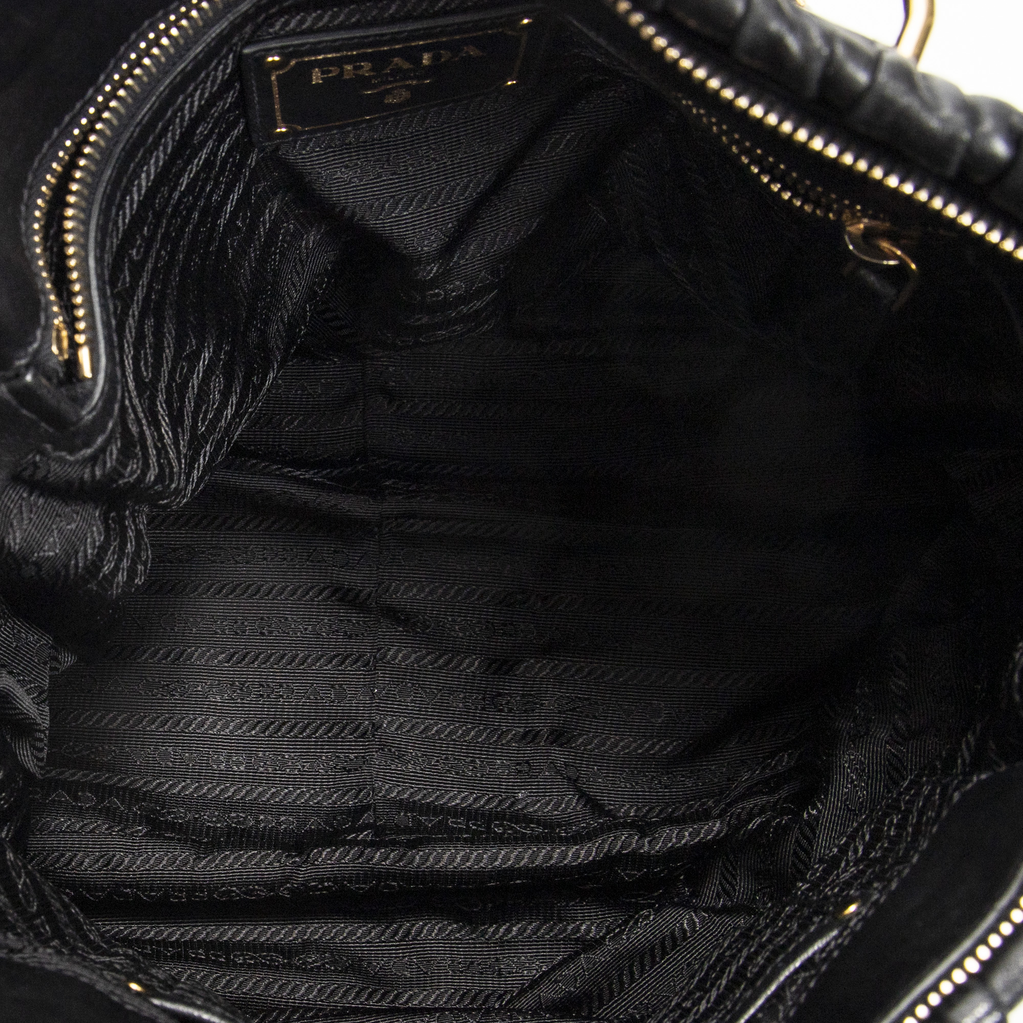 Prada Shoulder Bag Pleated Convertible Buckle Tote in Black Nappa Gaufre Leather and Gold hardware. The product is in Excellent Condition (A).