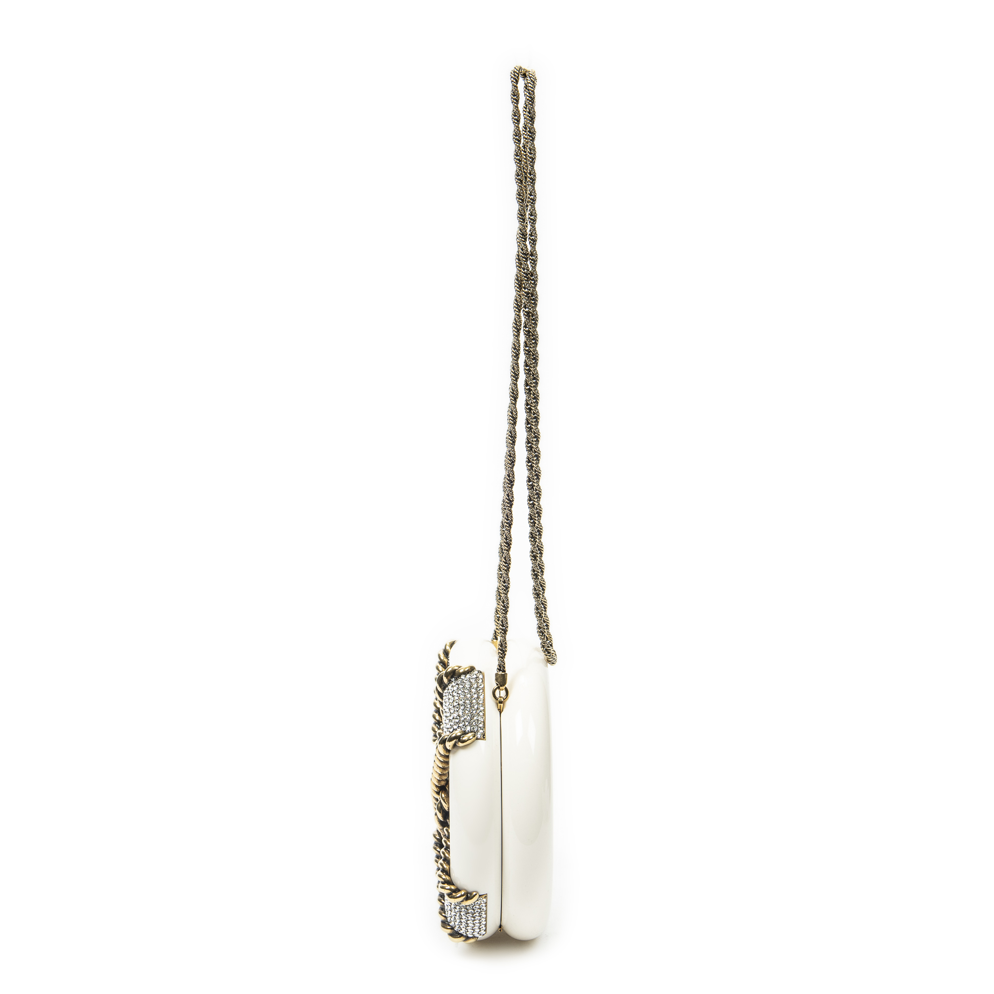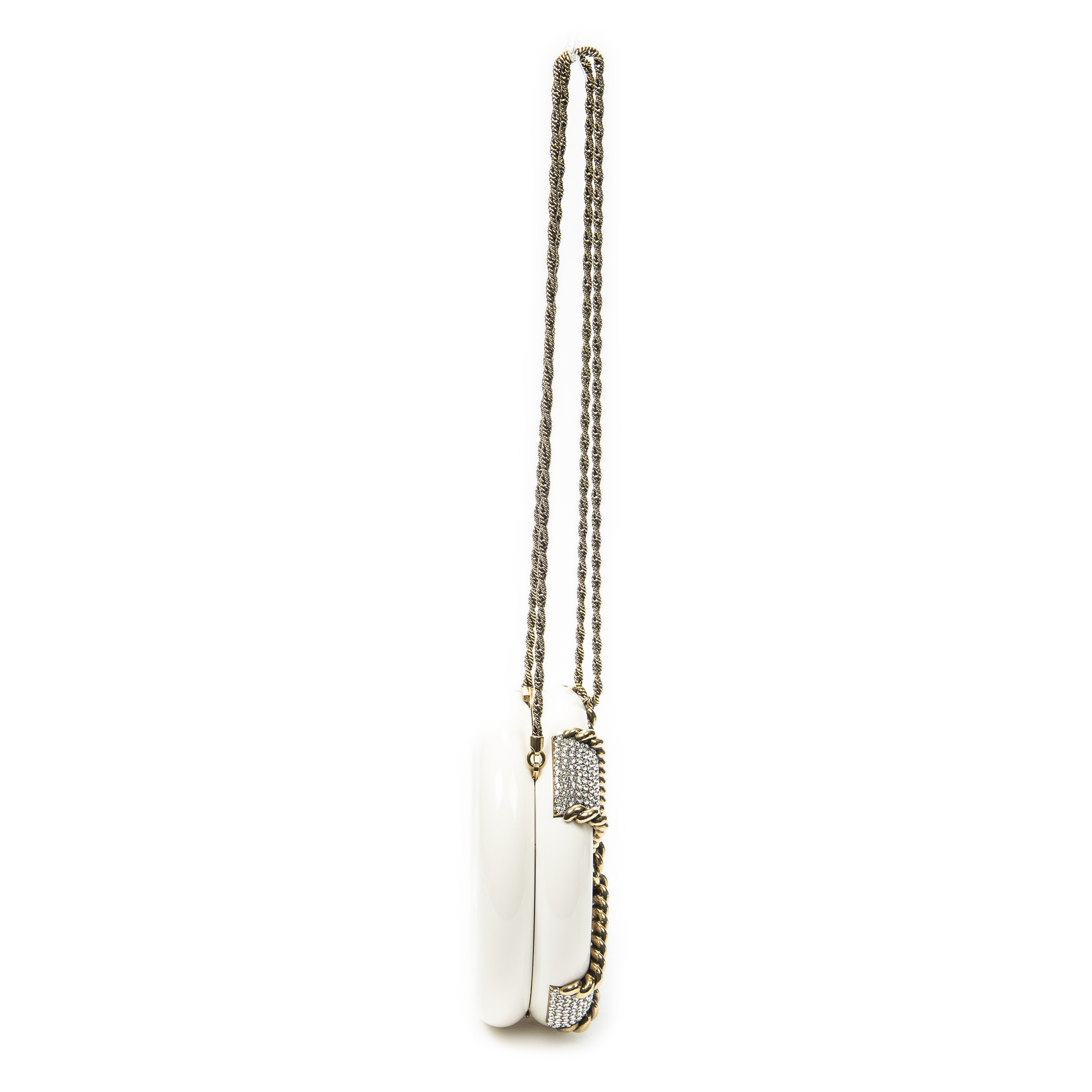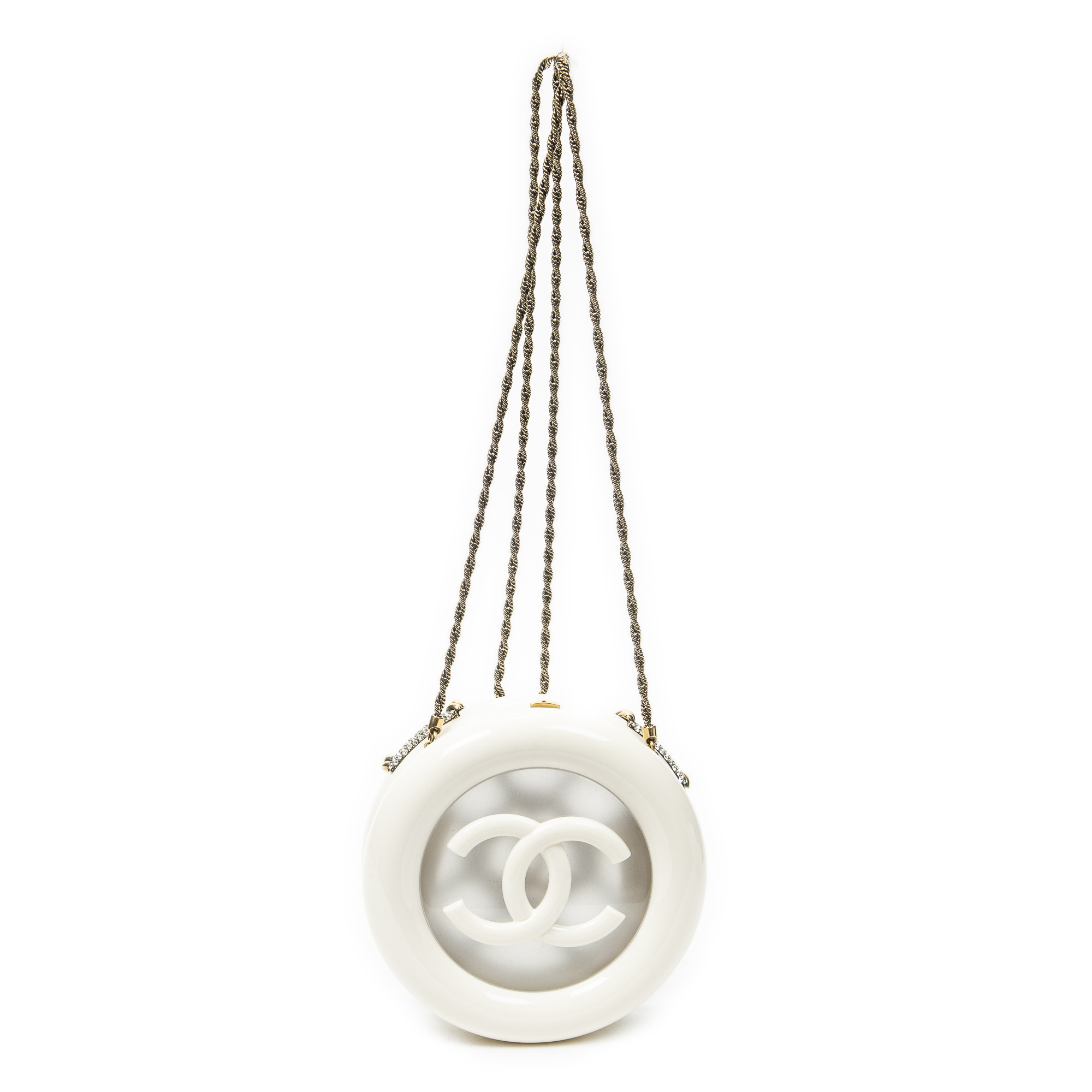 Chanel Shoulder Bag Rescue Wheel Minaudière Bag in White/Gold Resin Canvas and Gold hardware. The product is in Excellent Condition (A).