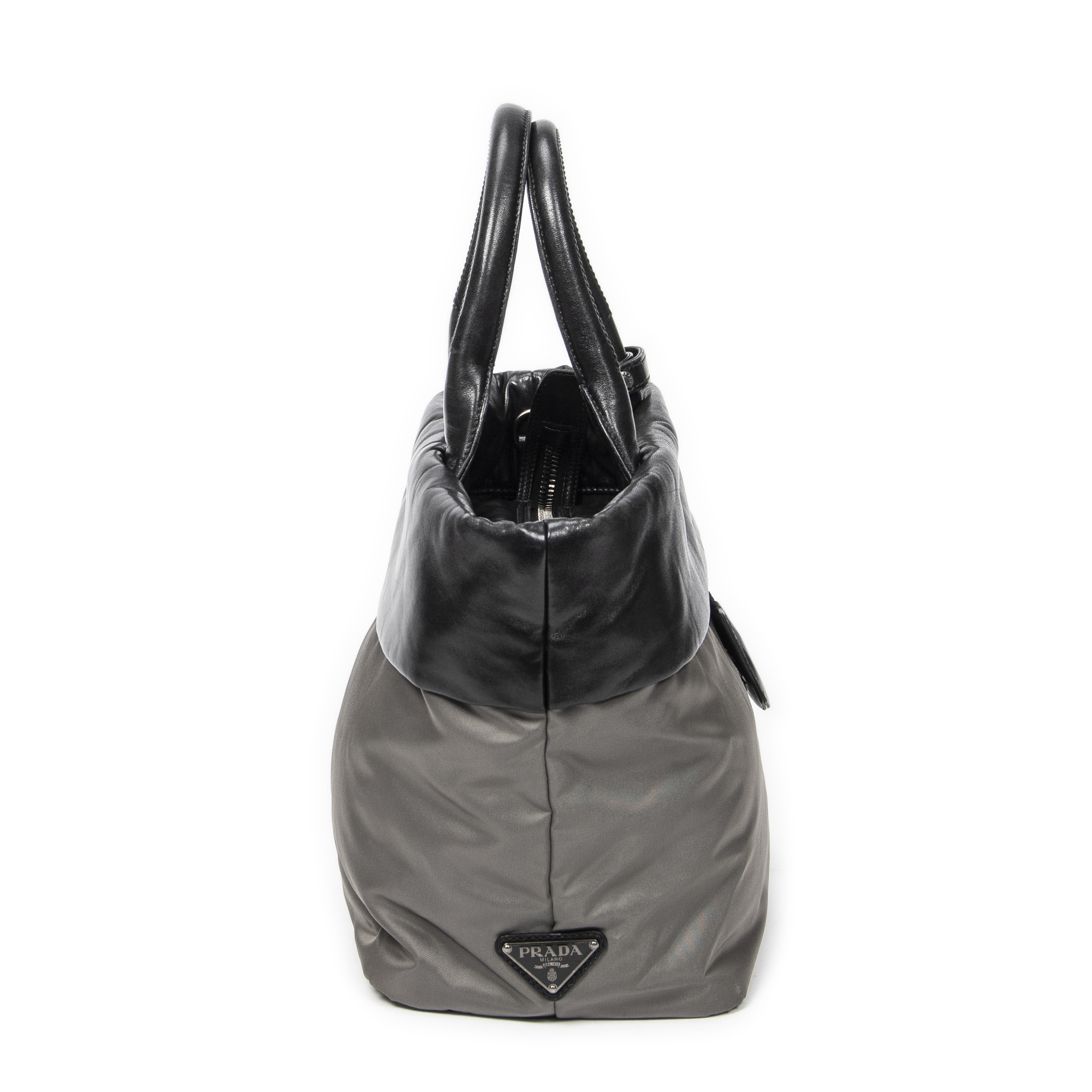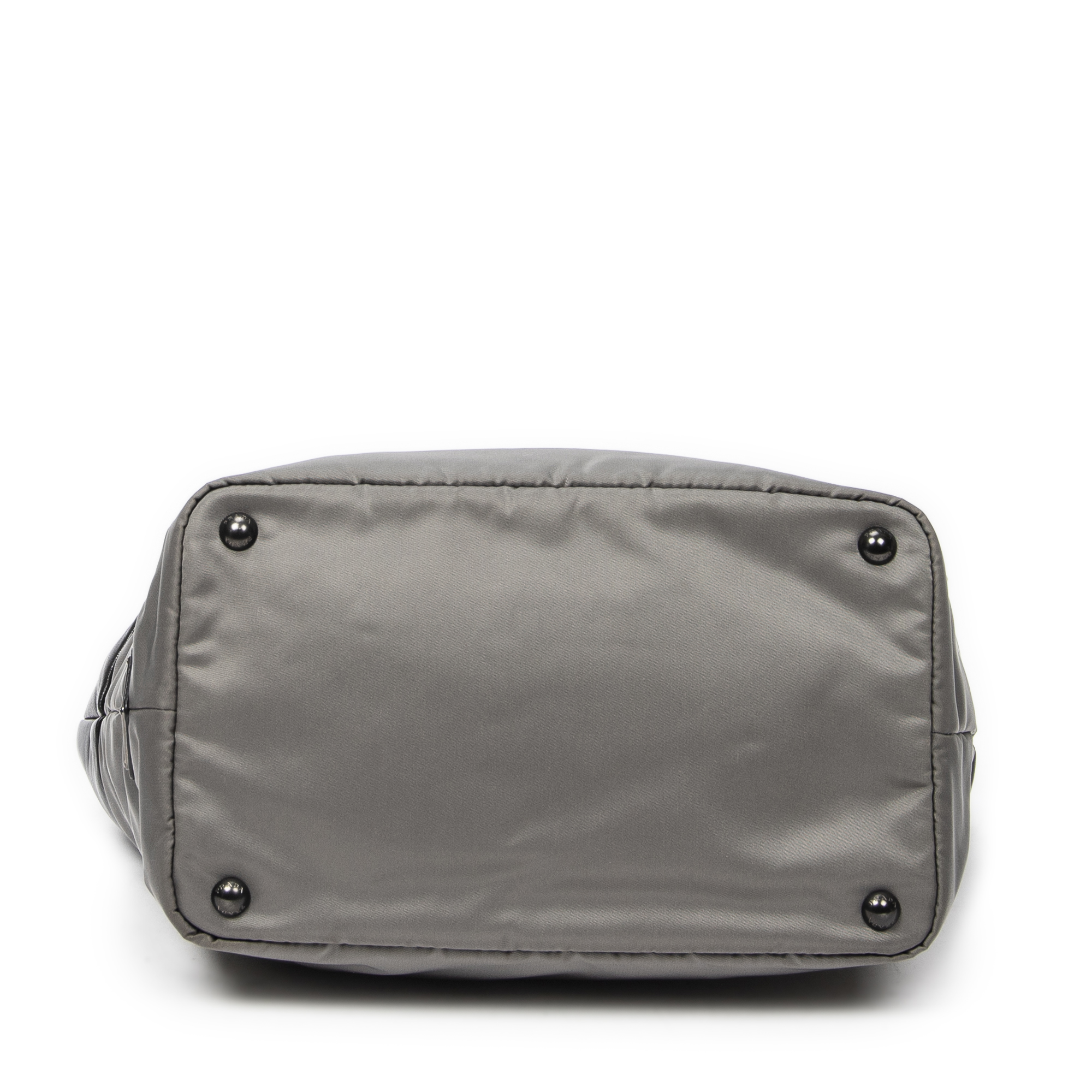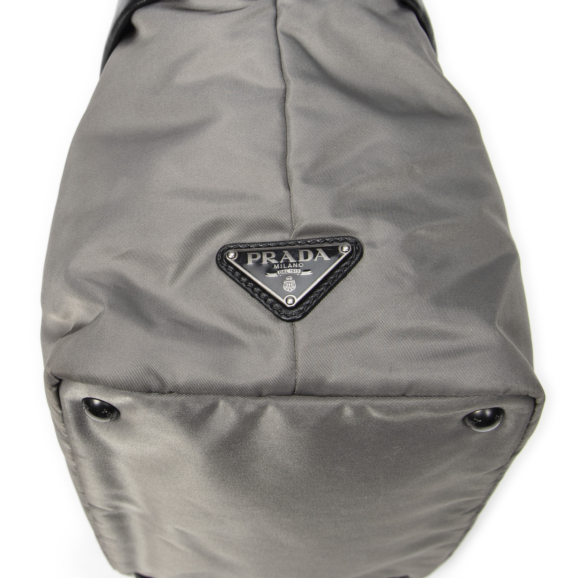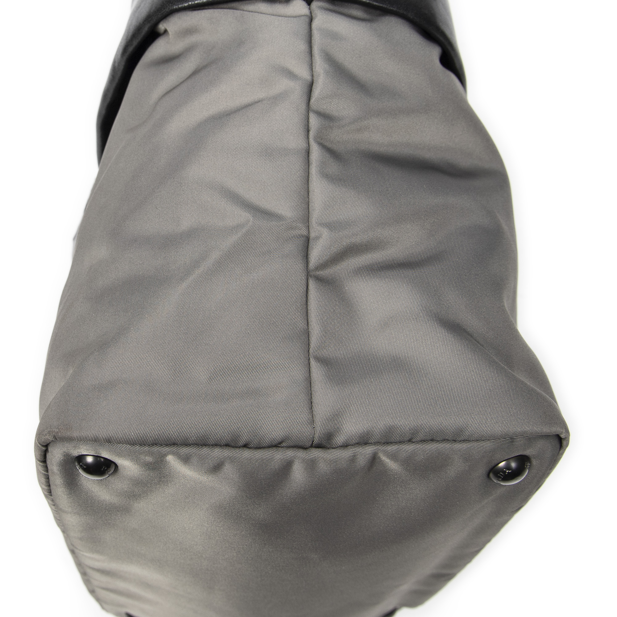 Prada Shoulder Bag Reversible Tote in Grey/Black Nylon Canvas and Aged Brass hardware. The product is in Excellent Condition (A).