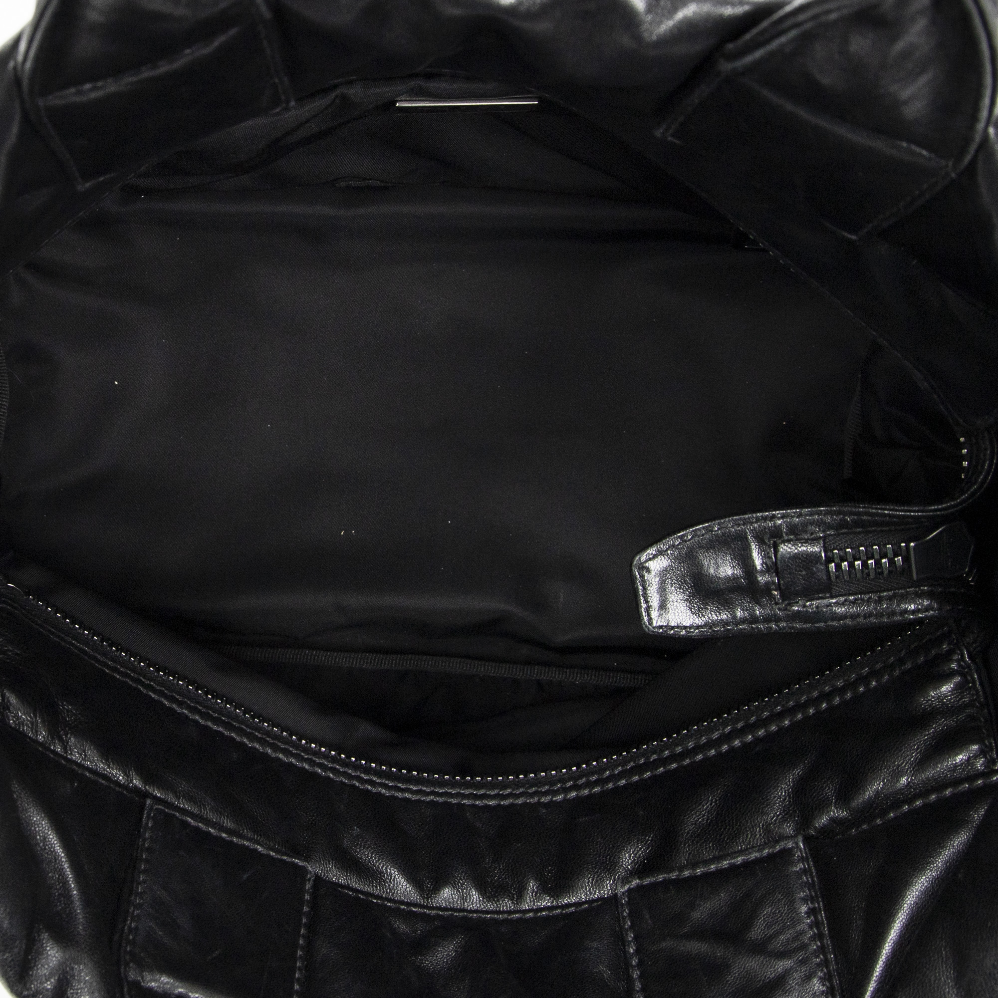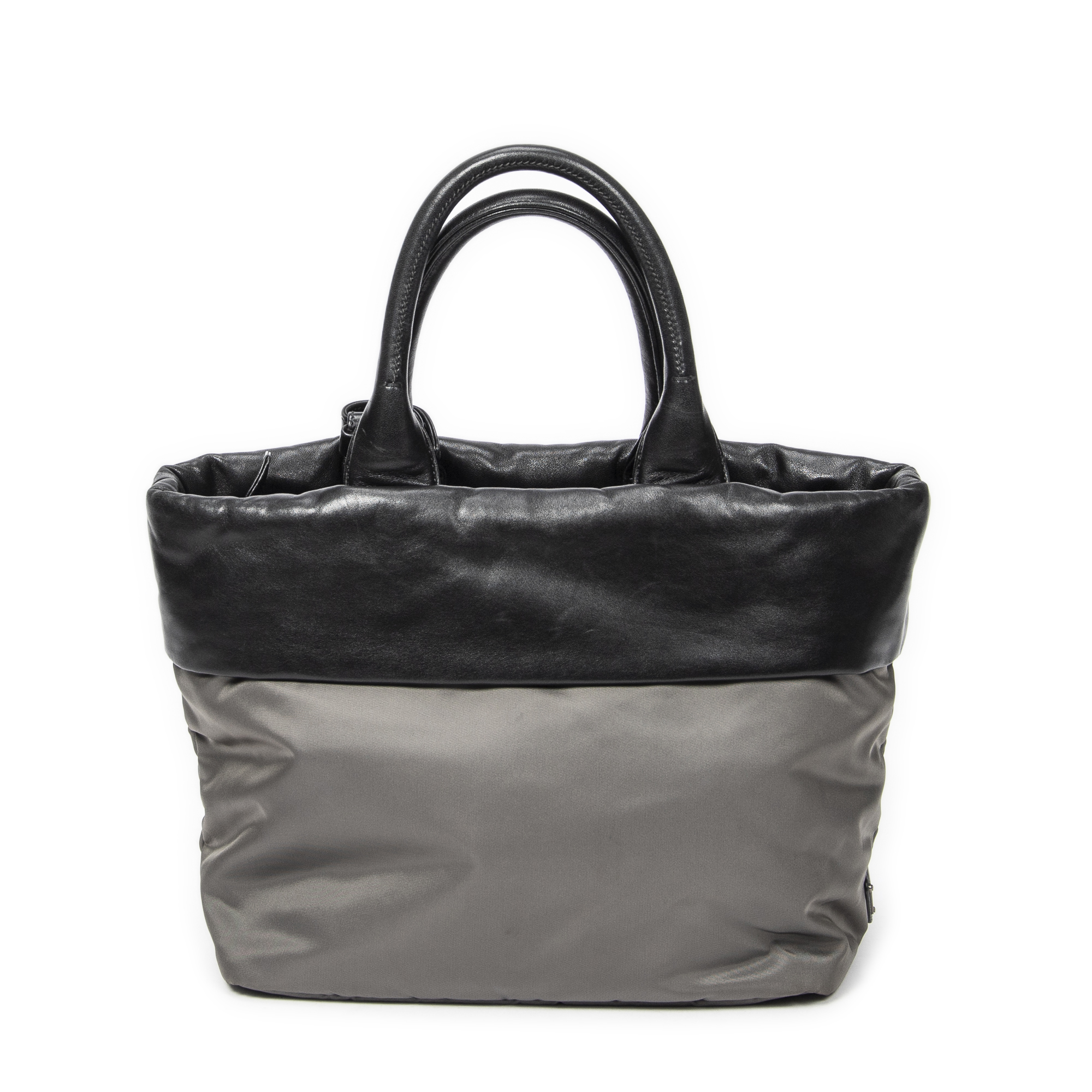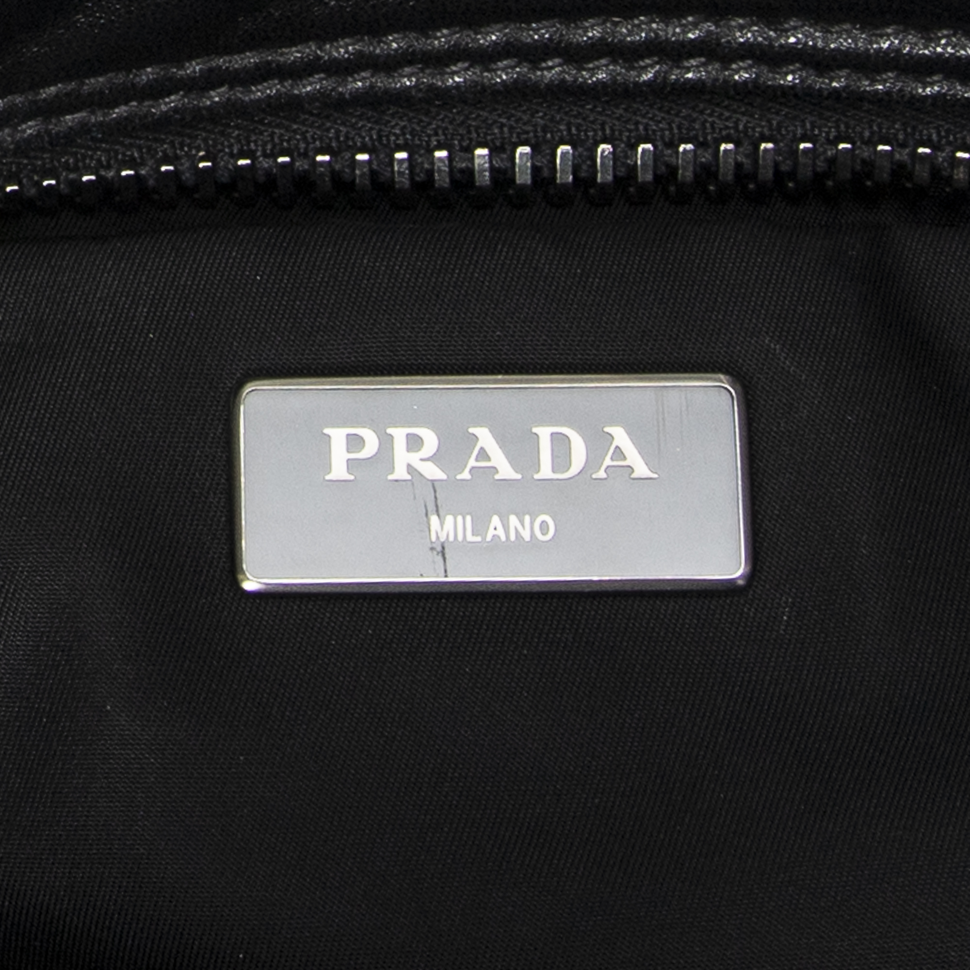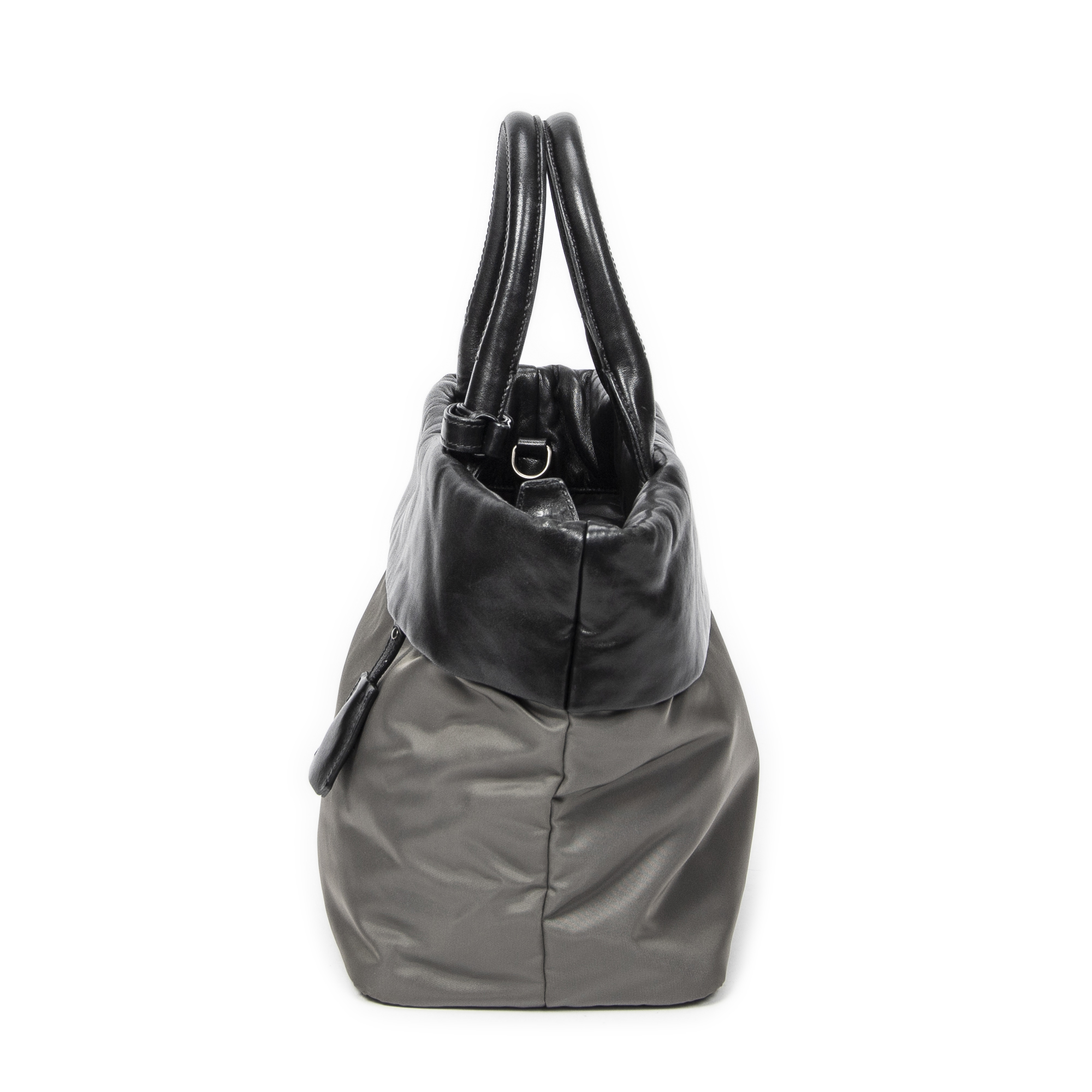 Prada Shoulder Bag Reversible Tote in Grey/Black Nylon Canvas and Aged Brass hardware. The product is in Excellent Condition (A).