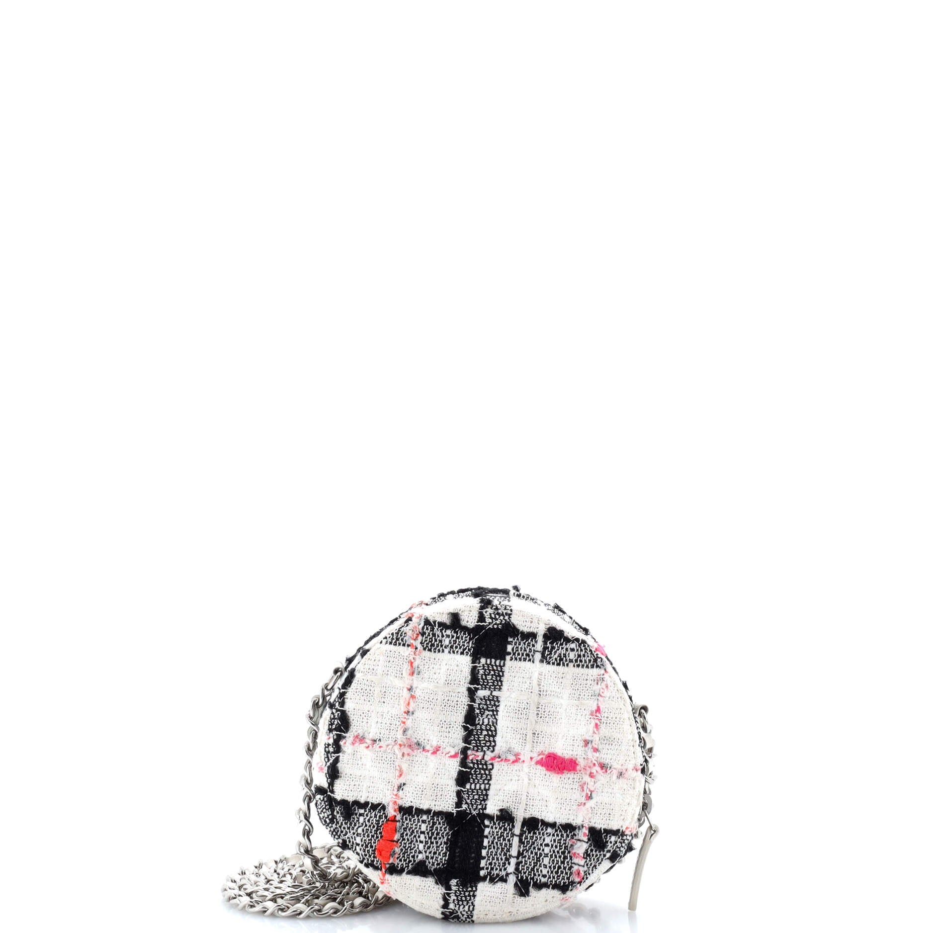 Chanel Shoulder Bag Round Chain Clutch Mini in White/Black/Red Tweed Quilted Canvas and Silver hardware. The product is in Excellent Condition (A).