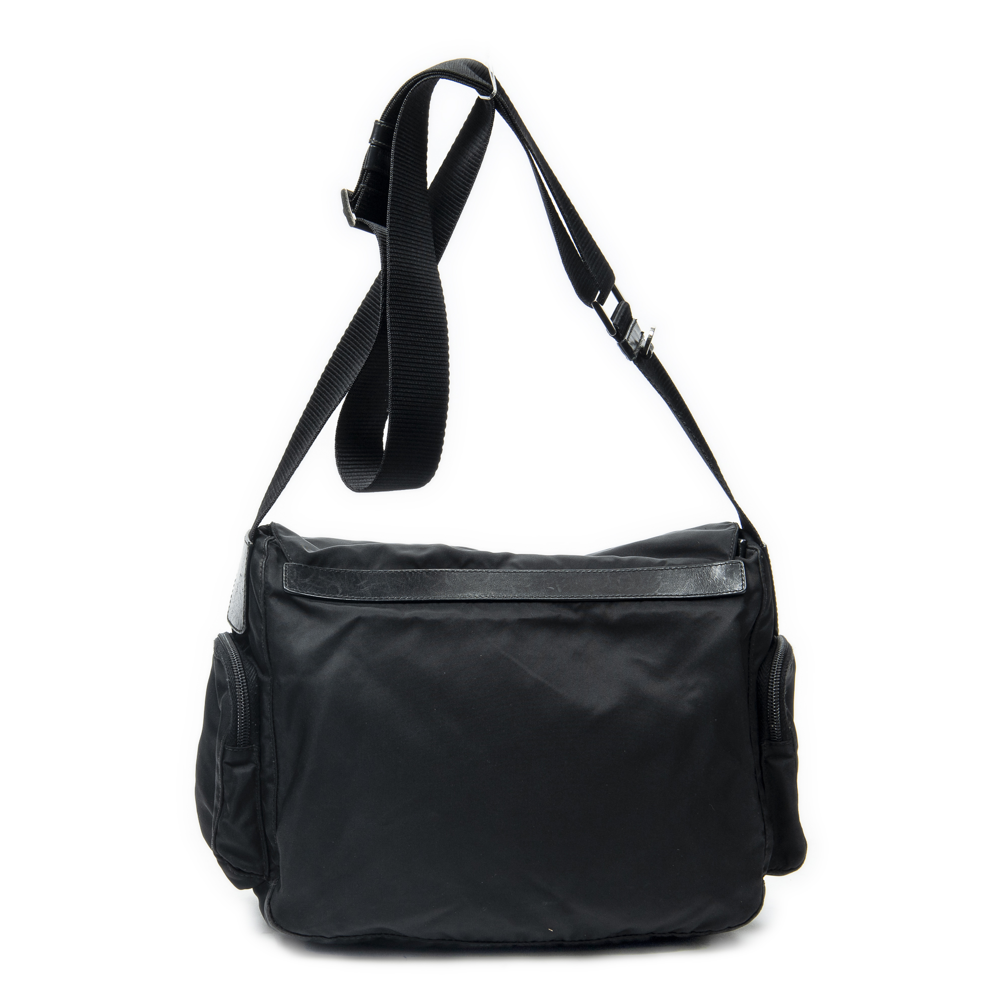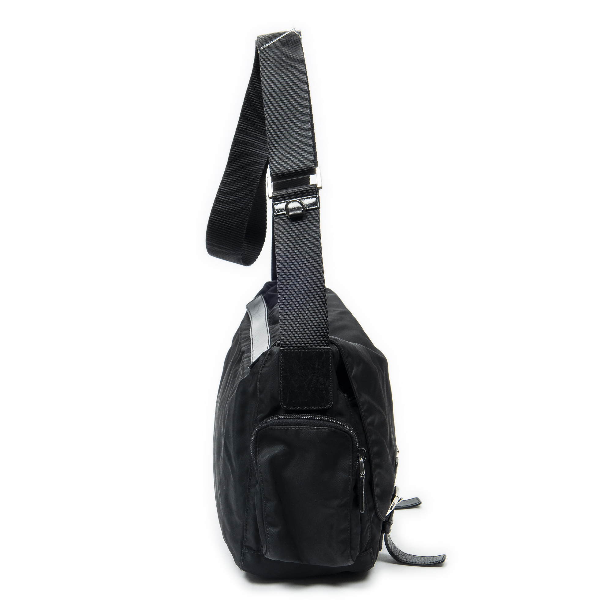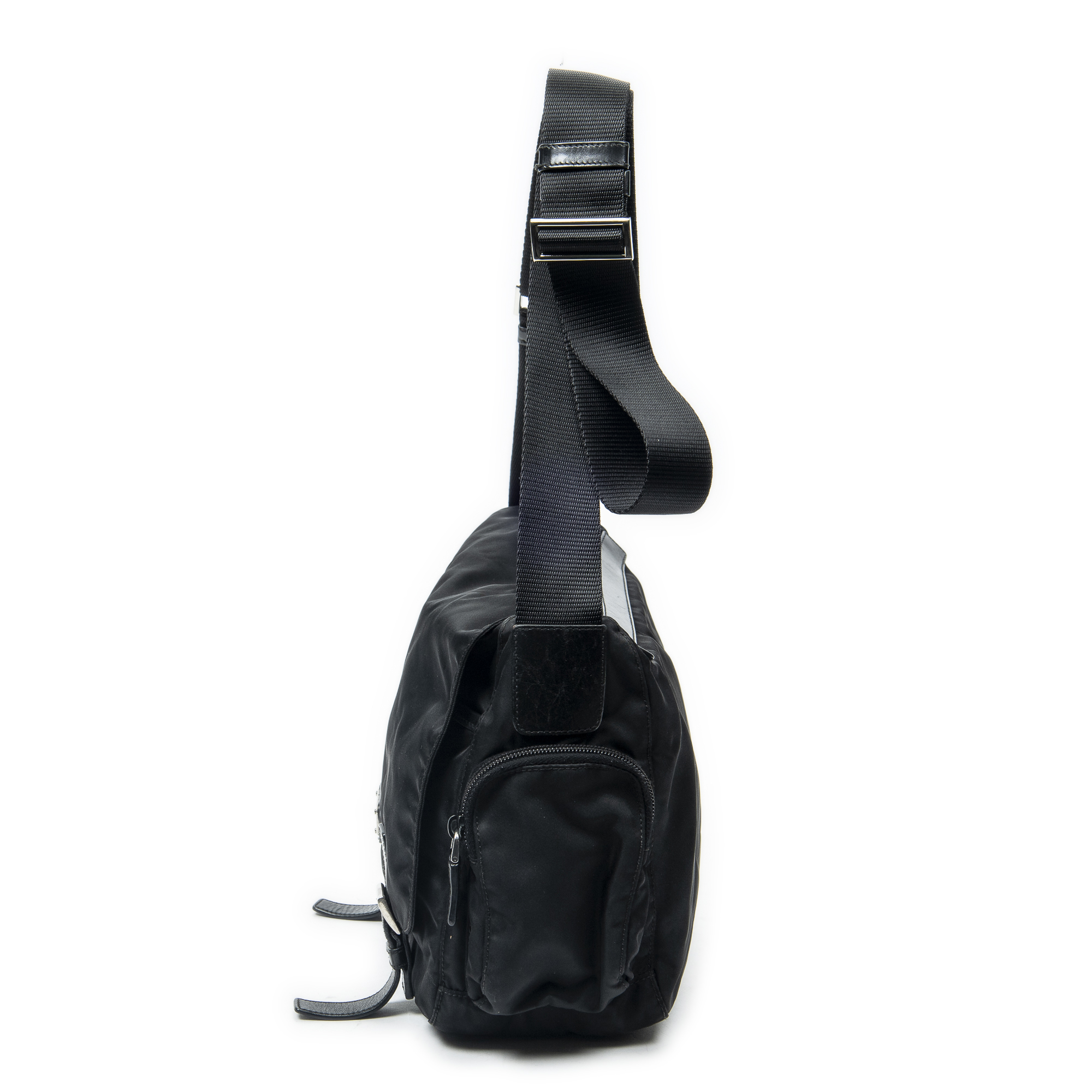 Prada Shoulder Bag Side Pocket Buckle Flap Messenger in Black Nylon Canvas and Silver hardware. The product is in Excellent Condition (A).