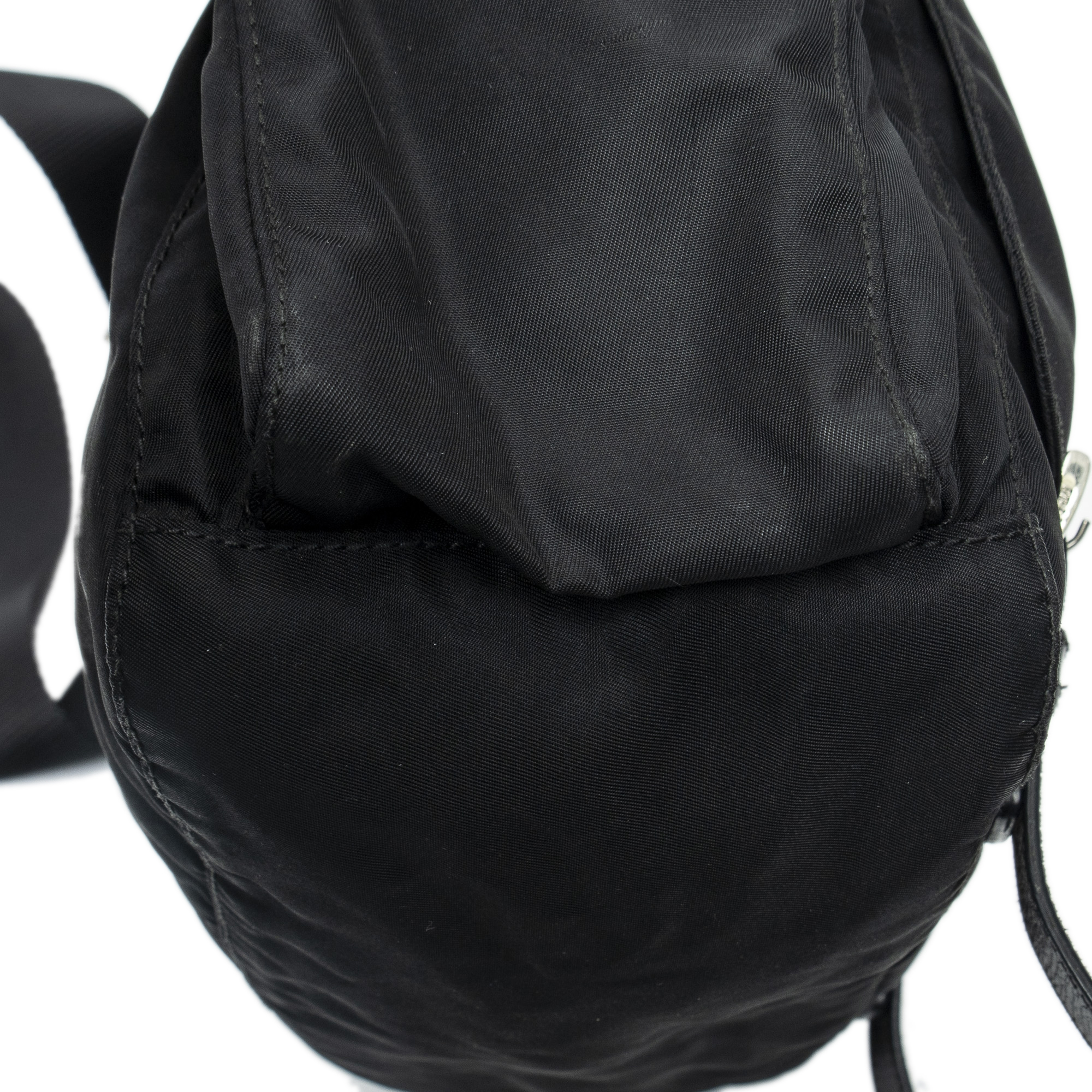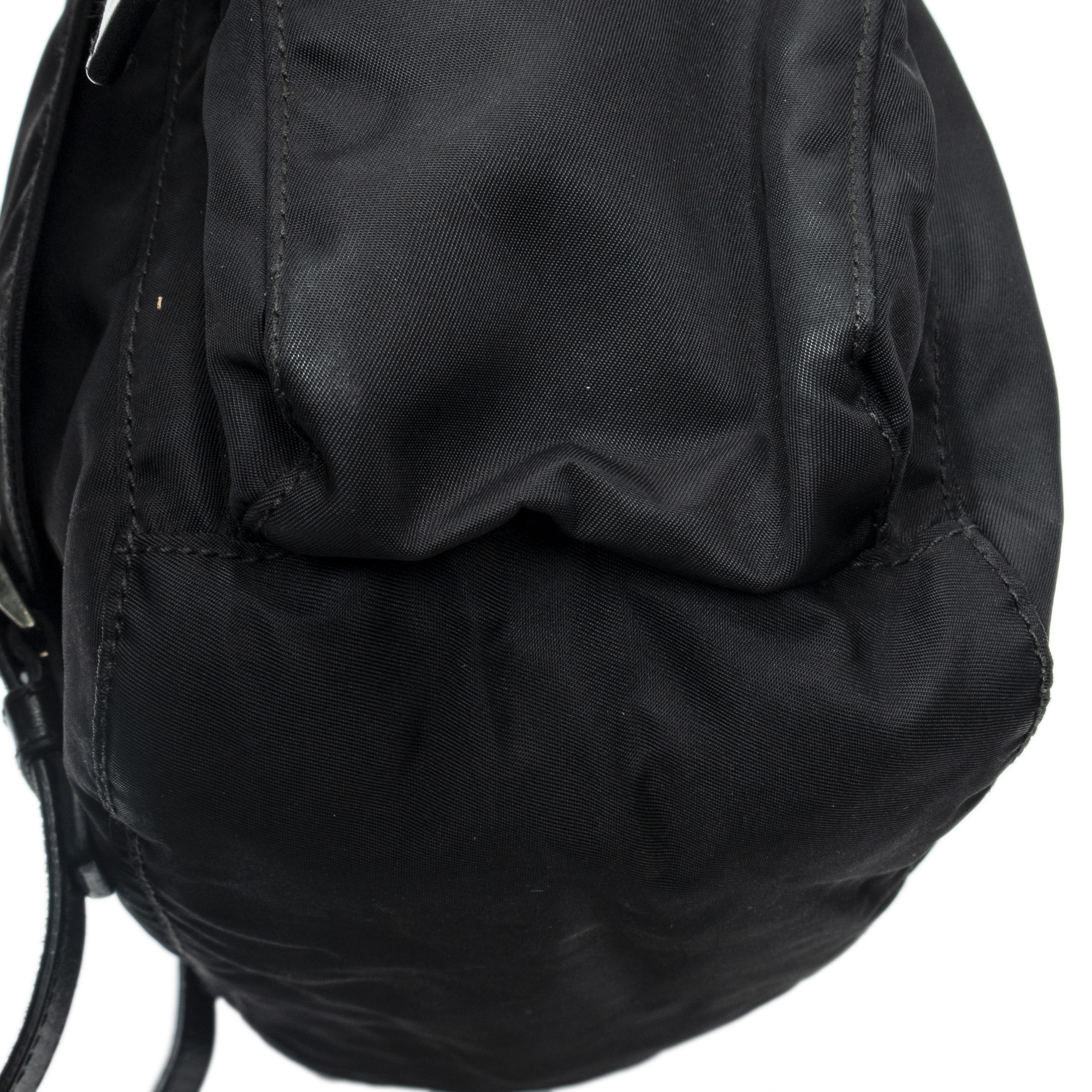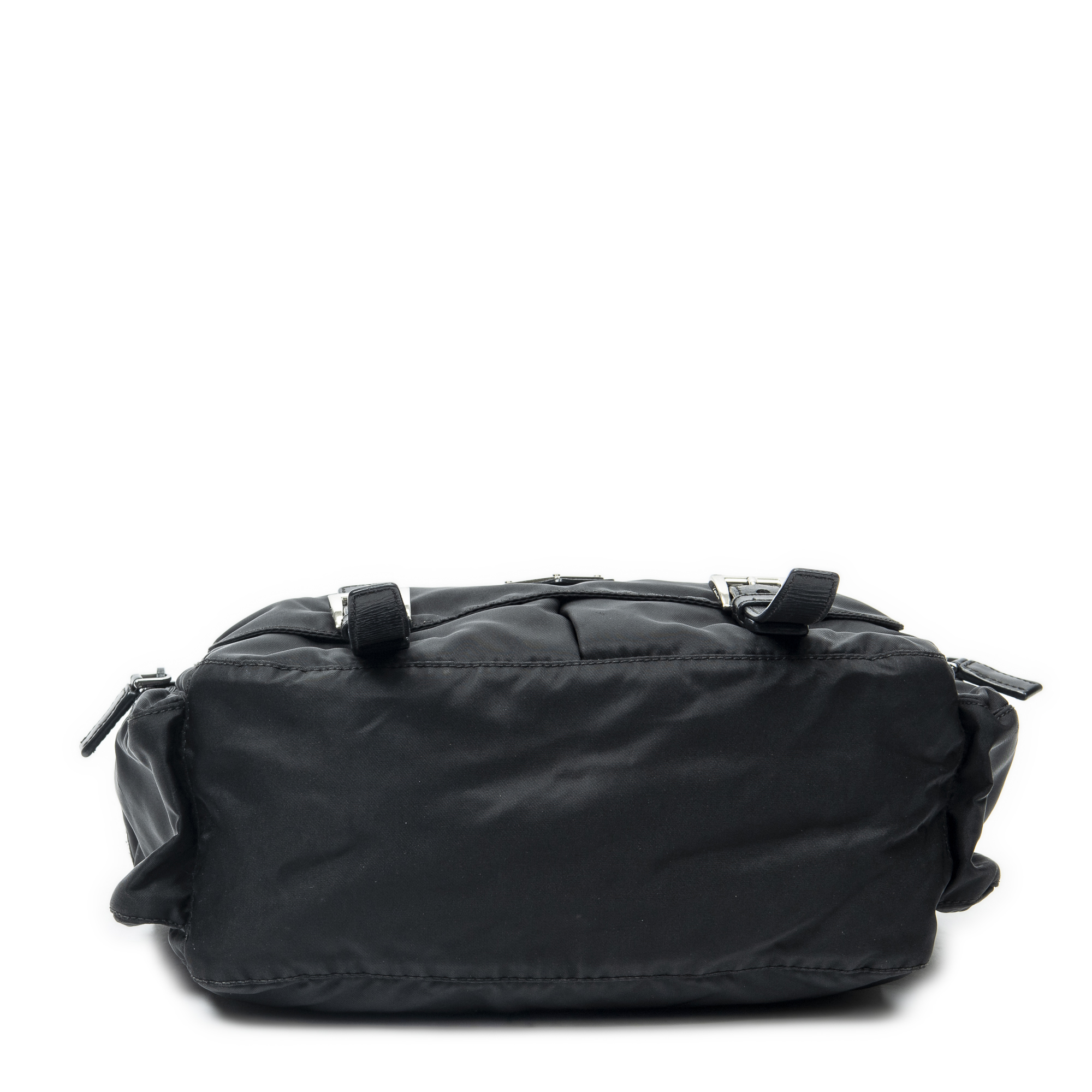Prada Shoulder Bag Side Pocket Buckle Flap Messenger in Black Nylon Canvas and Silver hardware. The product is in Excellent Condition (A).