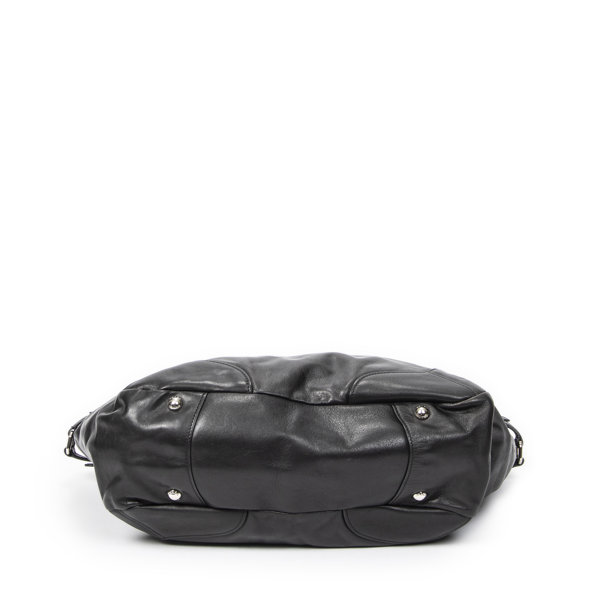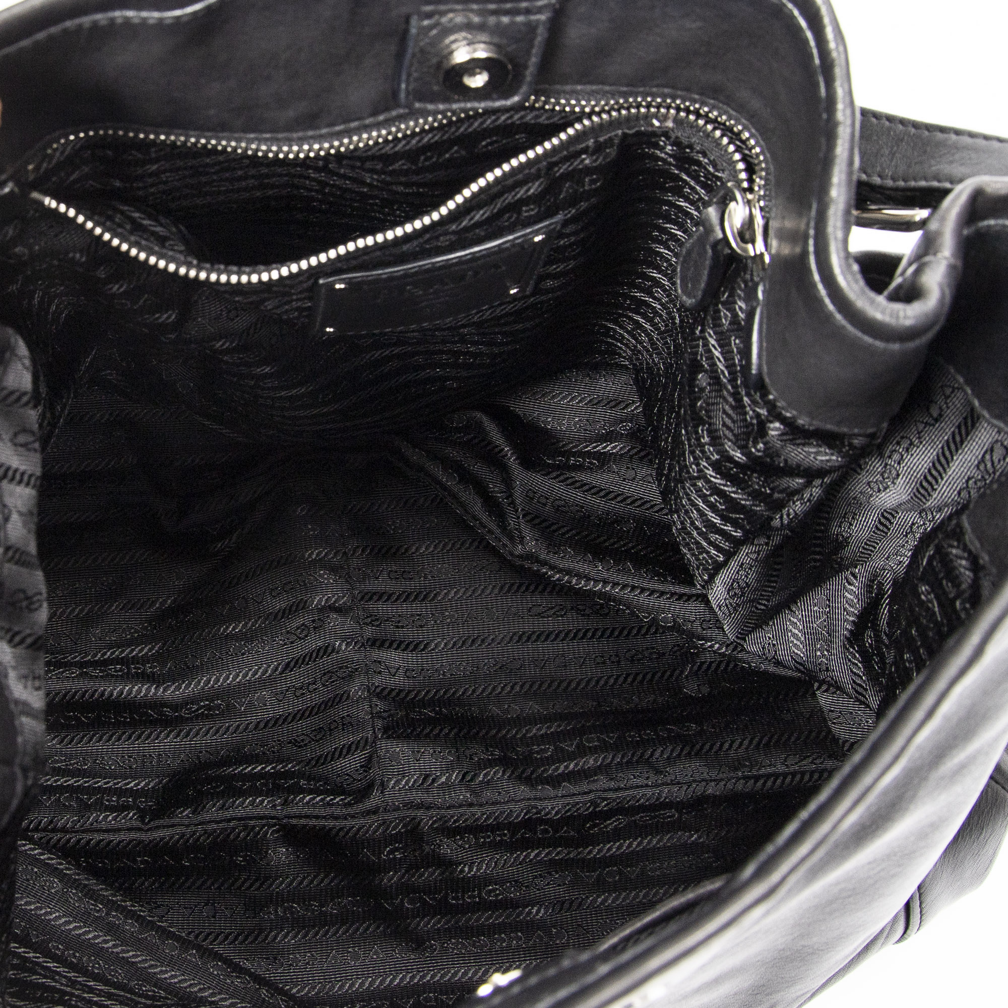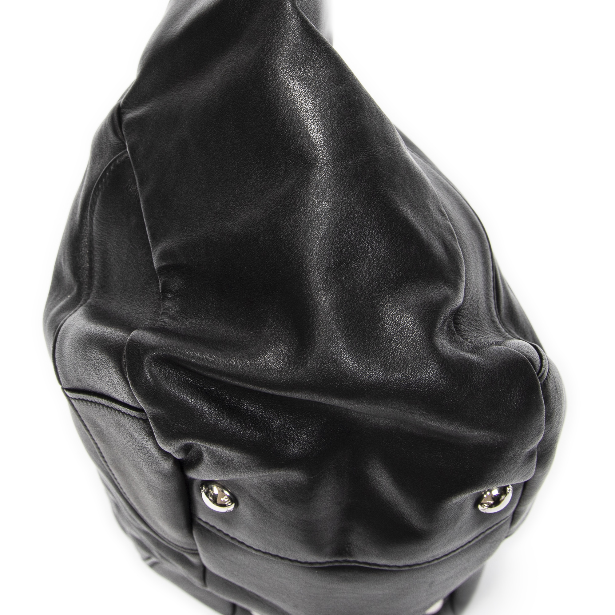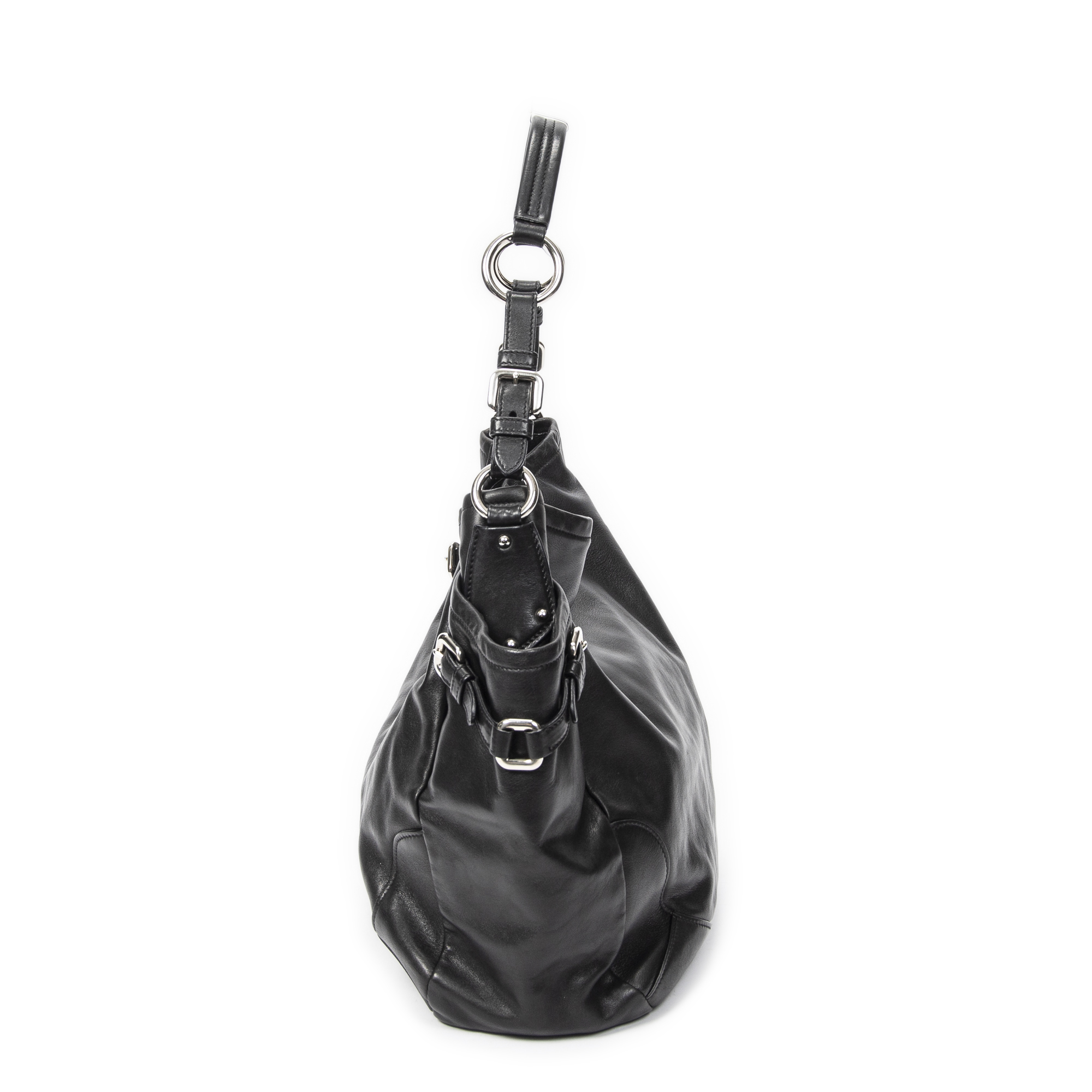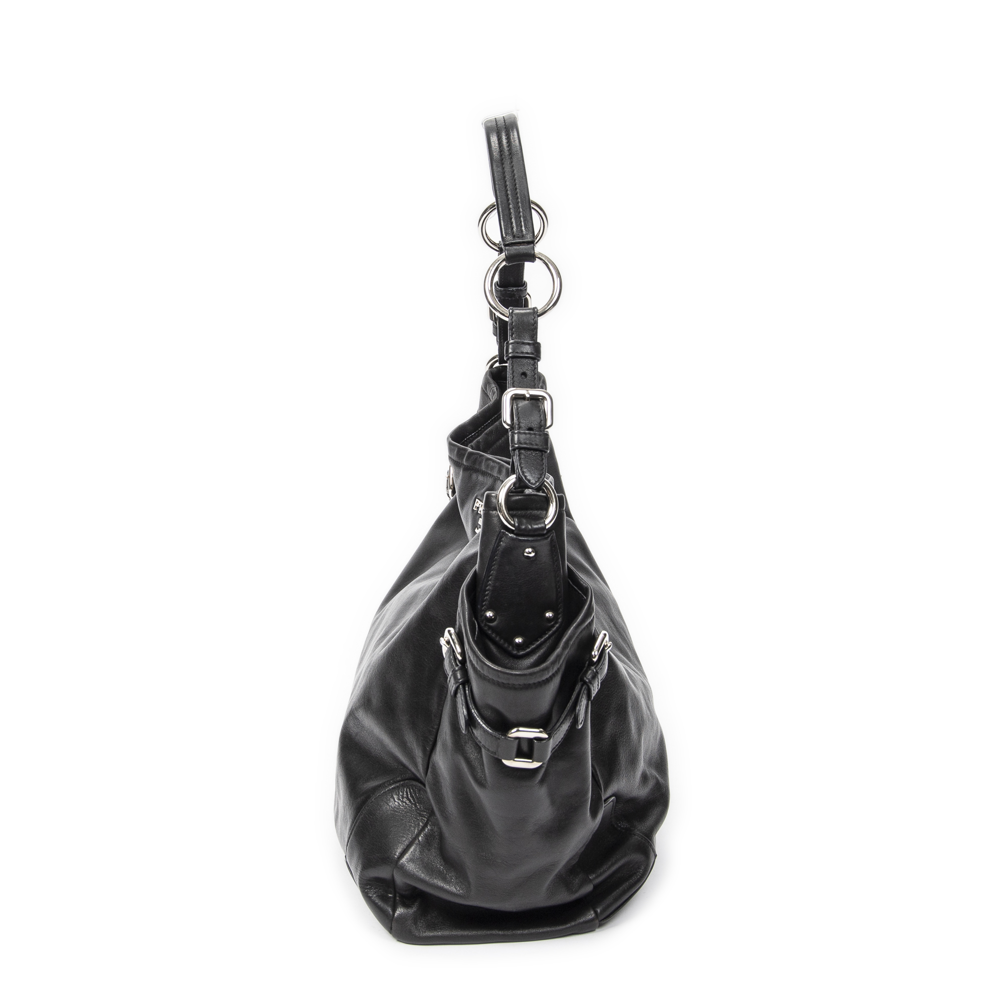 Prada Shoulder Bag Side Pocket Buckle Hobo in Black Calfskin Leather and Silver hardware. The product is in Excellent Condition (A).