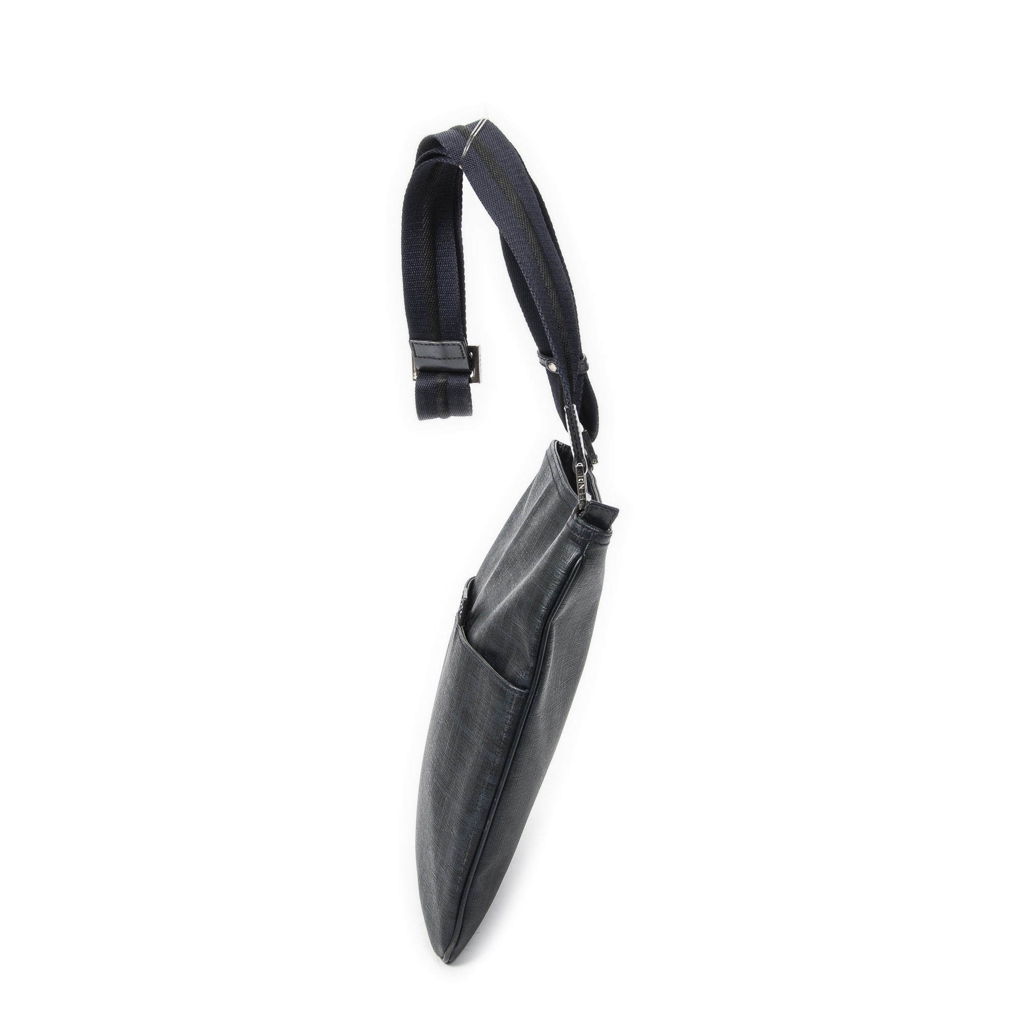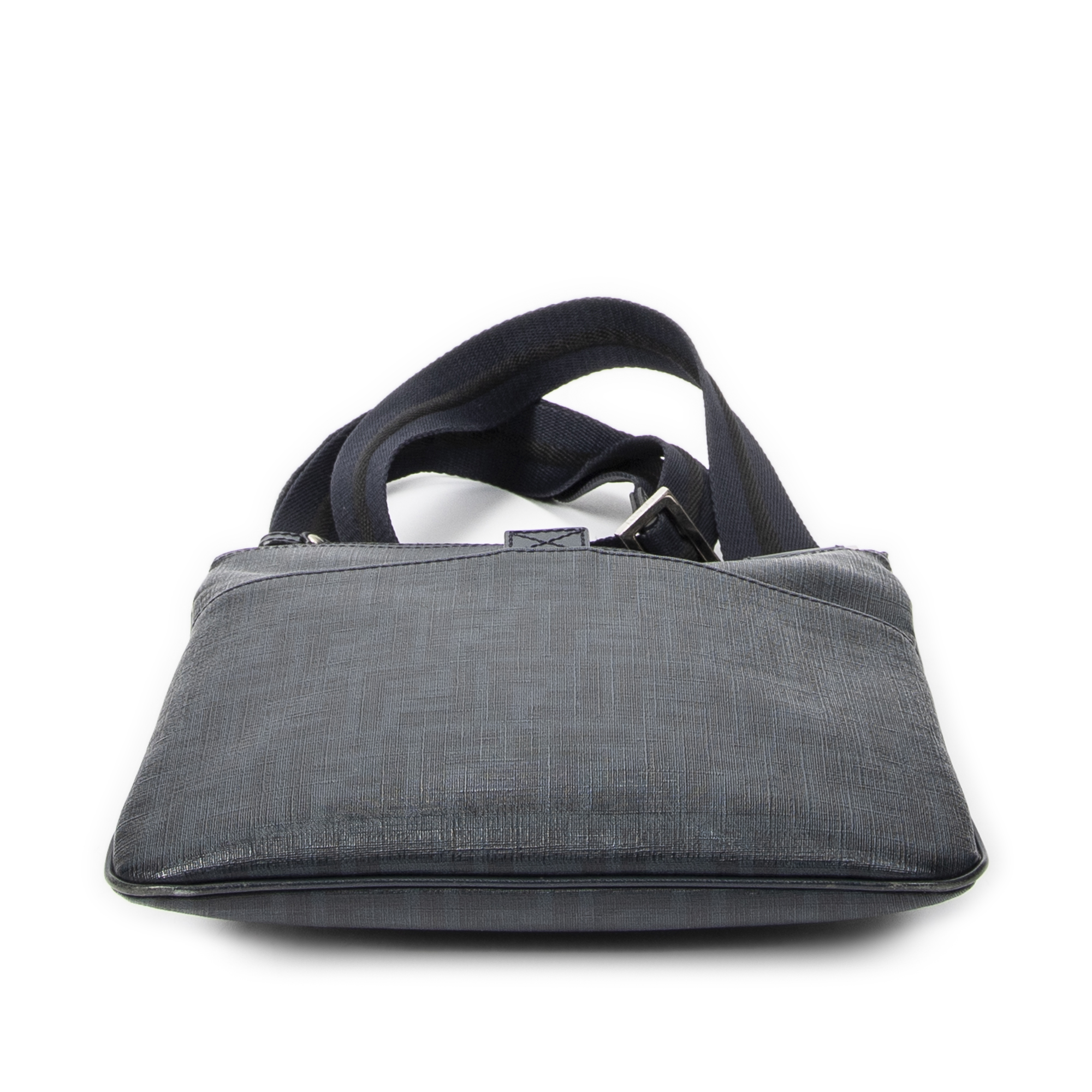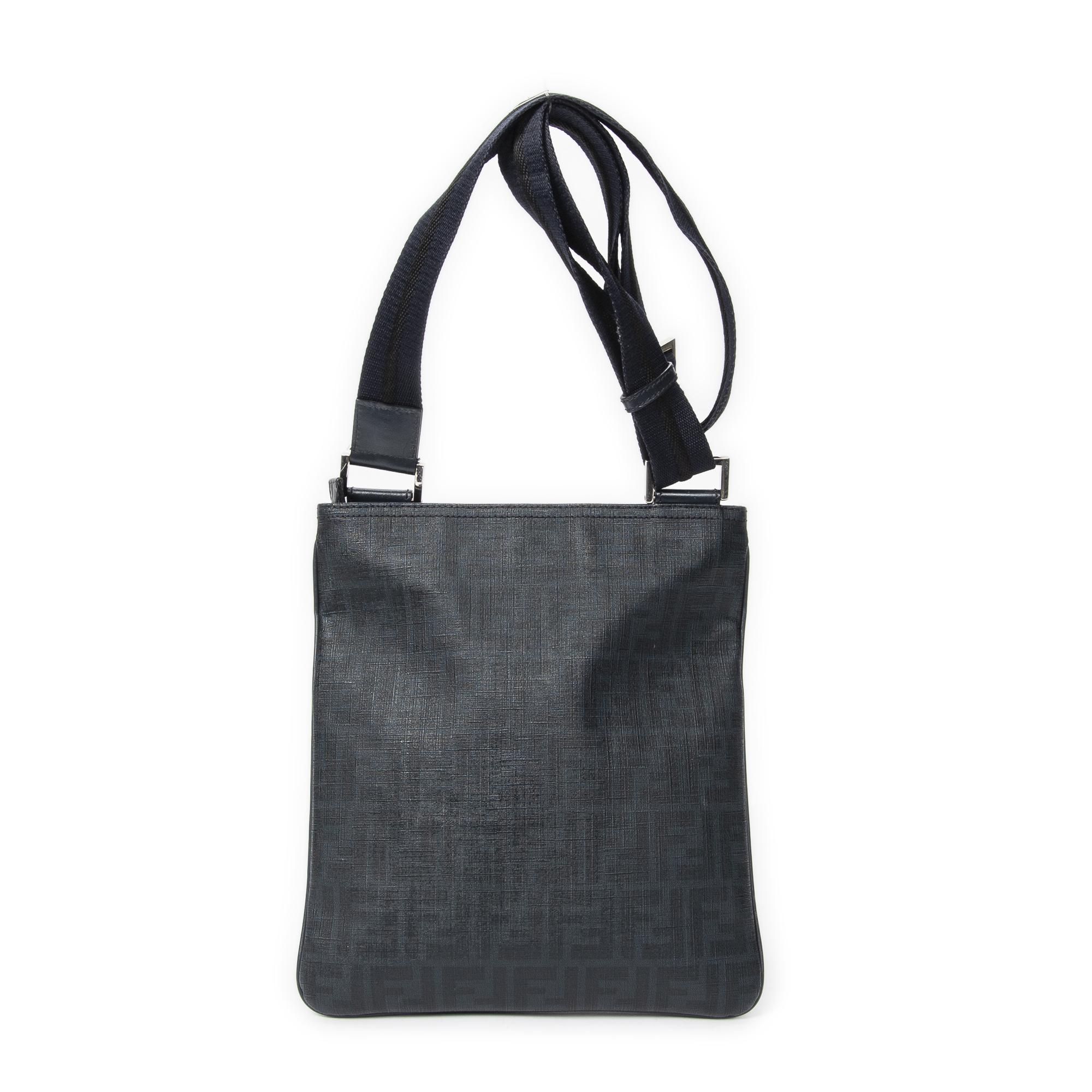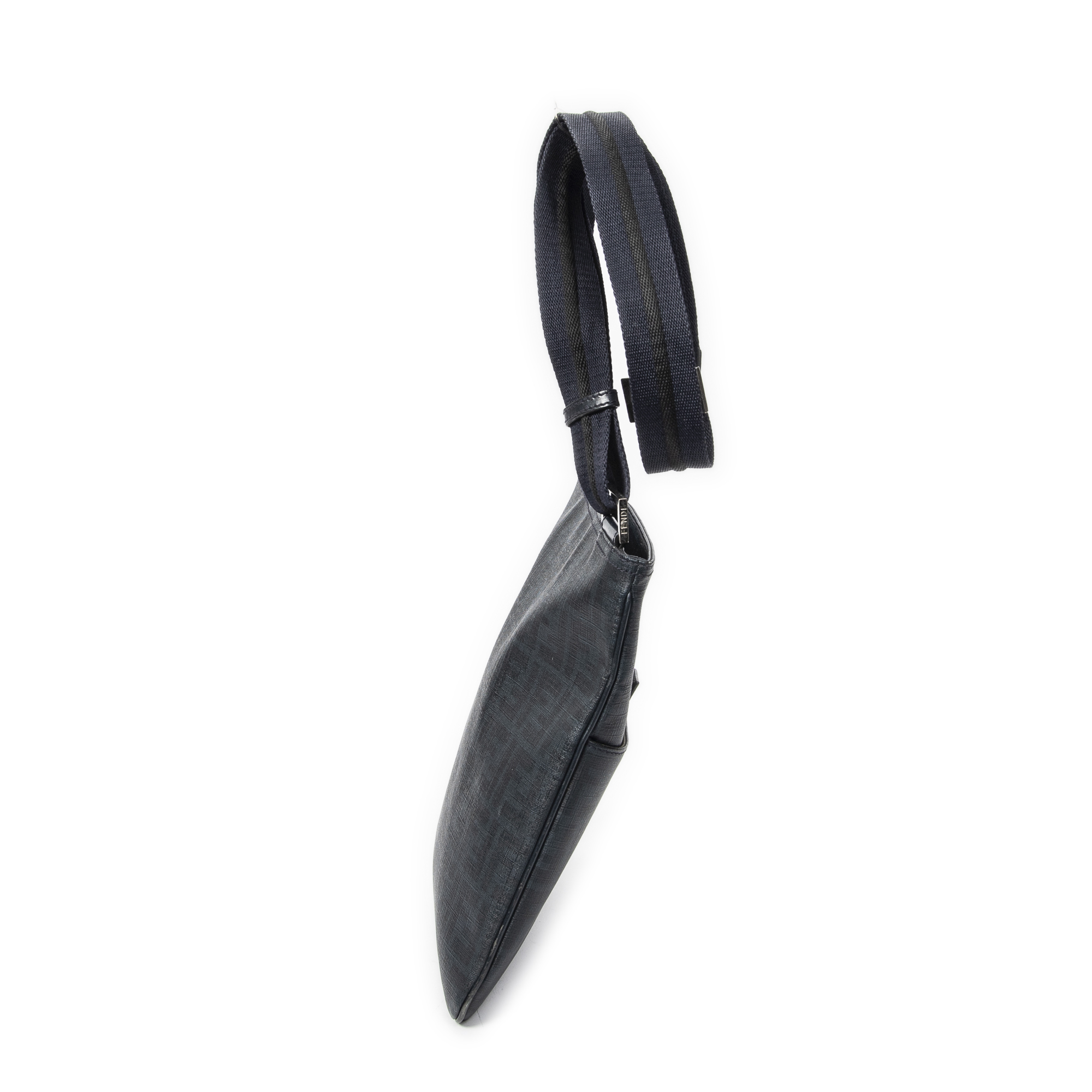 Fendi Shoulder Bag Slip Pocket Flat Messenger in Navy Zucca Coated Canvas and Silver hardware. The product is in Excellent Condition (A).