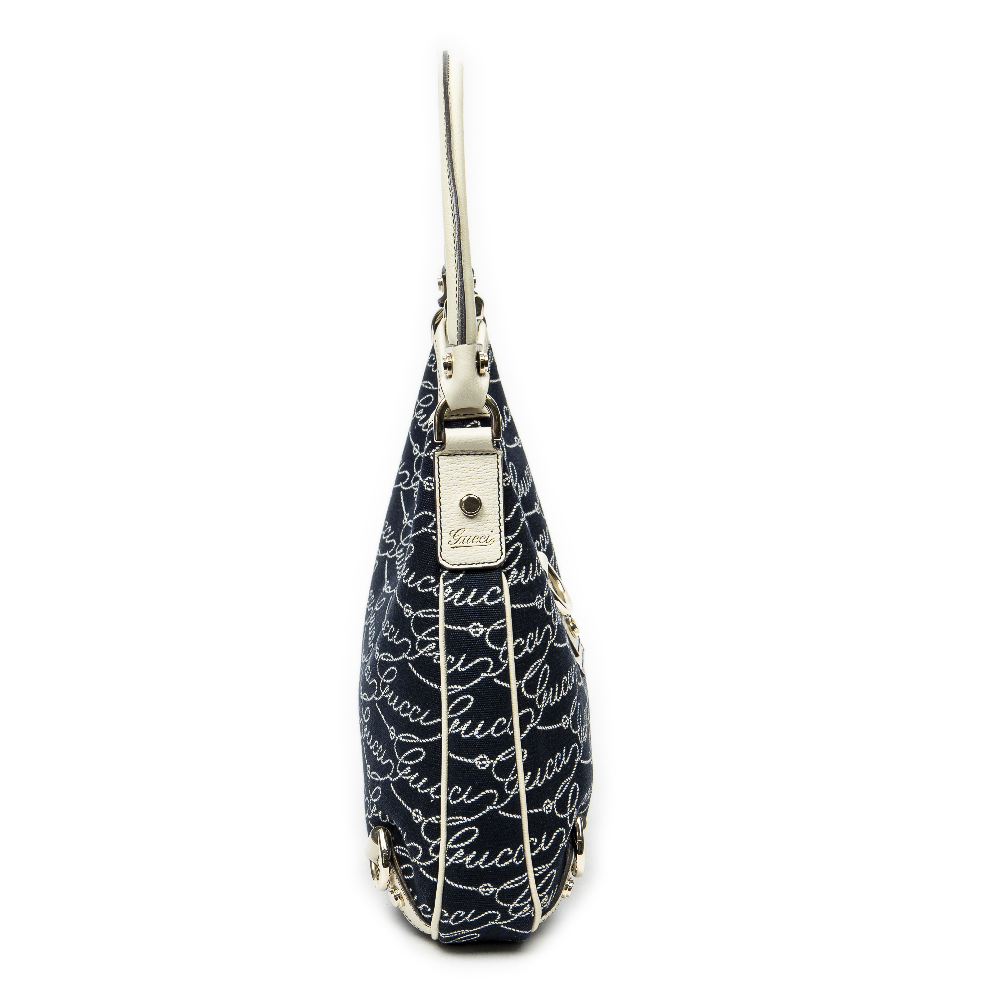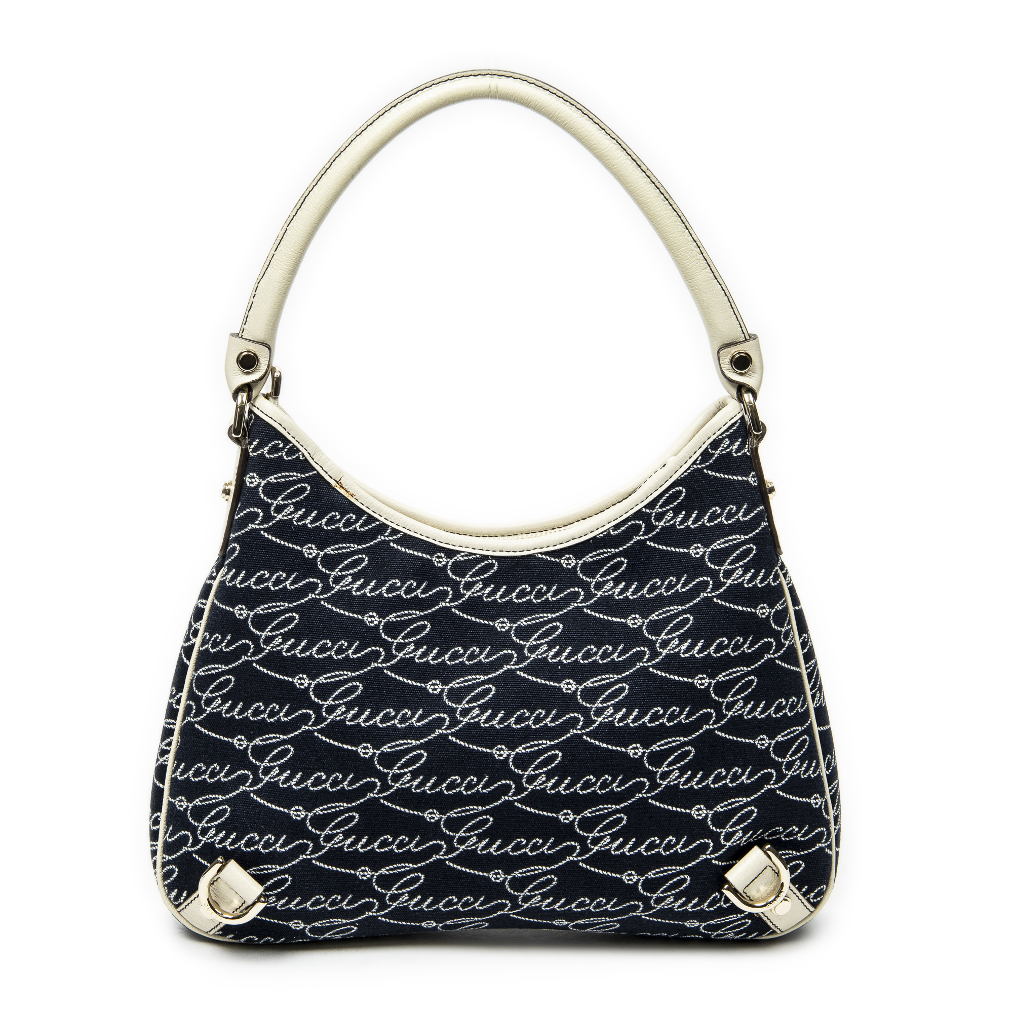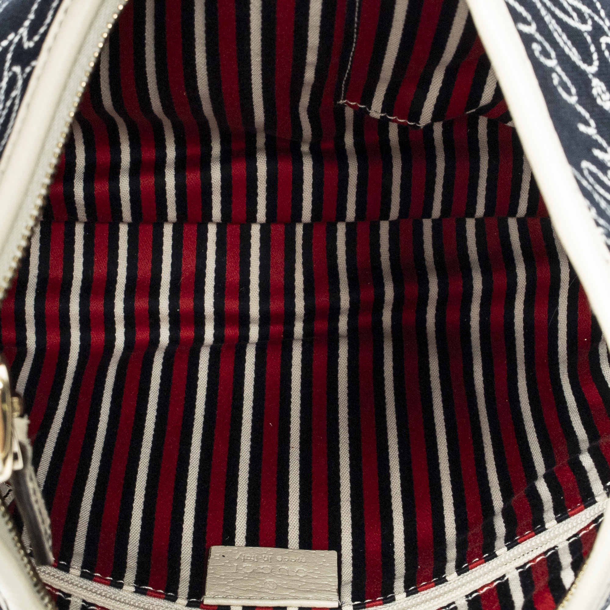 Gucci Shoulder Bag Small Abbey D-Ring Hobo in Navy/Ivory White Script Canvas and Gold hardware. The product is in Excellent Condition (A).