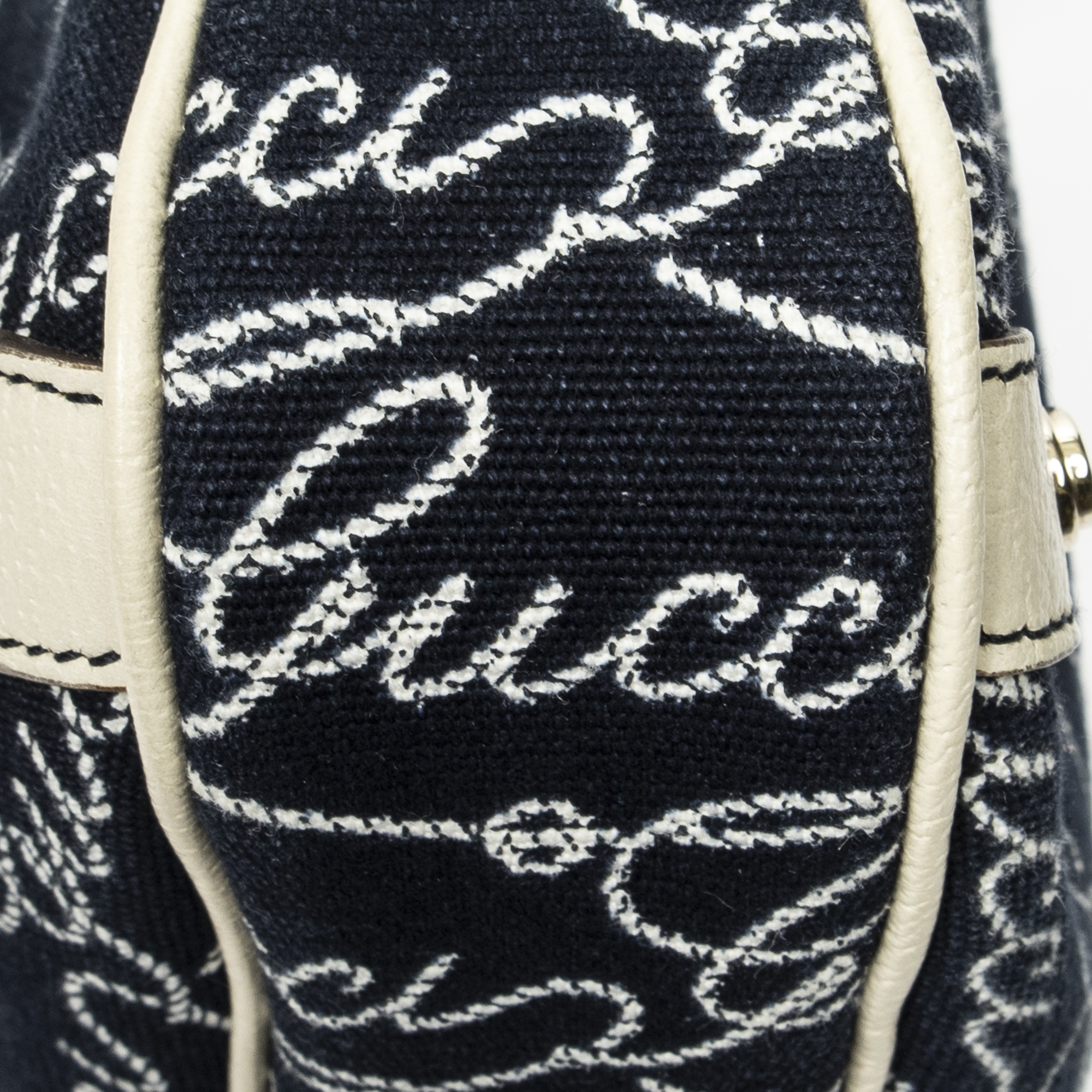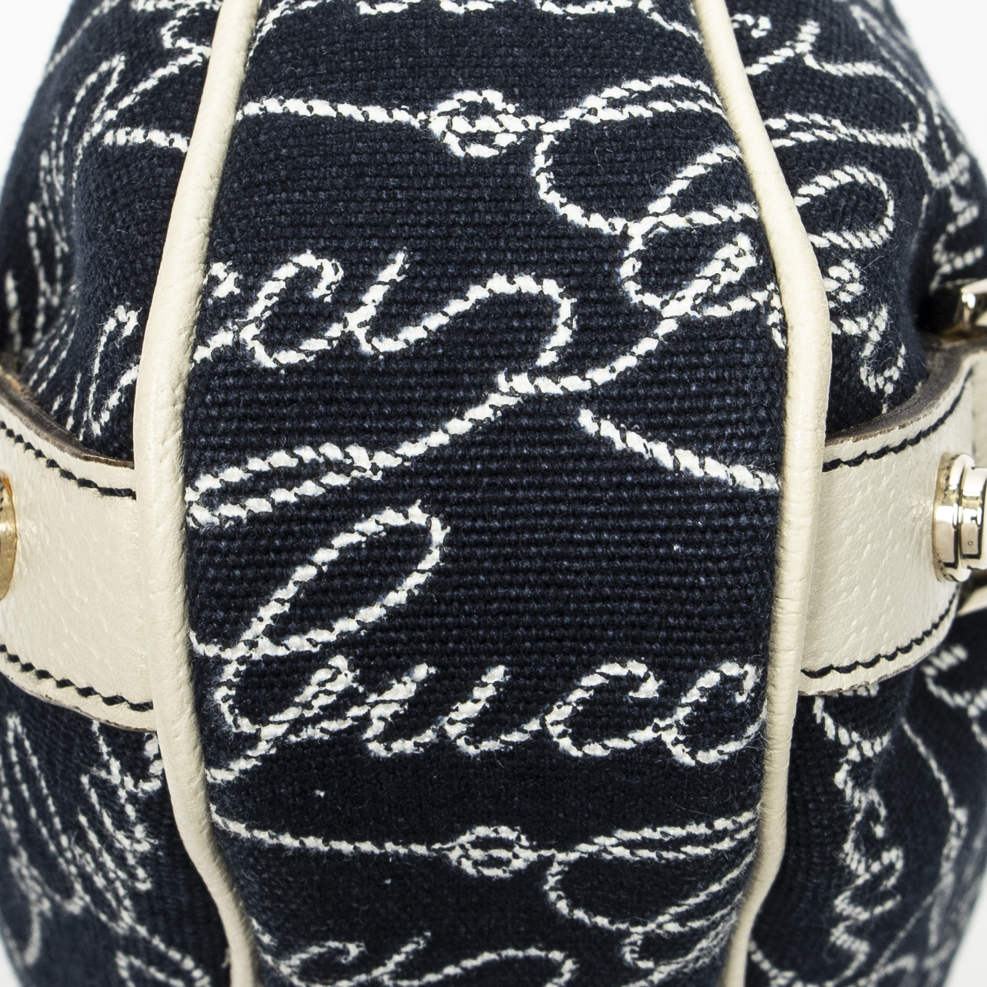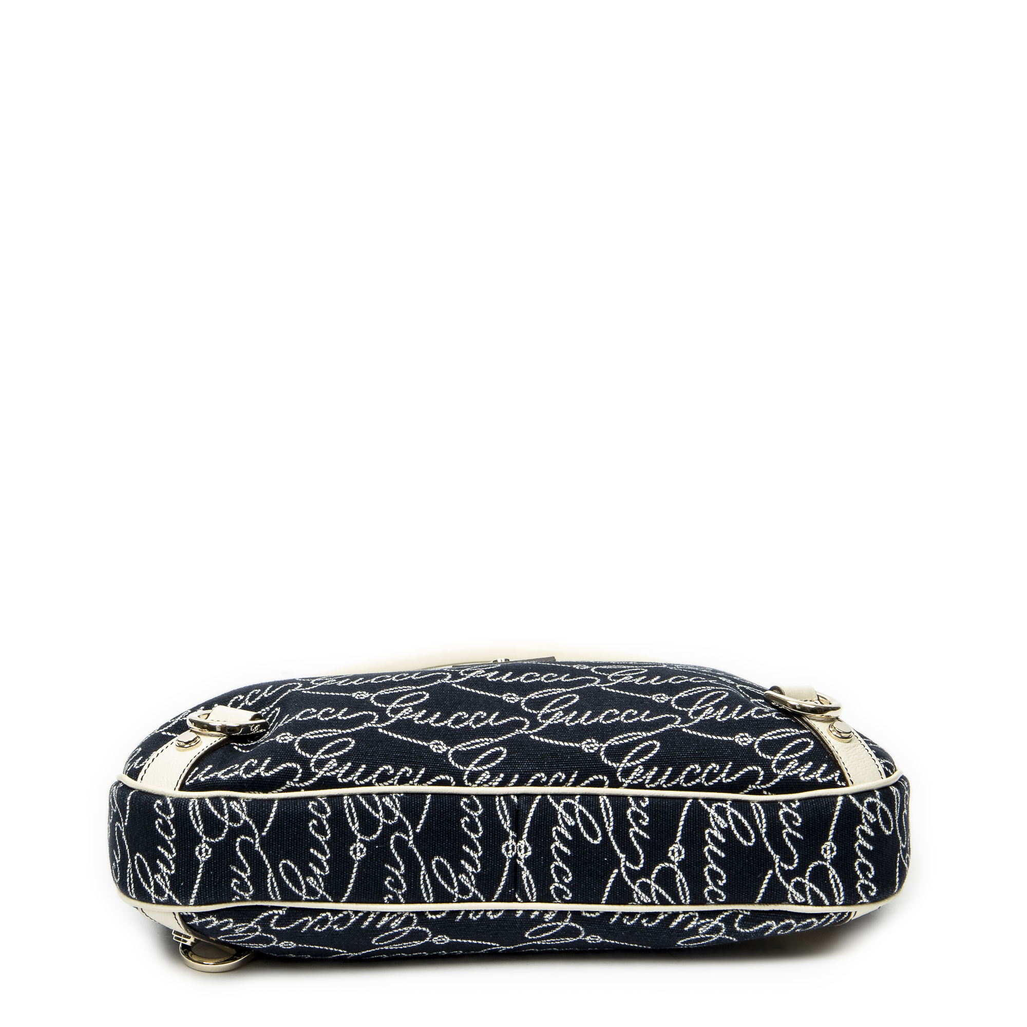 Gucci Shoulder Bag Small Abbey D-Ring Hobo in Navy/Ivory White Script Canvas and Gold hardware. The product is in Excellent Condition (A).