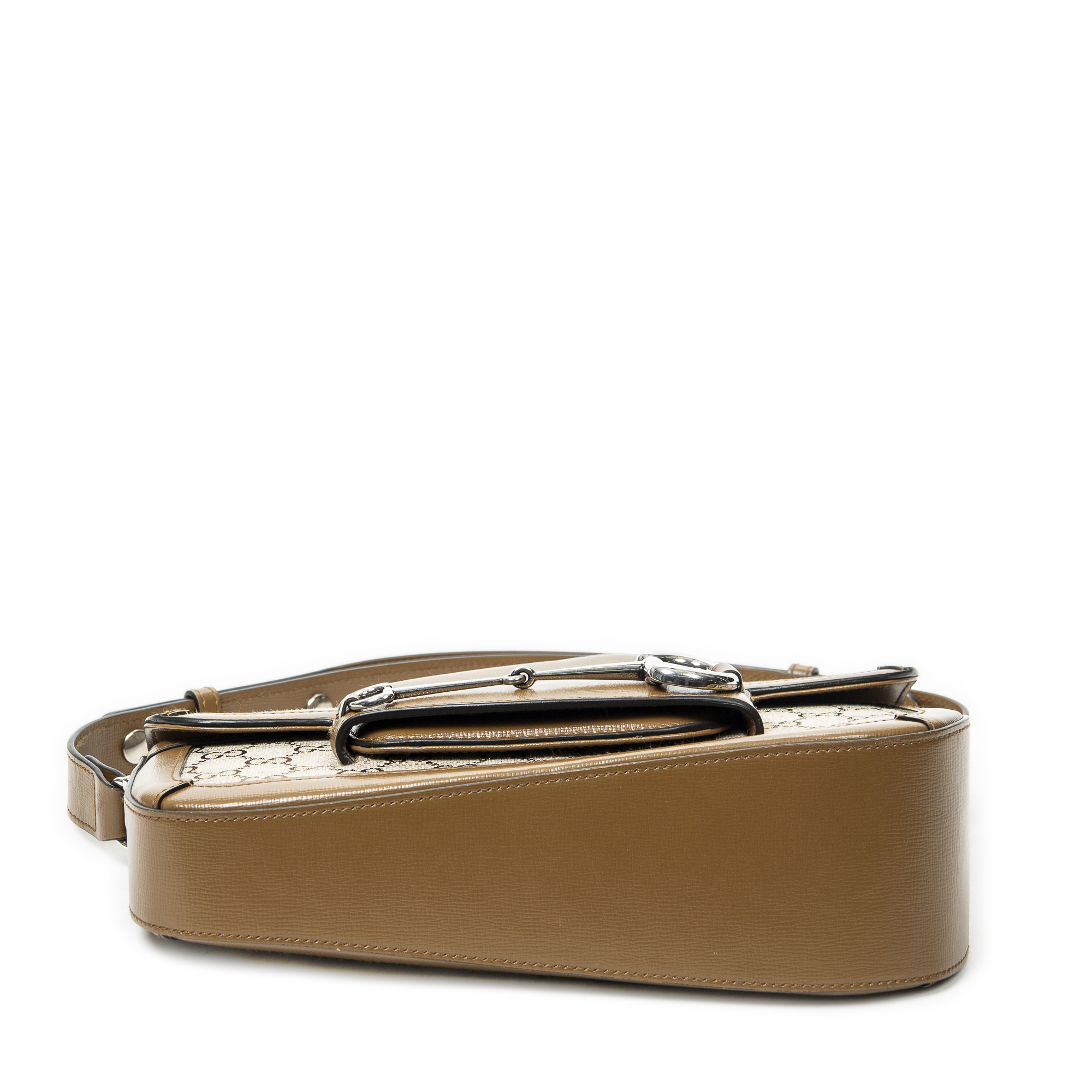 Gucci Shoulder bag Small Asymmetric Horsebit 1955 in Tan/Beige Monogrammed Canvas and Silver hardware. The product is in Perfect Condition (AA).