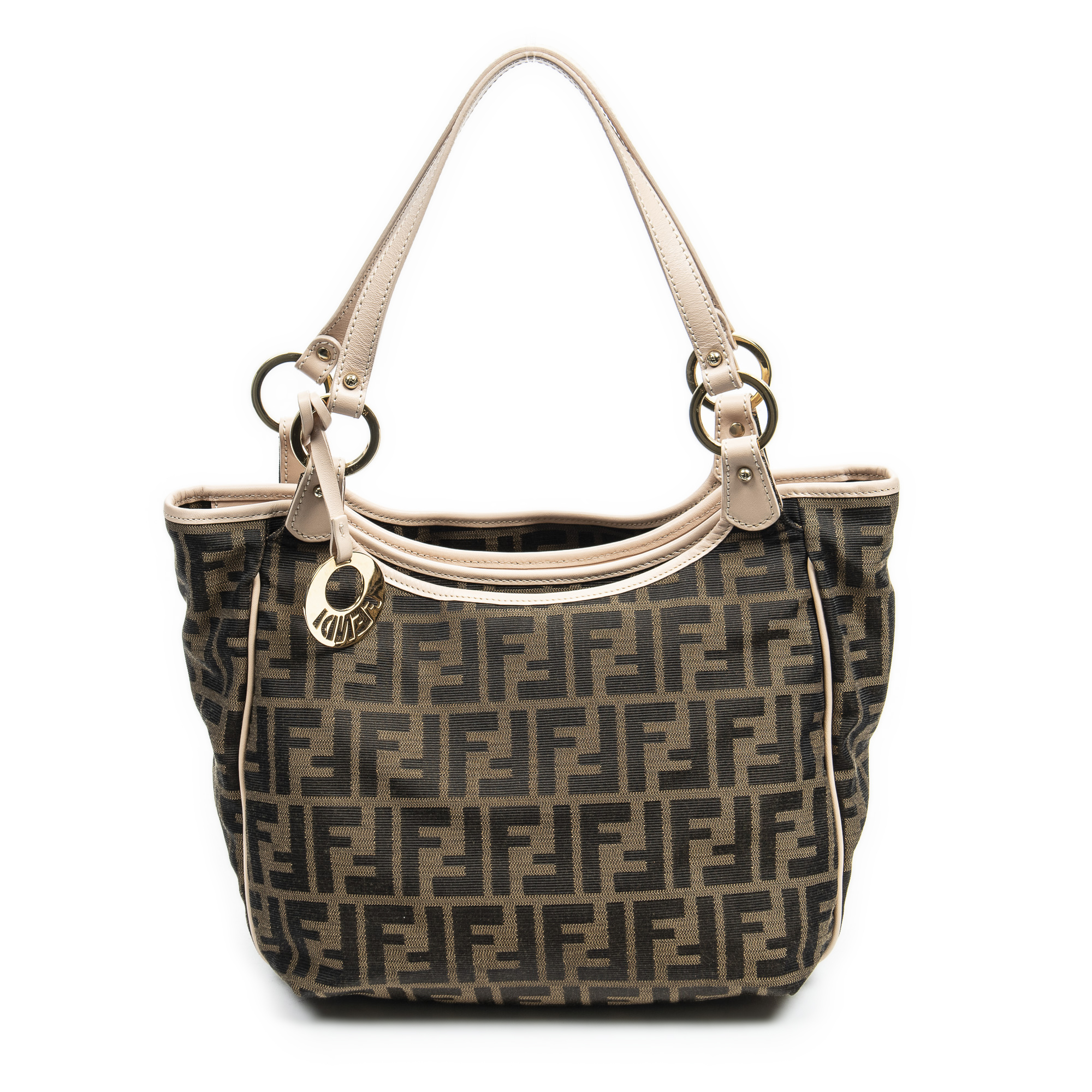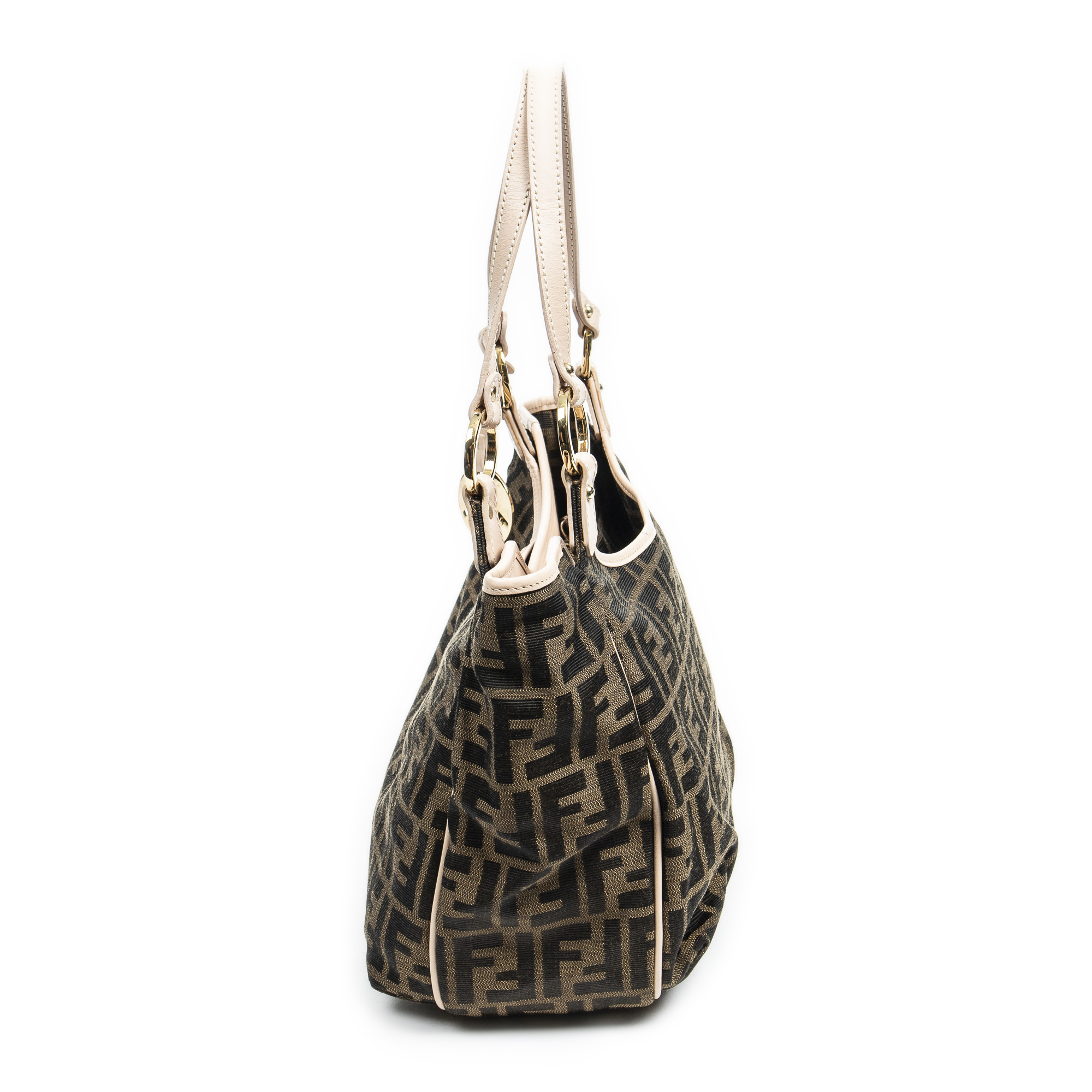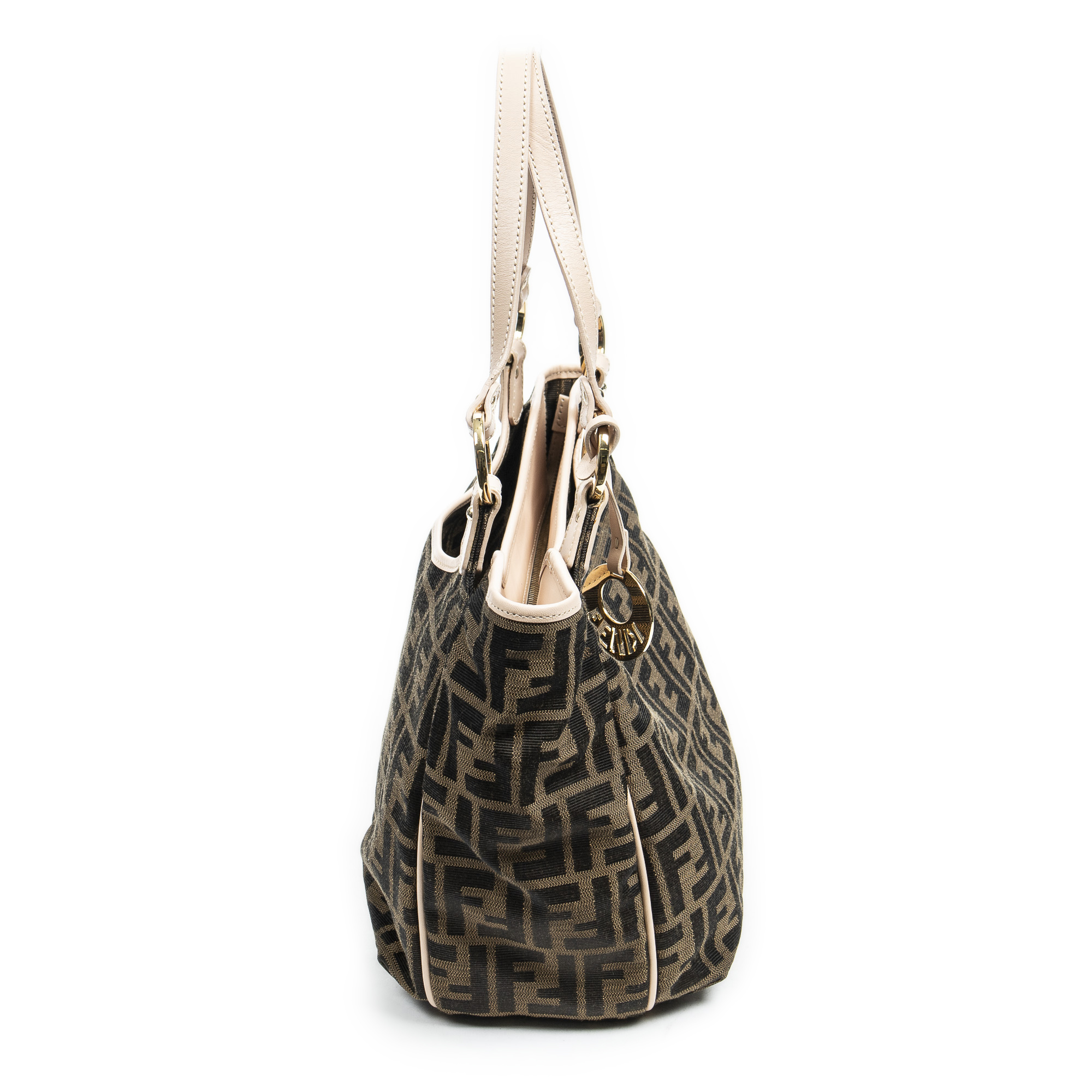 Fendi Shoulder Bag Small Chef Shopping Tote in Beige/Dark Brown/Peach Zucca Canvas and Gold hardware. The product is in Excellent Condition (A).