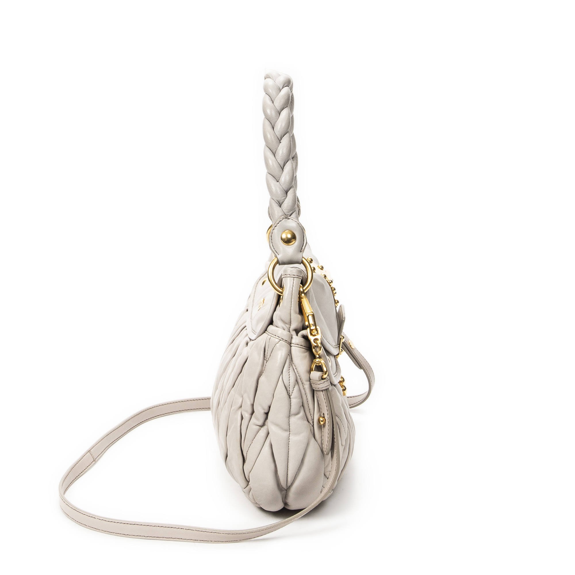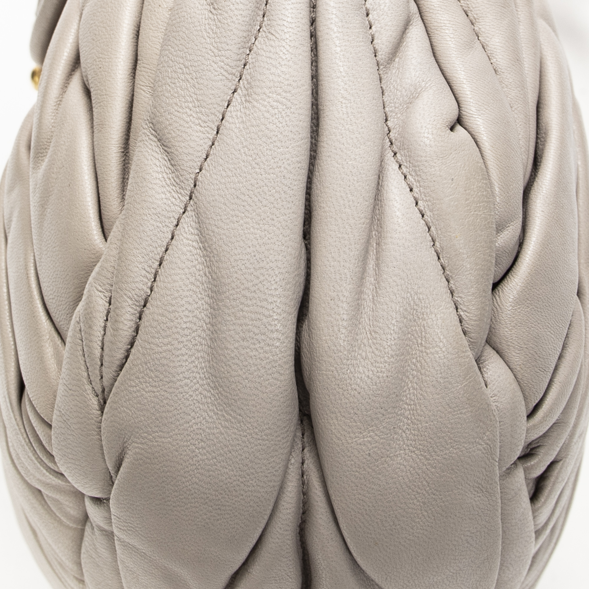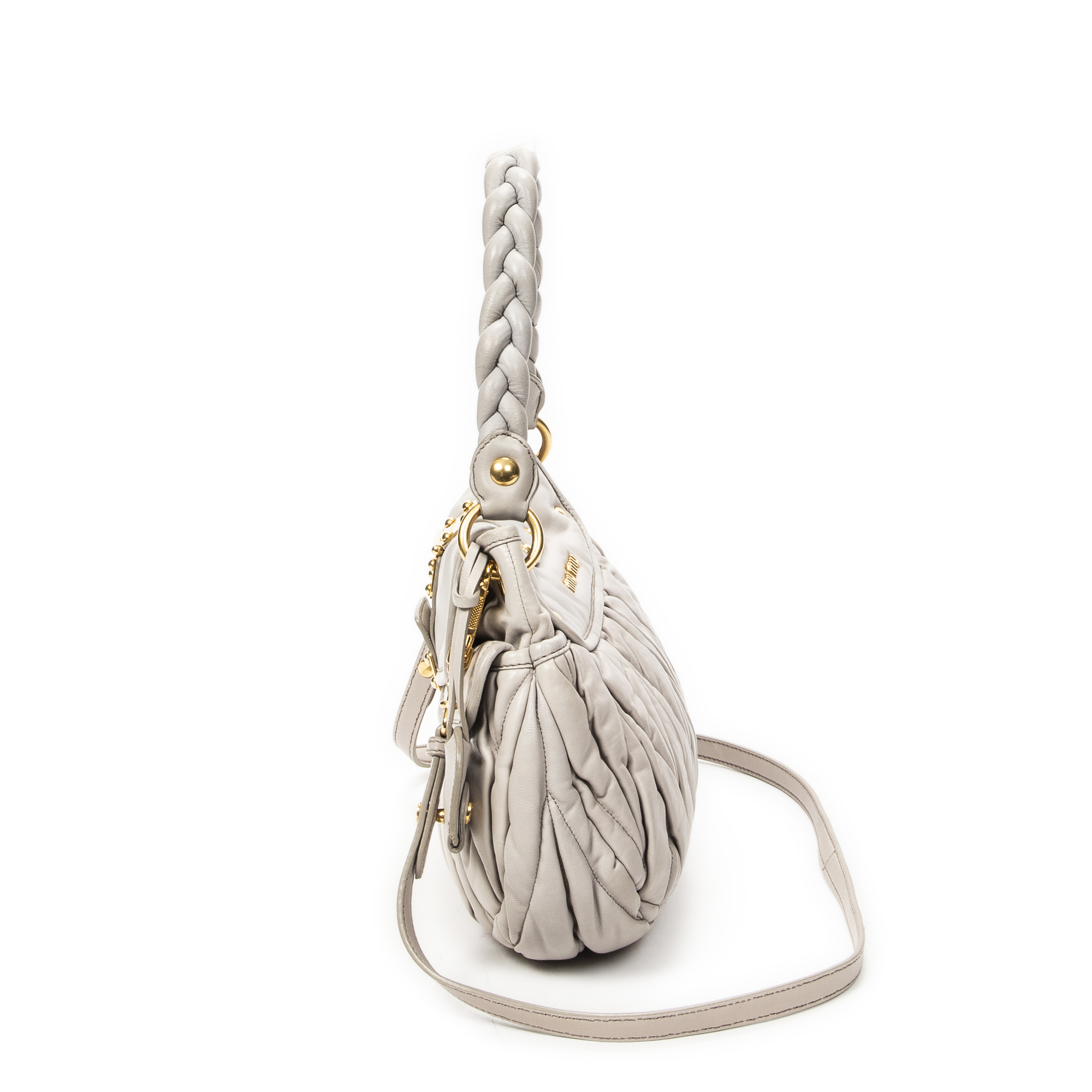 Miu Miu Shoulder Bag Small Coffer Double Pocket Hobo in Light Grey Matelasse Leather and Gold hardware. The product is in Excellent Condition (A).