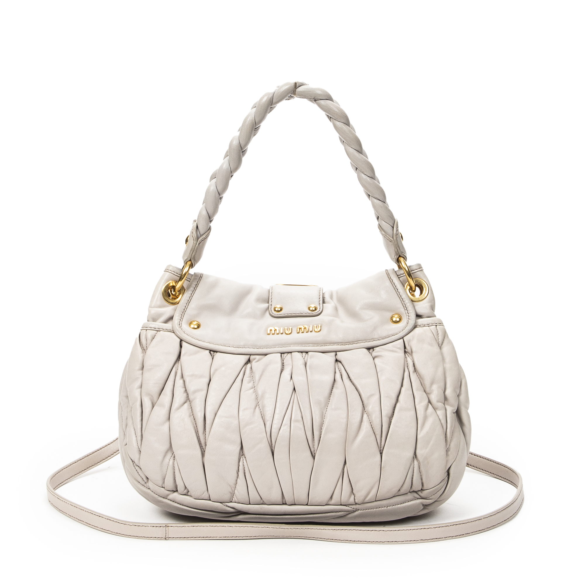 Description : Miu Miu Shoulder Bag Small Coffer Double Pocket Hobo in Light Grey Matelasse Leather and Gold hardware. The product is in Excellent Condition (A). Dimensions: 29x23x8.5 cm SKU: ABC7131 Serial number: 194 Accessories Included: Key in Clochette; Leather Strap Delivery: We have a 5 to 7 business days delivery policy, hassle-free and duties/tariffs included! BrandCo Paris finds rare and top condition items at great deals, they are worth your patience! Shop with confidence - All BrandCo Paris items are carefully selected and authenticated by our team of experts. All the items come with an authenticity certificate and packaging delivered by BrandCo Paris. Item Condition Grading Table N (Like New) AA (Perfect Condition) A (Excellent Condition) AB (Very Good Condition) B (Good/Fair)