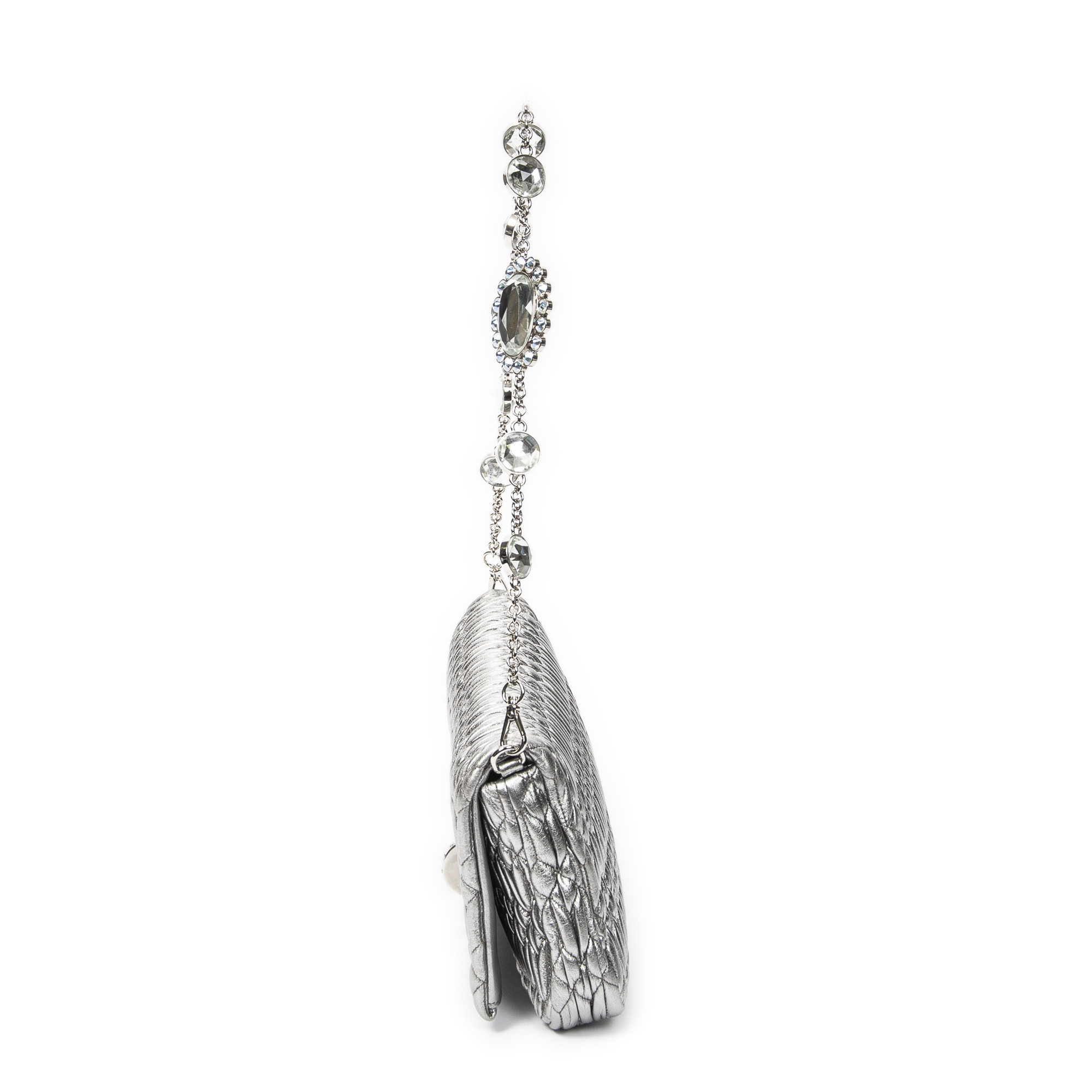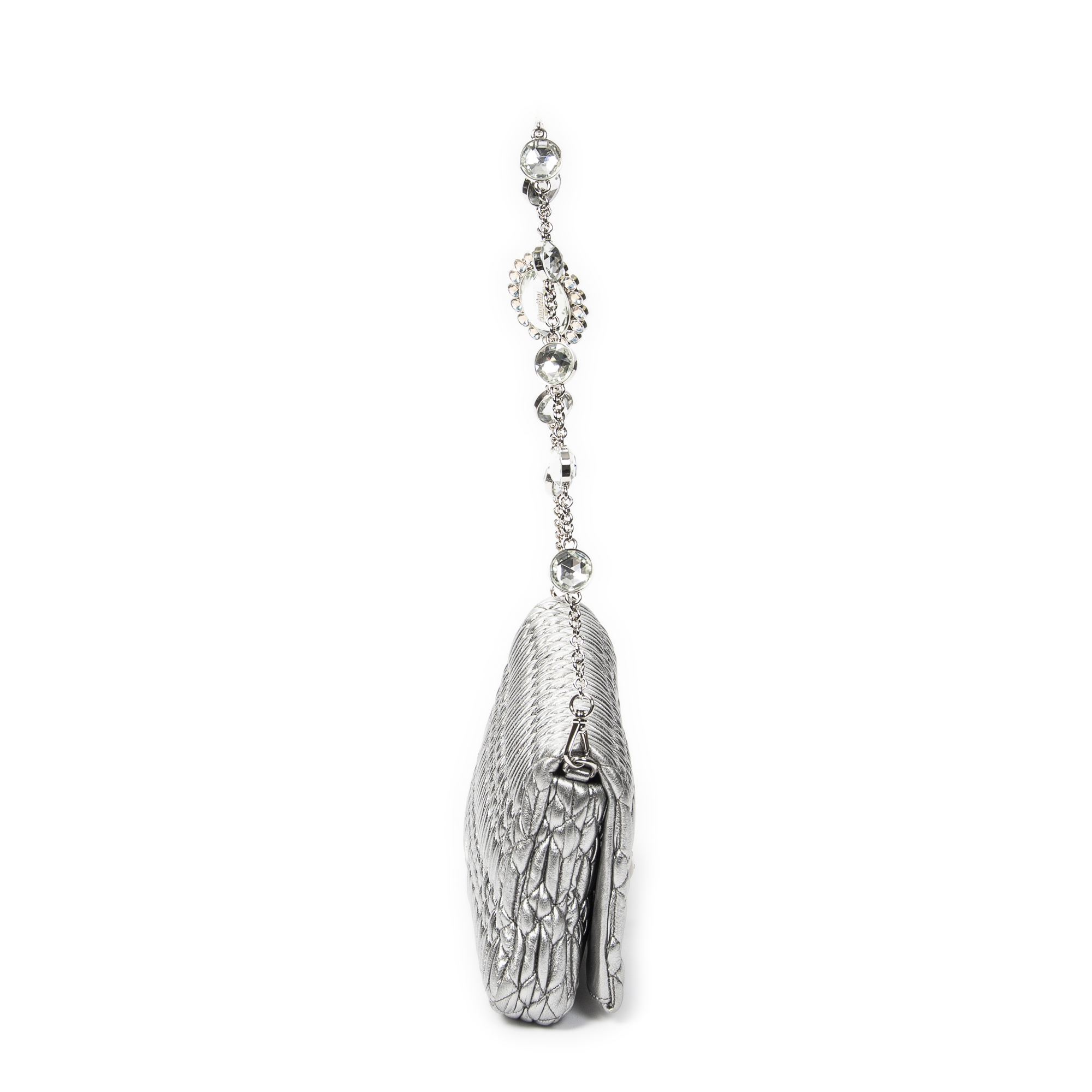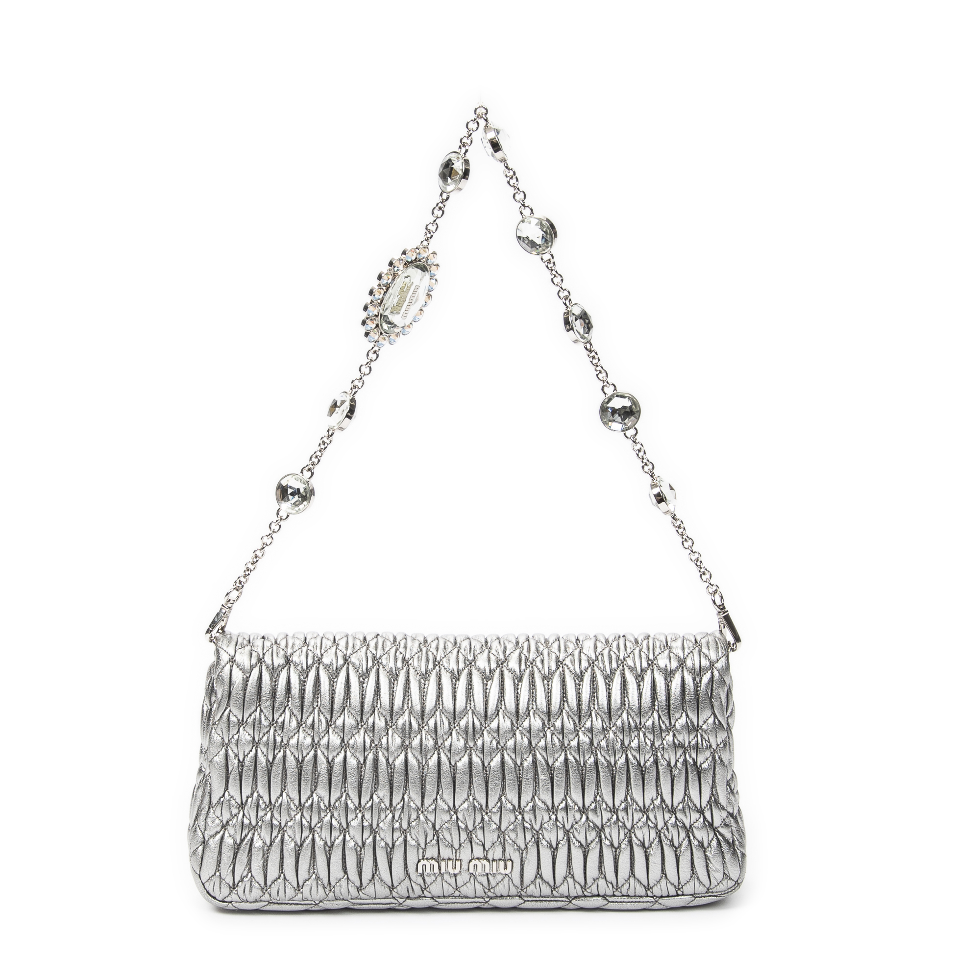 Miu Miu Shoulder Bag Small Crystal Flap Clutch in Metallic Silver Nappa Matelasse Leather and Silver hardware. The product is in Perfect Condition (AA).