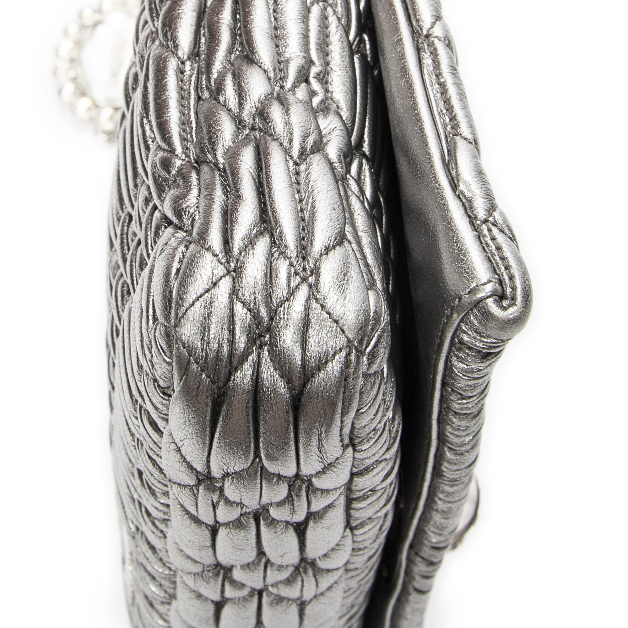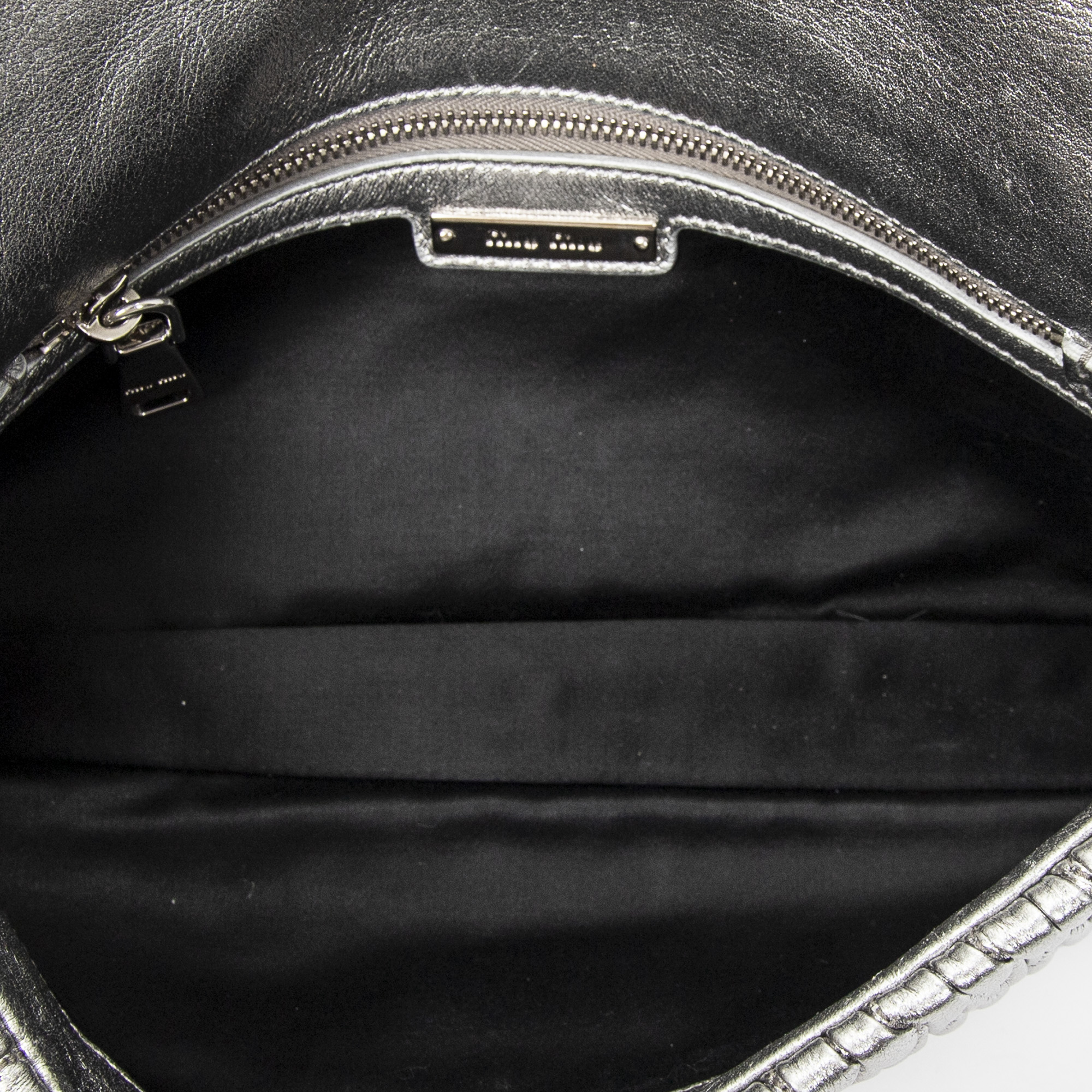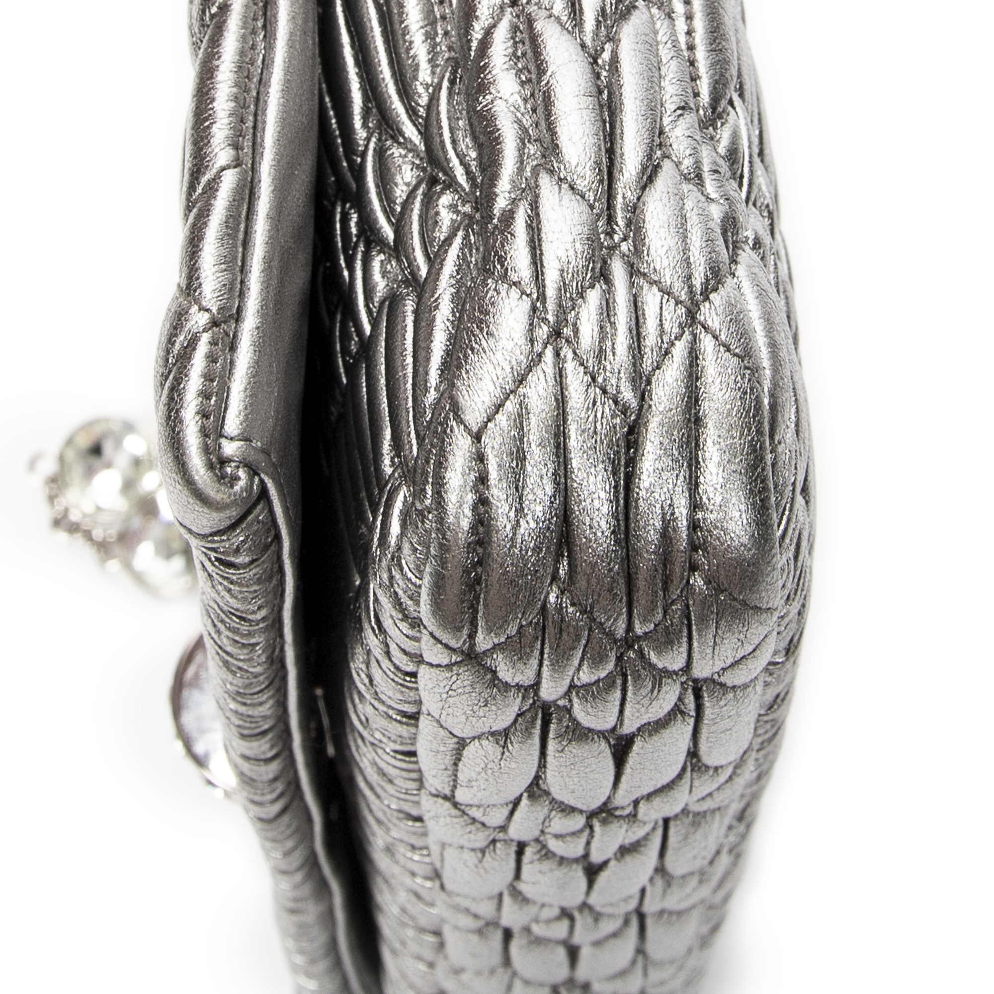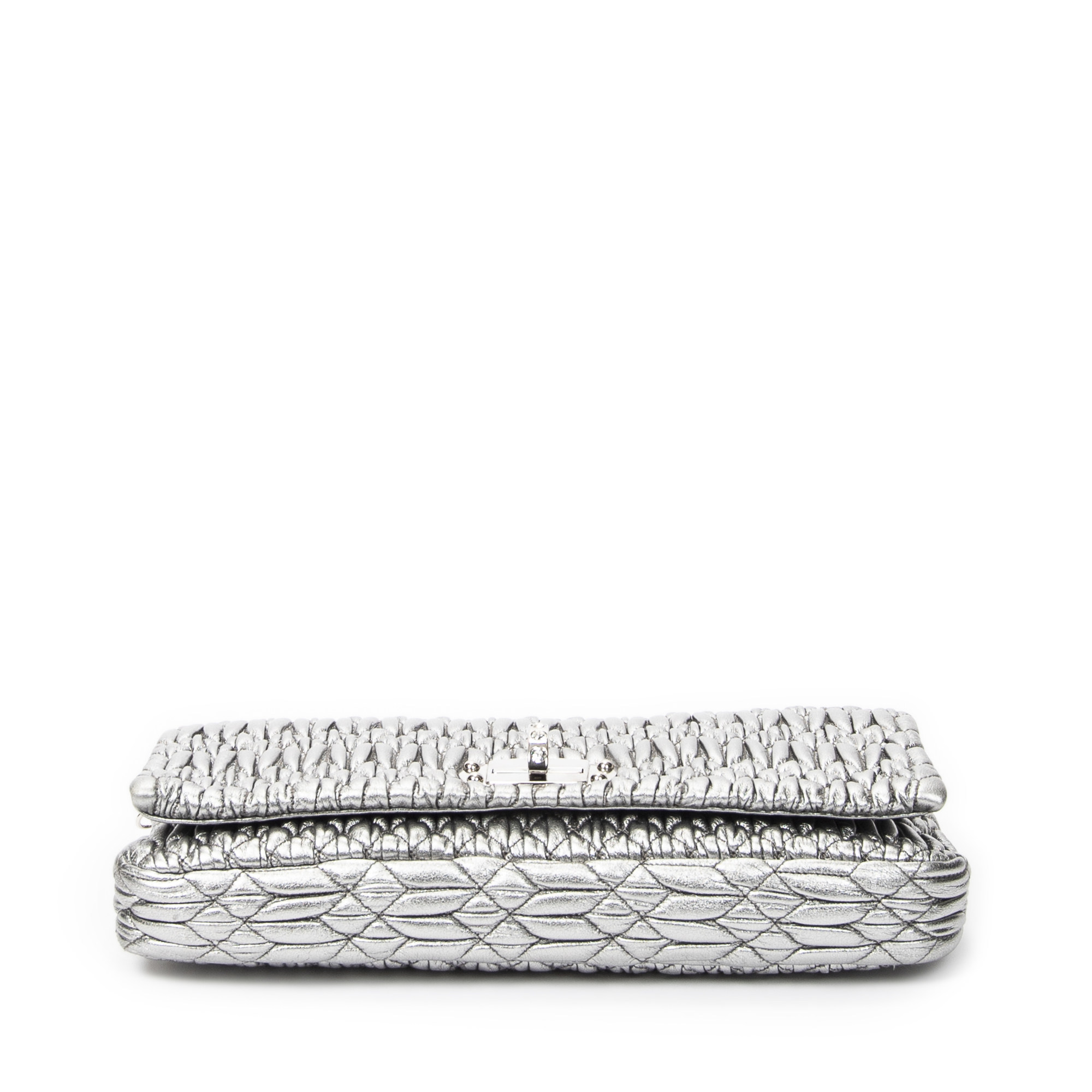 Miu Miu Shoulder Bag Small Crystal Flap Clutch in Metallic Silver Nappa Matelasse Leather and Silver hardware. The product is in Perfect Condition (AA).