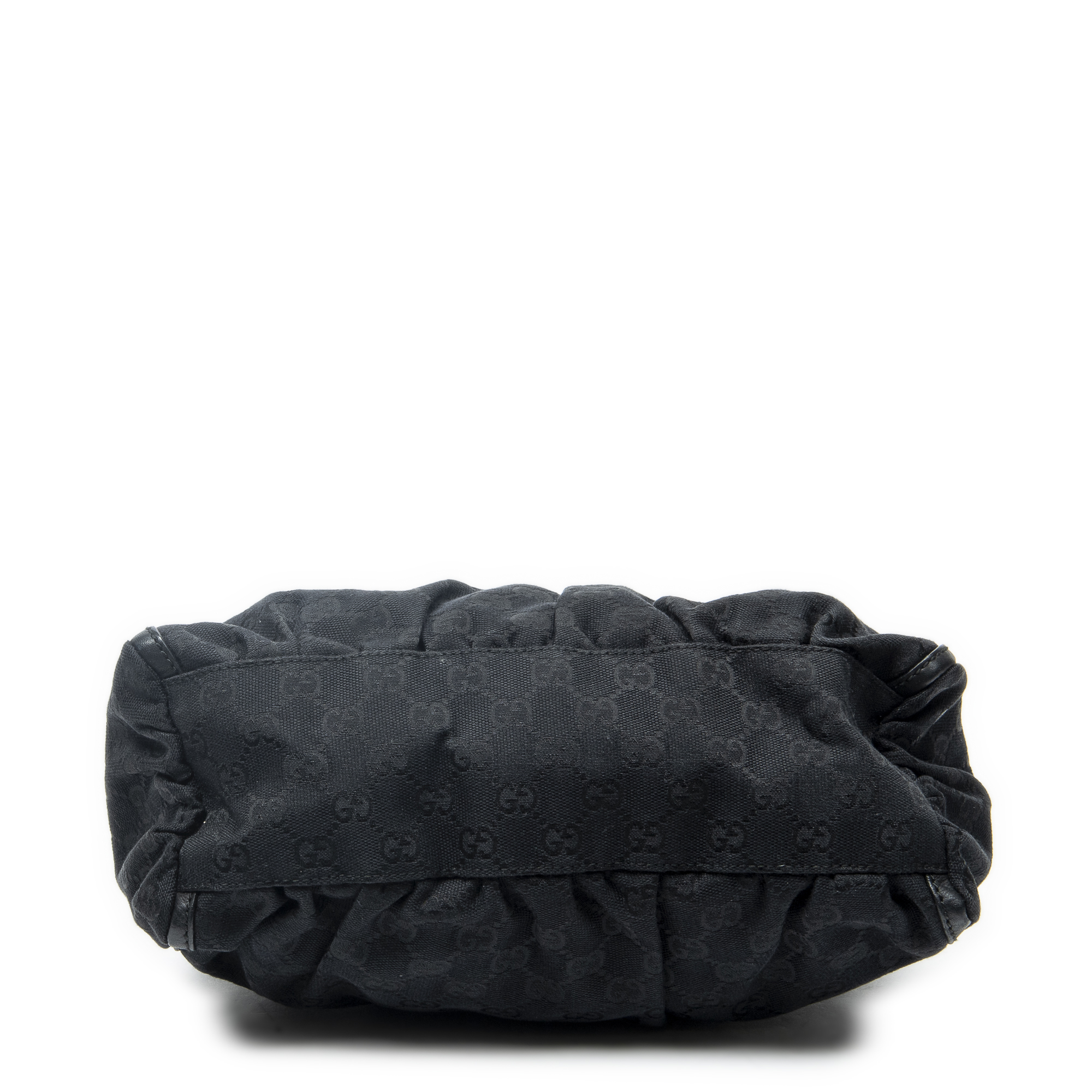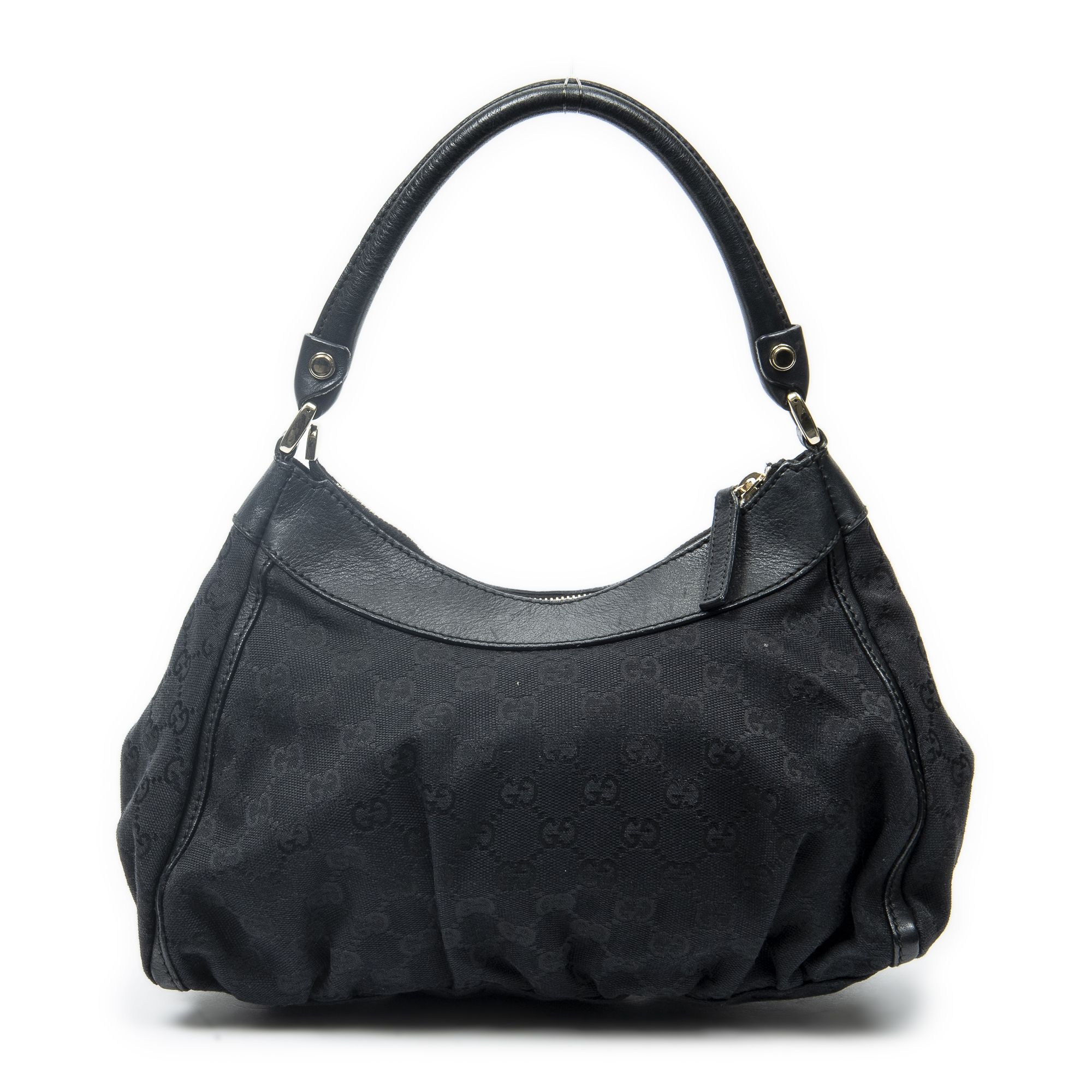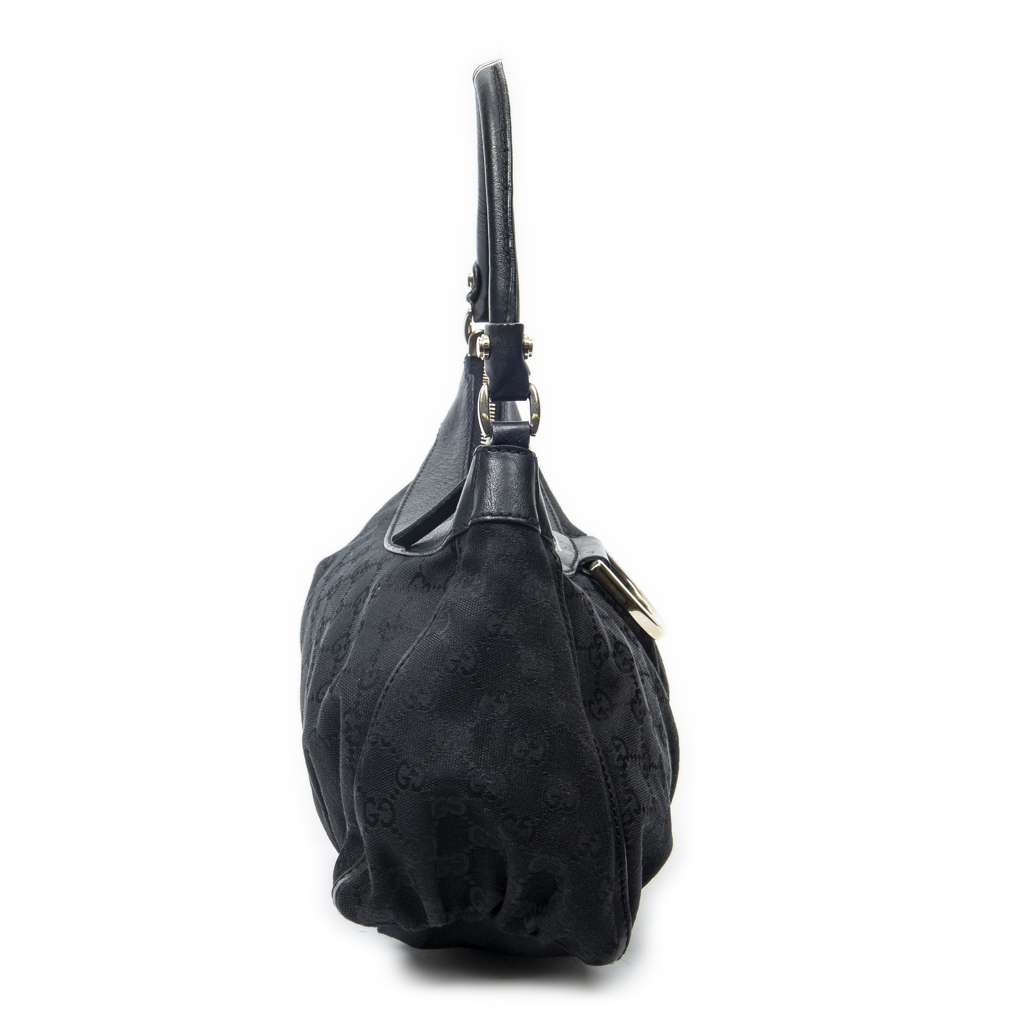 Gucci Shoulder Bag Small D-Ring Hobo in Black Monogrammed Canvas and Gold hardware. The product is in Excellent Condition (A).