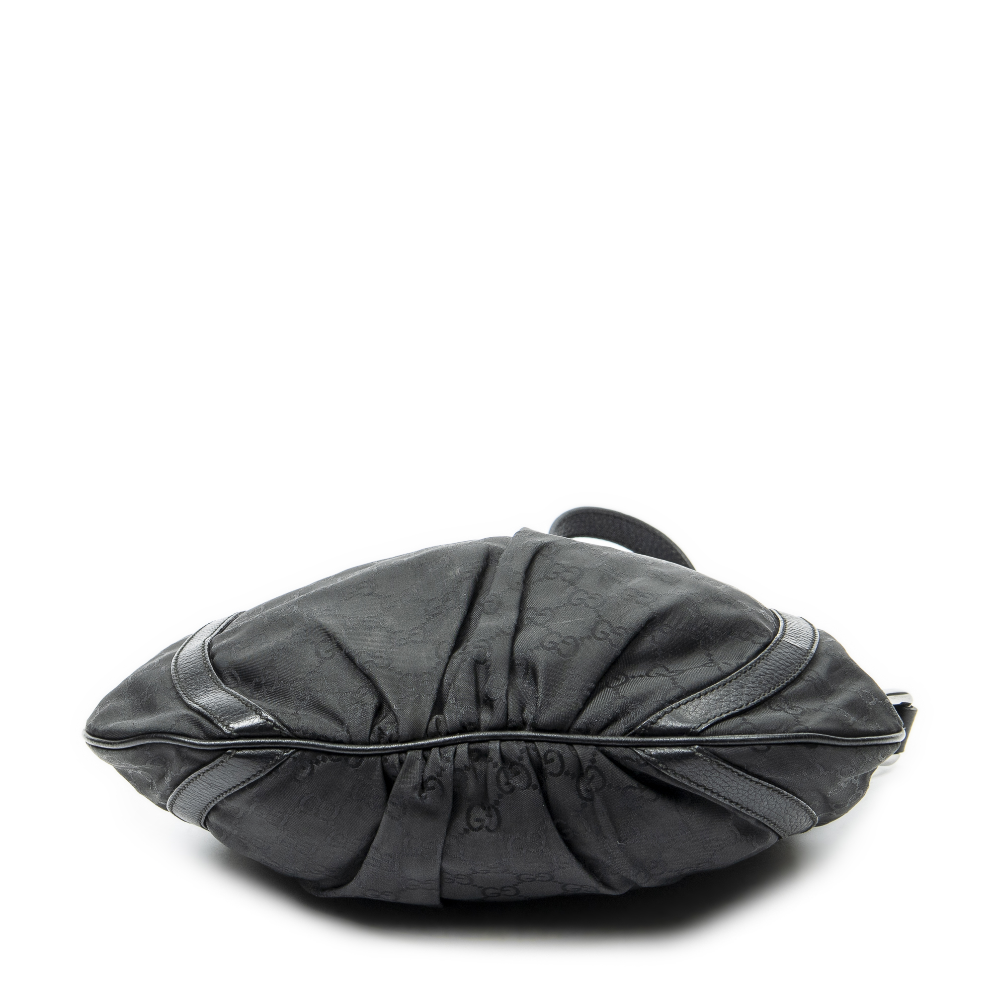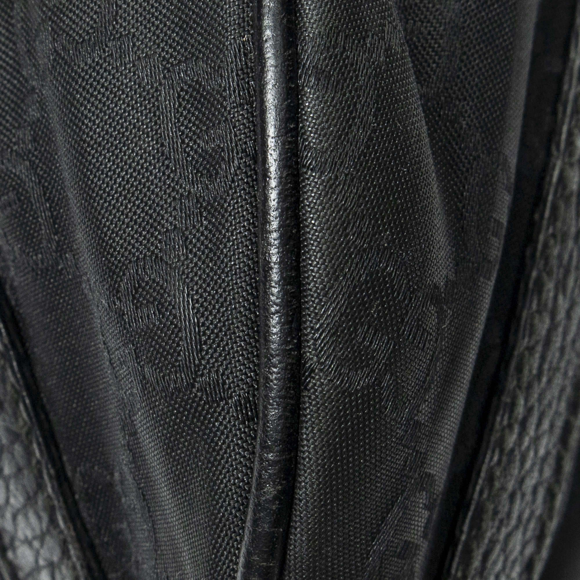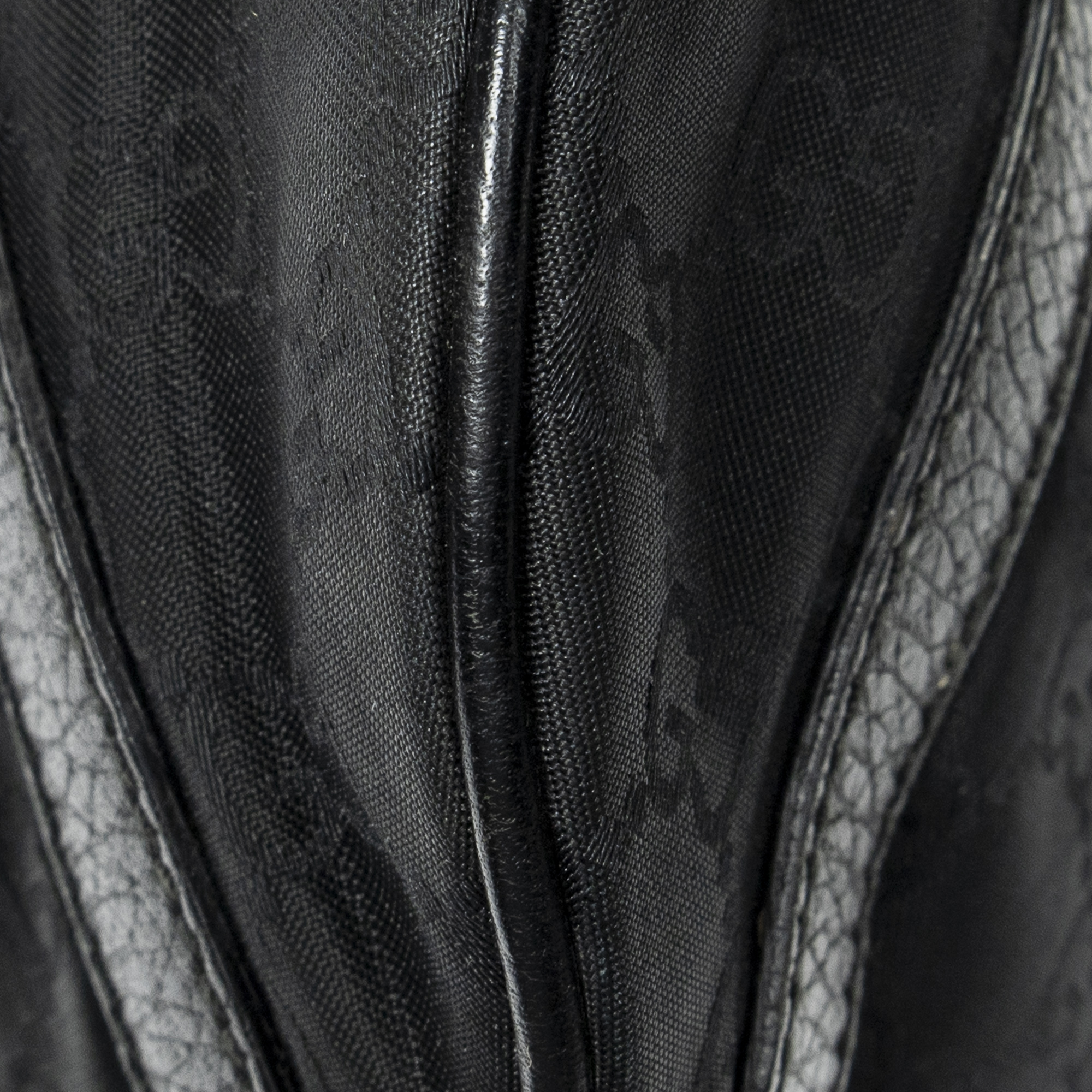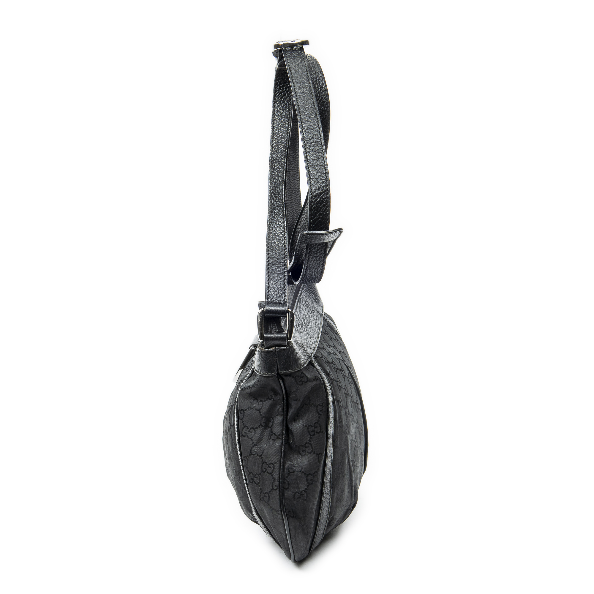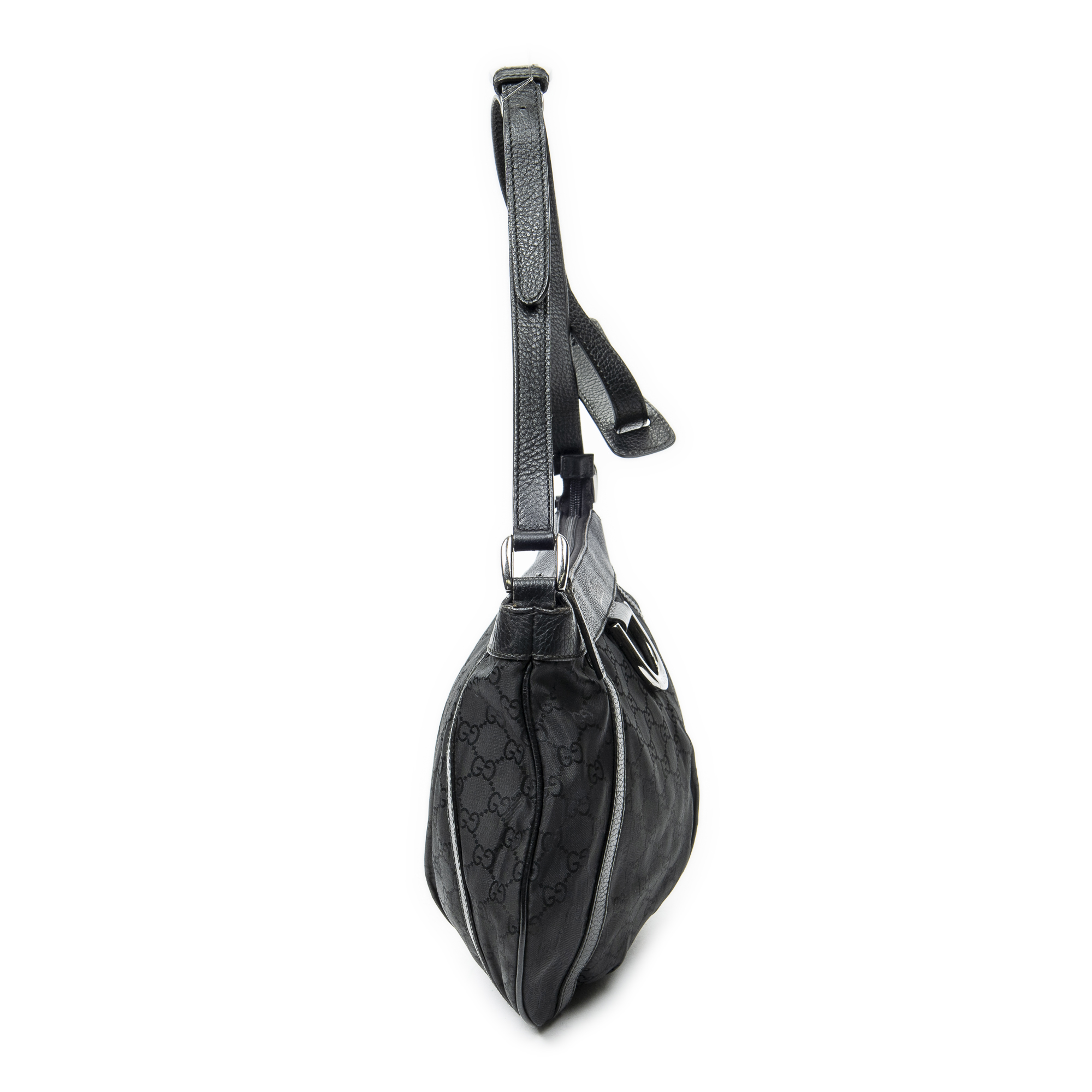Gucci Shoulder Bag Small D-Ring Messenger in Black Monogrammed Nylon Canvas and Silver hardware. The product is in Very Good Condition (AB).