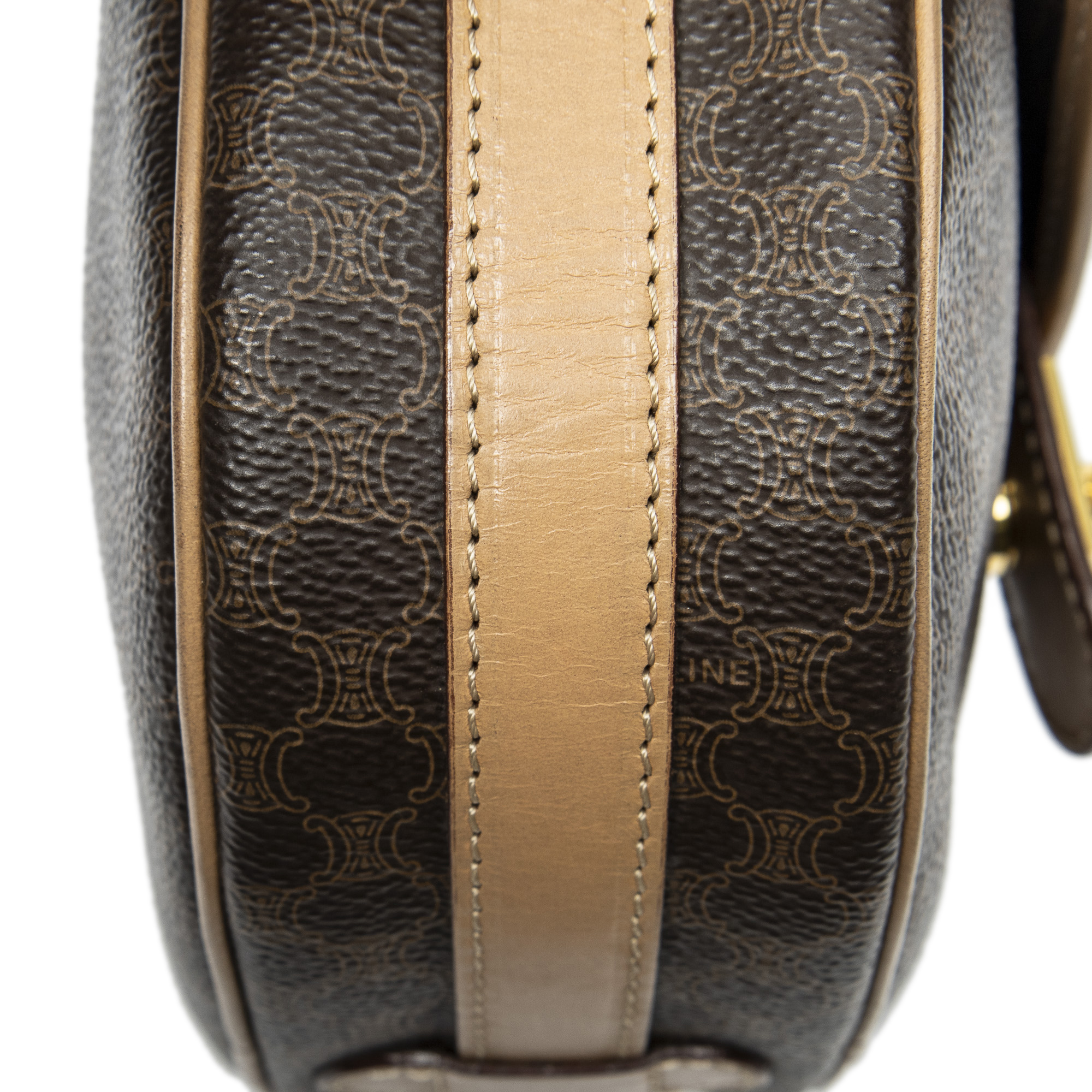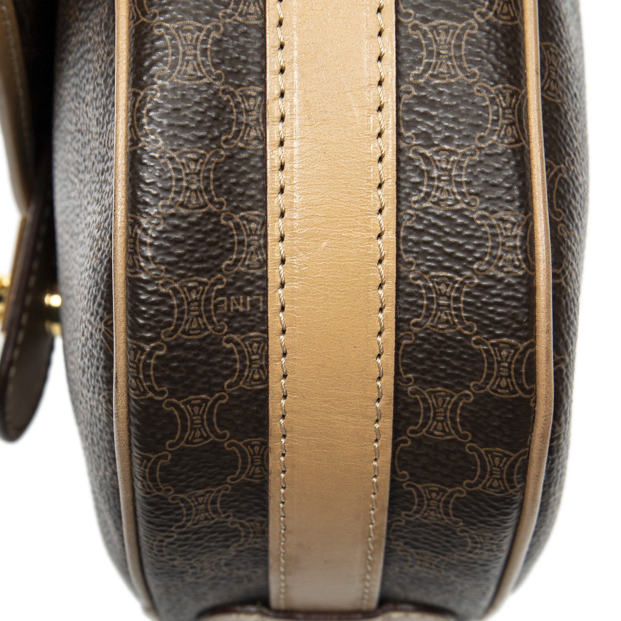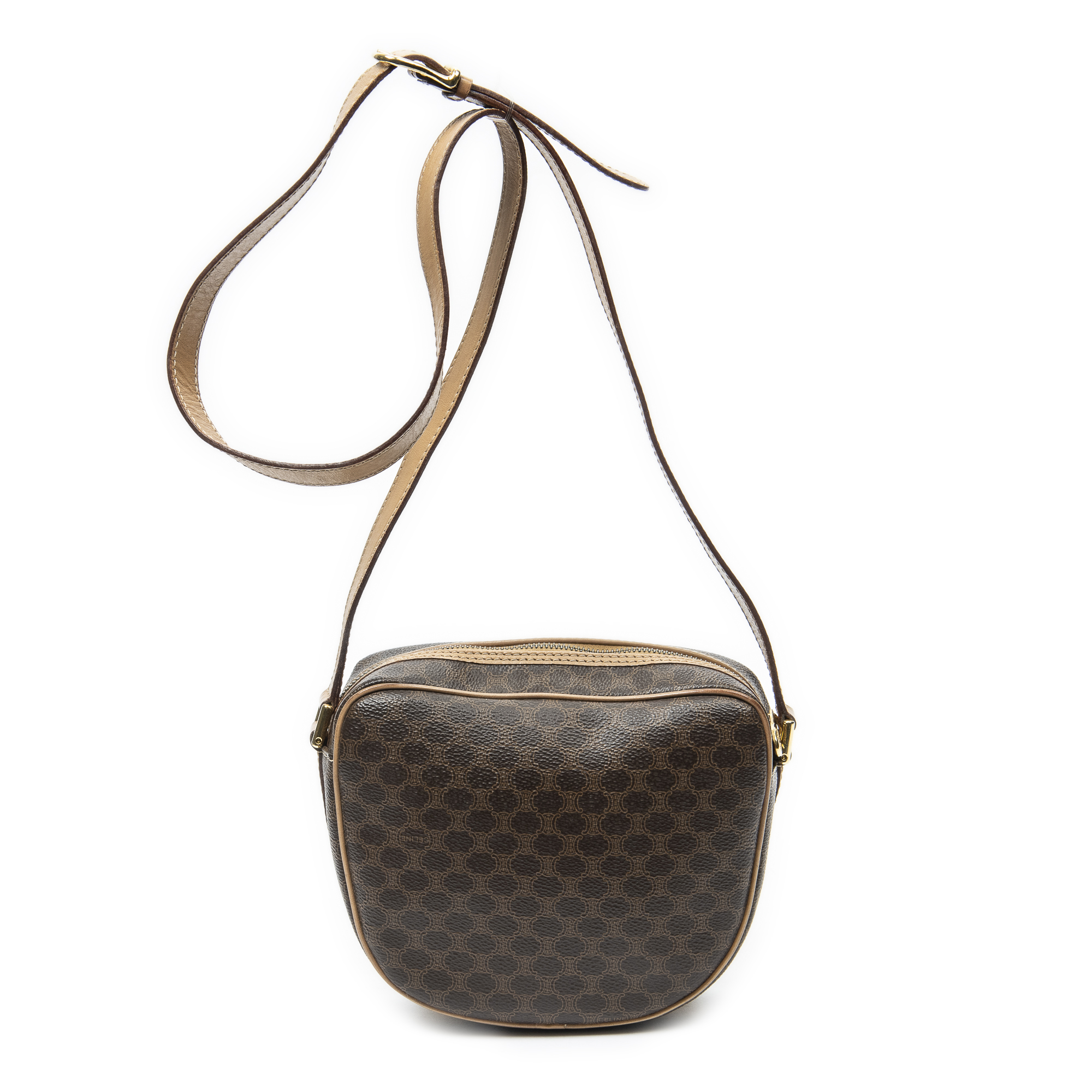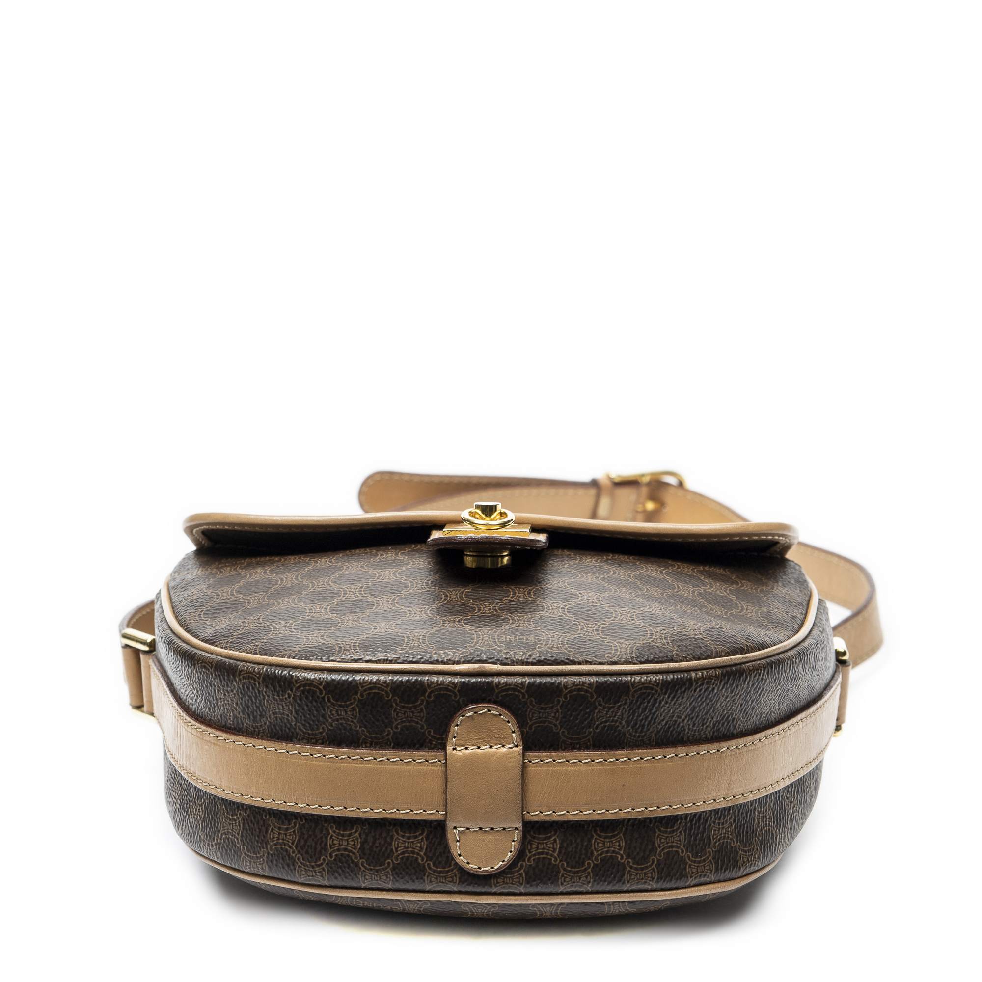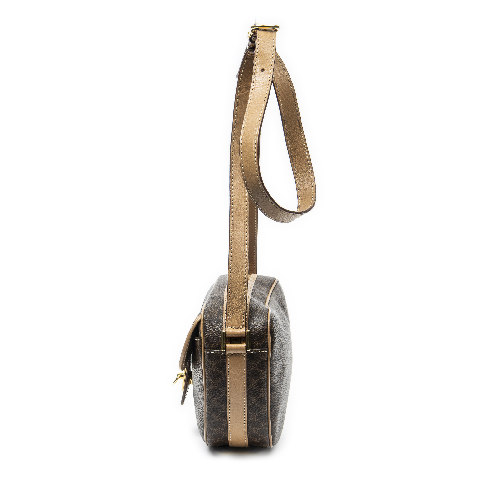 Celine Shoulder Bag Small Flap Crossbody in Brown/Light Brown Macadam Coated Canvas and Gold hardware. The product is in Excellent Condition (A).