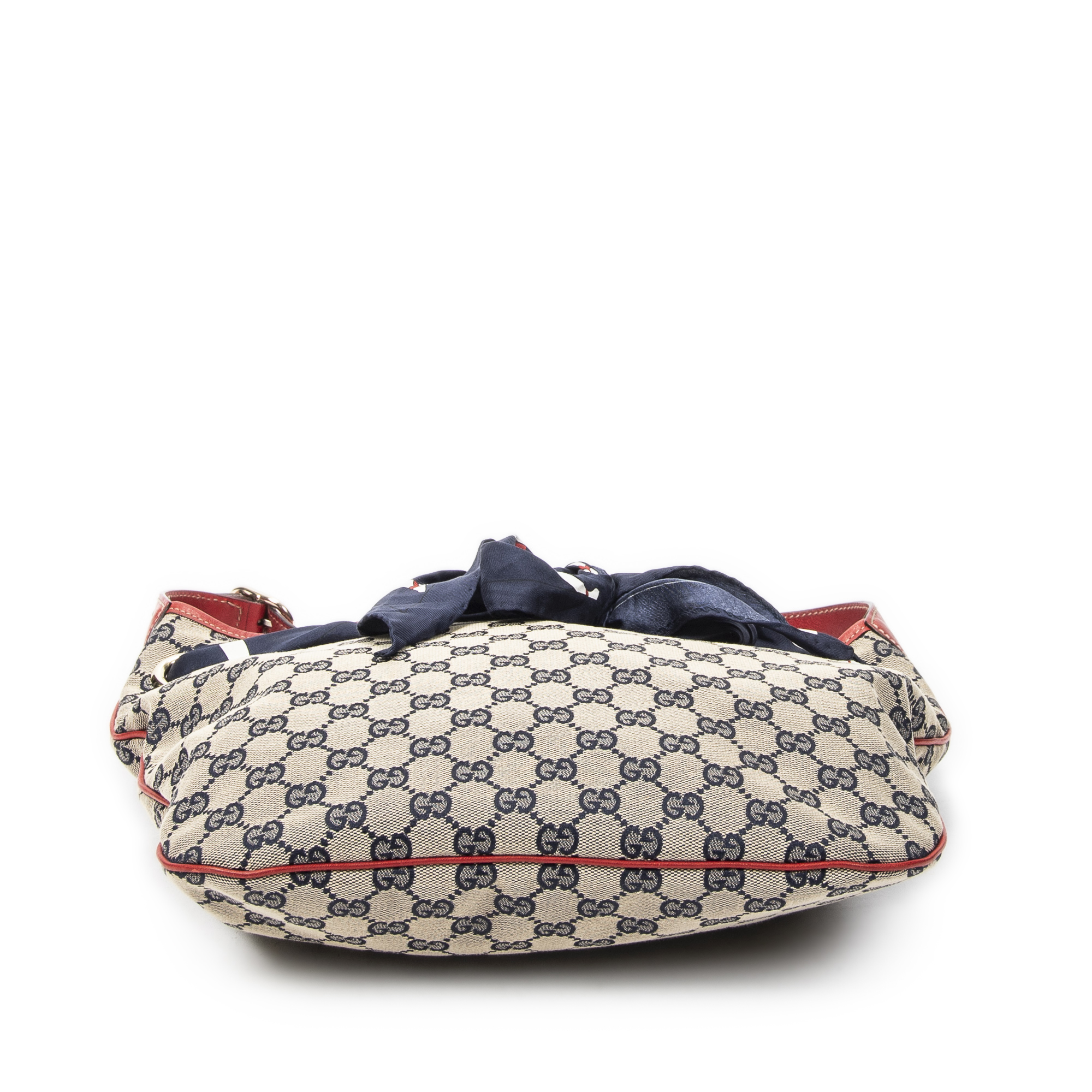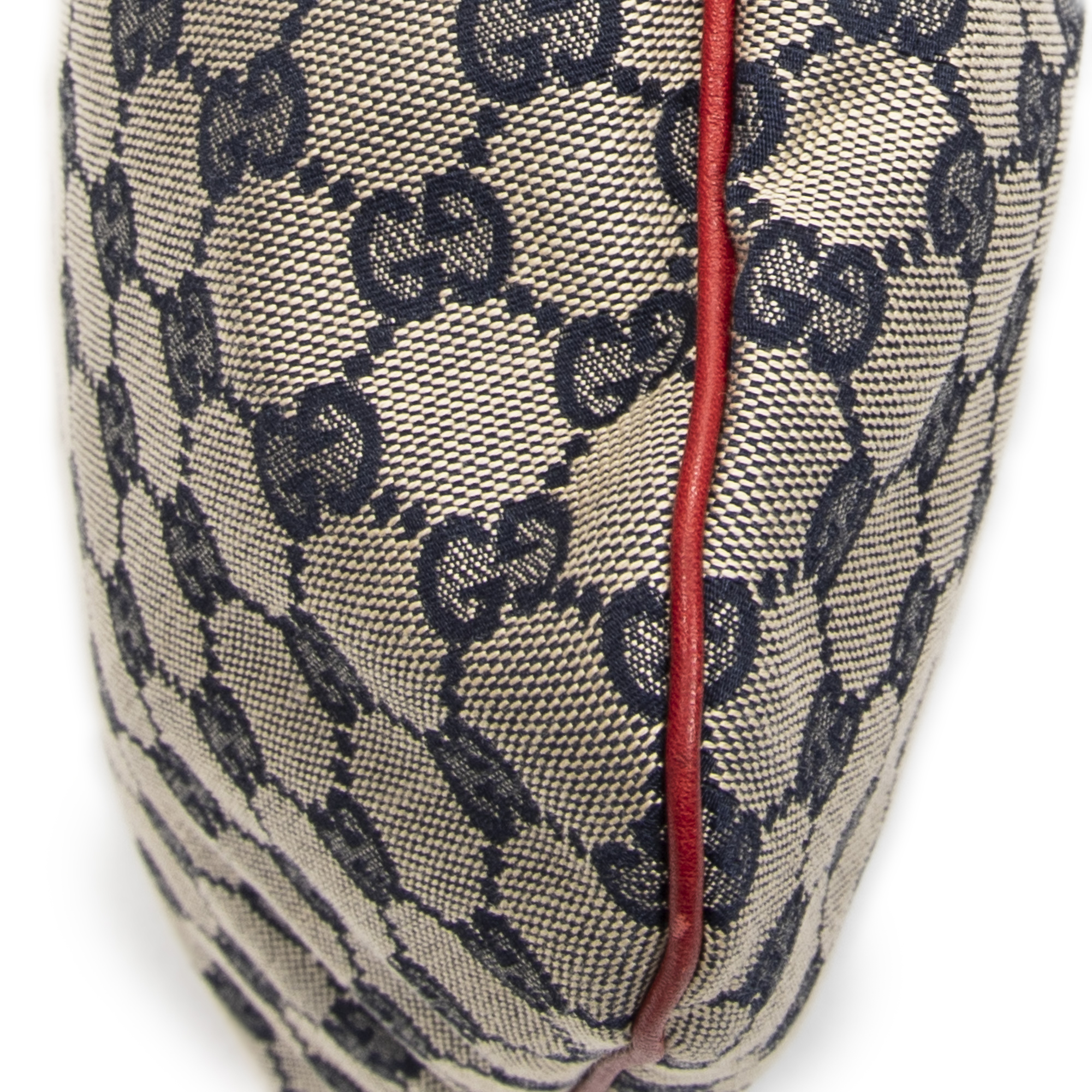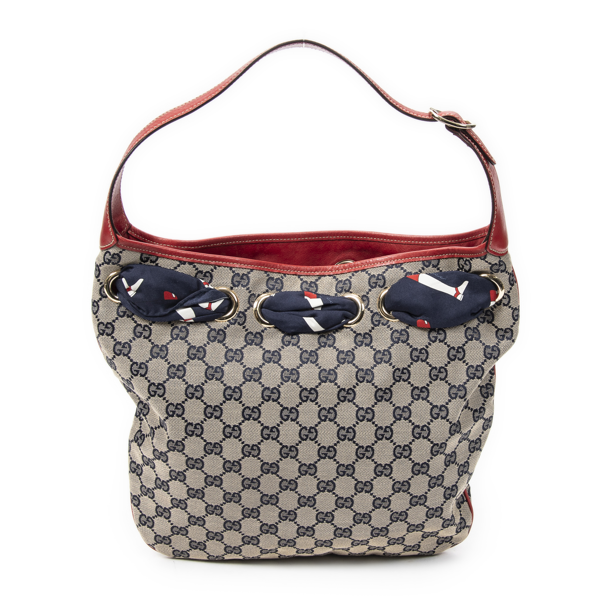 Gucci Shoulder Bag Small Positano Hobo in Red/Navy/Beige Monogrammed Canvas and Gold hardware. The product is in Excellent Condition (A).