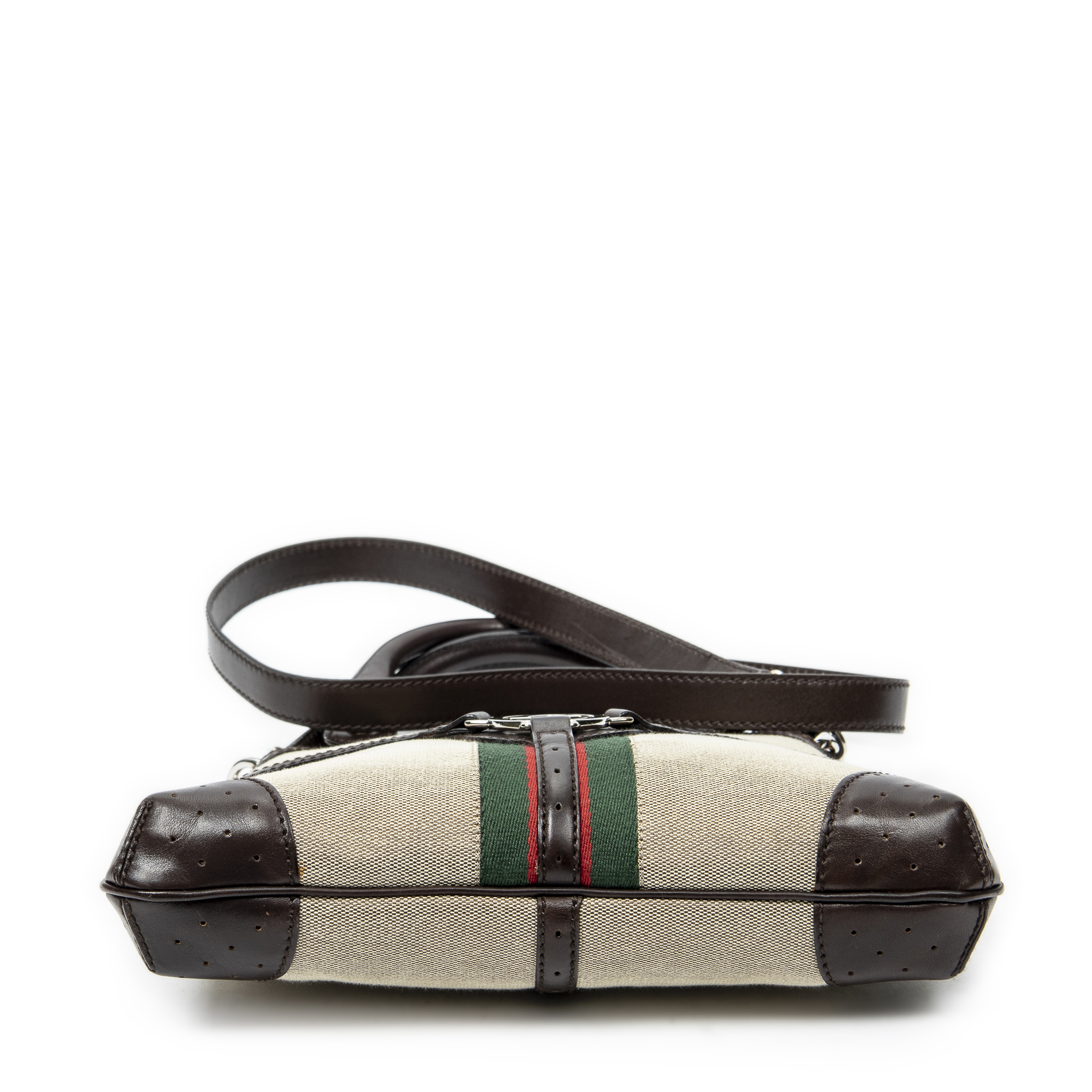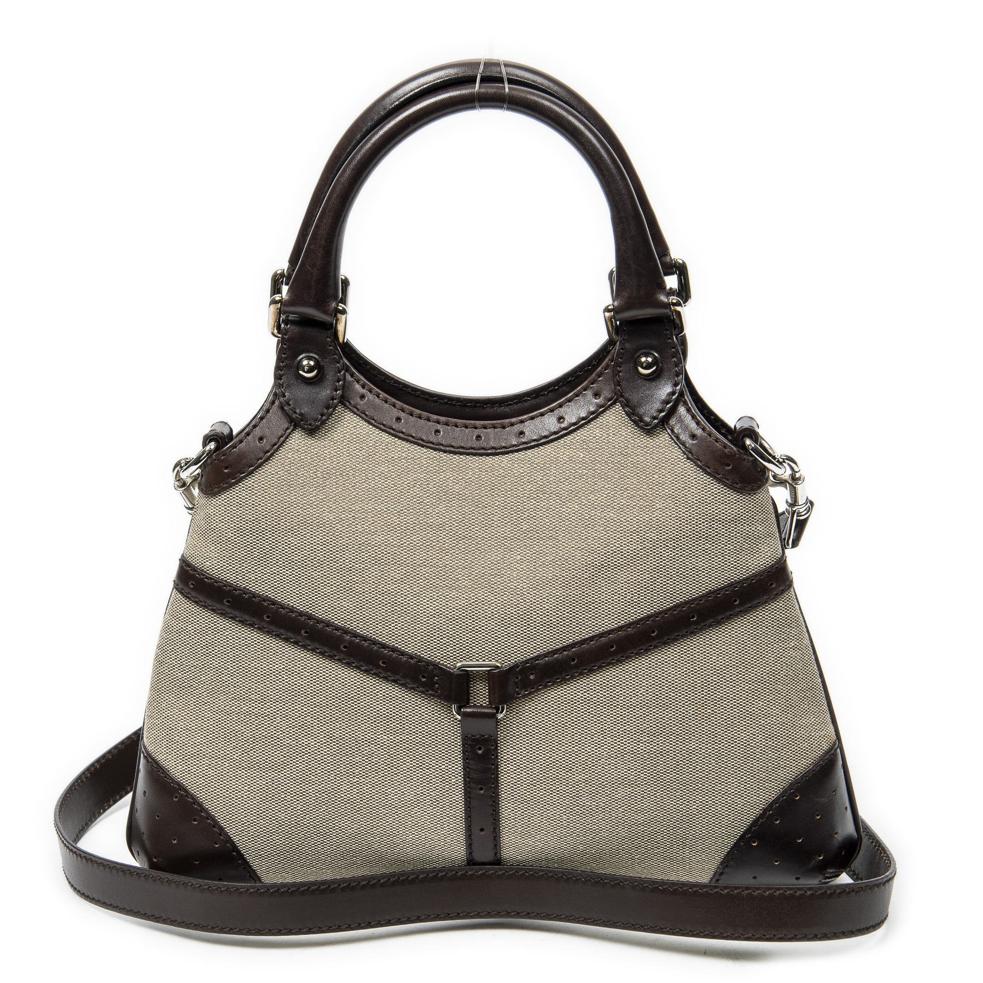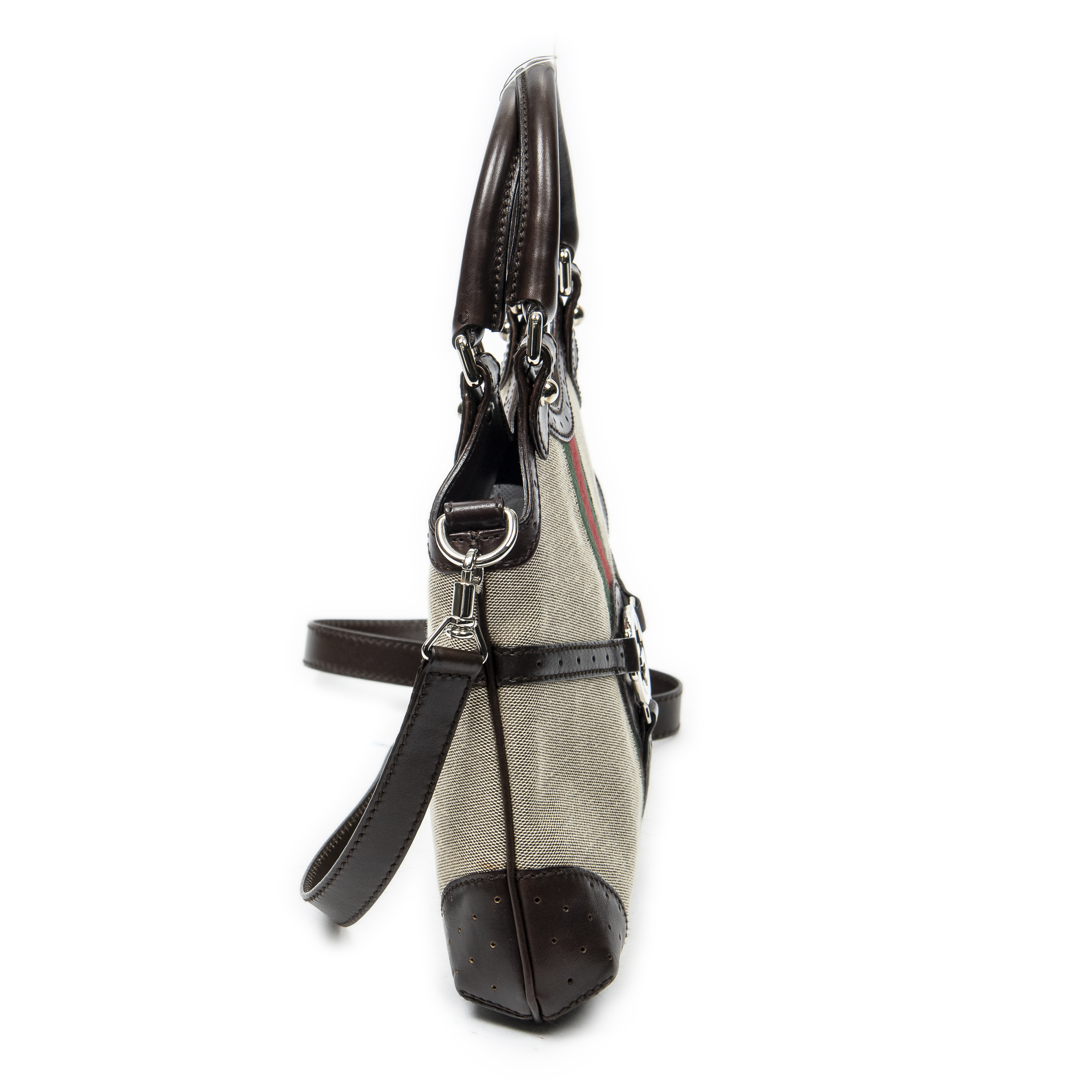 Gucci Shoulder Bag Small Reins Shoulder Bag in Dark Brown/Beige Canvas and Silver hardware. The product is in Excellent Condition (A).