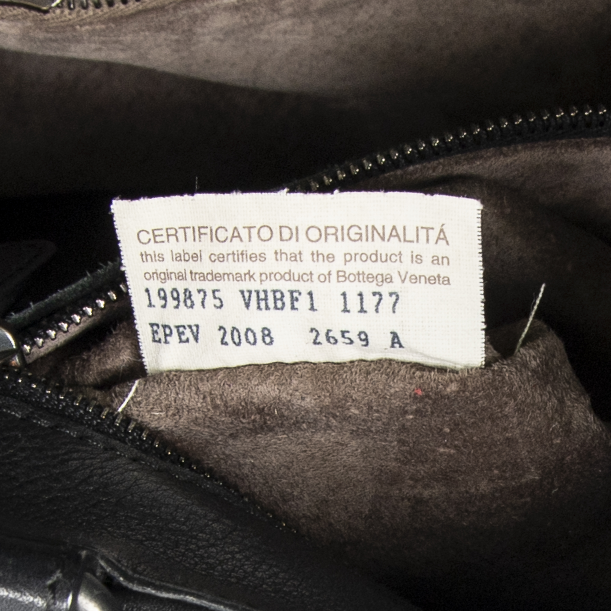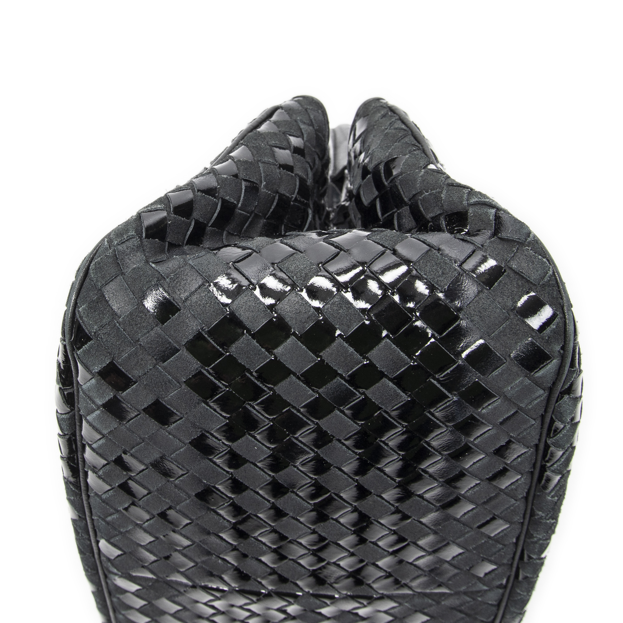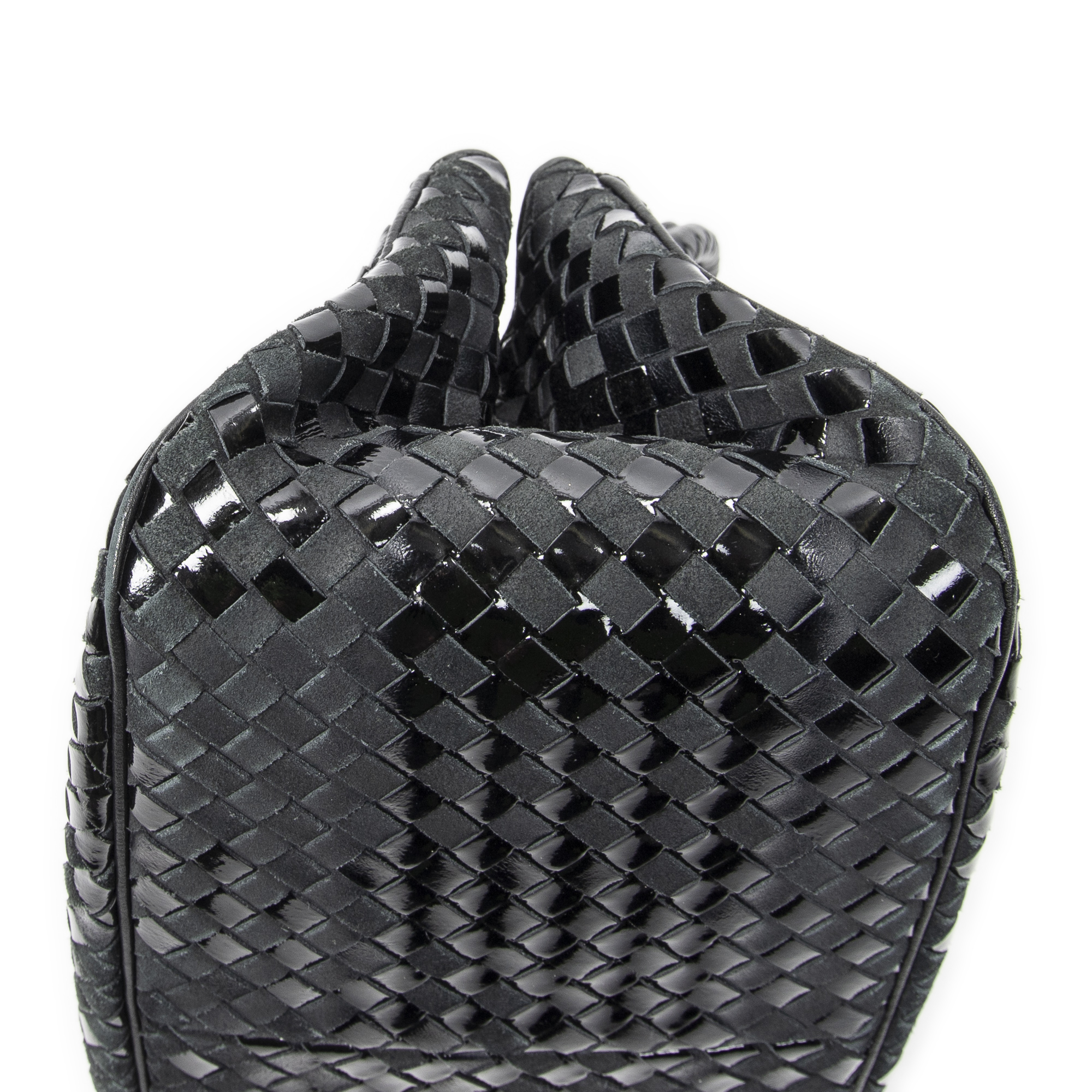 Bottega Veneta Shoulder Bag Small Rugiada Tote in Black Intrecciato Suede Leather and Aged Brass hardware. The product is in Very Good Condition (AB).