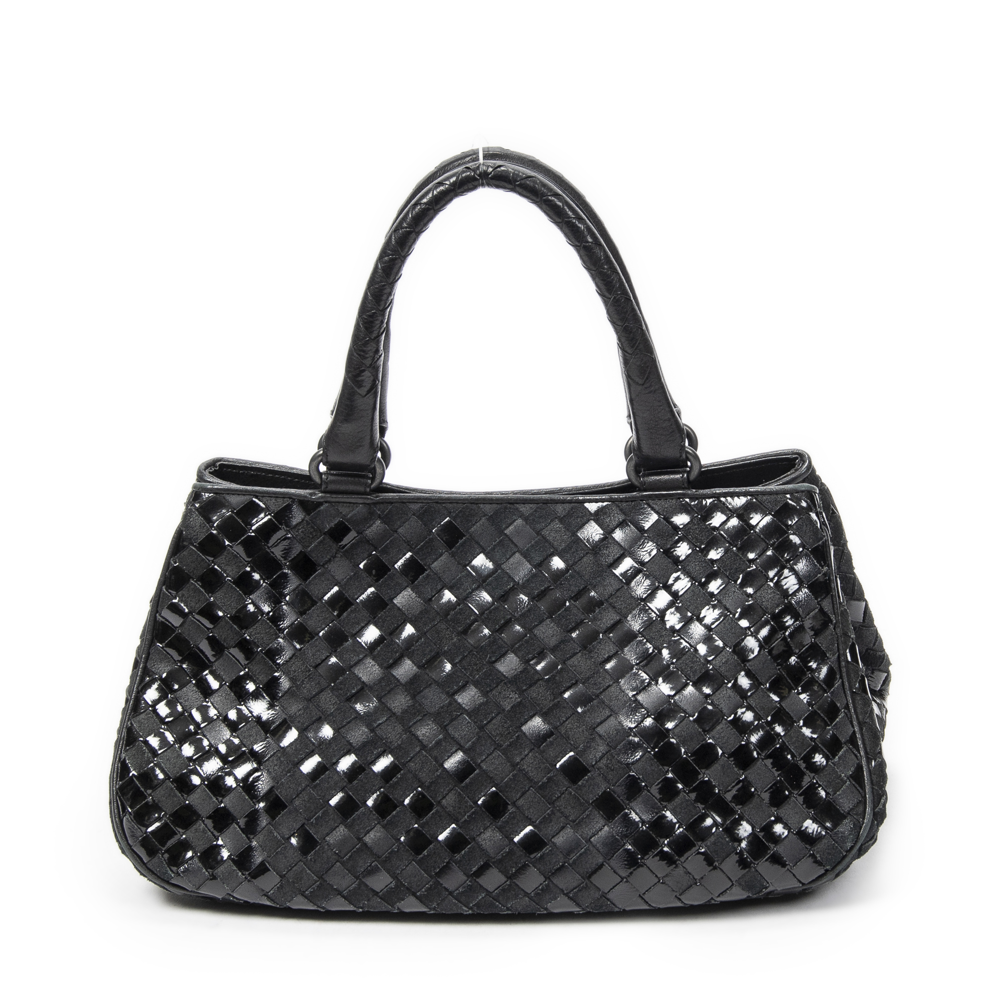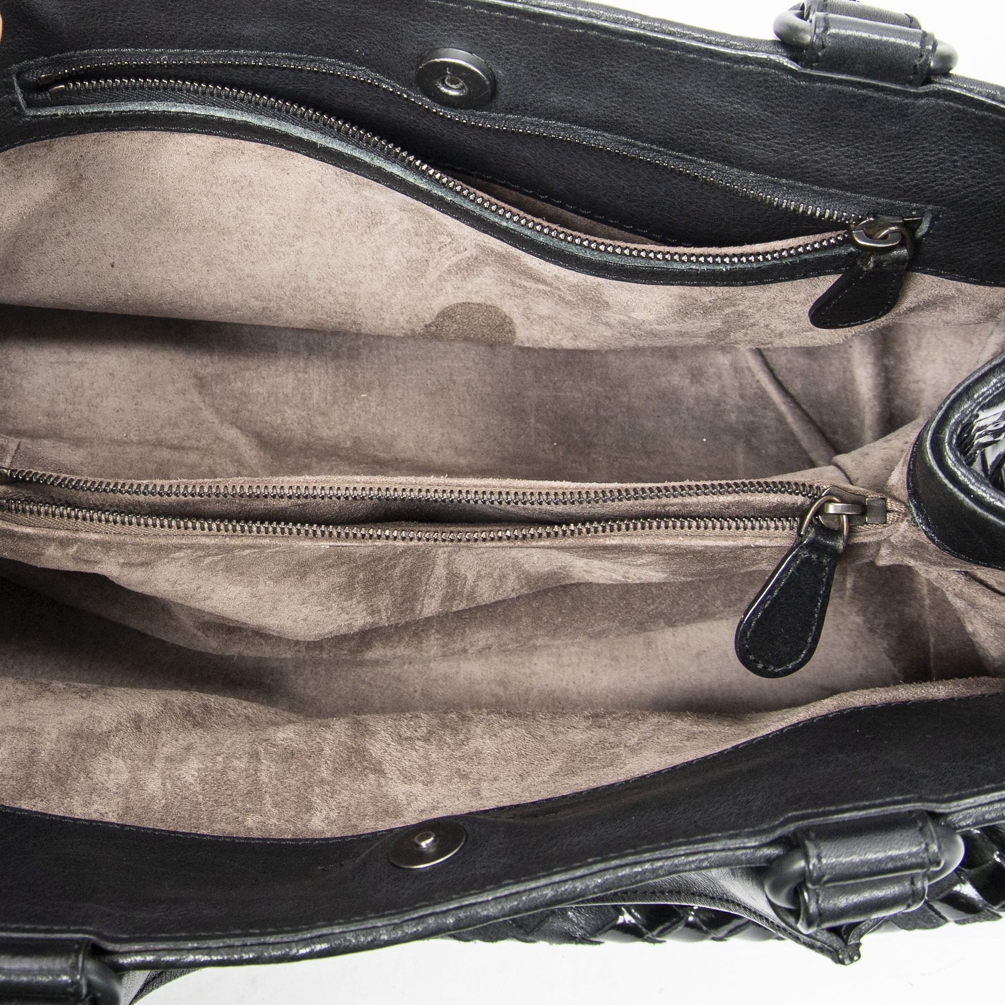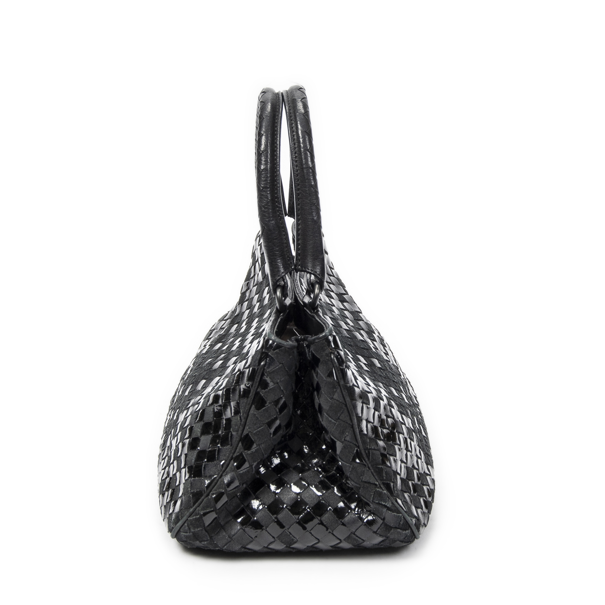 Bottega Veneta Shoulder Bag Small Rugiada Tote in Black Intrecciato Suede Leather and Aged Brass hardware. The product is in Very Good Condition (AB).