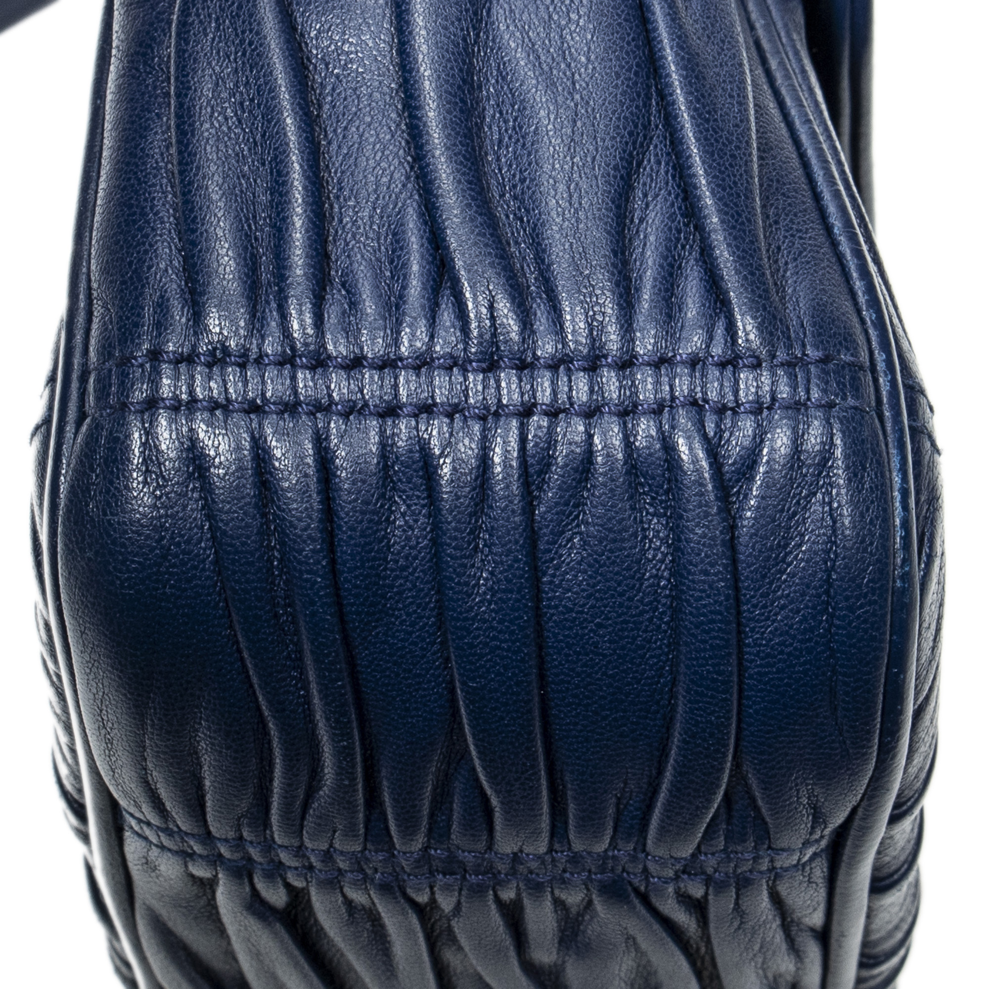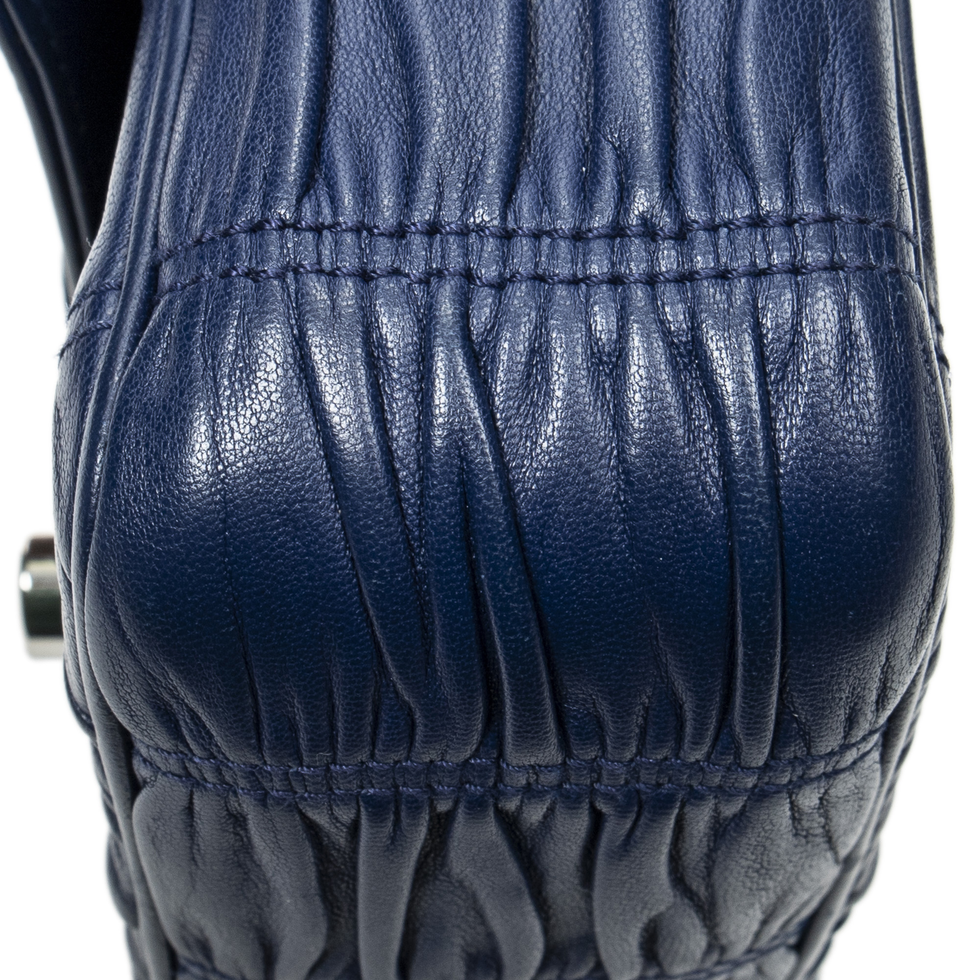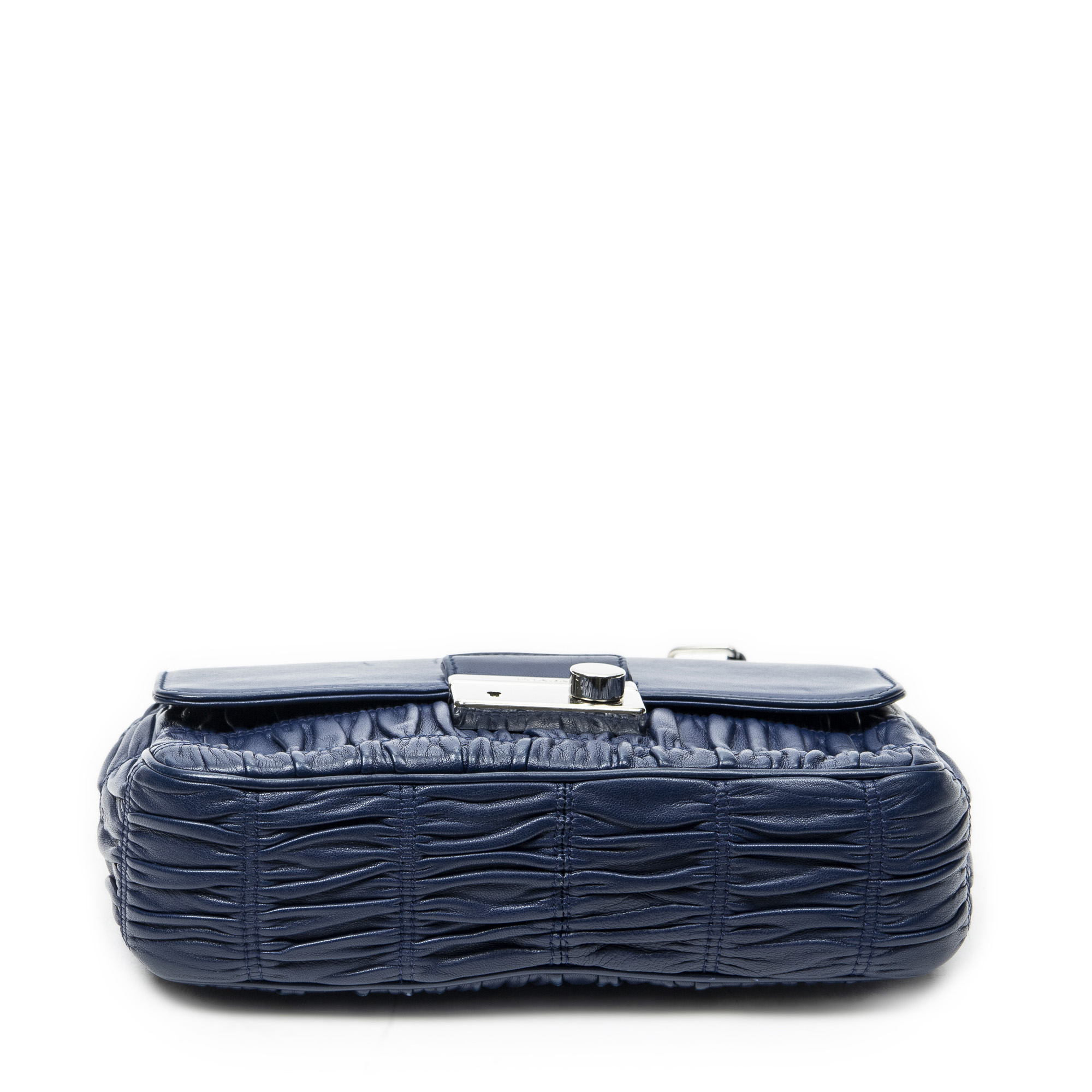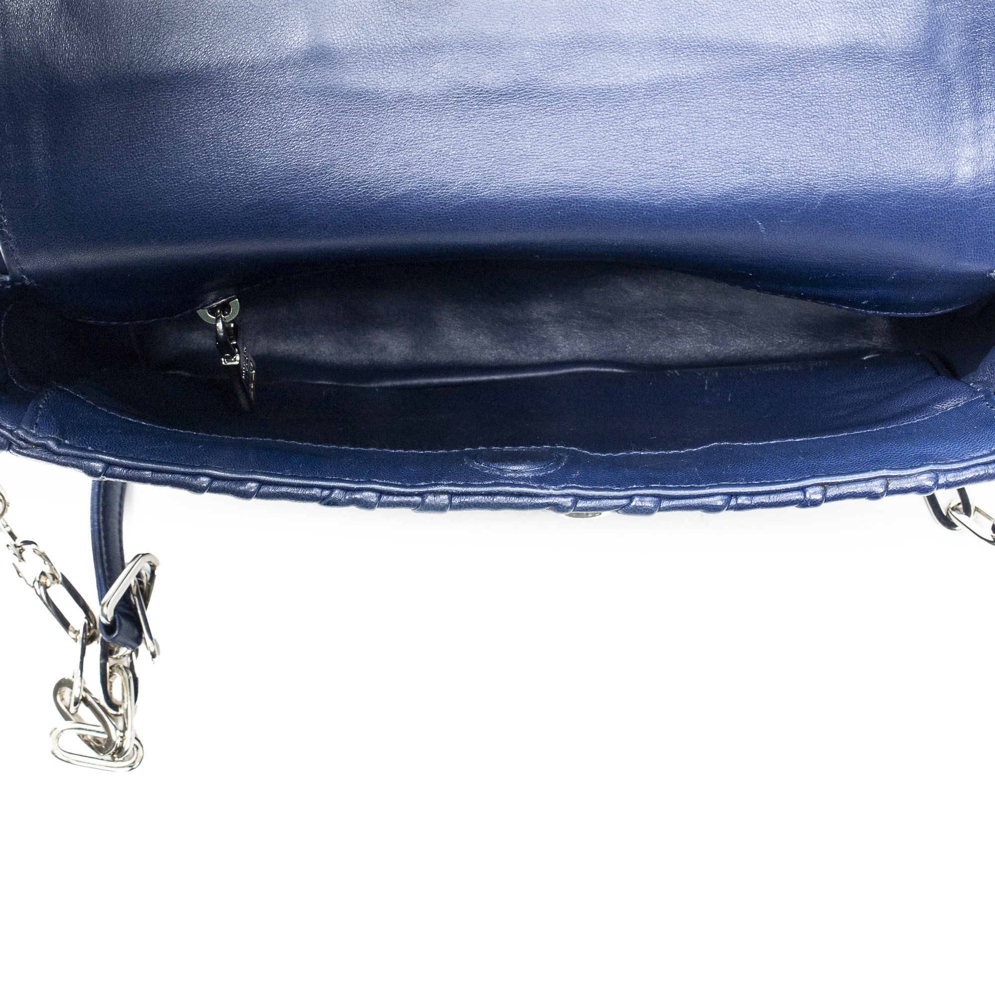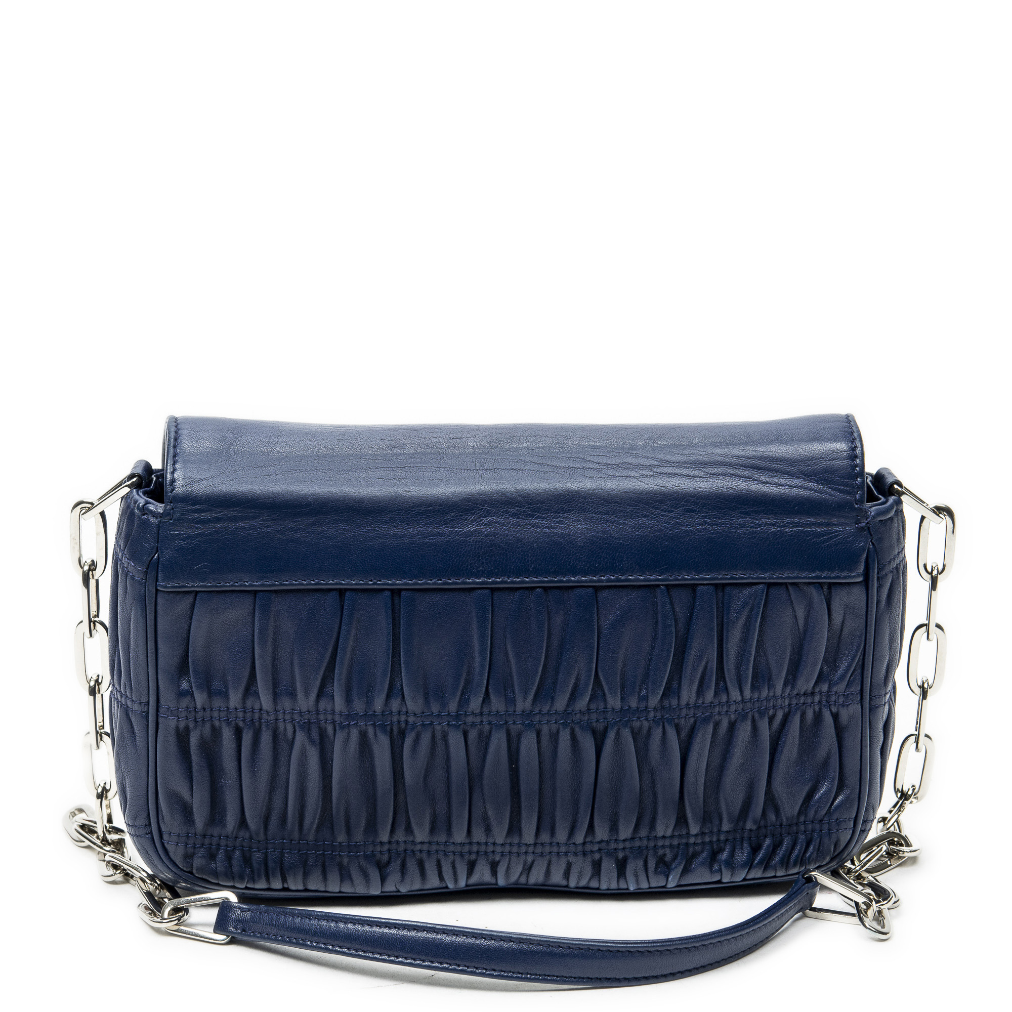 Prada Shoulder Bag Small Sound Chain Flap in Navy Nappa Gaufre Leather and Silver hardware. The product is in Excellent Condition (A).
