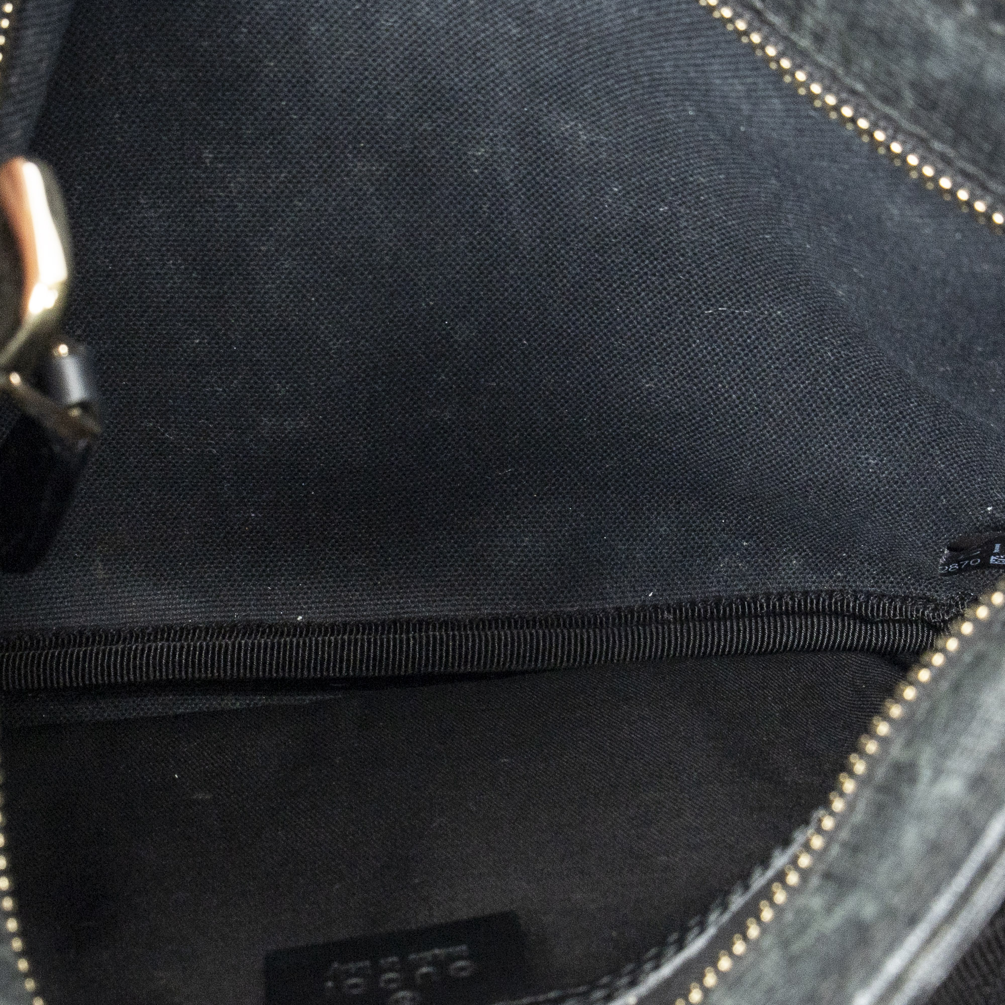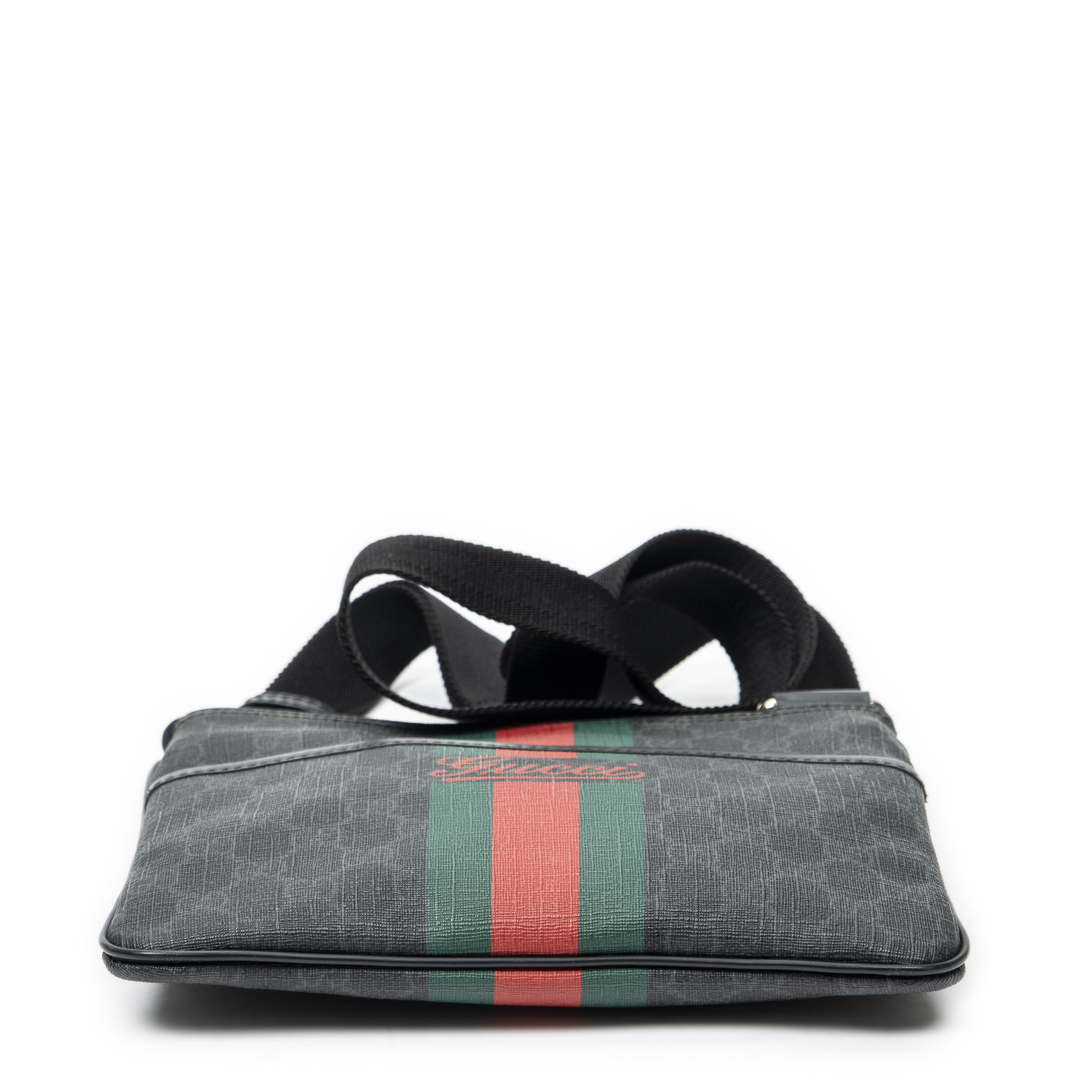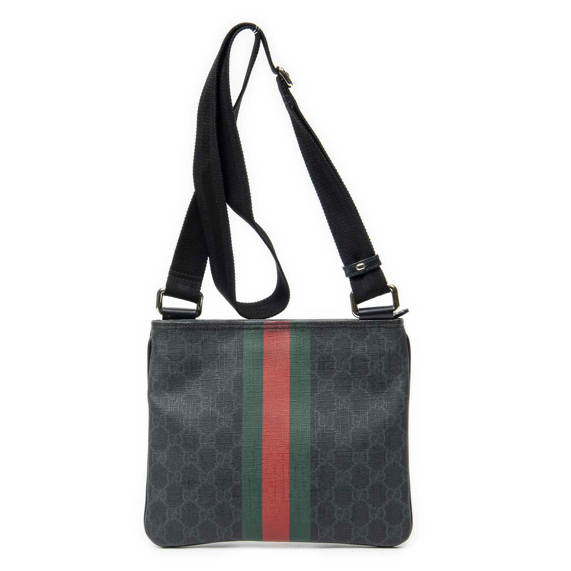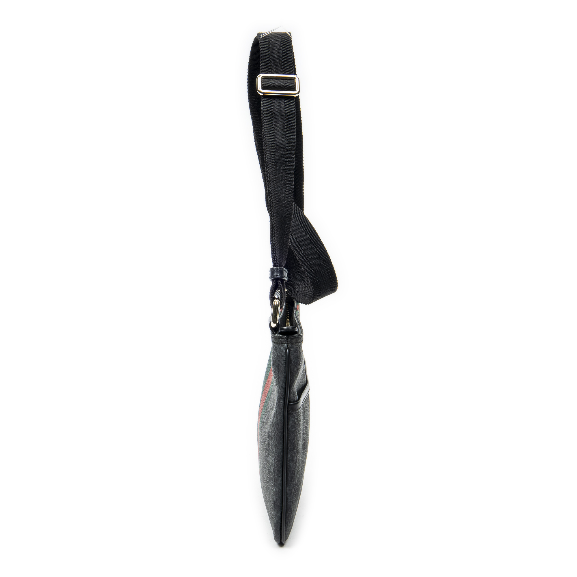 Gucci Shoulder Bag Small Web Flat Messenger in Black Supreme Coated Canvas and Gold hardware. The product is in Excellent Condition (A).