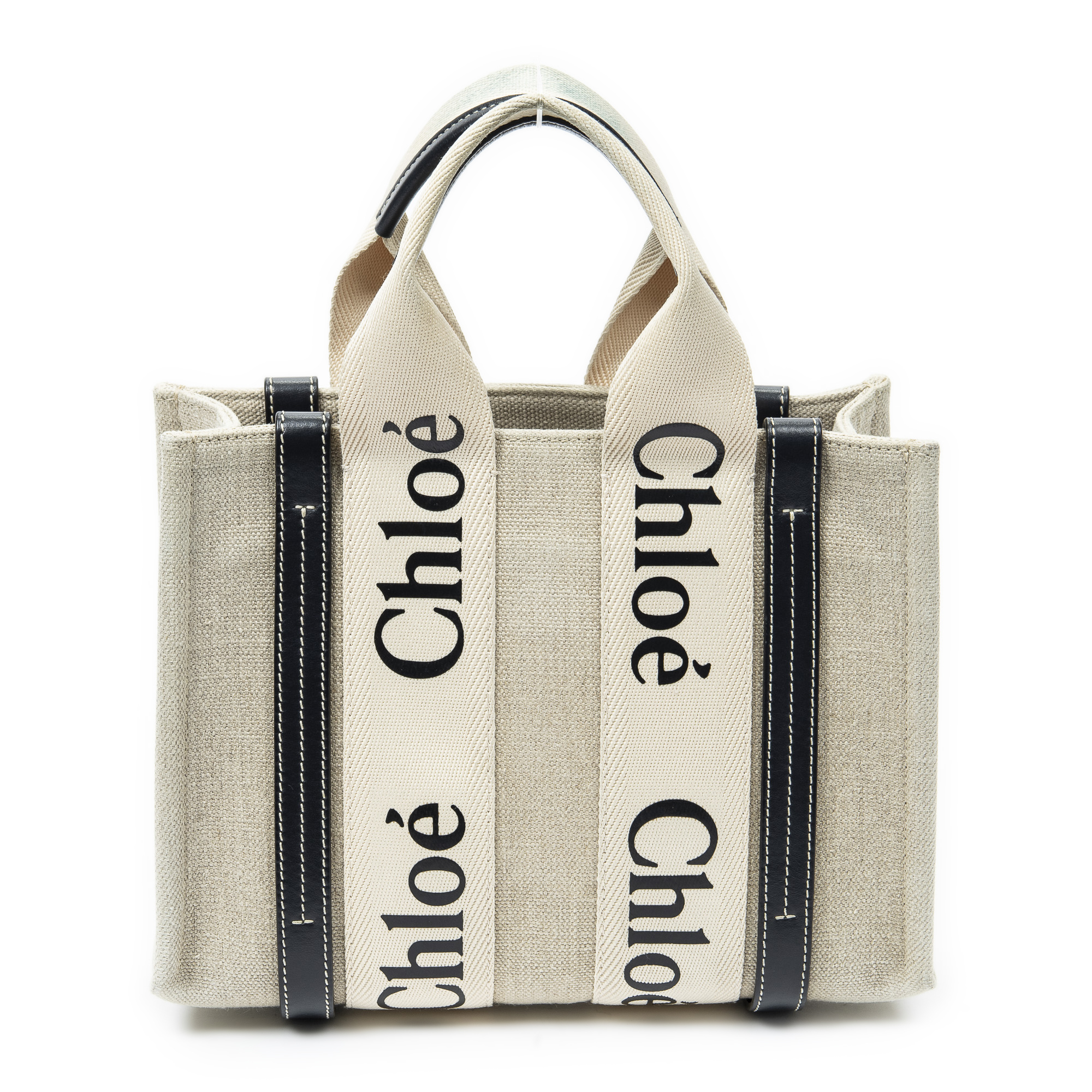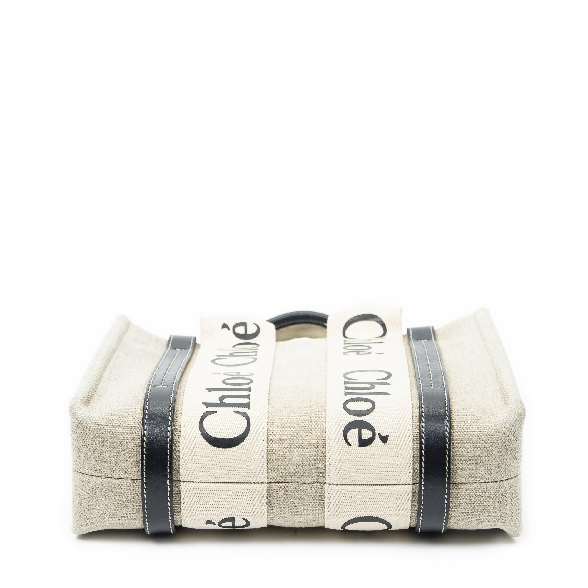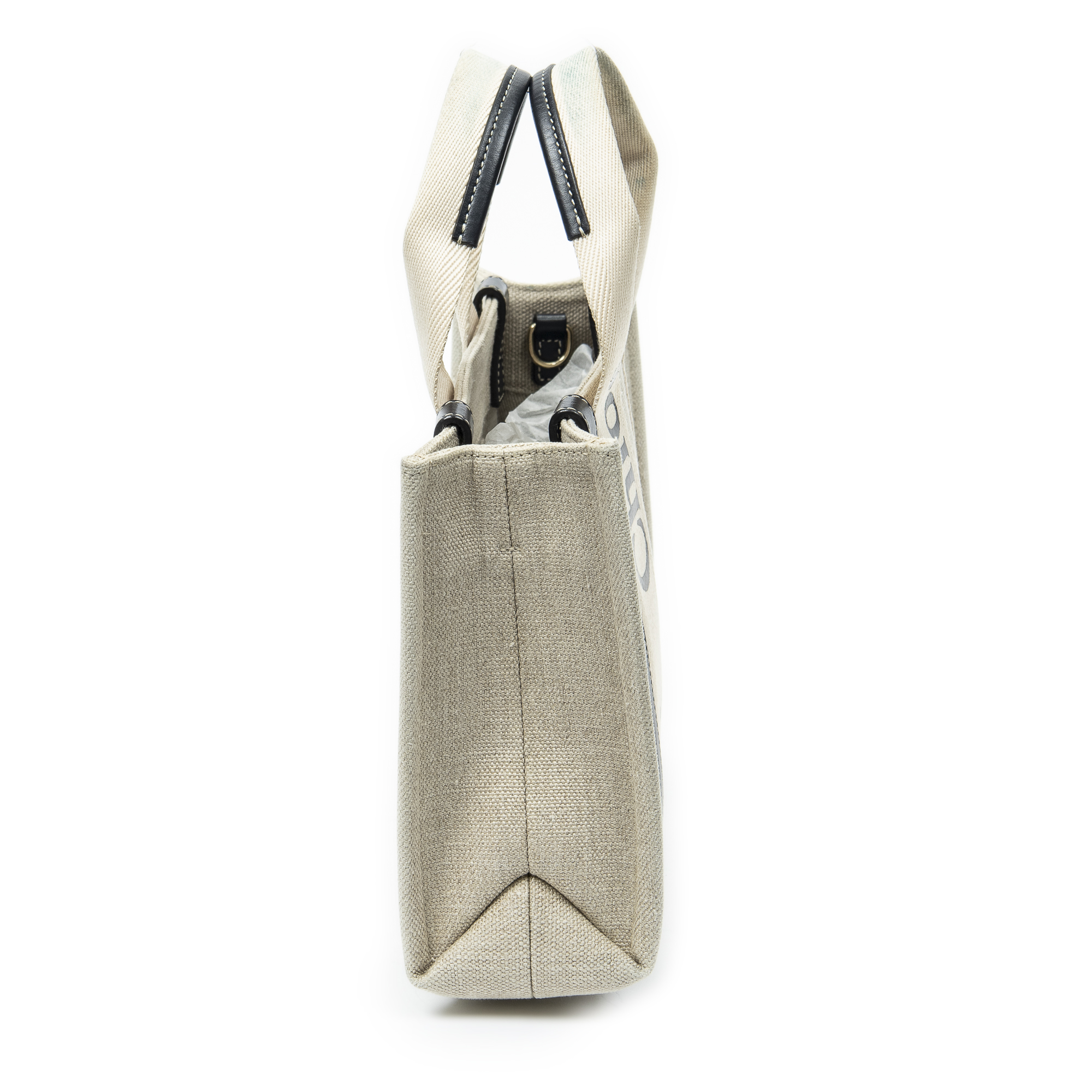 Chloé Shoulder Bag Small Woody Tote in Beige Canvas and Gold hardware. The product is in Very Good Condition (AB).
