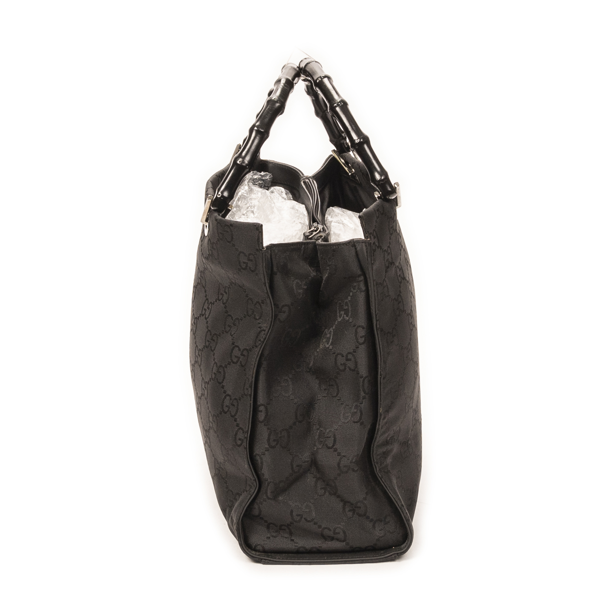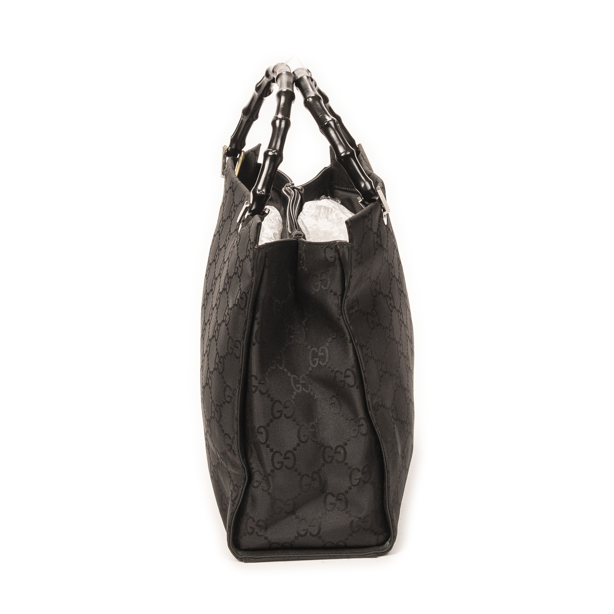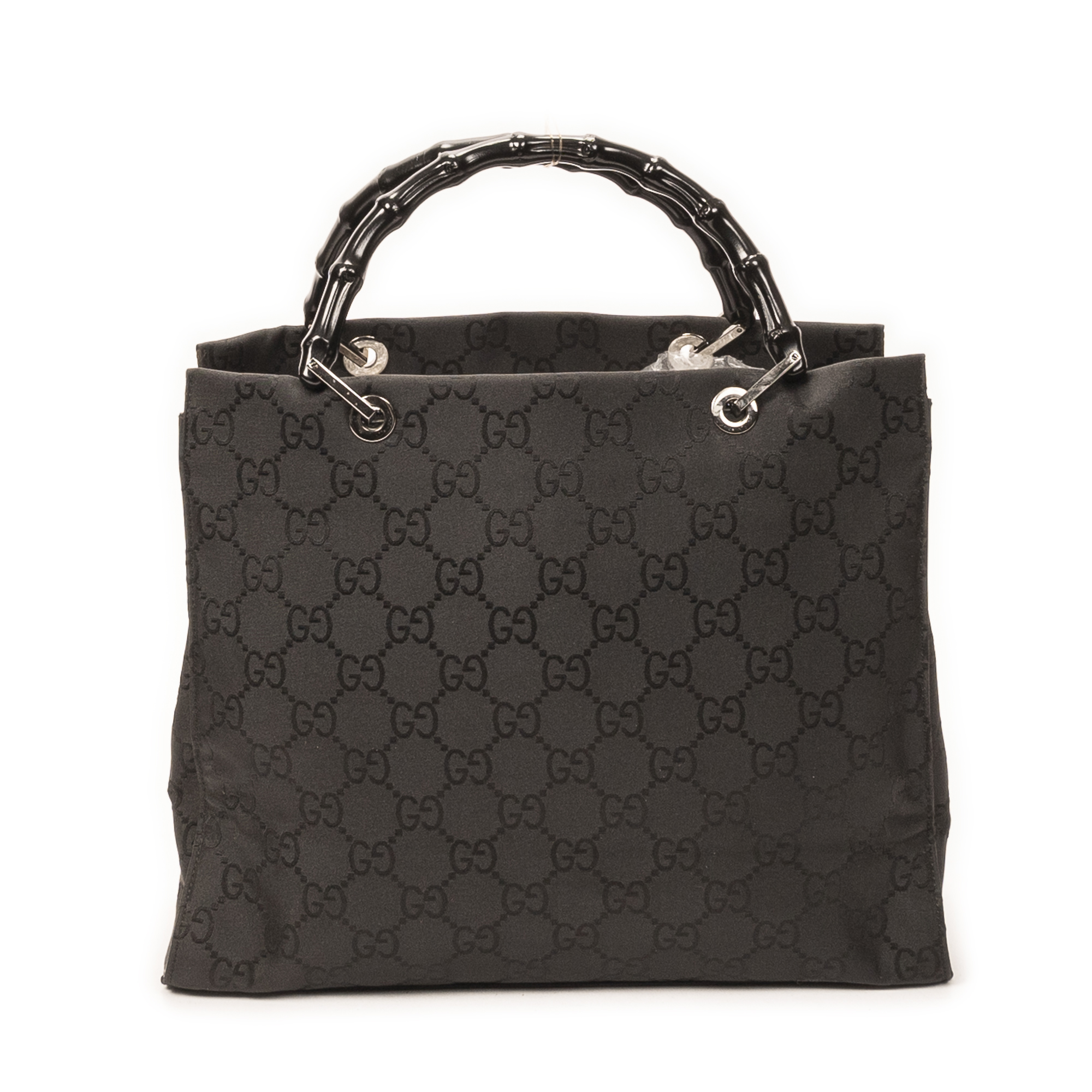 Gucci Shoulder Bag Square Bamboo Tote in Black Monogrammed Nylon Canvas and Silver hardware. The product is in Excellent Condition (A).