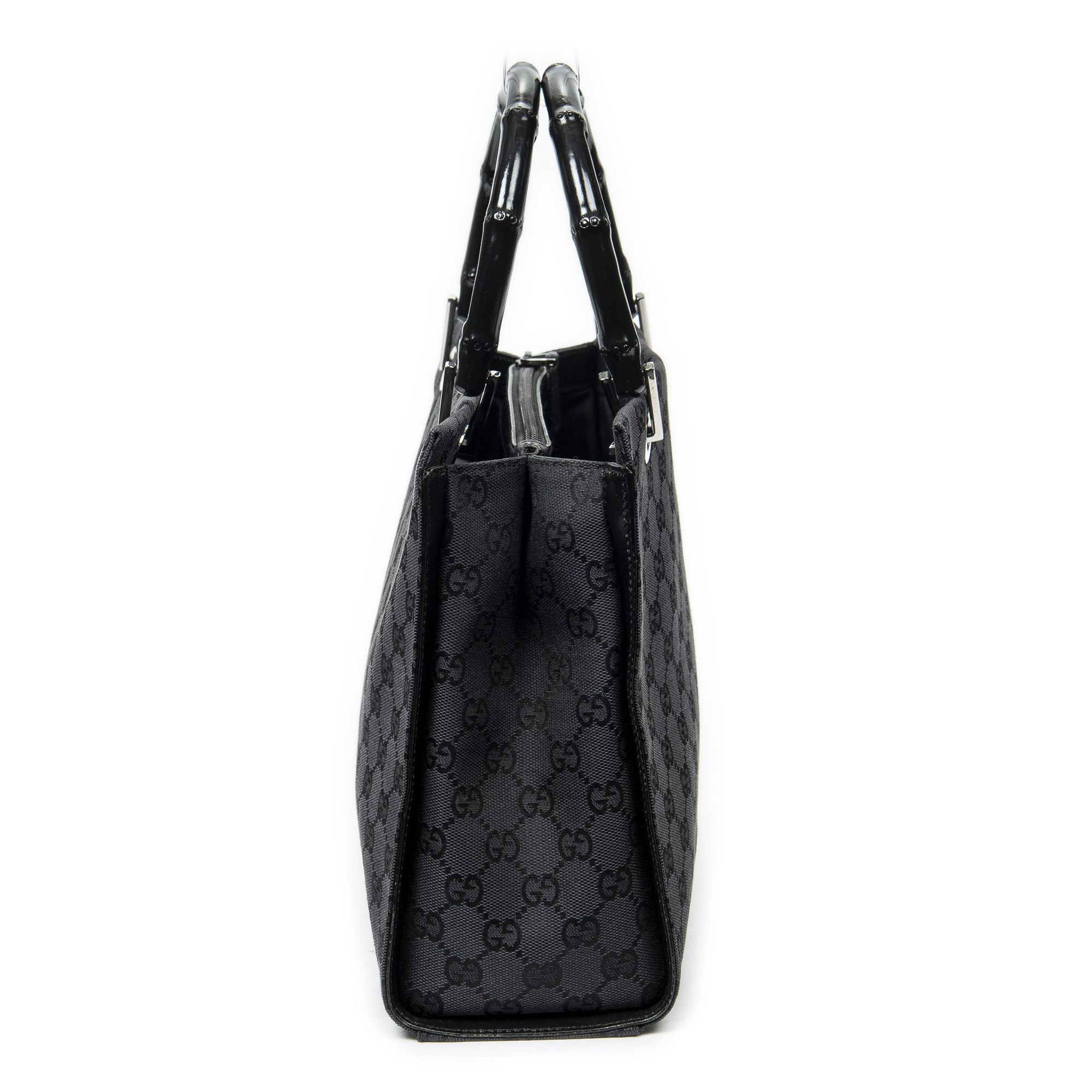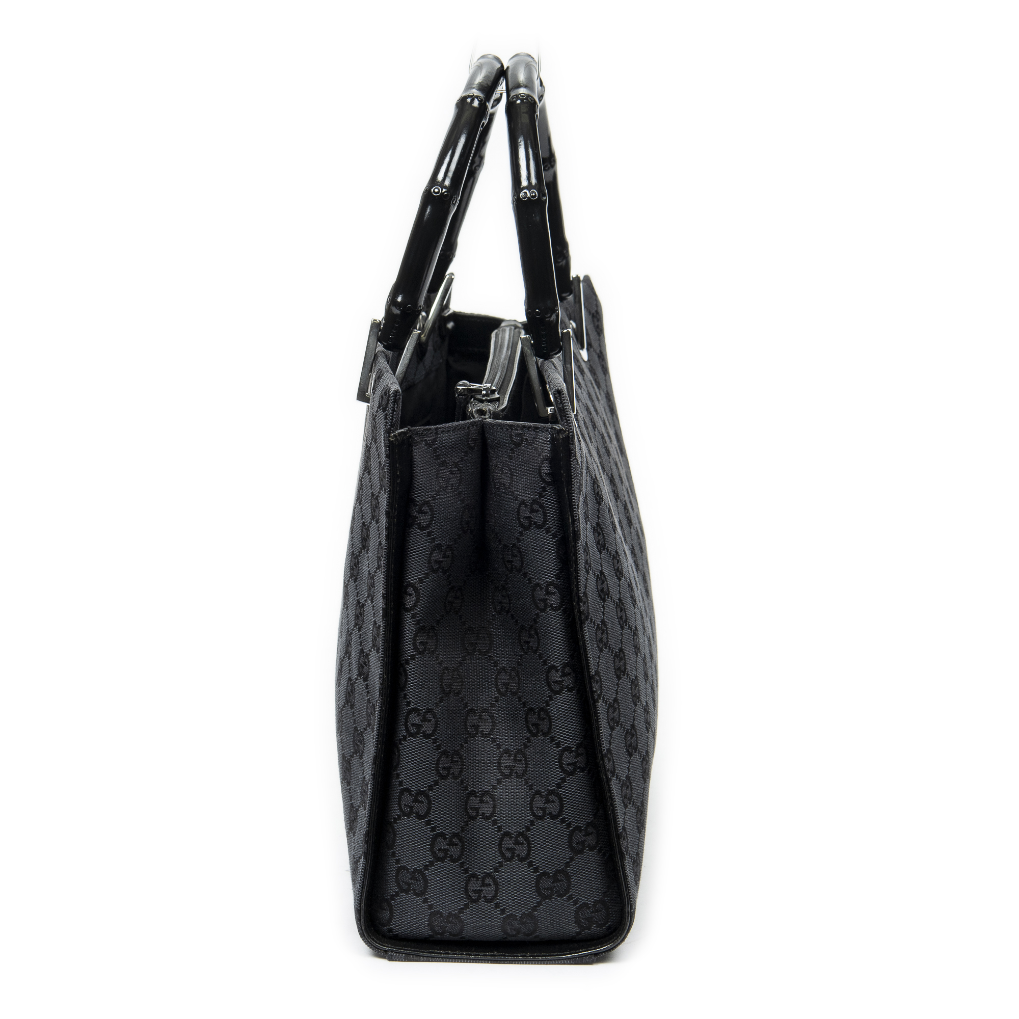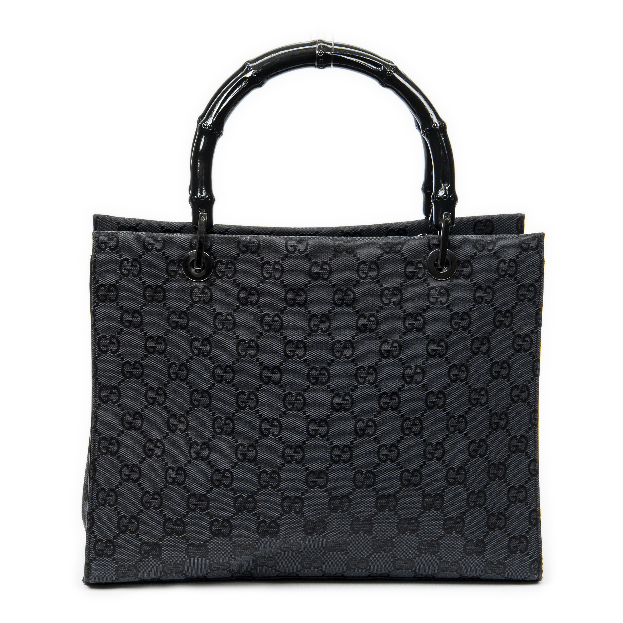 Gucci Shoulder Bag Square Bamboo Tote in Black Monogrammed Canvas and Silver hardware. The product is in Excellent Condition (A).