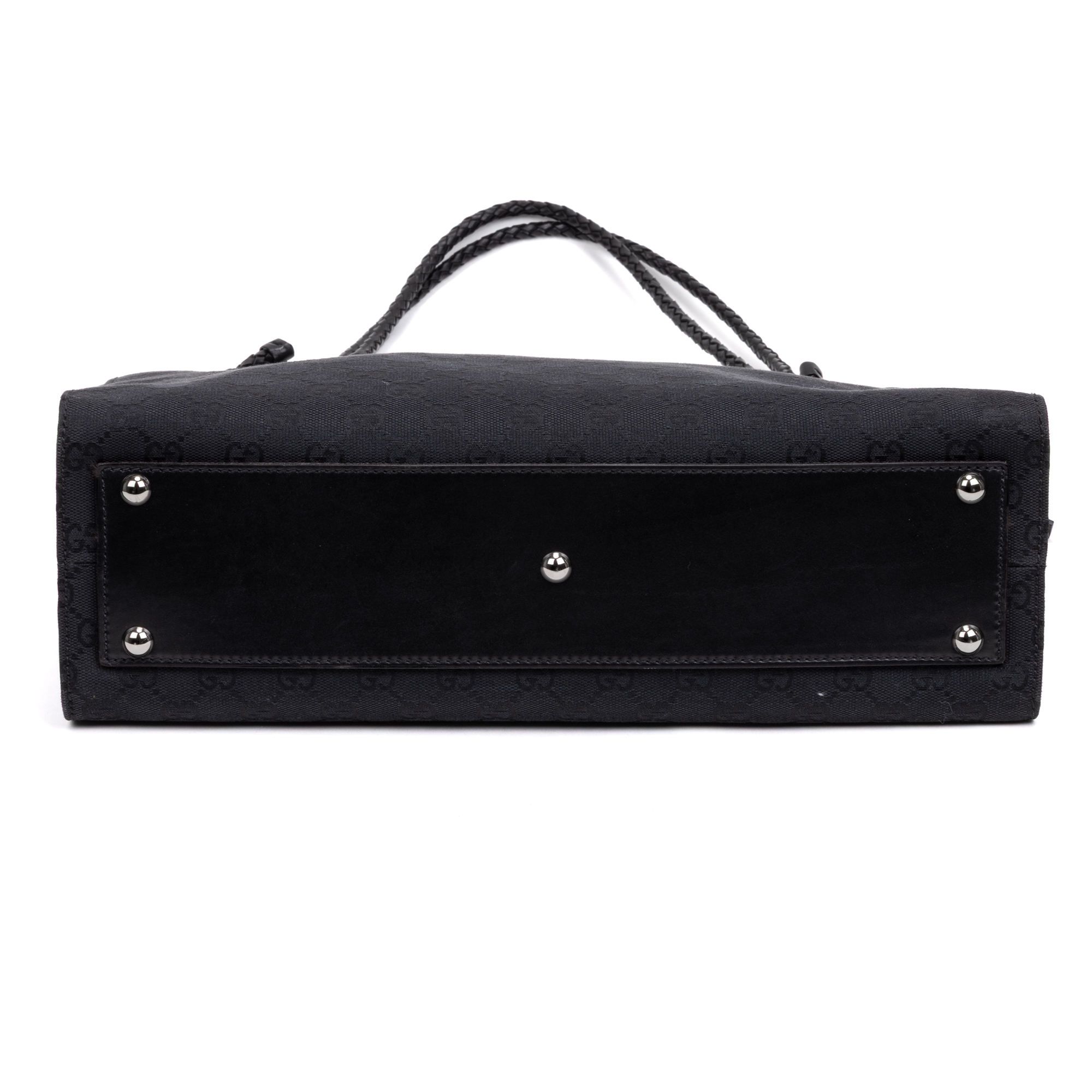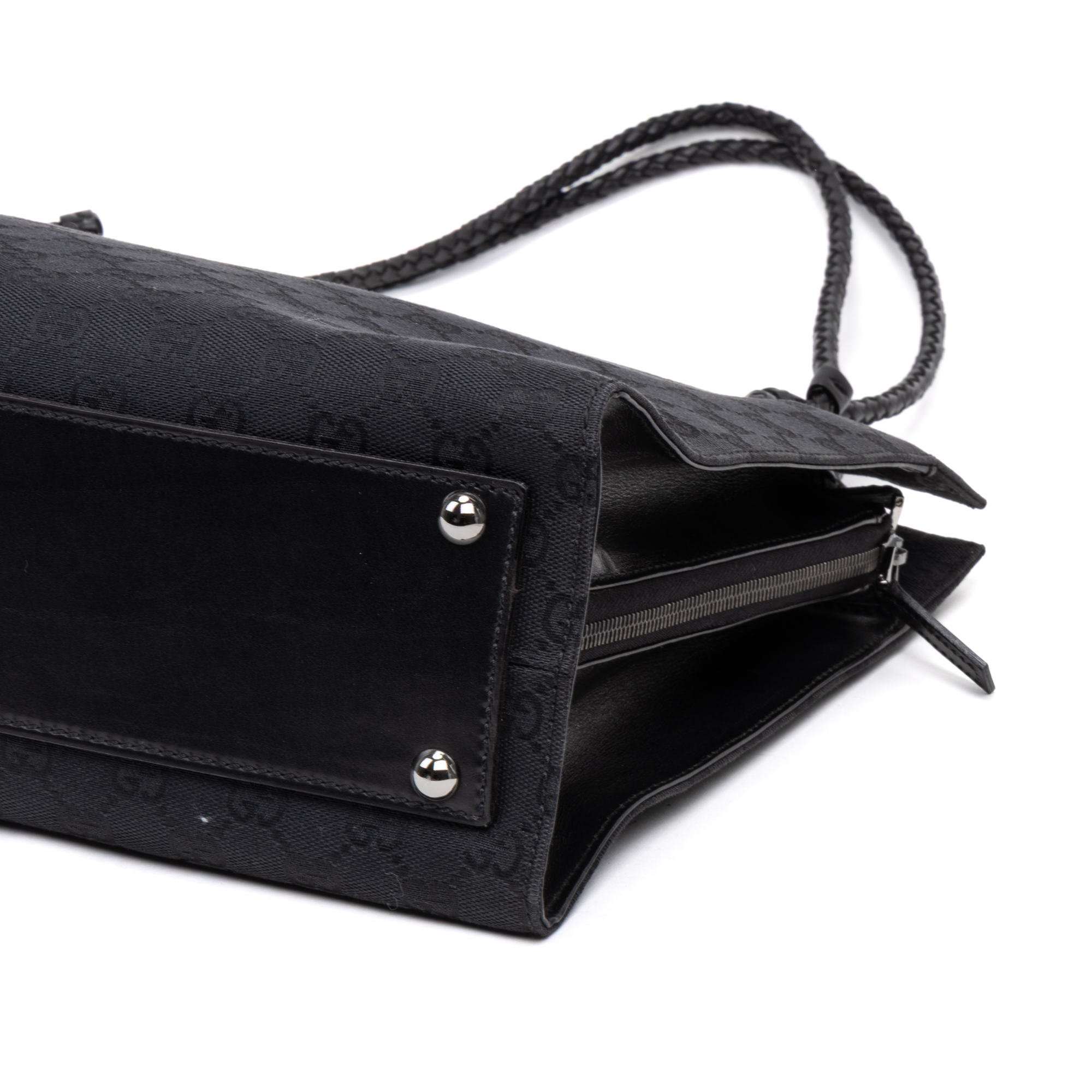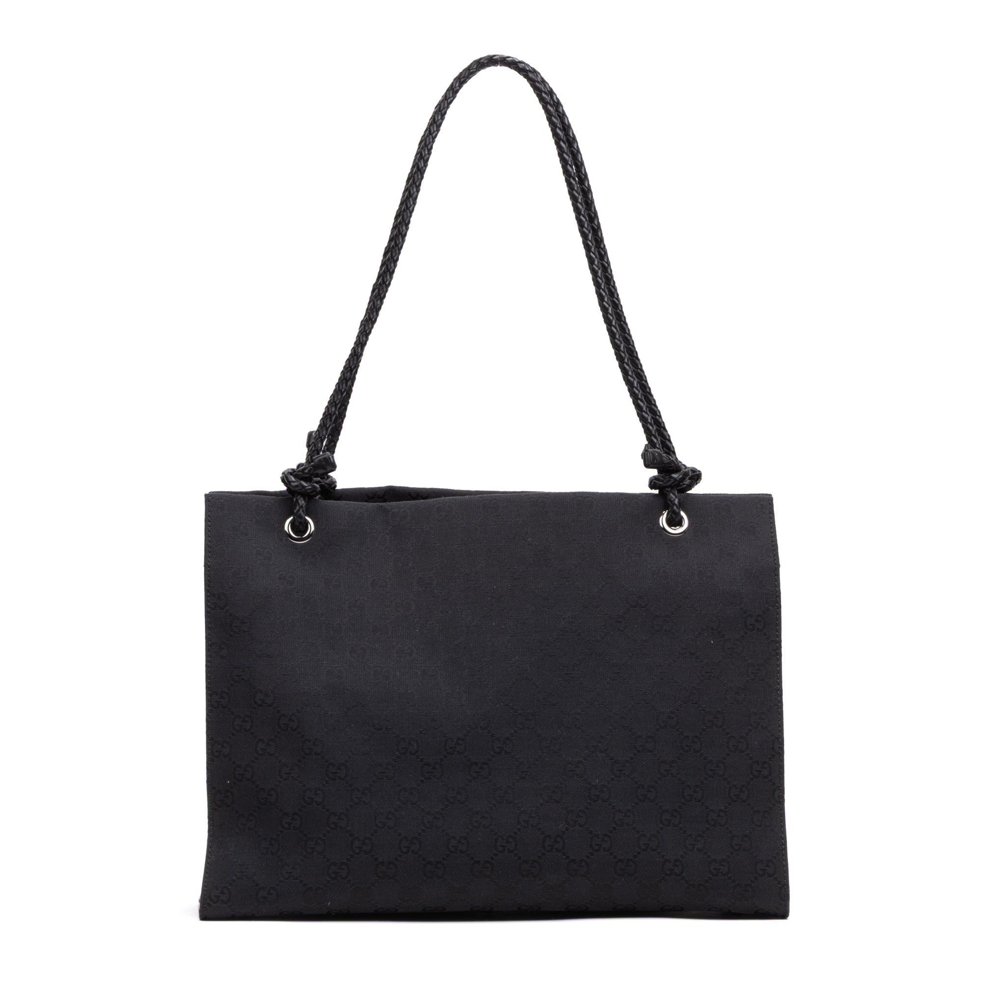 Gucci Shoulder bag Square Braided Handle Shopper in Black Monogrammed Canvas and Silver hardware. The product is in Perfect Condition (AA).