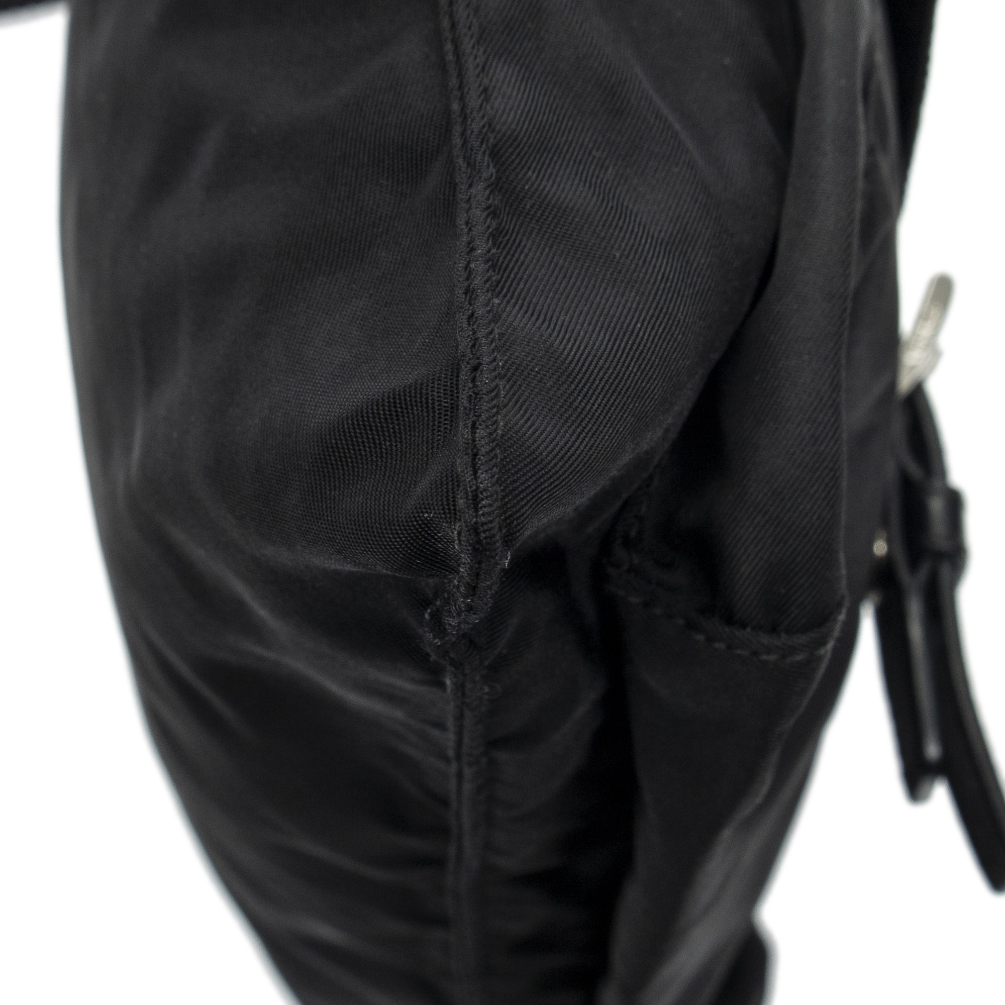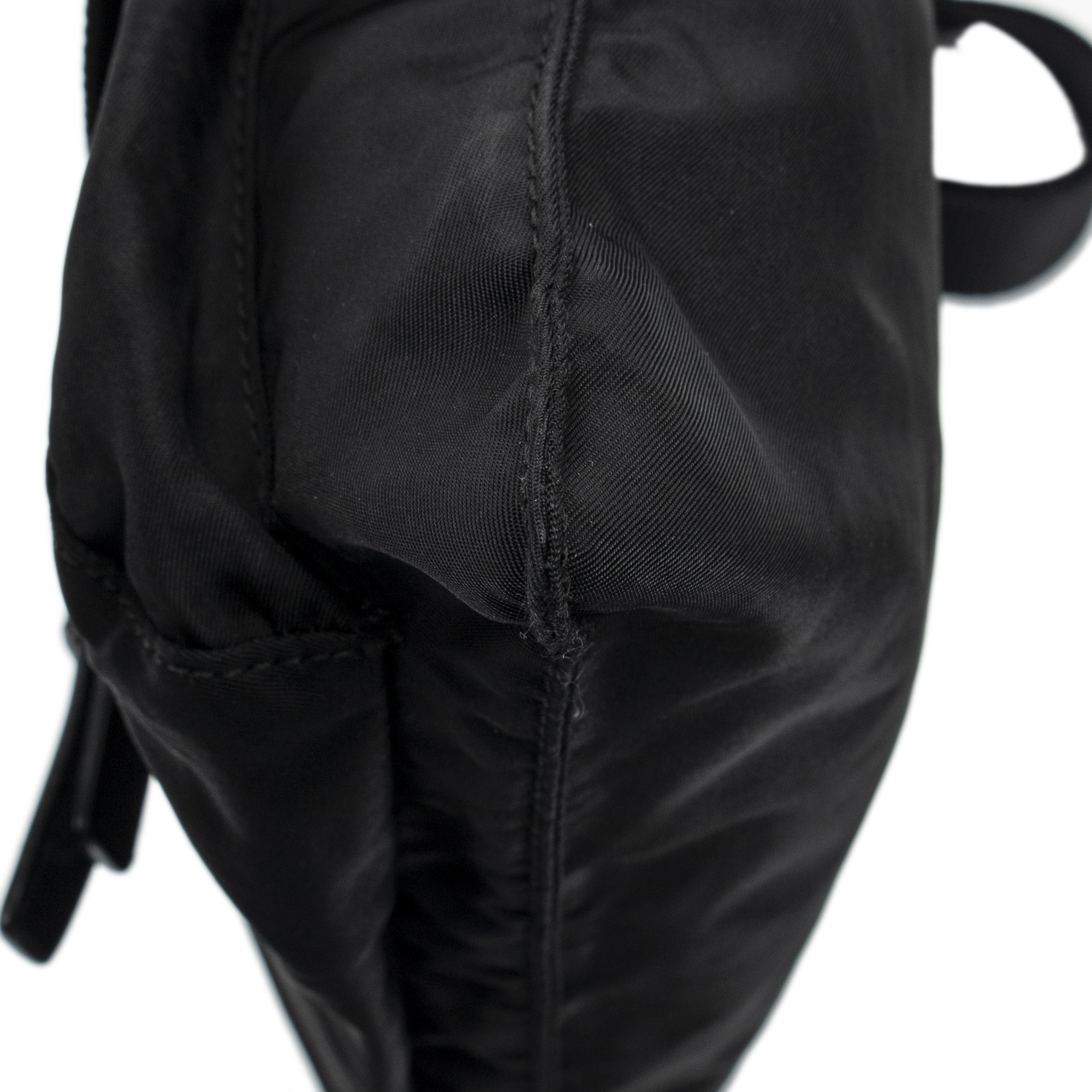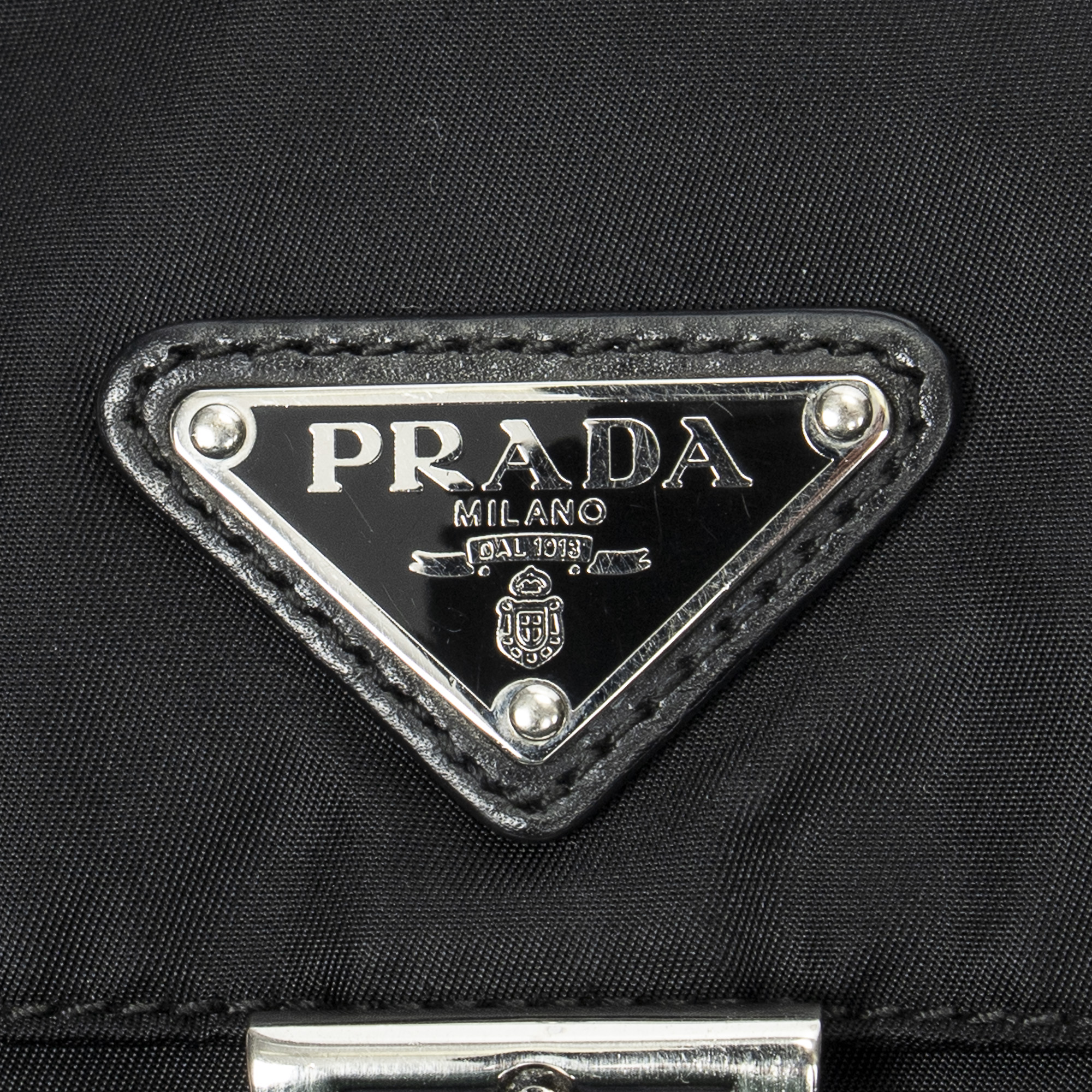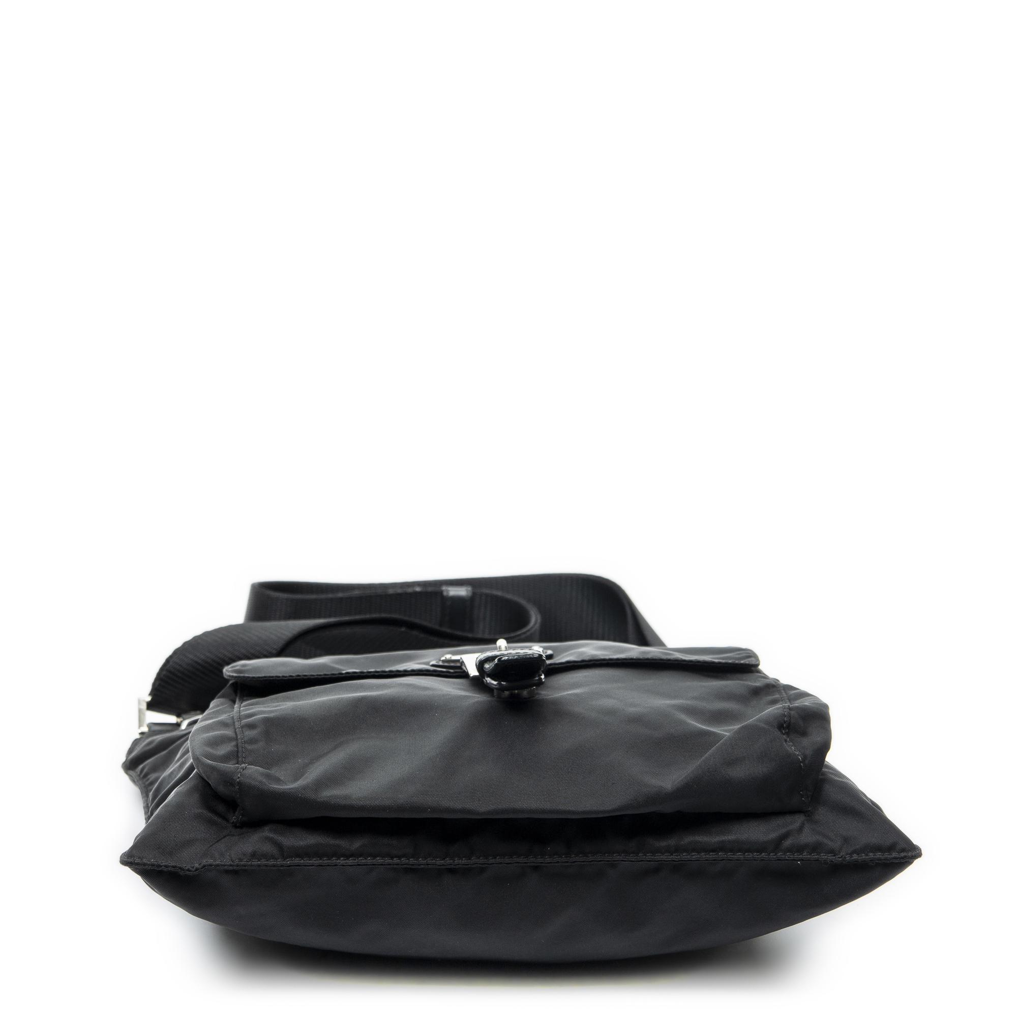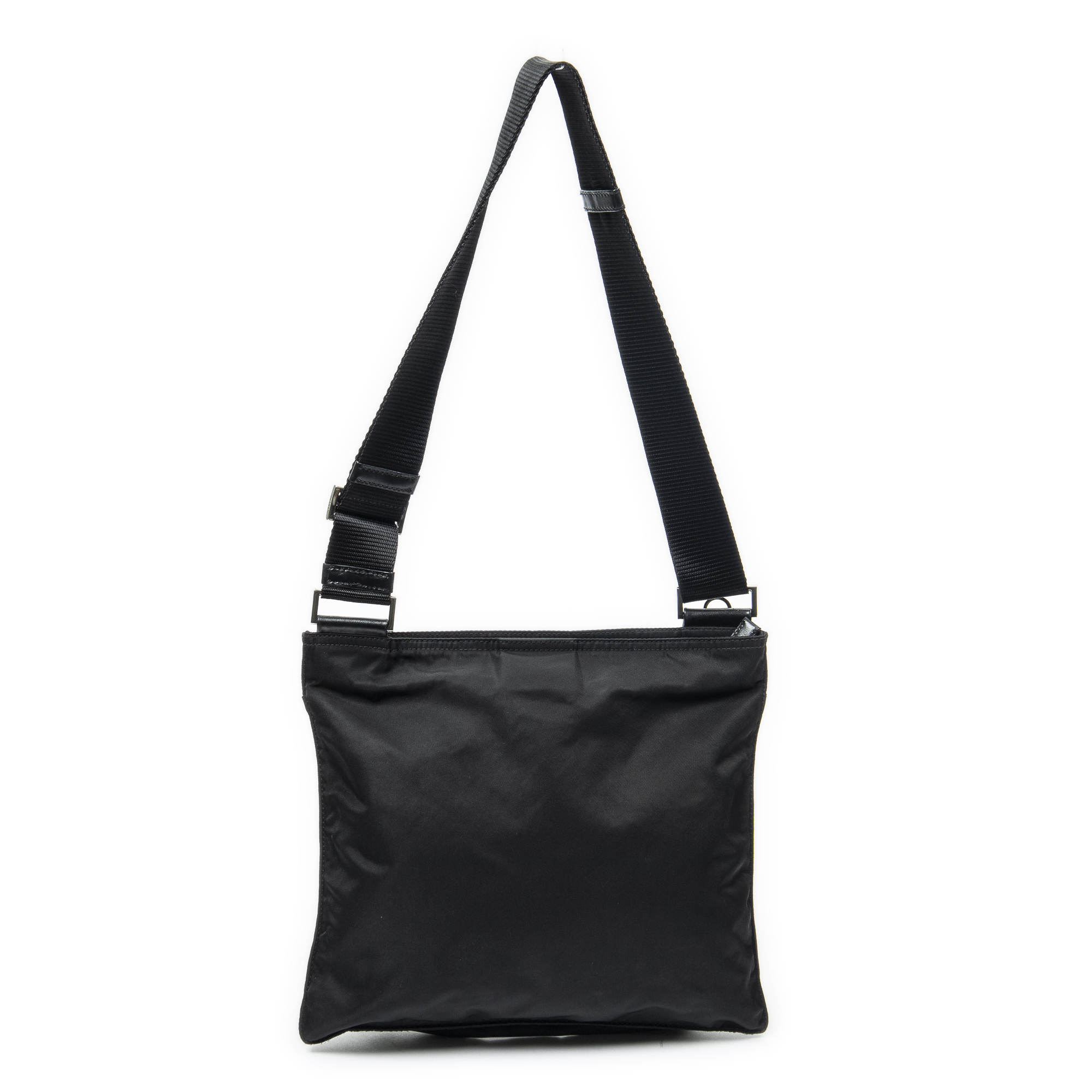 Prada Shoulder Bag Square Front Pocket Crossbody in Black Nylon Canvas and Silver hardware. The product is in Excellent Condition (A).